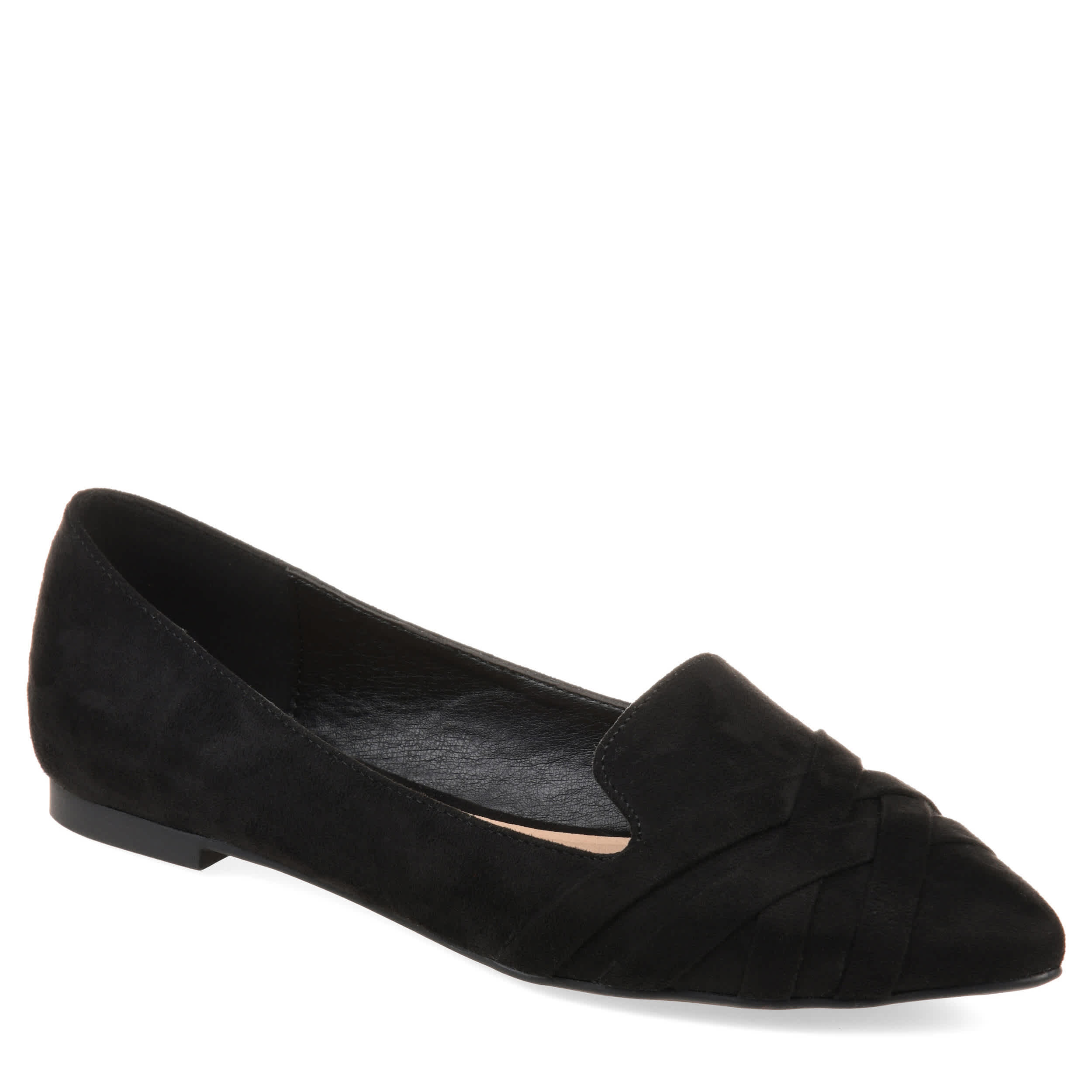 This Journee Collection Mindee flat is a striking addition to your ensemble. The faux suede upper has woven overlay details on the vamp with a pointed toe design for a sharp style that pairs with any look.