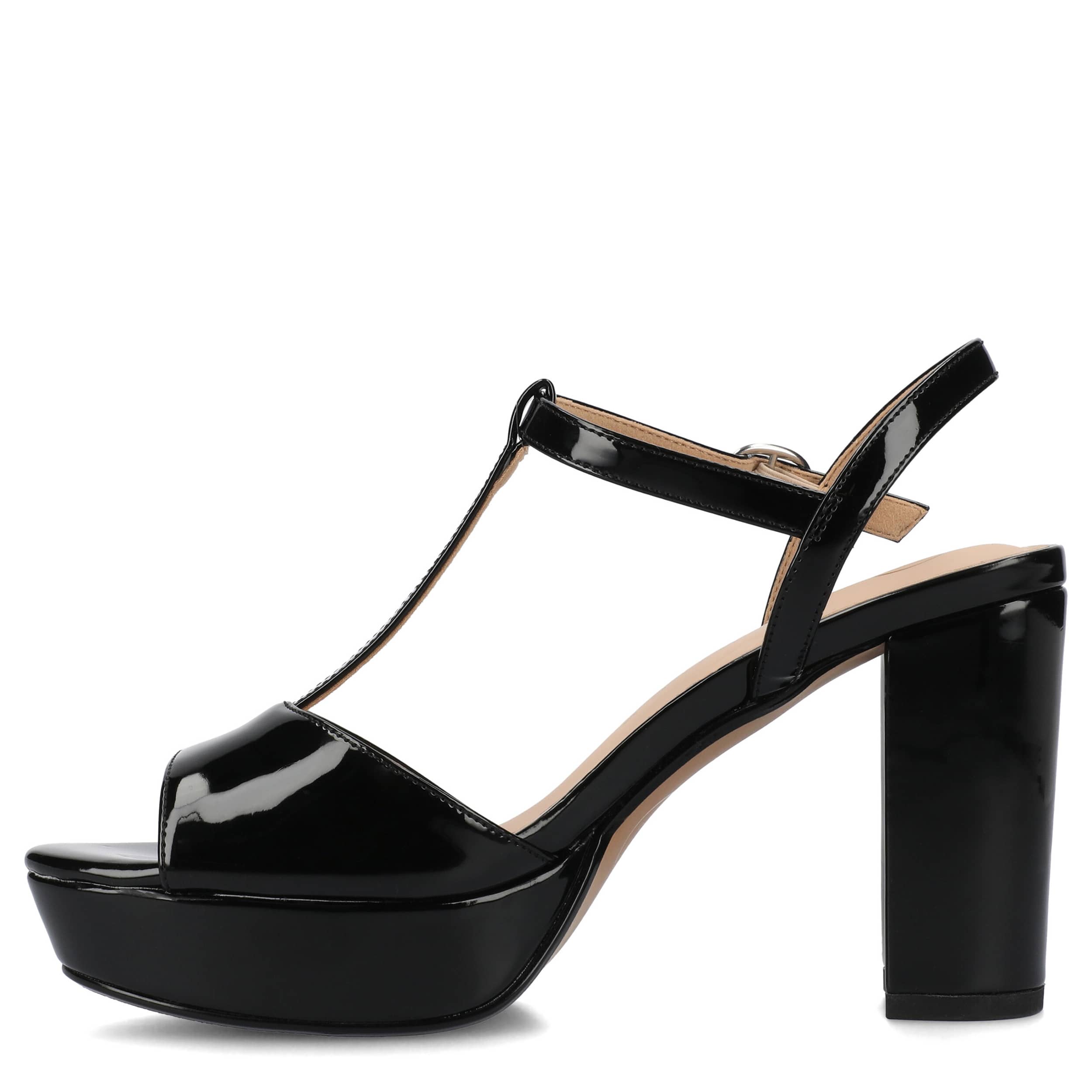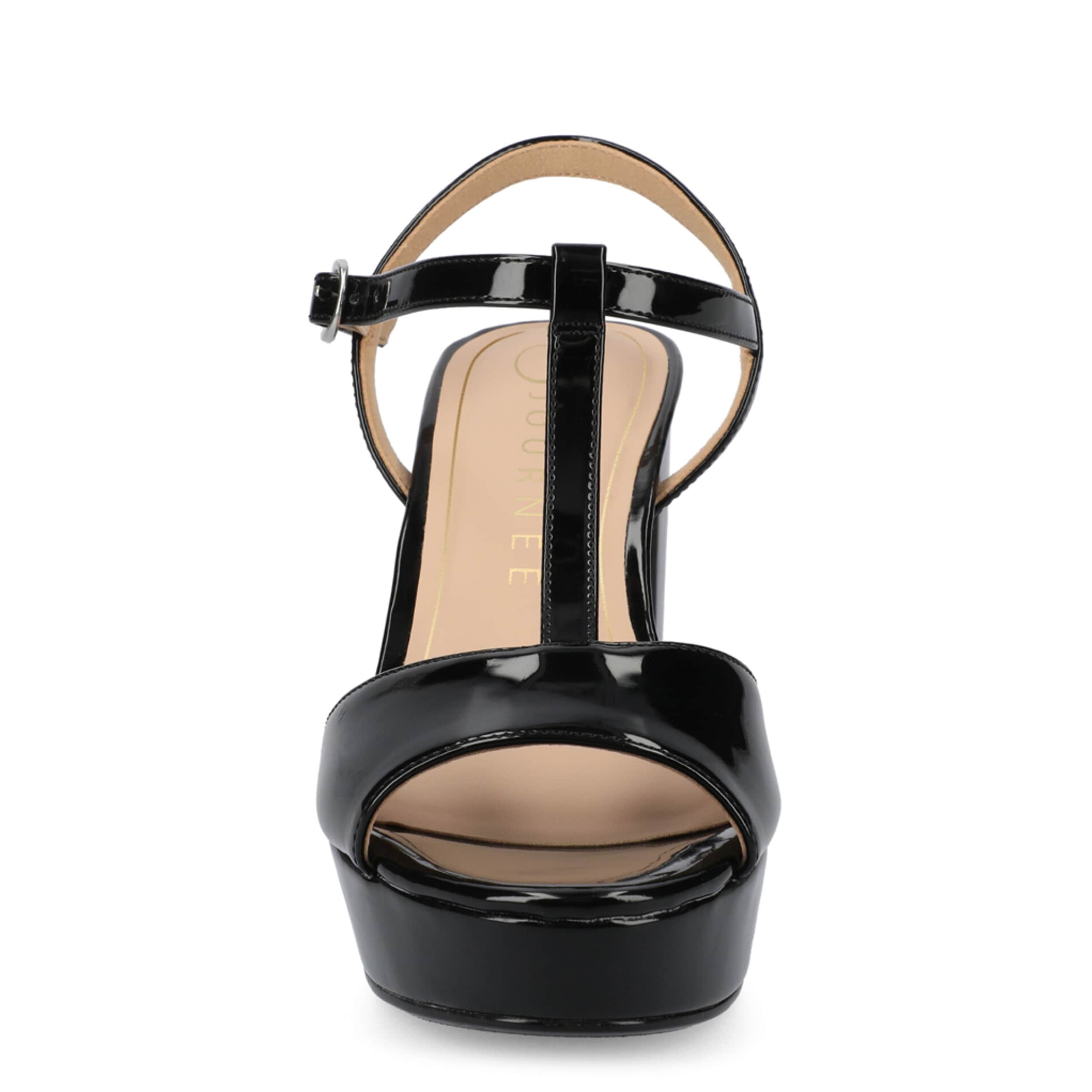 Feel chic in the Journee Collection Nalie sandal. Featuring a glossy patent upper, this shoe has a sleek silhouette and peep toe for extra style. The cushioned insole comforts your steps, while the lofty heel gives a stable lift.