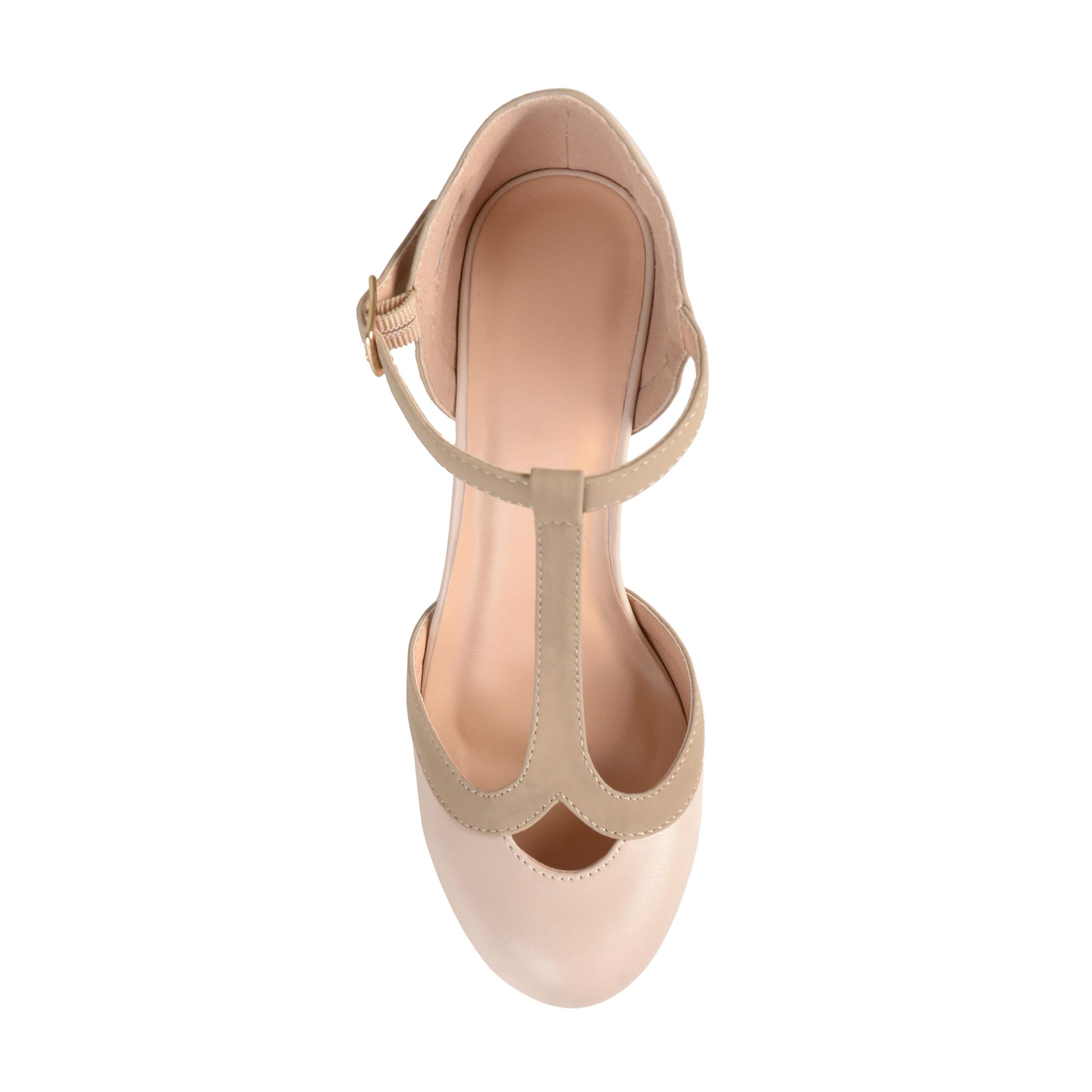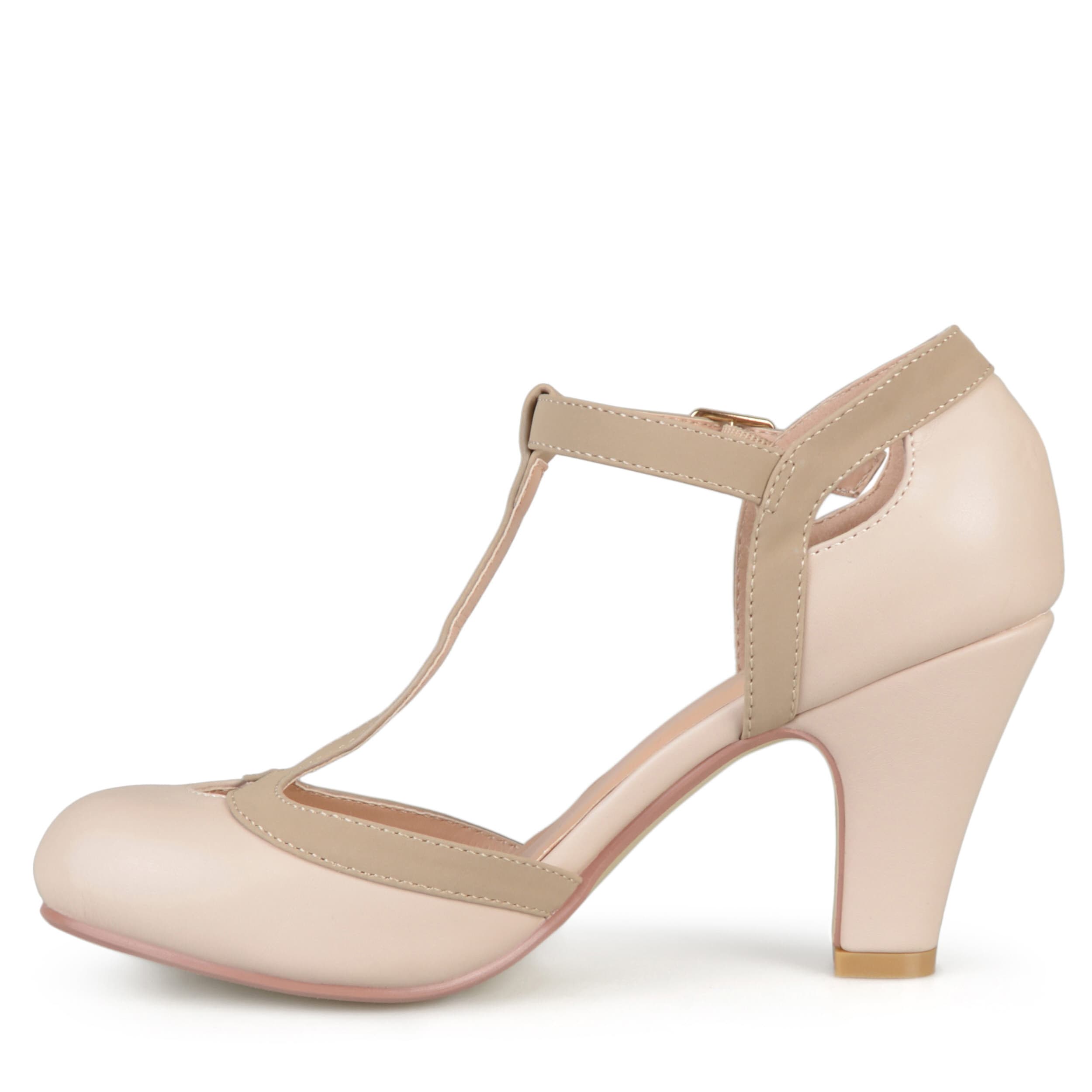 The two-toned contrast of this Olina pump from Journee Collection blends well with a T-strap design and covered 3¼" heel for a polished style. Whether to the office or out to dinner, this comfortably cute pump will pair with all your dressy looks.