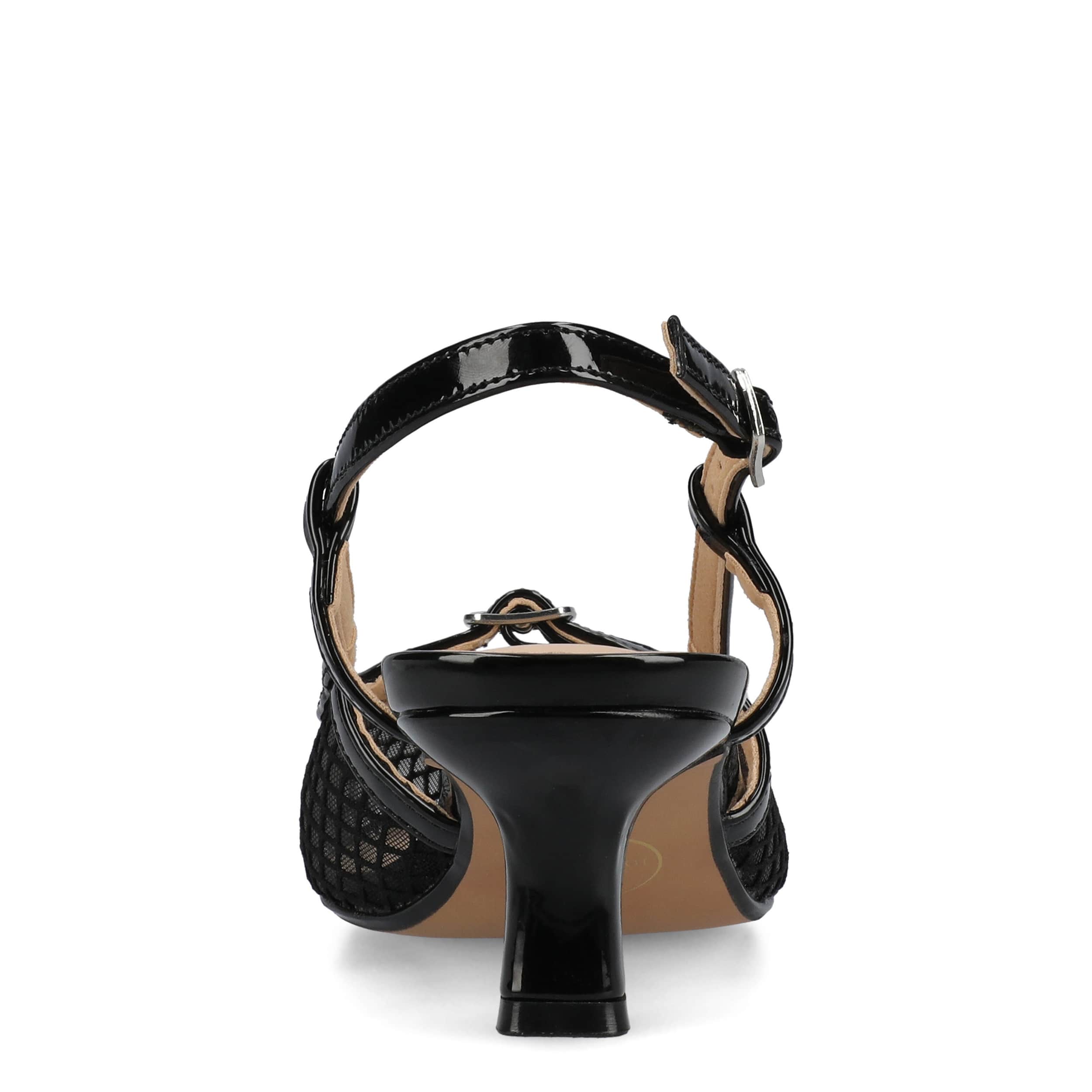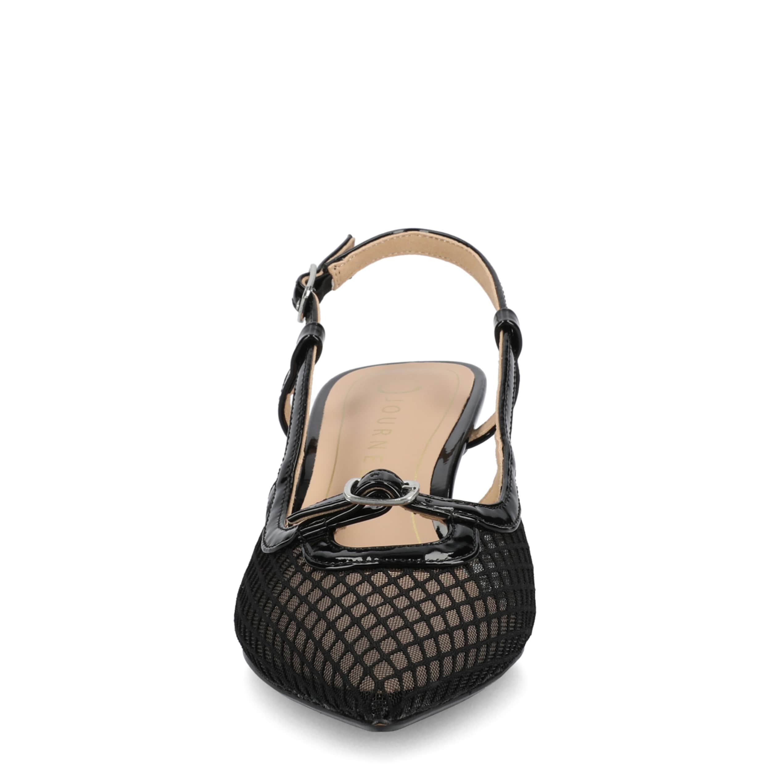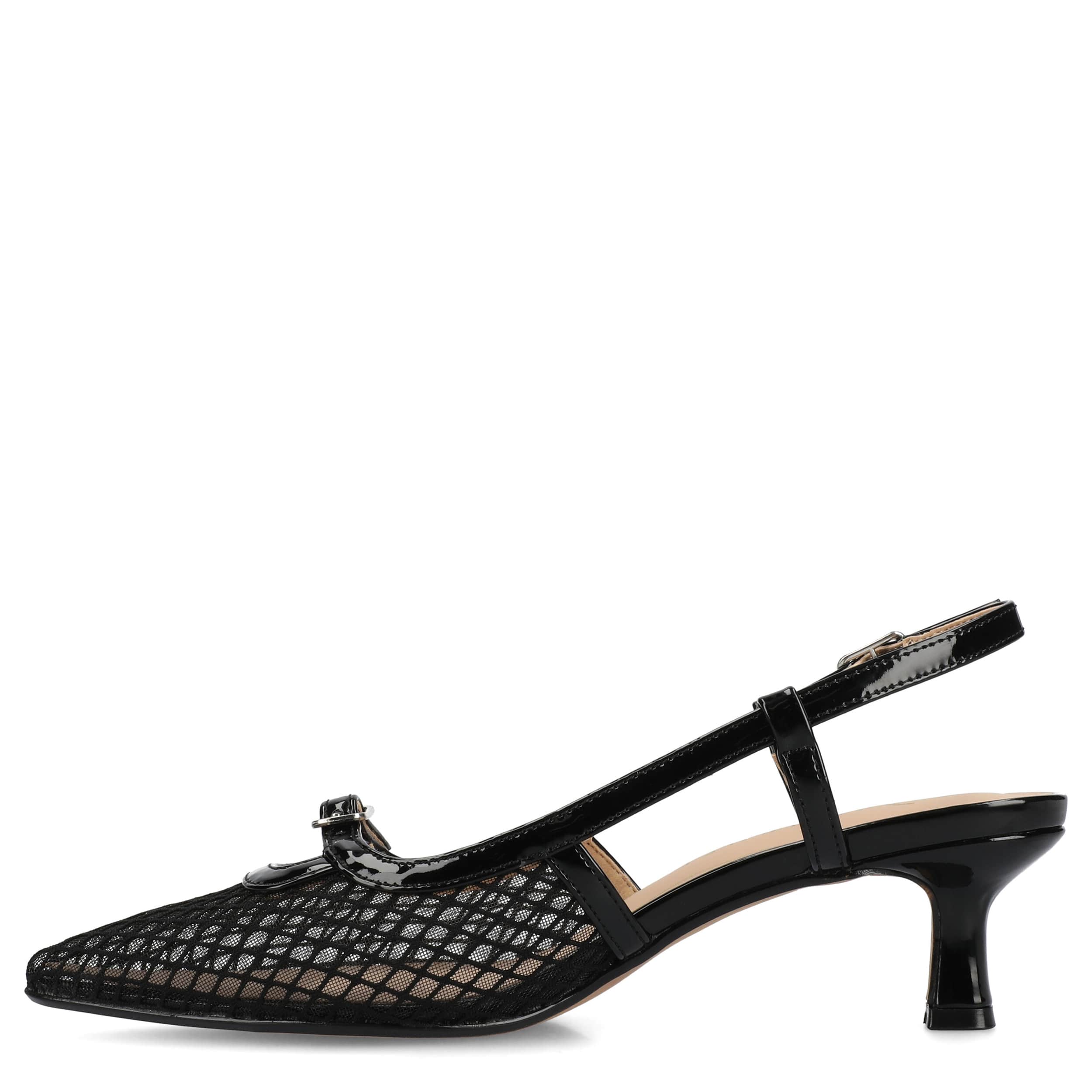 Use your style to stand out in the Journee Collection Padma pump. With a sheer mesh upper featuring a patent leather trim with center buckle accent, this heel adds extra feminine flair. The insole soothes your foot, while the kitten heel offers just enough lift.