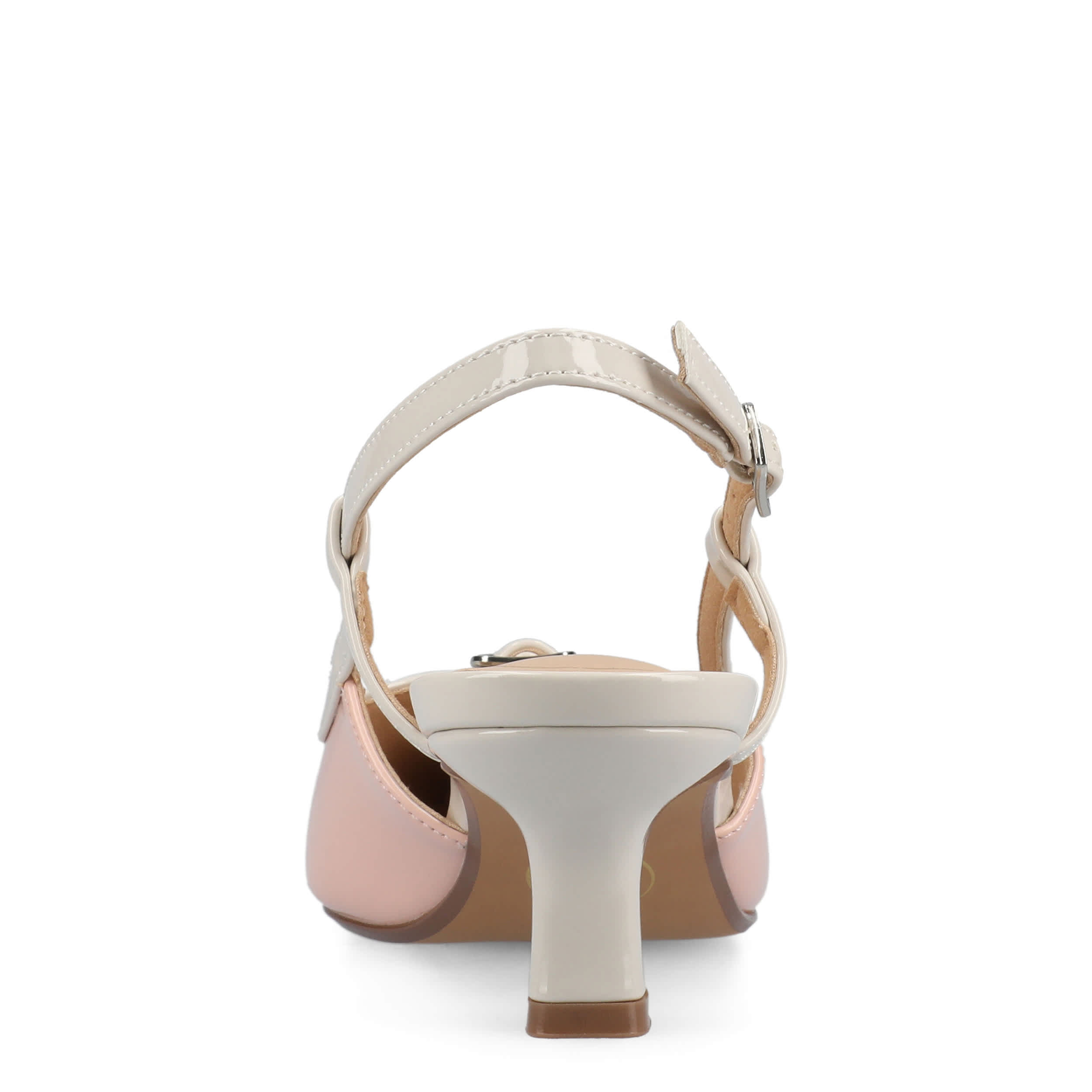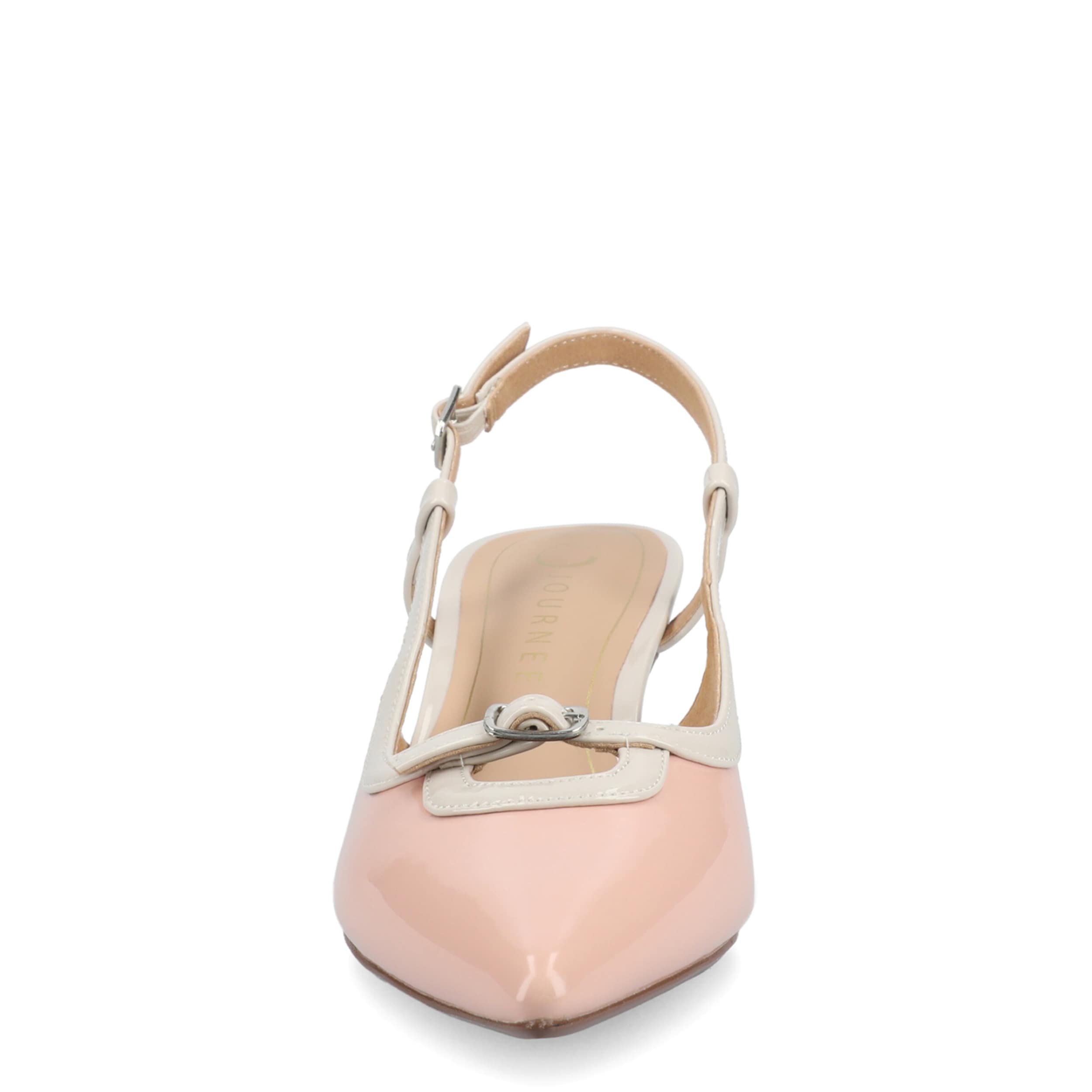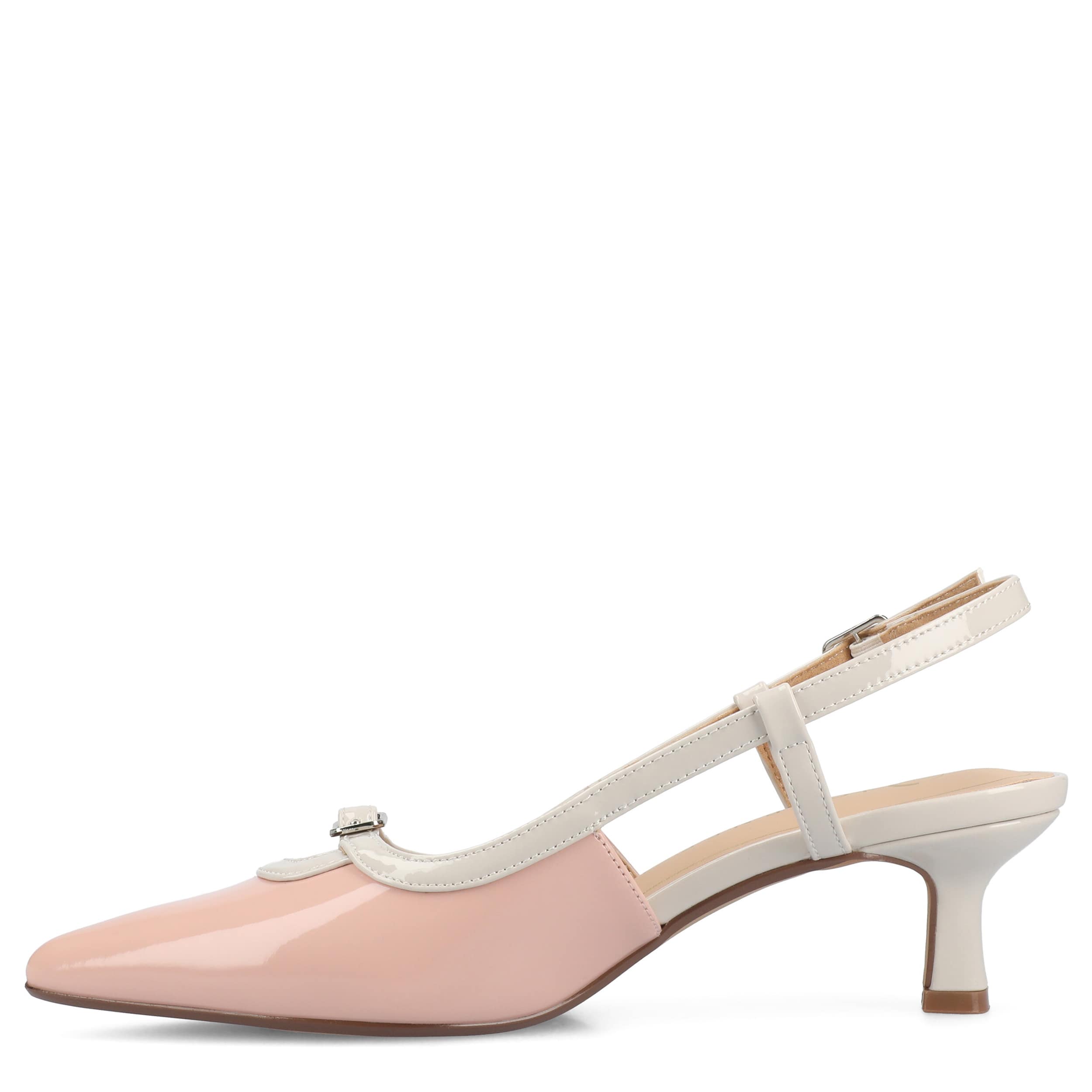 Use your style to stand out in the Journee Collection Padma pump. With a glossy patent leather upper featuring a contrast trim with center buckle accent, this heel adds extra feminine flair. The insole soothes your foot, while the kitten heel offers just enough lift.