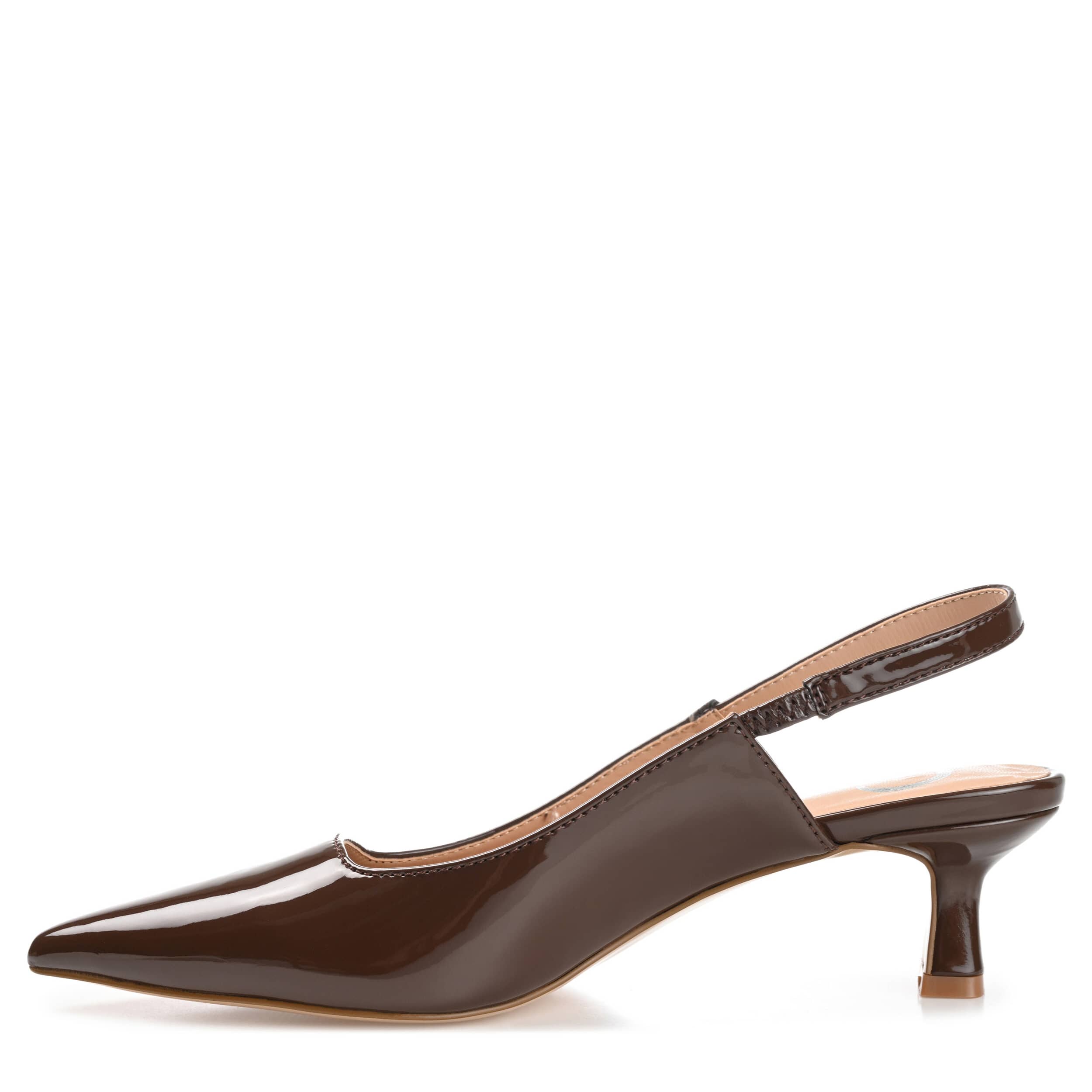 Make a statement with the Paulina women's pump from Journee Collection. With a vegan patent leather upper featuring a delicate slingback strap, this pump, with its sophisticated pointy toe, looks sensational with any outfit. A padded footbed comforts and soothes your feet, while the 2" kitten heel offers an elegant lift.