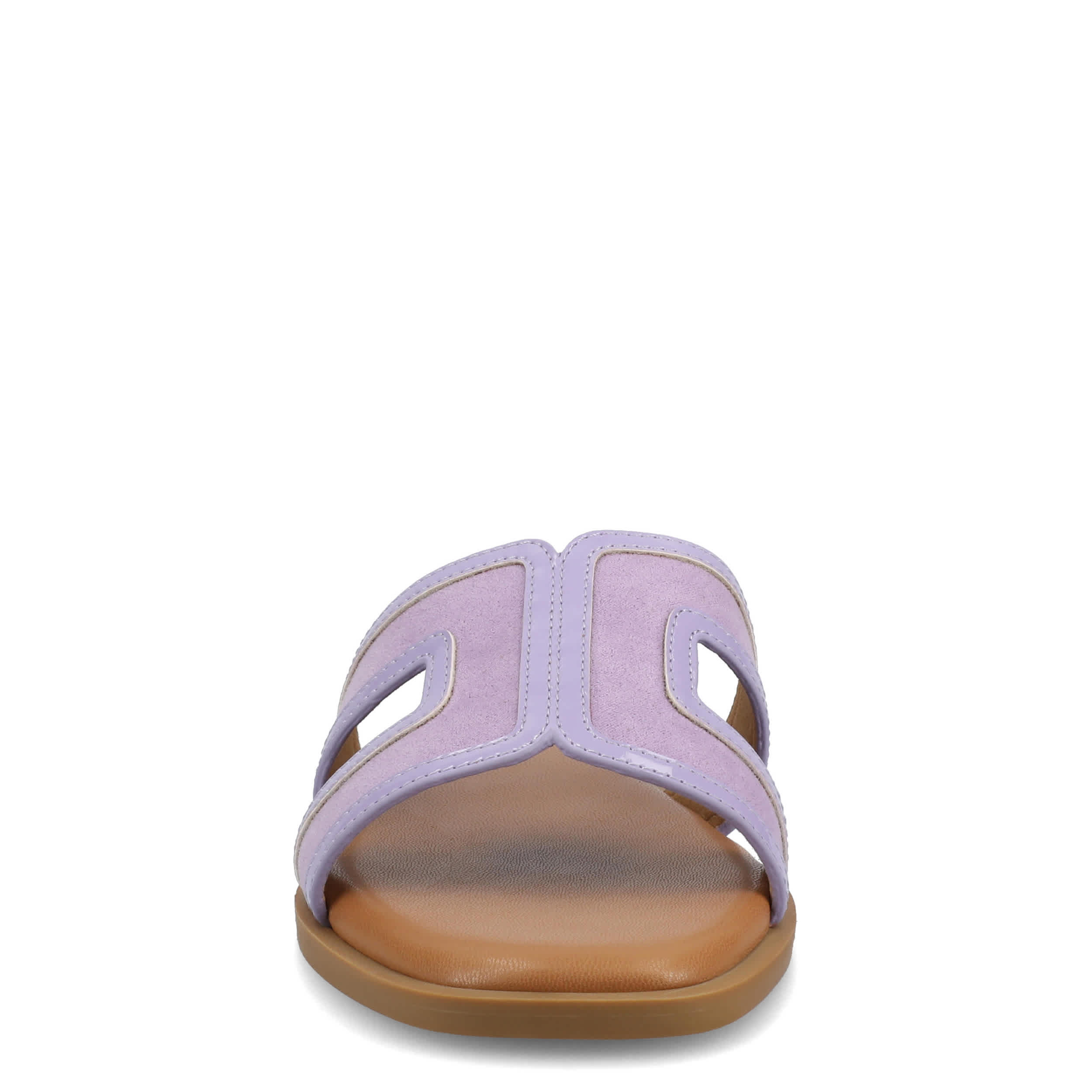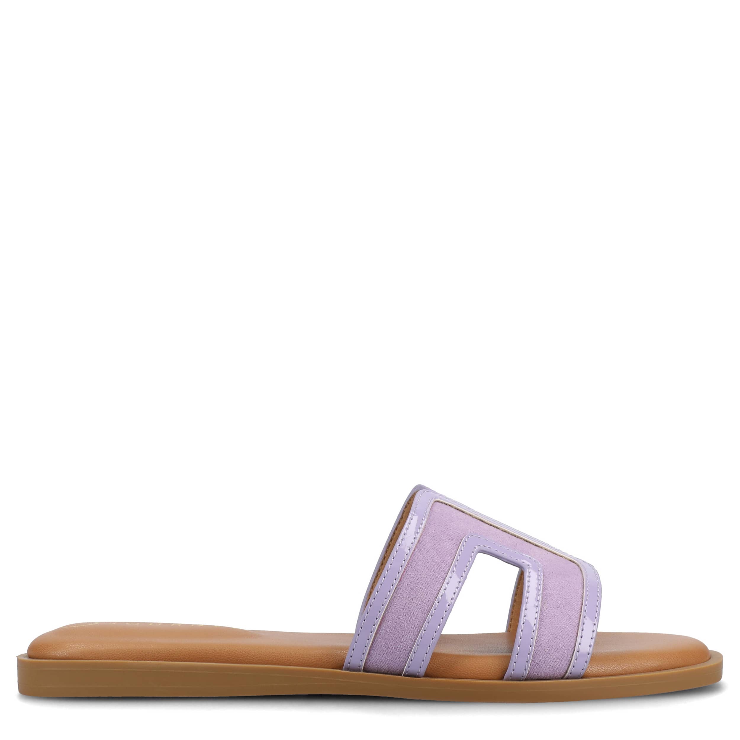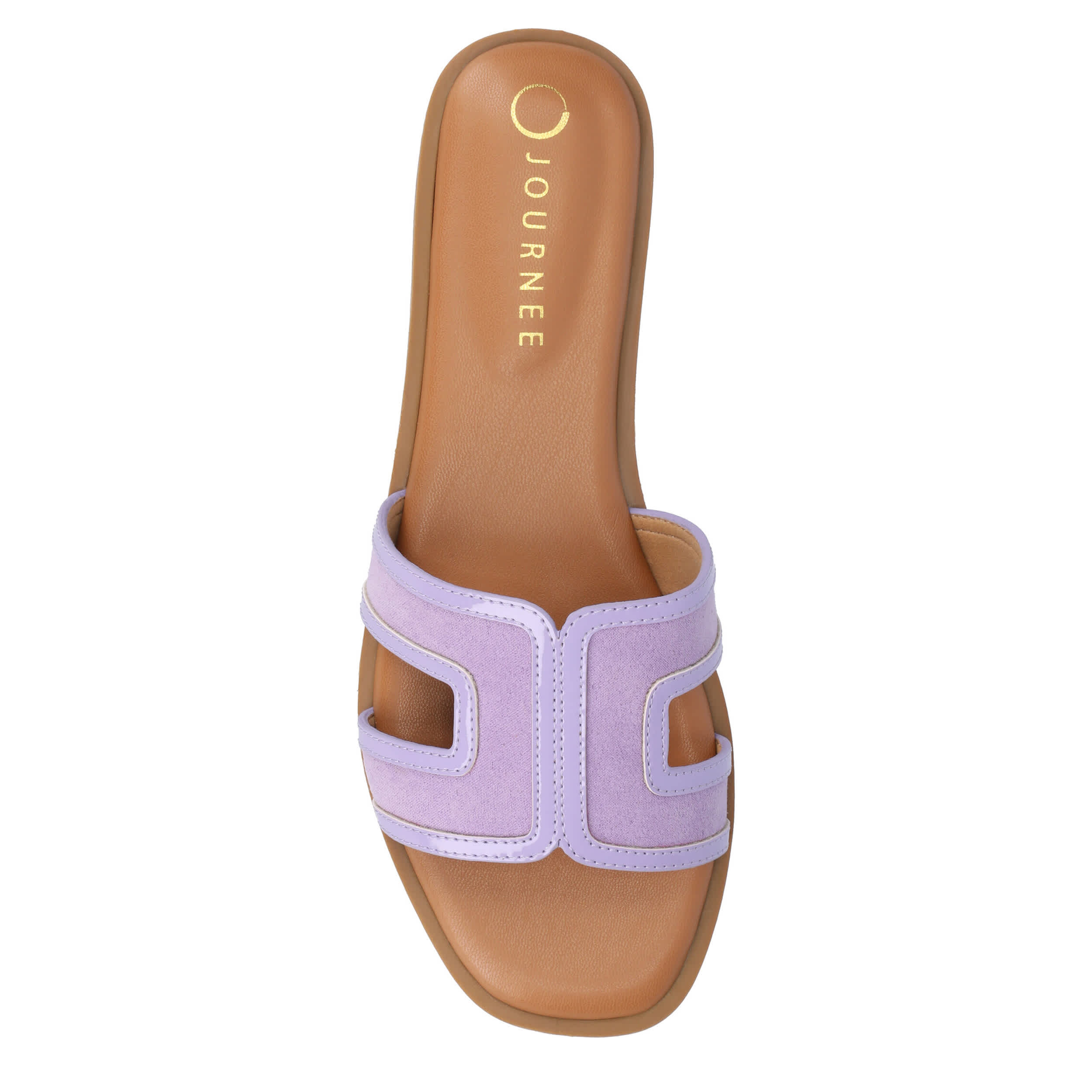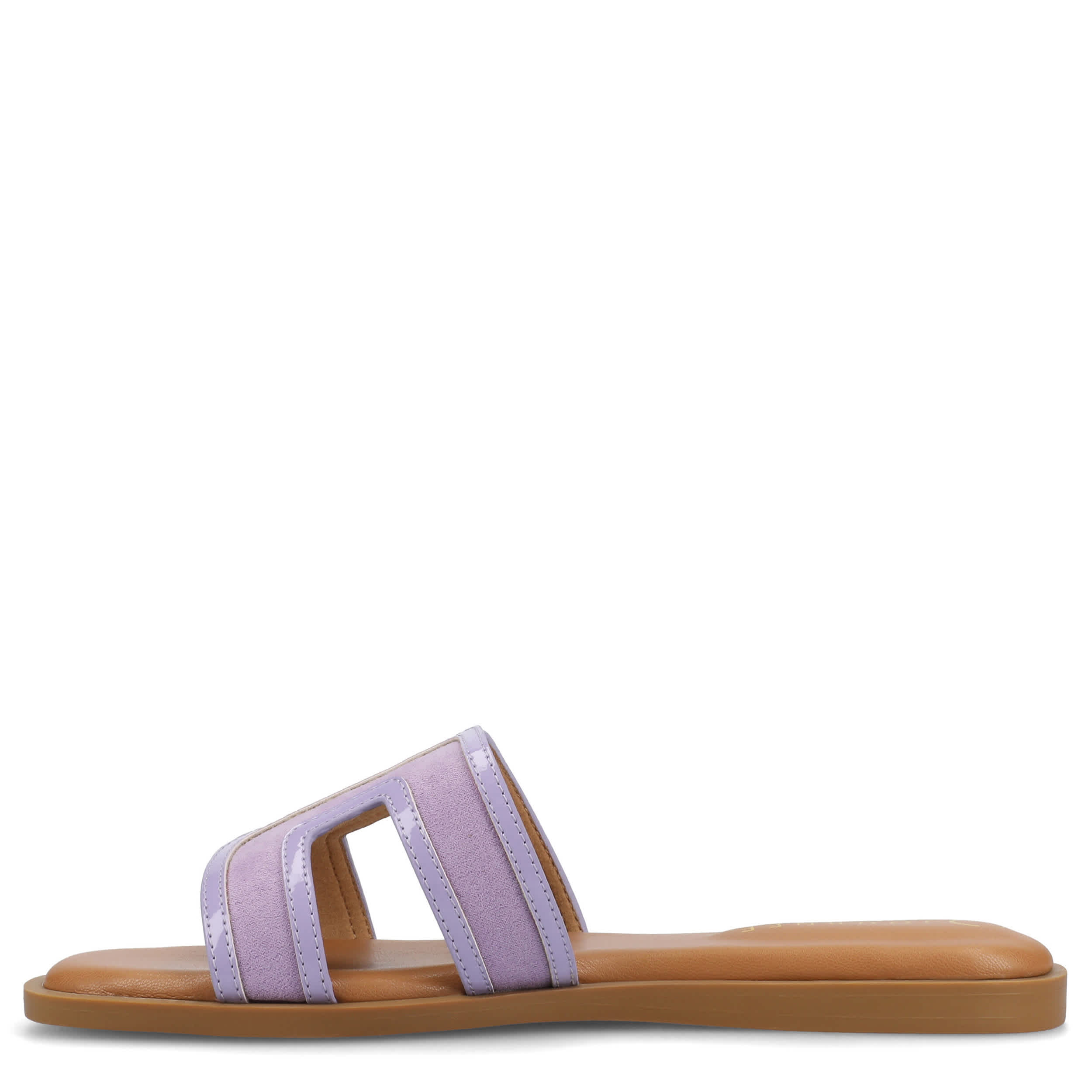 Style a fresh look with the Primah sandal from Journee Collection. Featuring a faux leather upper with patent leather trim, this H-strap slide is easy to wear and even easier to pair with your closet. The footbed and flat sole support your steps all day long.