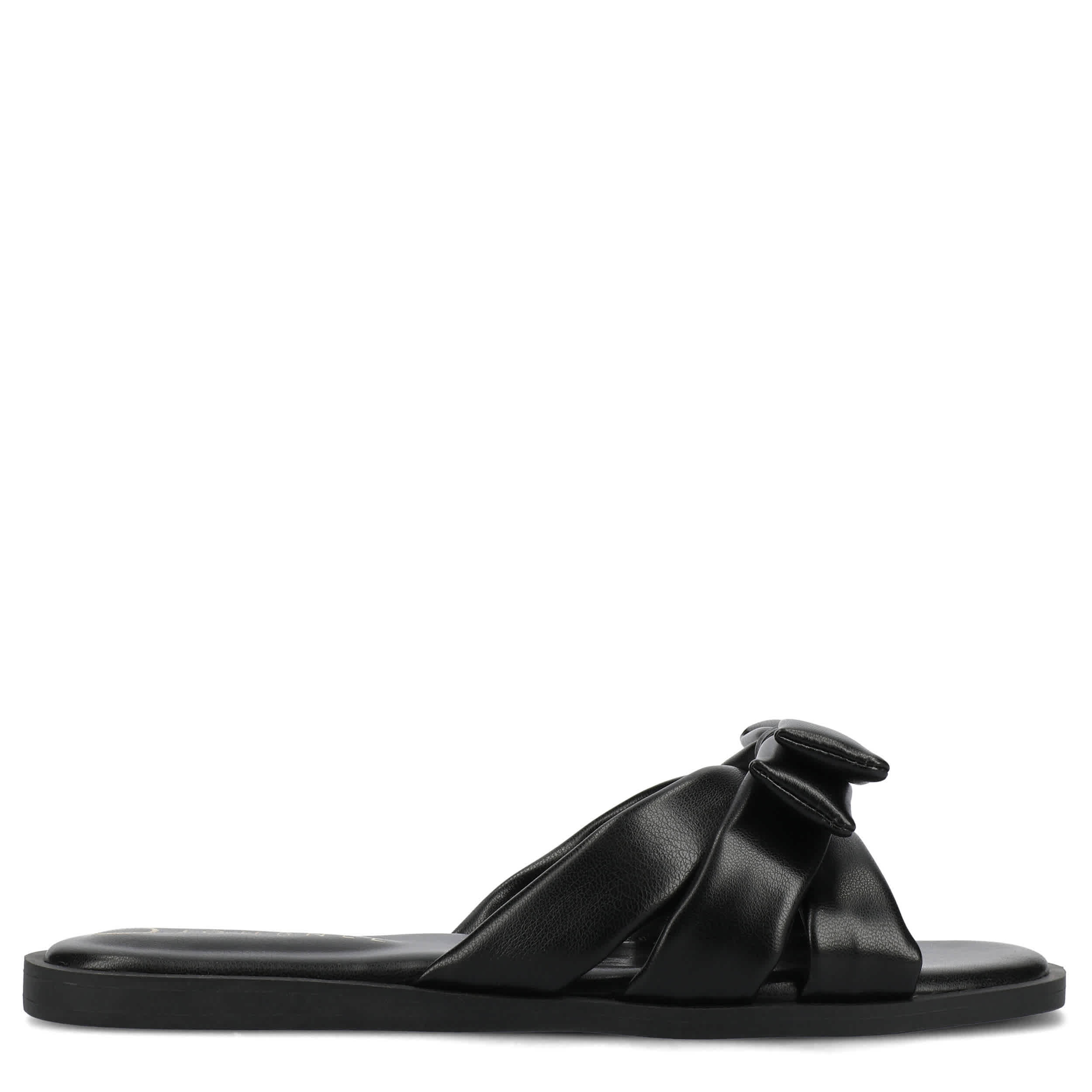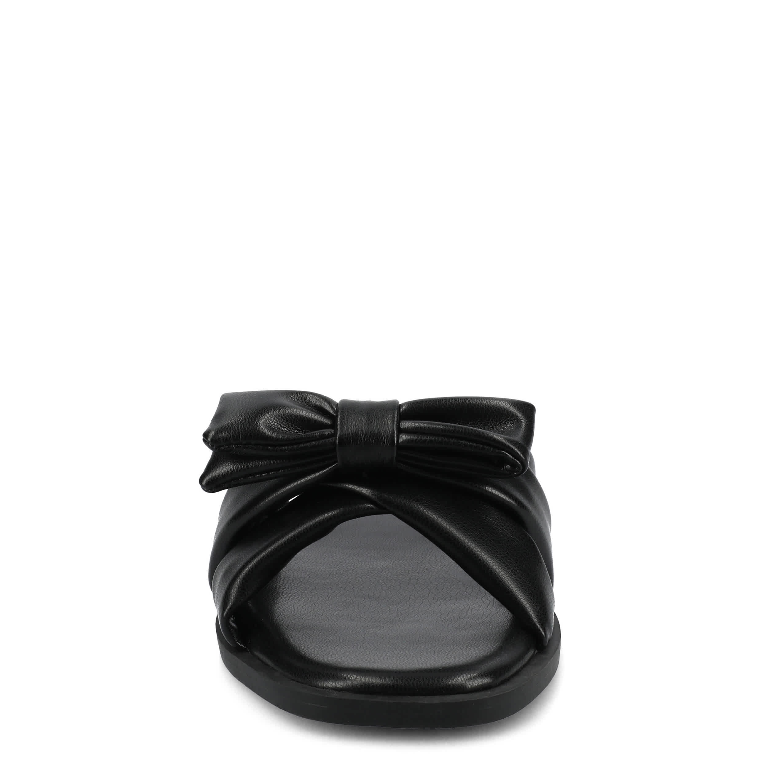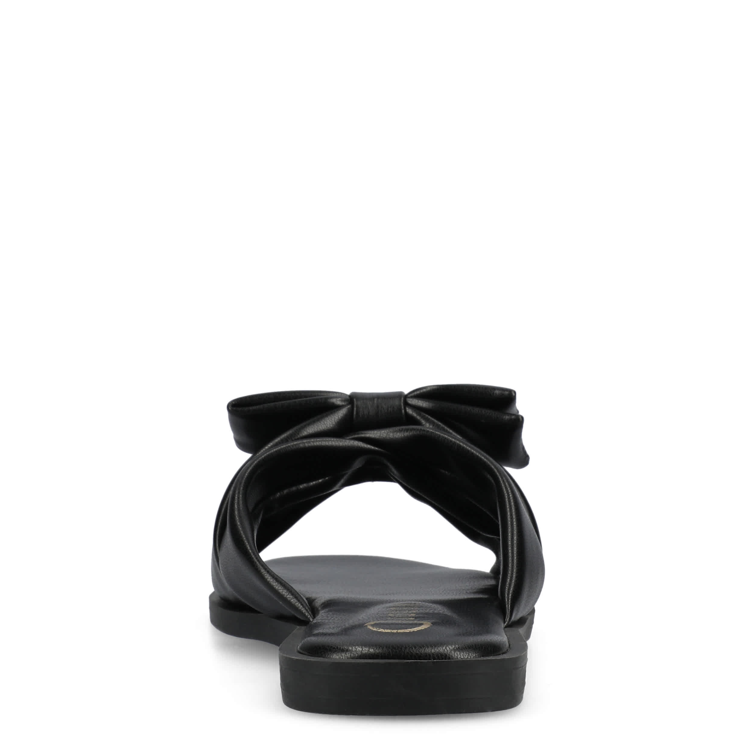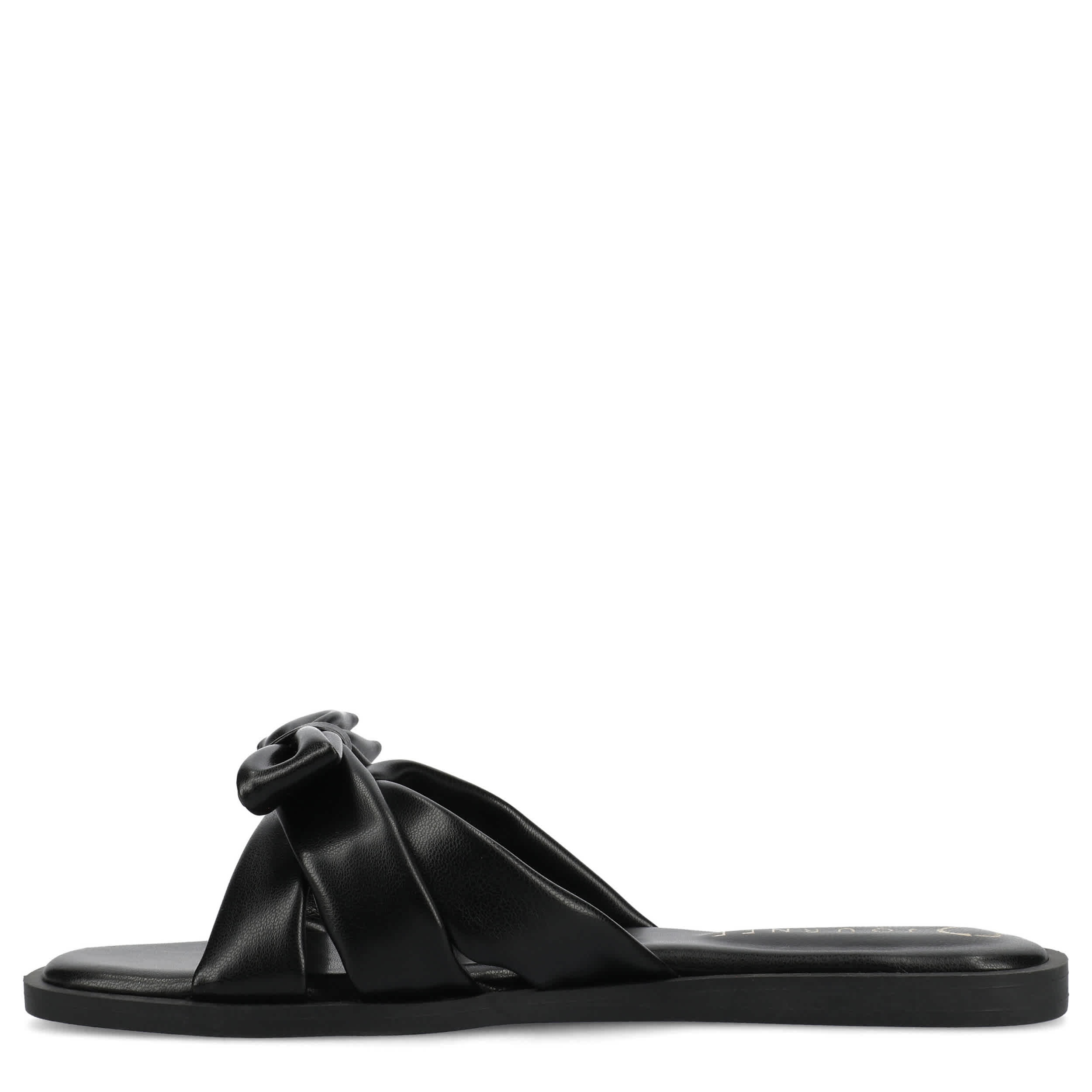 Simple design with a feminine touch in the Journee Collection Prylin slide sandal. Featuring a bowed faux leather upper, this single band flat pairs comfort with style. The footbed and sole provide all-day support.