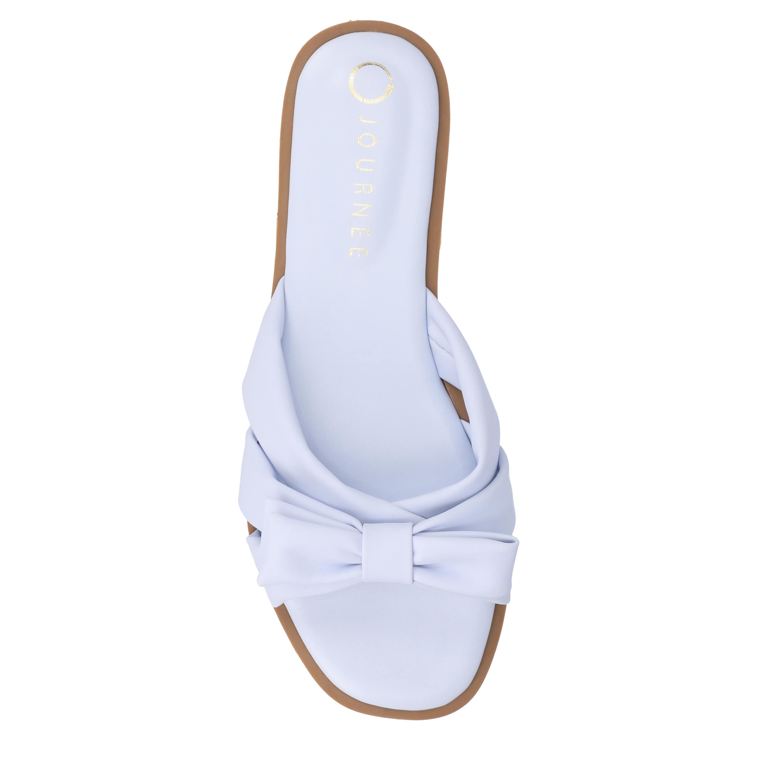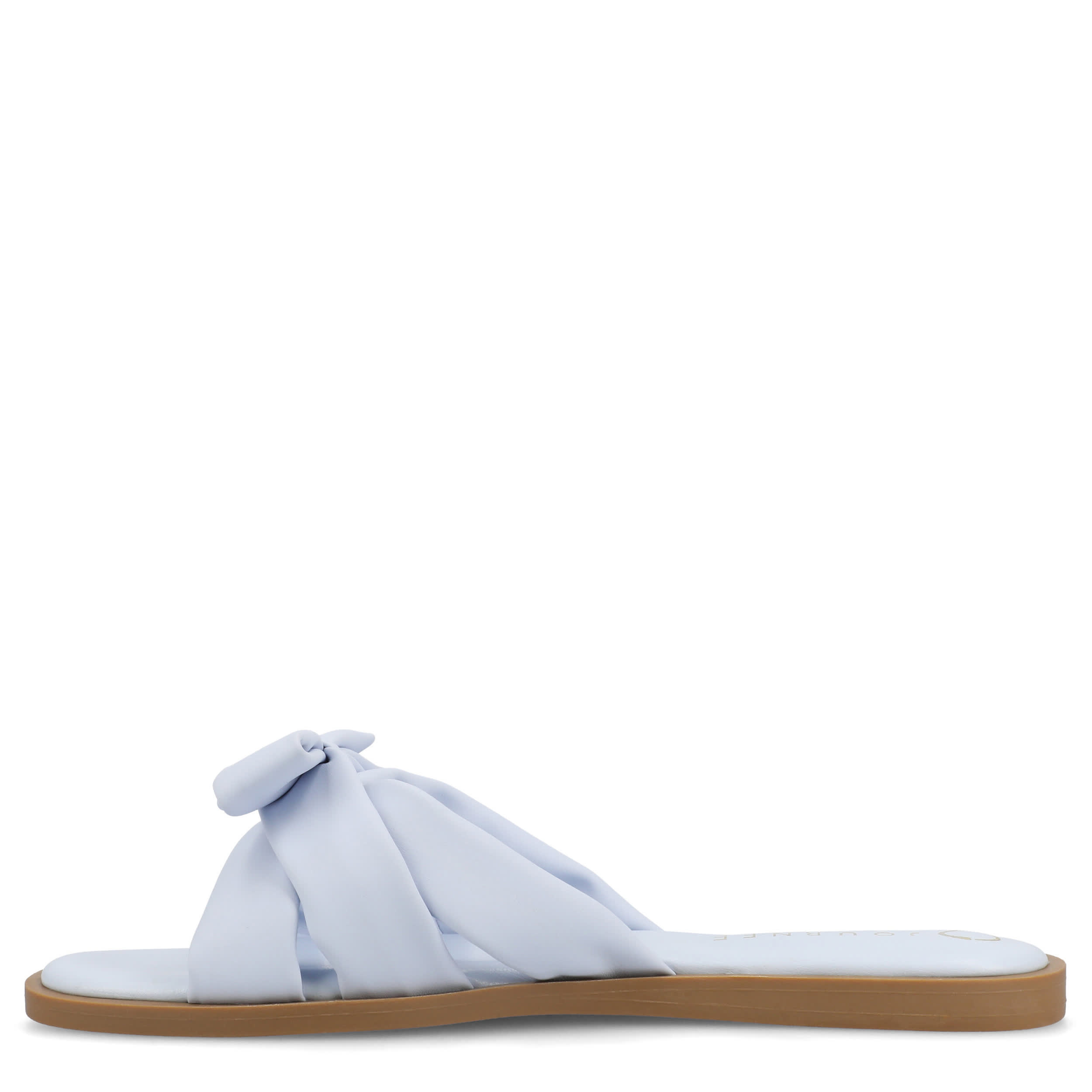 Simple design with a feminine touch in the Journee Collection Prylin slide sandal. Featuring a bowed faux leather upper, this single band flat pairs comfort with style. The footbed and sole provide all-day support.