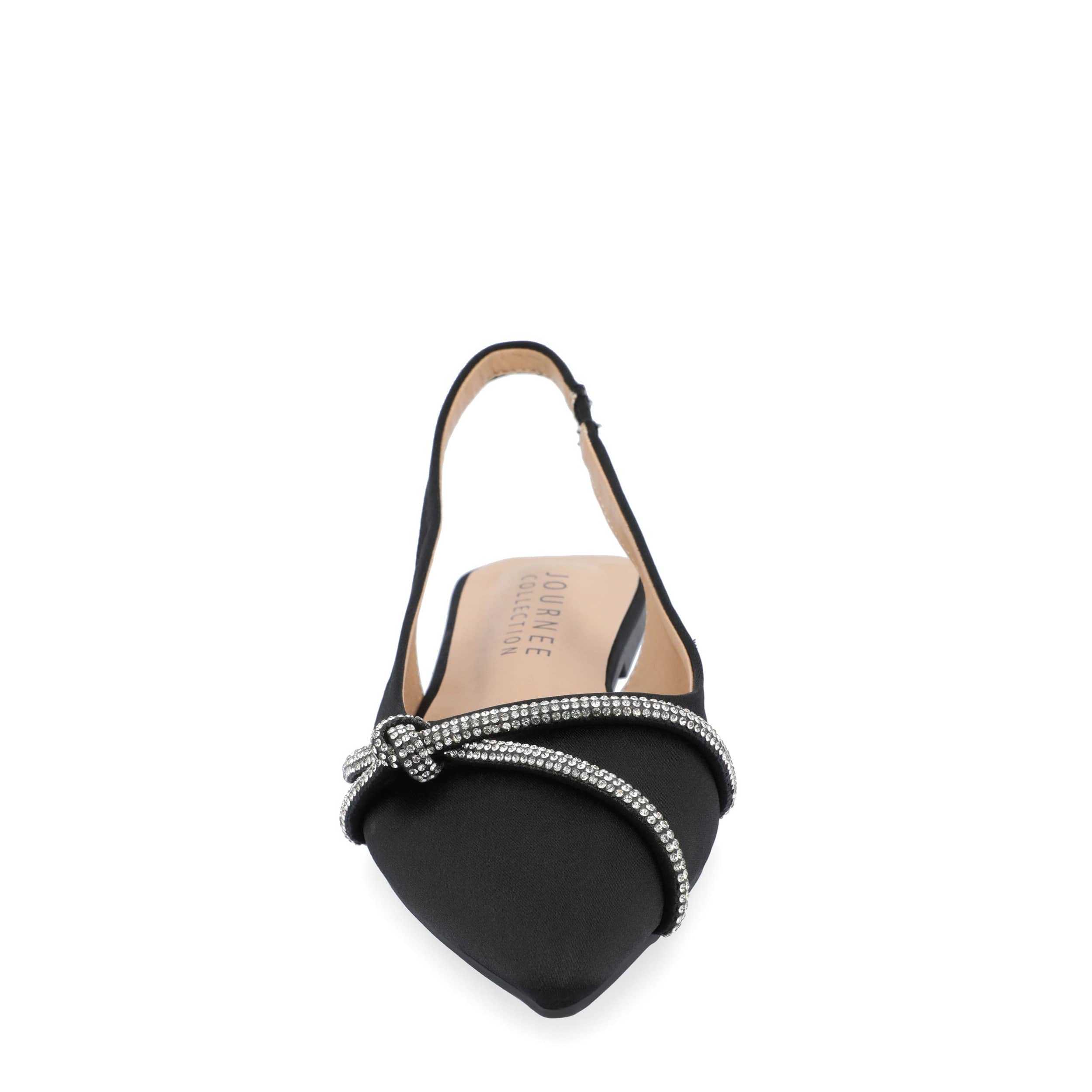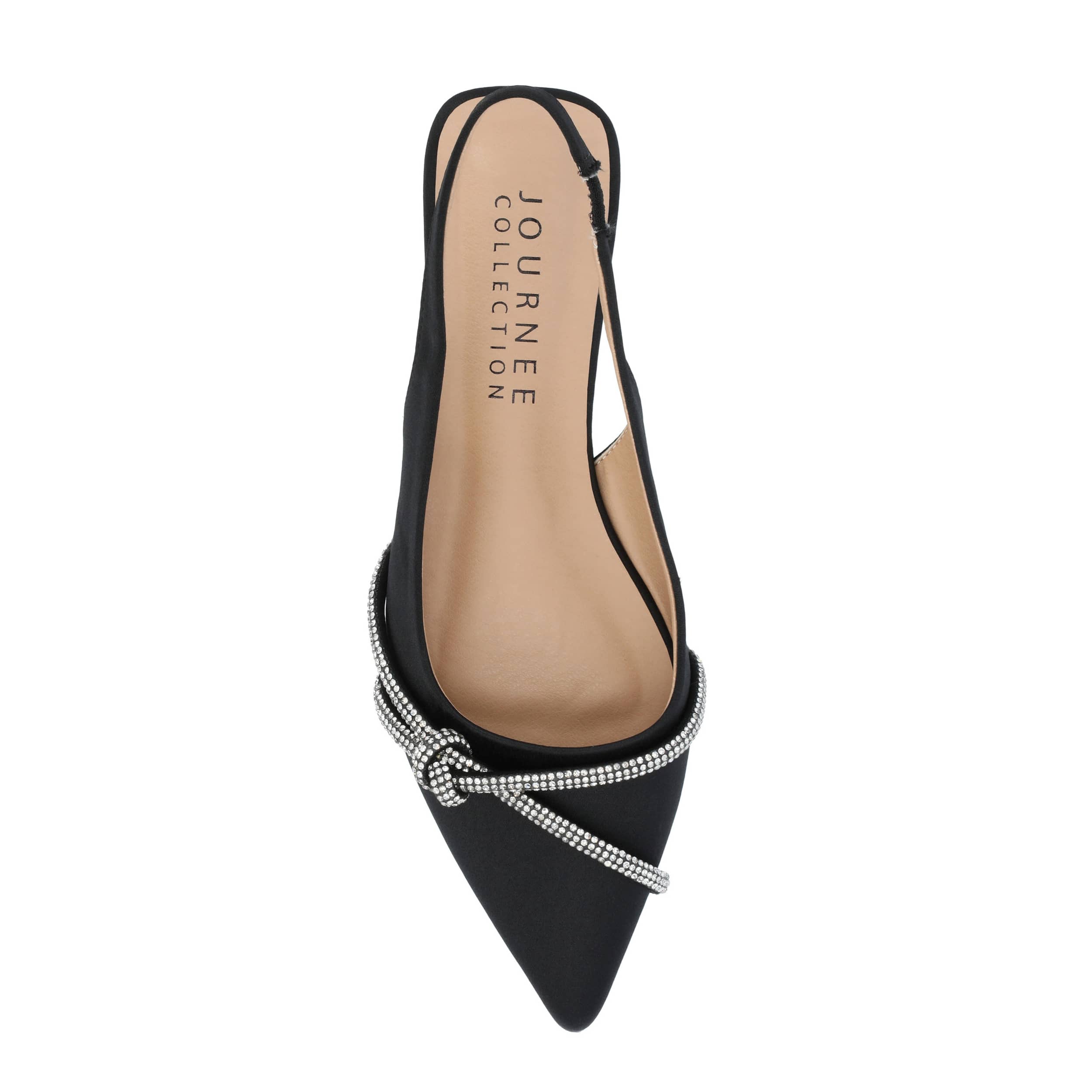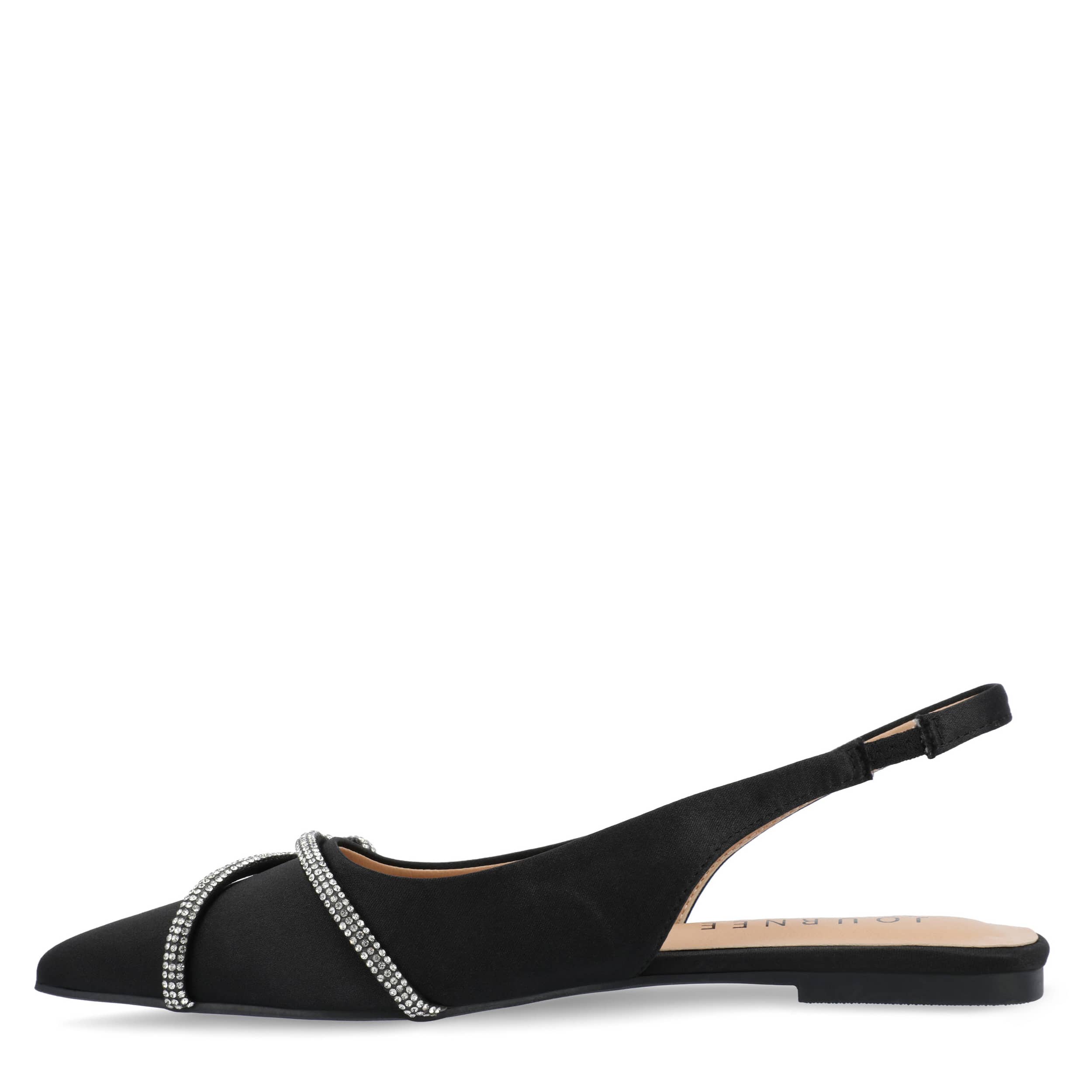Pull off a fabulous look in the Rebbel women's flat from Journee Collection. With a satin upper featuring a sparkly rhinestone accent strap, this slingback flat, with its chic pointy toe, effortlessly goes from day to night. A padded footbed provides plenty of comfort and support for all-day wear.
