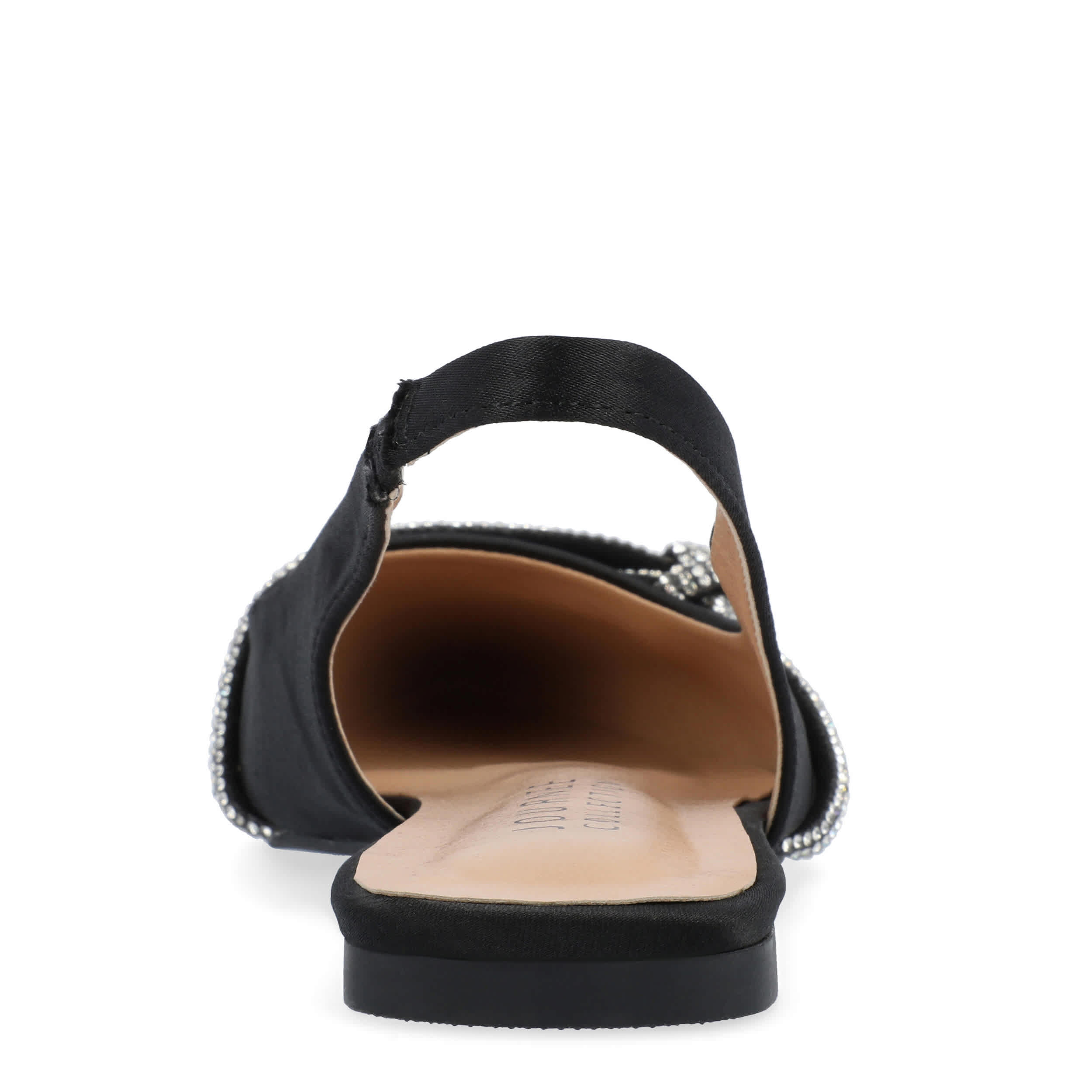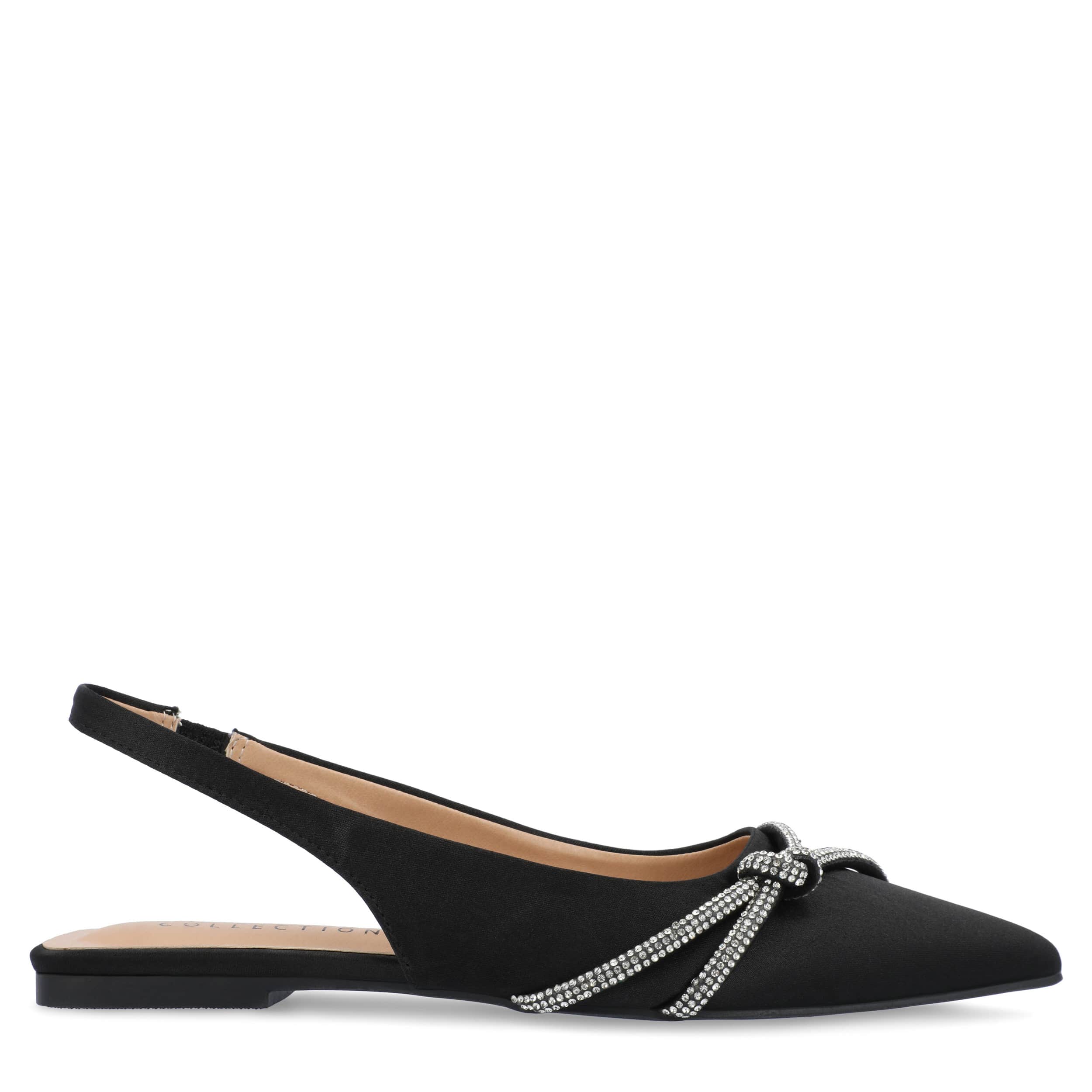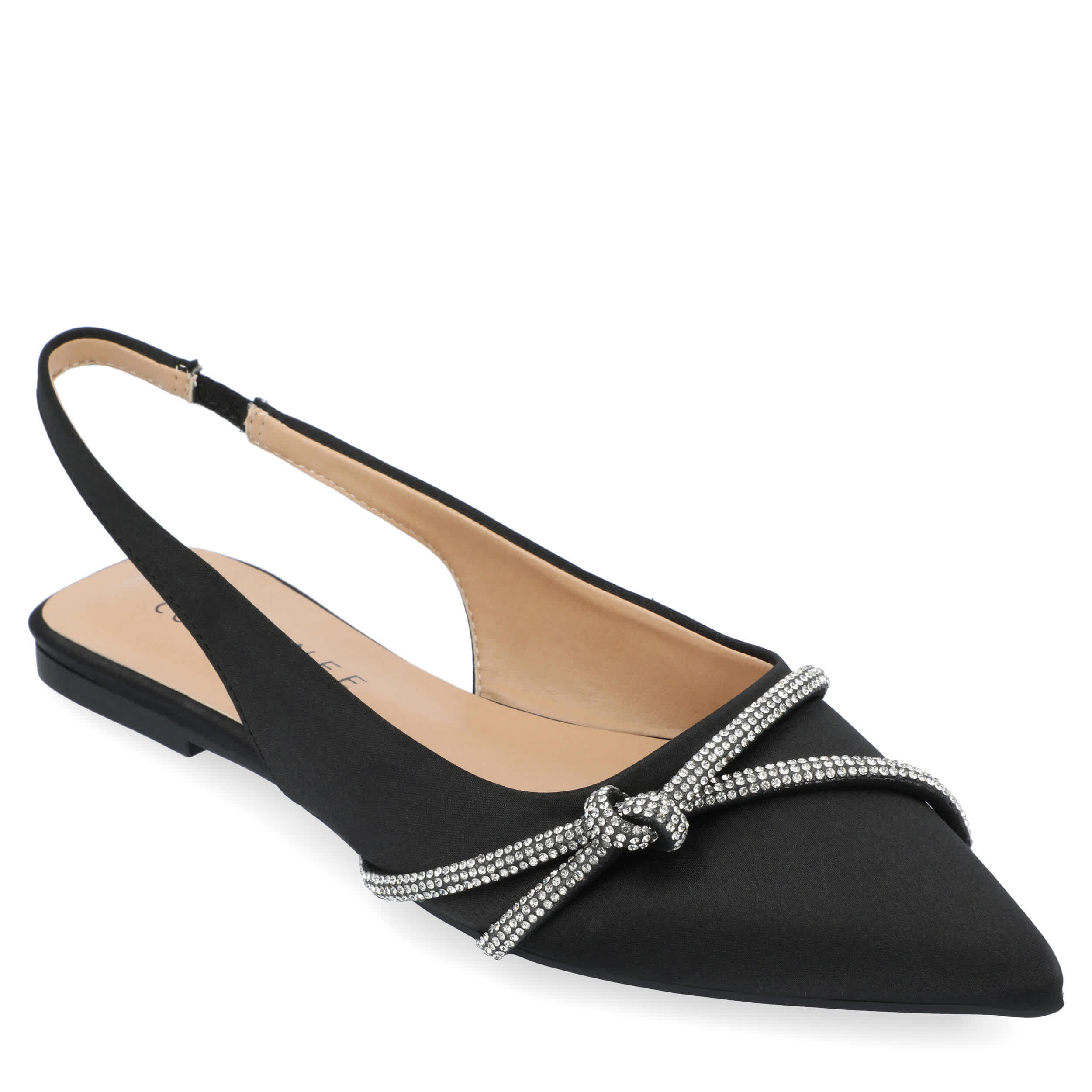 Pull off a fabulous look in the Rebbel women's flat from Journee Collection. With a satin upper featuring a sparkly rhinestone accent strap, this slingback flat, with its chic pointy toe, effortlessly goes from day to night. A padded footbed provides plenty of comfort and support for all-day wear.