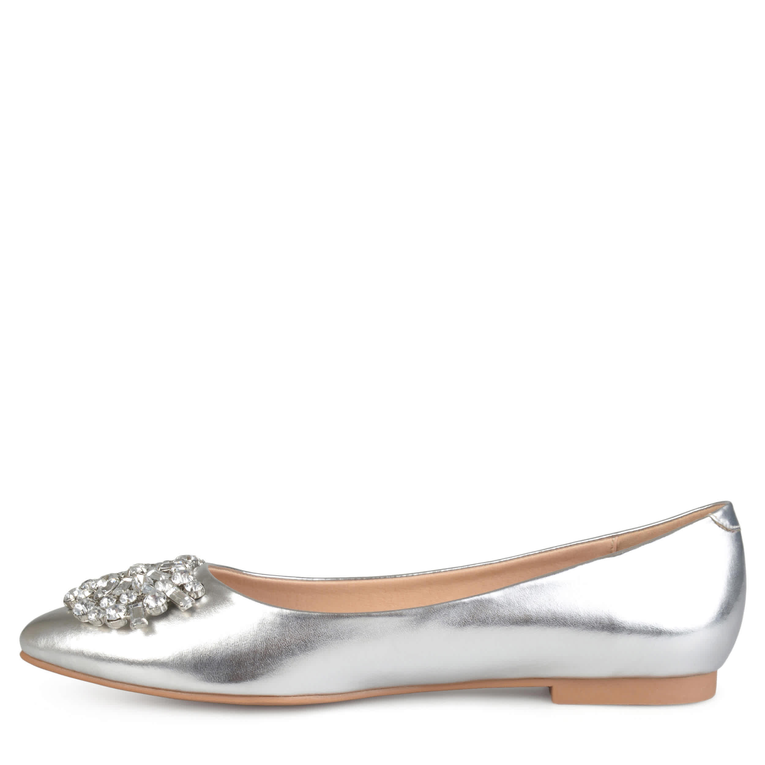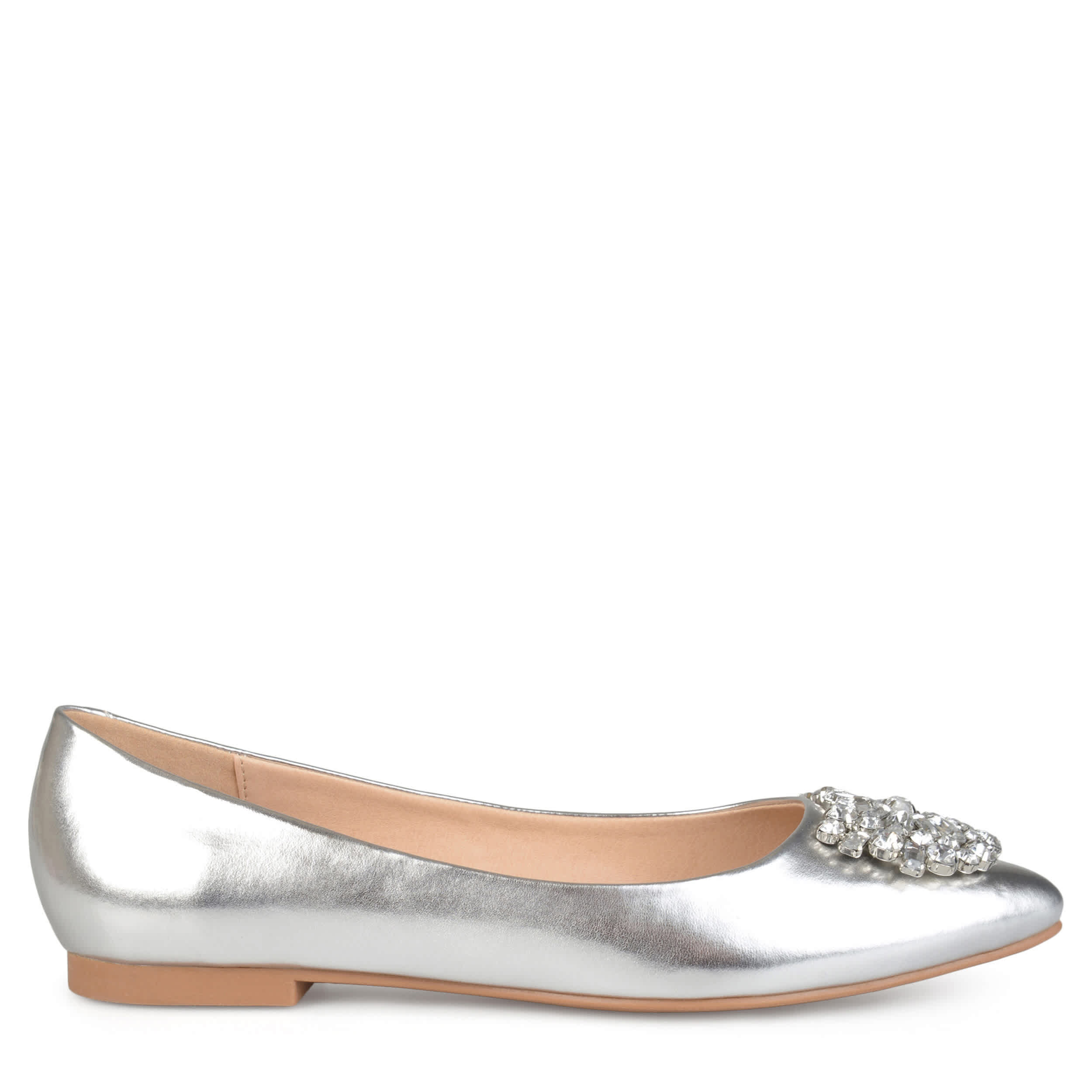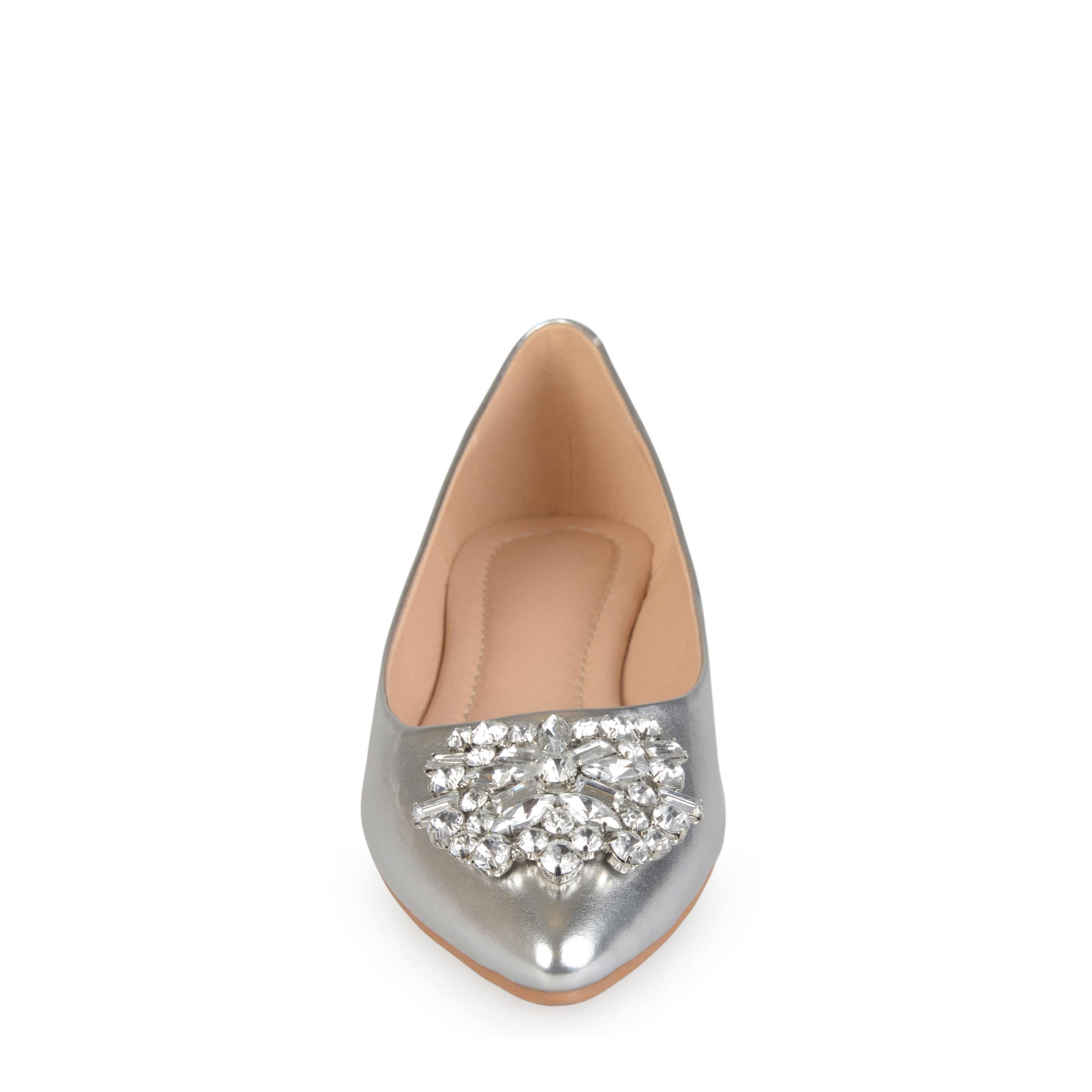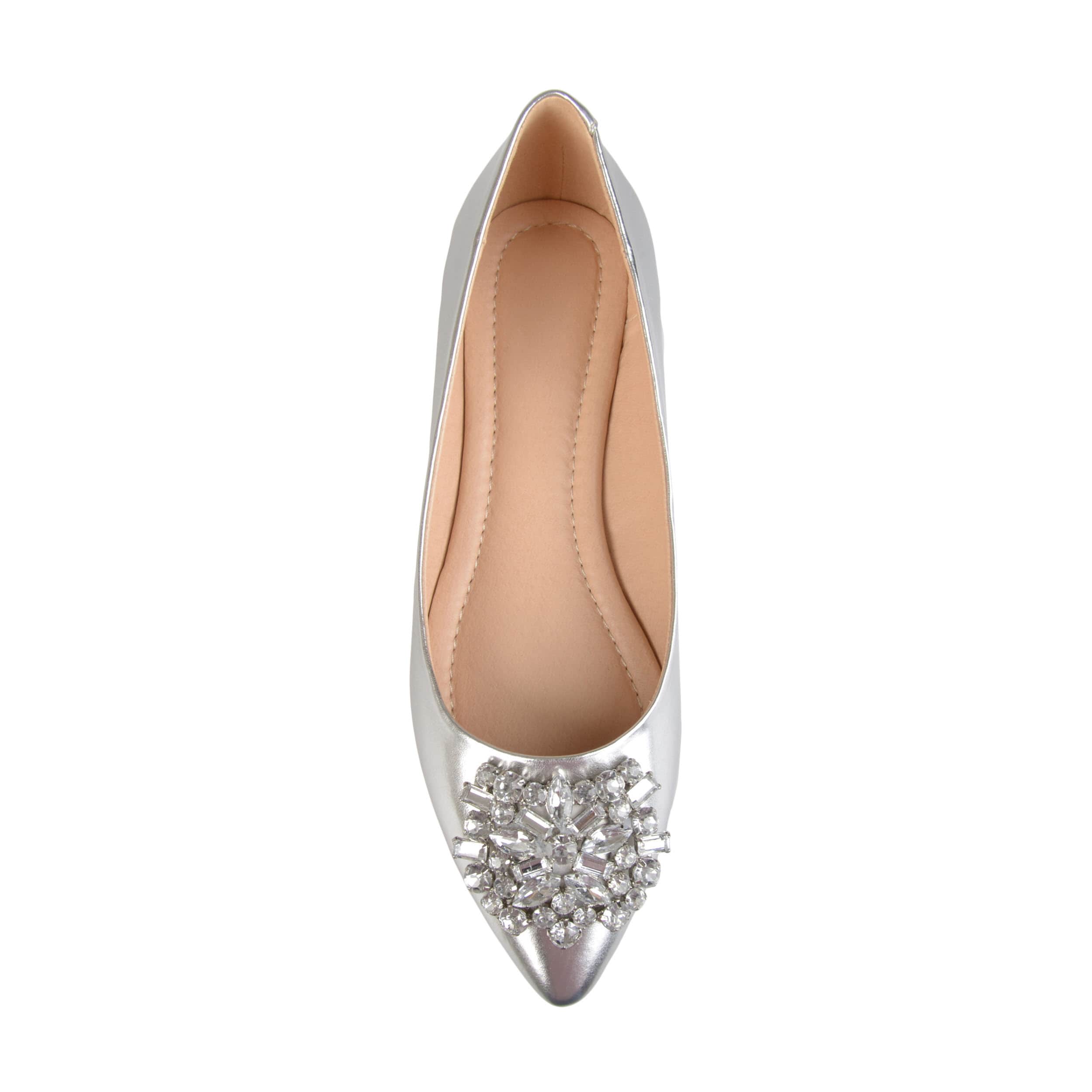 Dazzle and shine with this Renzo flat by Journee Collection. The synthetic upper has gorgeous brooch accent that will make any outfit pop. This flat is perfect for dressy events, the office or to just add some shimmer to a casual outfit.