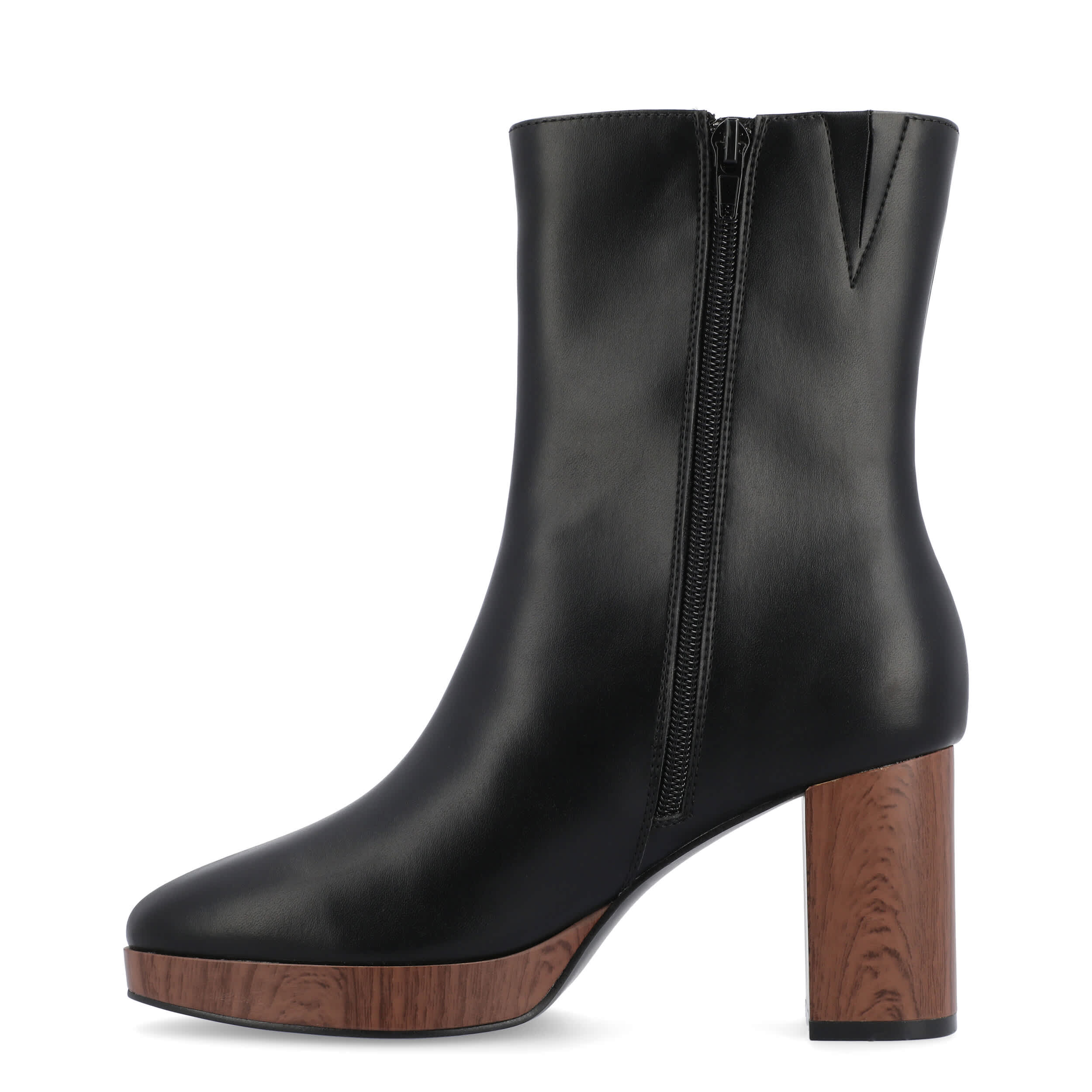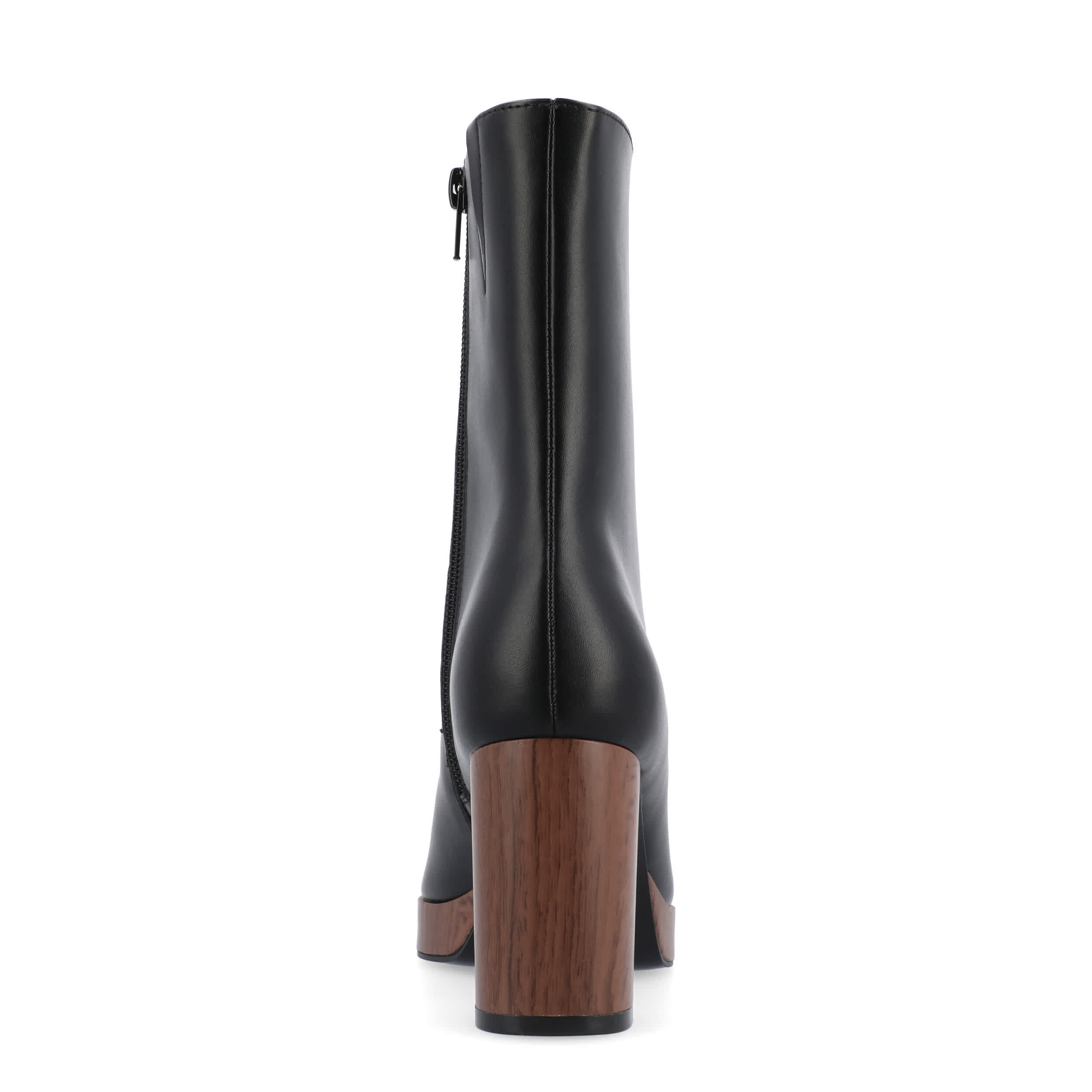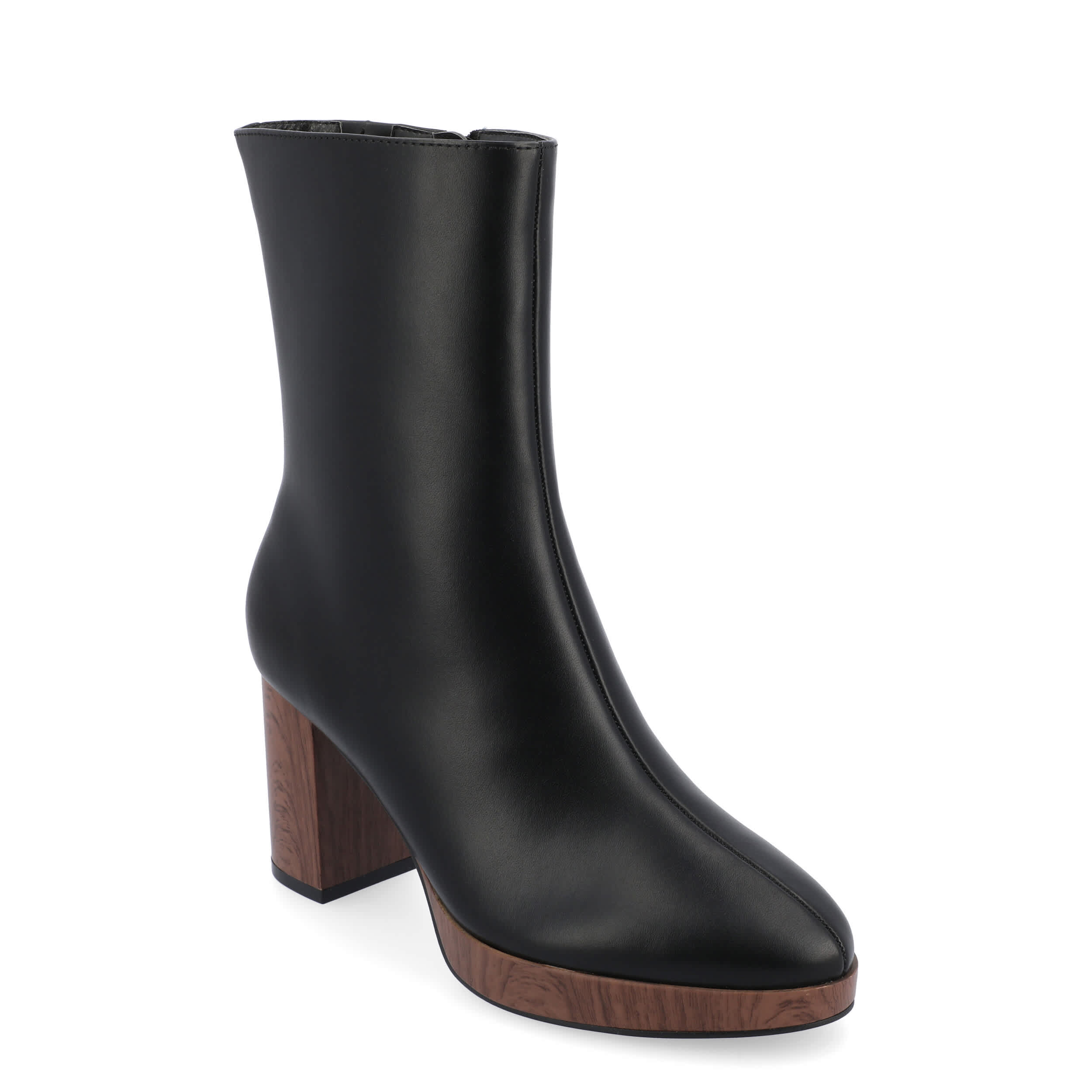 Smooth out your look in the Romer women's bootie by Journee Collection. With a vegan leather upper featuring an almond toe, this ankle boot has a center seam and faux wood accents for extra style. The Memory Foam insole cushions every step while the platform & block heel offer more than enough height.