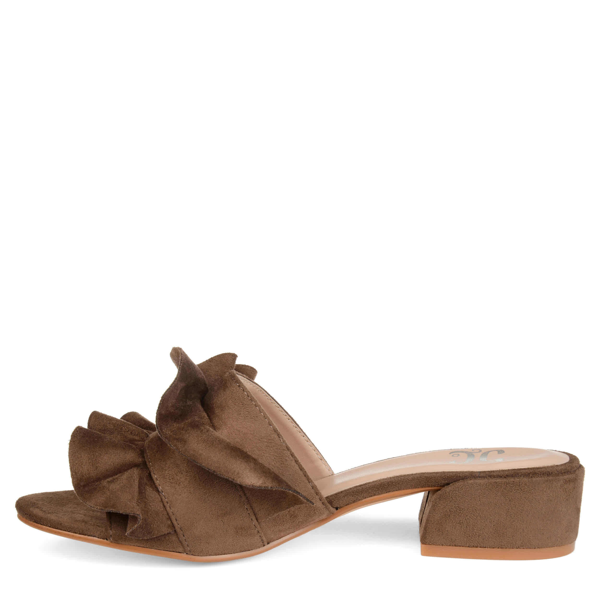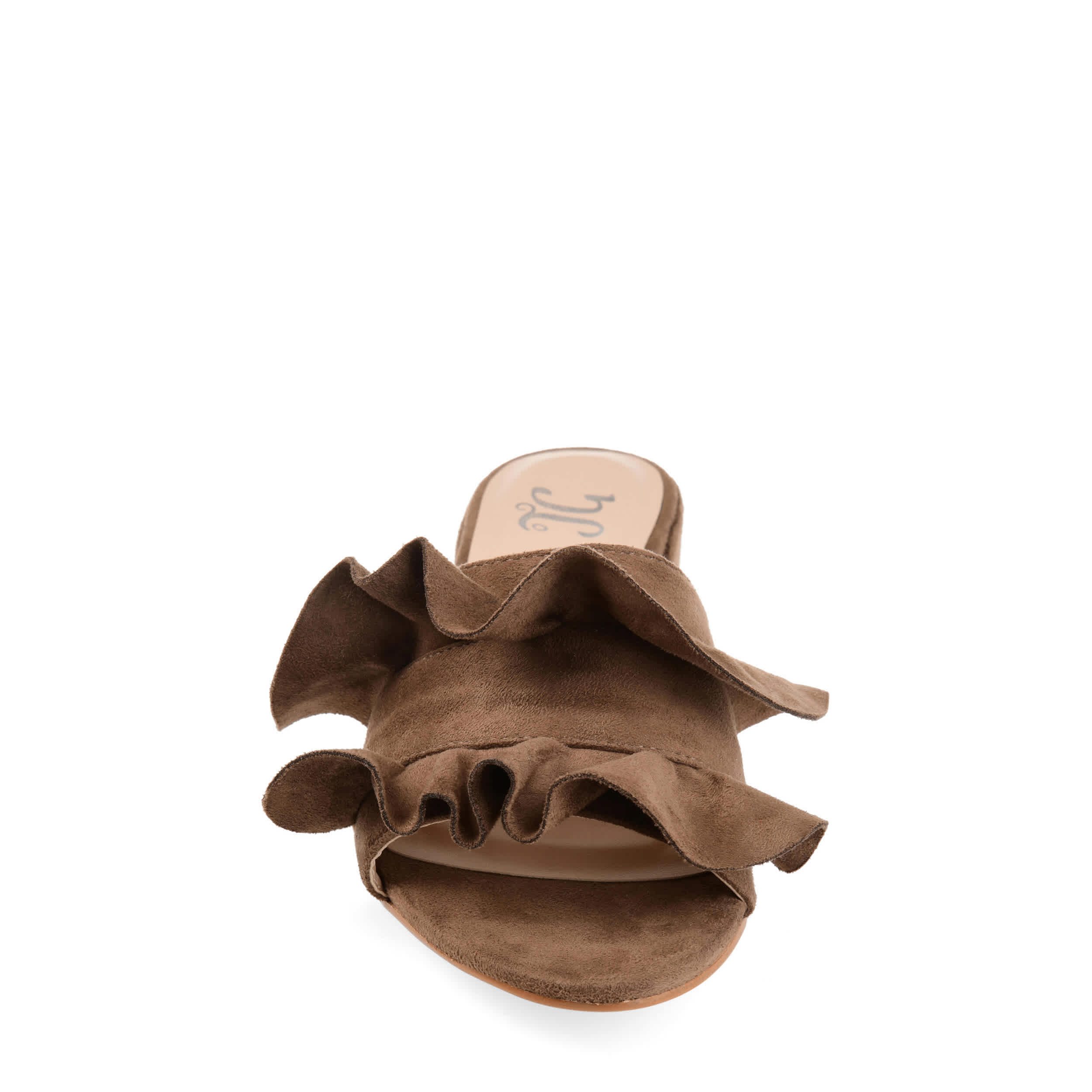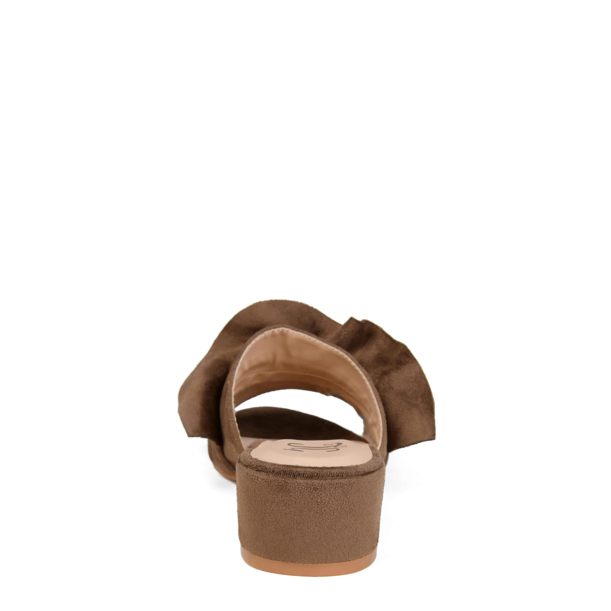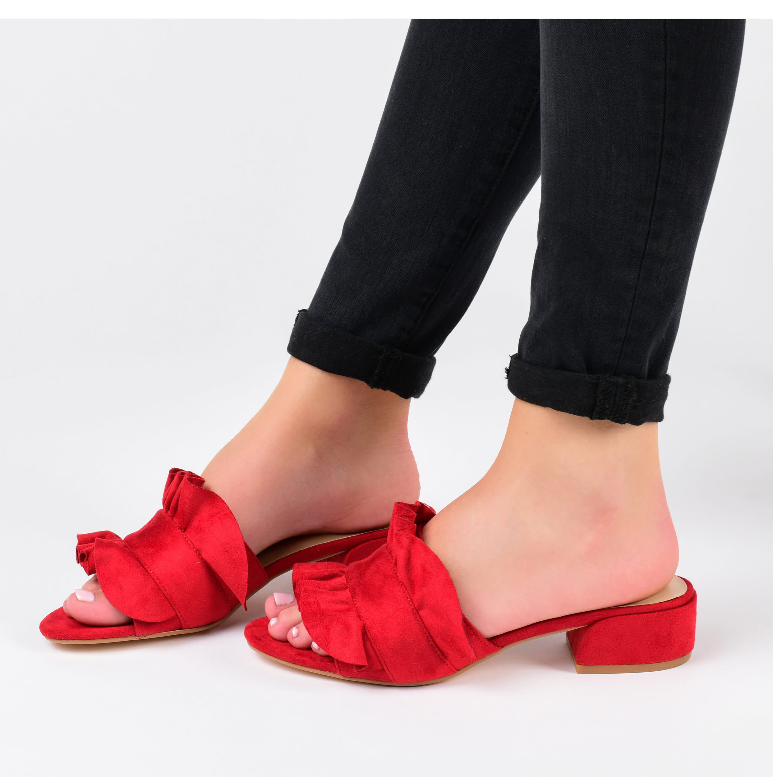Give your sunny look a chic finish with this Journee Collection Sabica sandal. The faux suede upper has a ruffle style that gives this sandal a unique flair. The 1½" covered block heel lifts your silhouette so you can step with purpose.