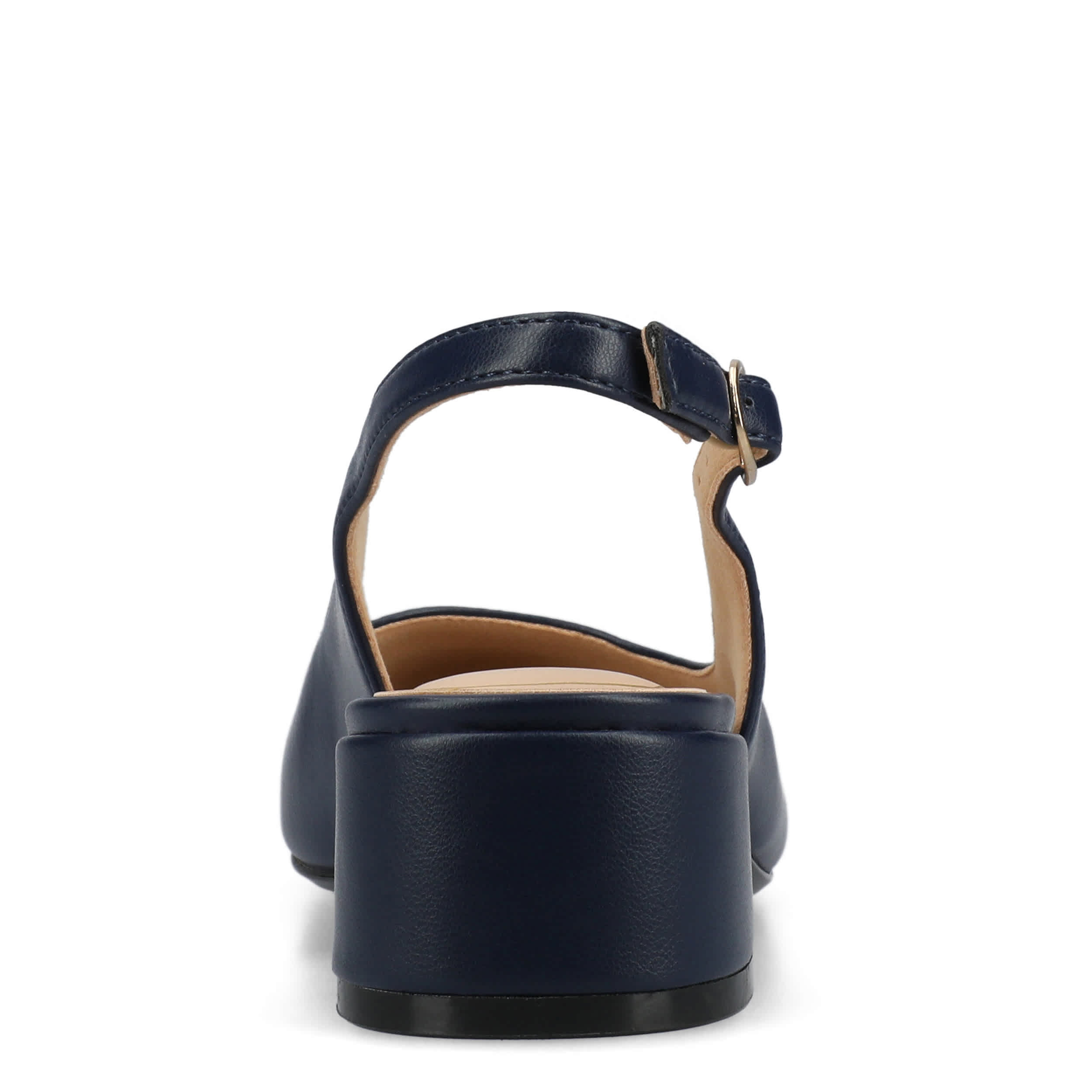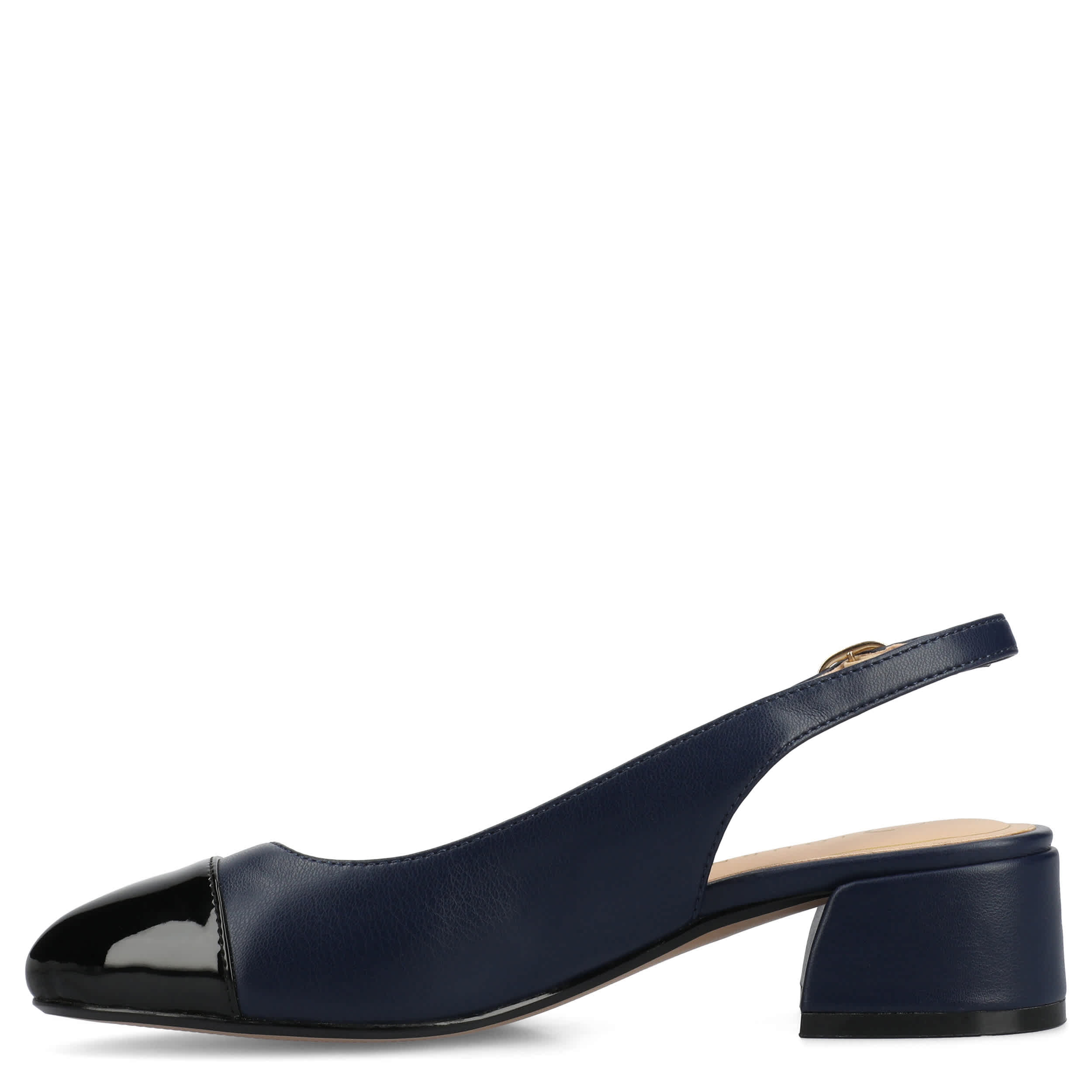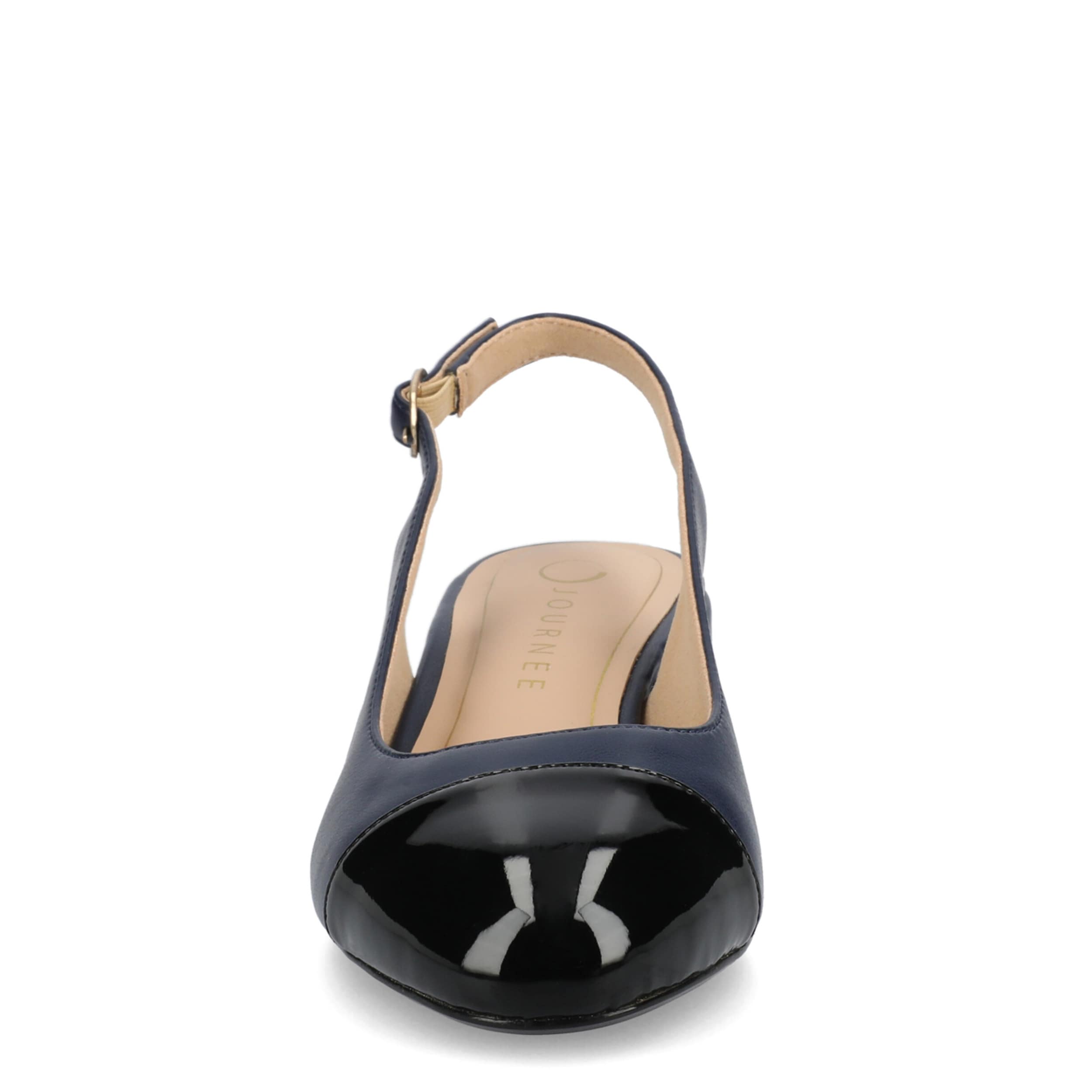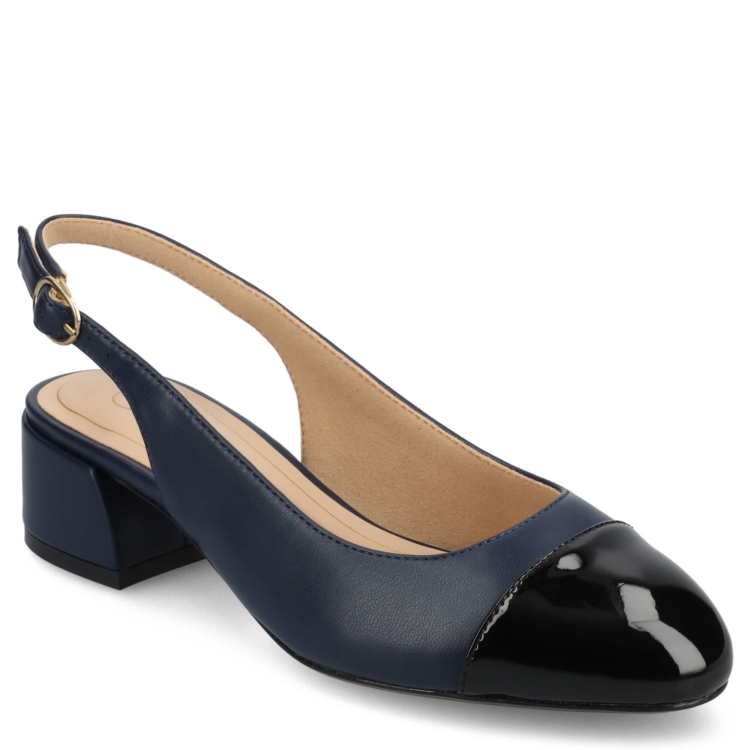 Round out your style in the Sammie pump from Journee Collection. Featuring a two-tone faux leather upper with a glossy patent leather cap toe, this slingback has a sophisticated feel. The insole soothes, while the covered heel elevates your look.