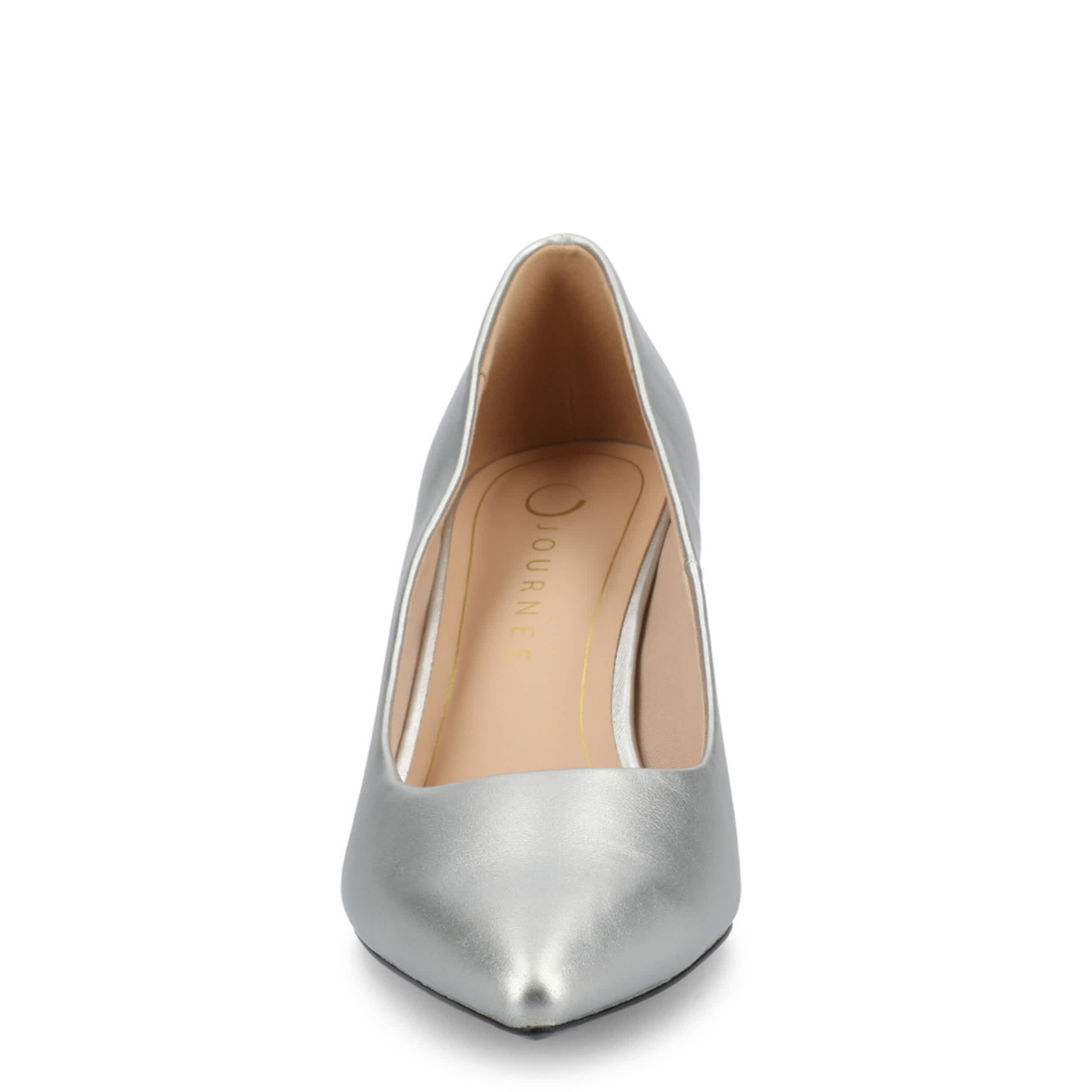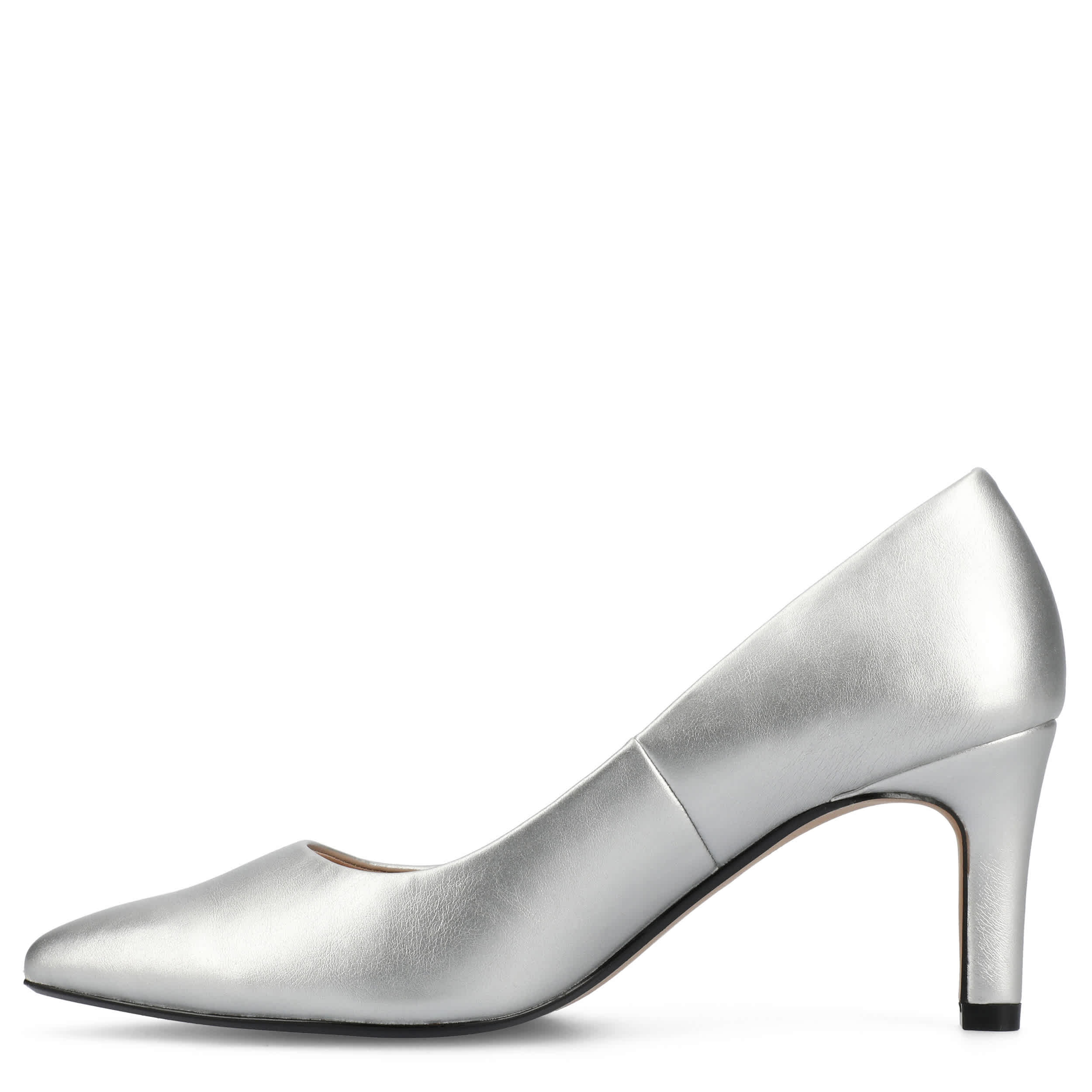 Contemporary edge with modern lines in the Journee Collection Scylee pump. Featuring a metallic faux leather upper with a pointed toe for timeless style, this pump is effortlessy elegant. The insole comforts your foot, while the stiletto heel completes the chic look.