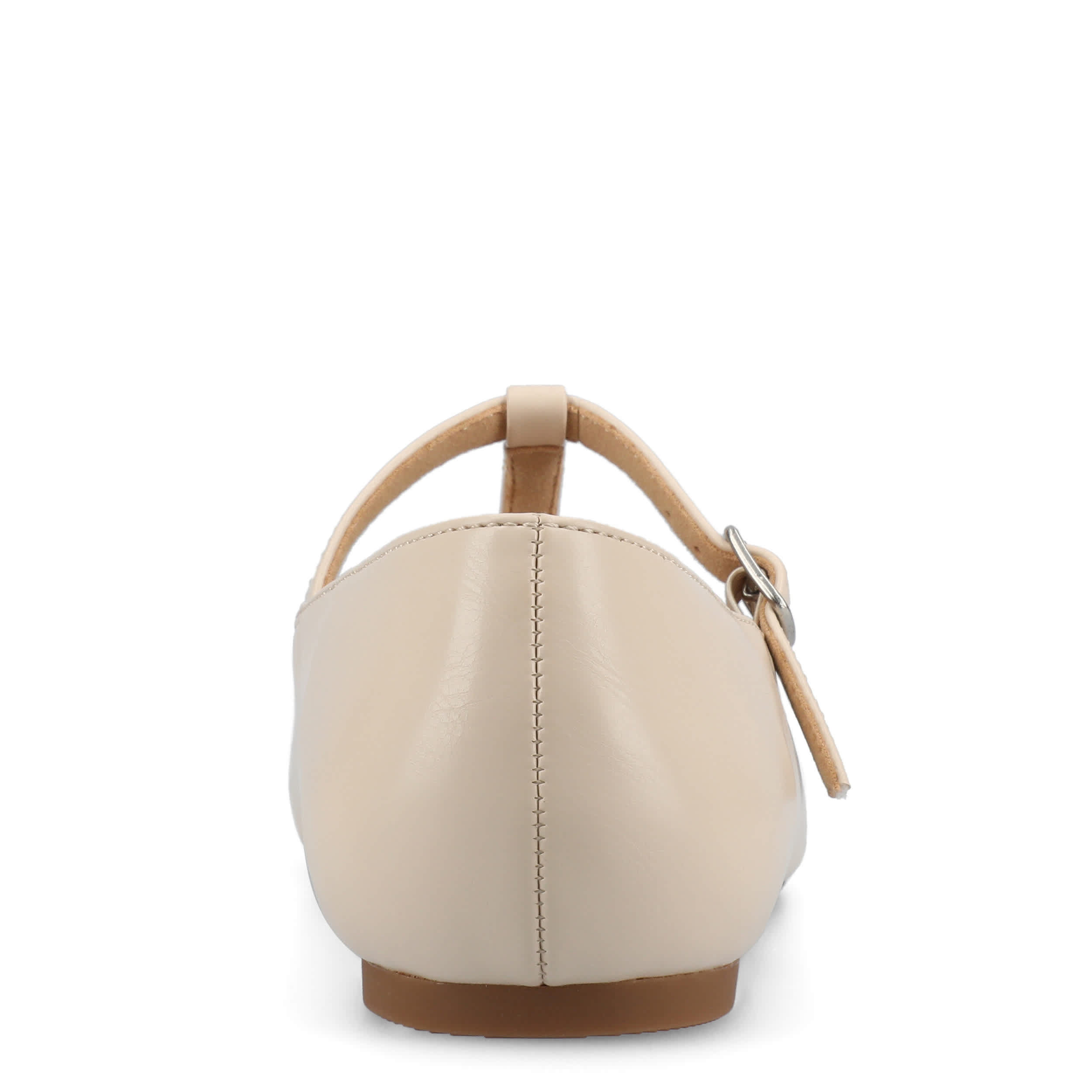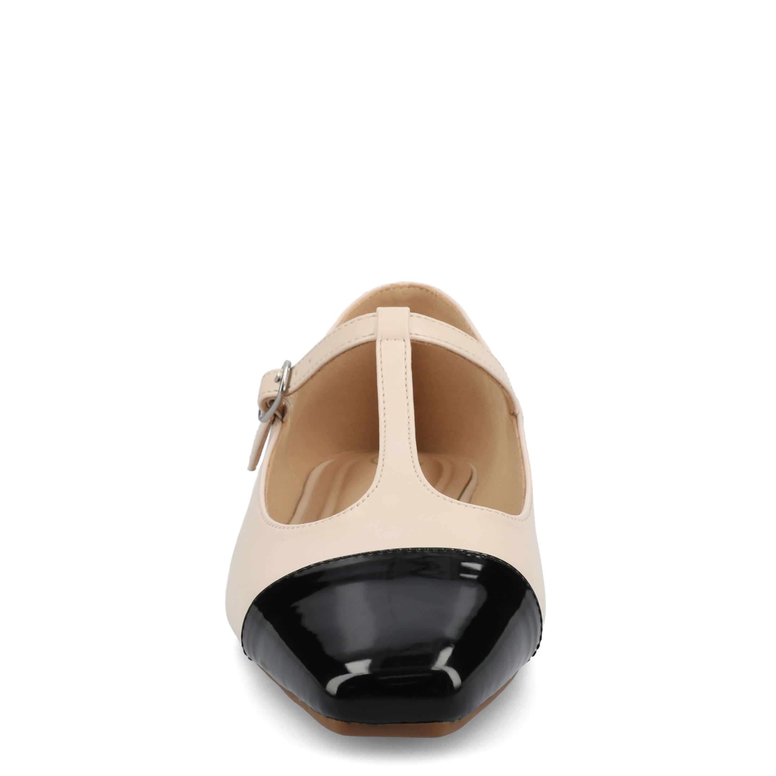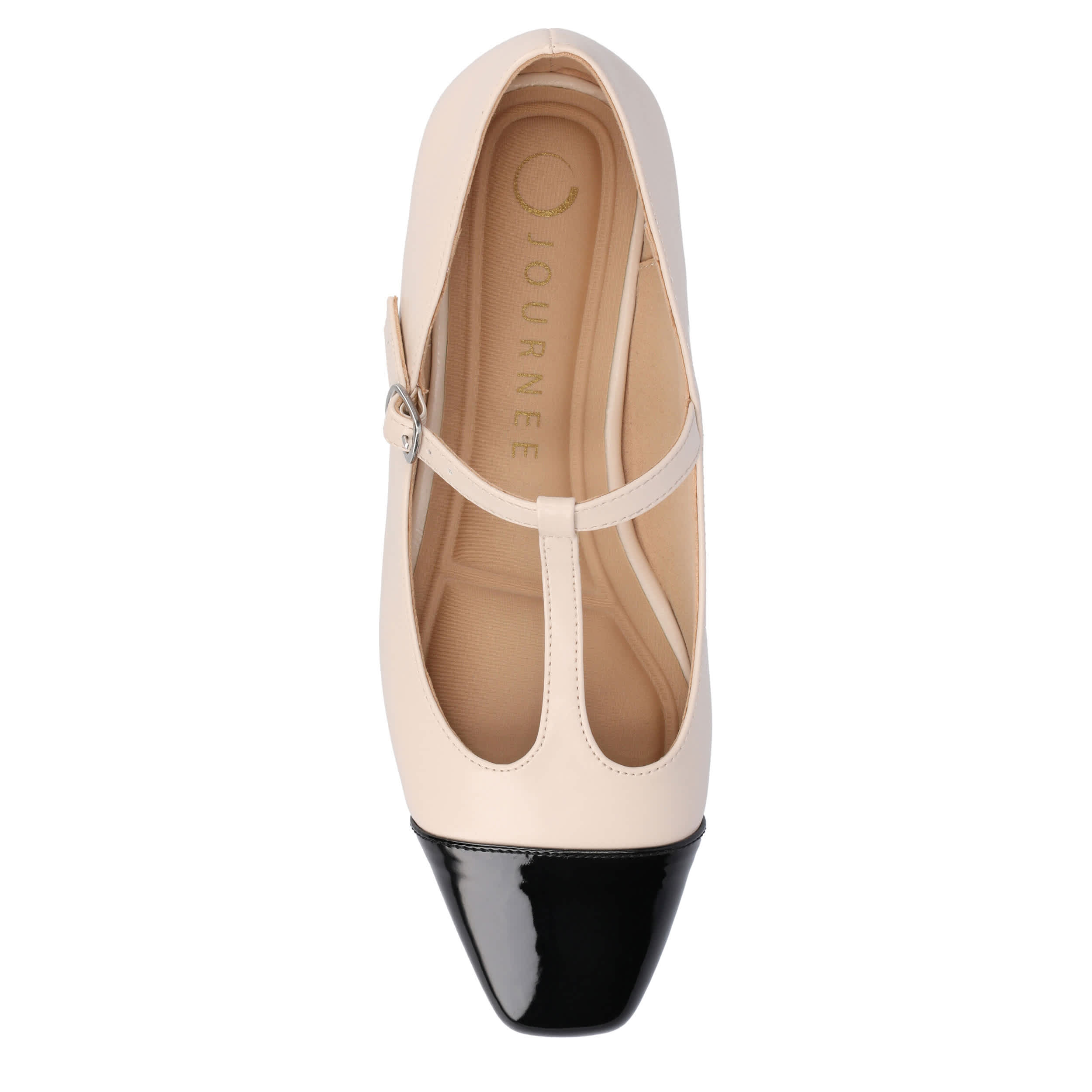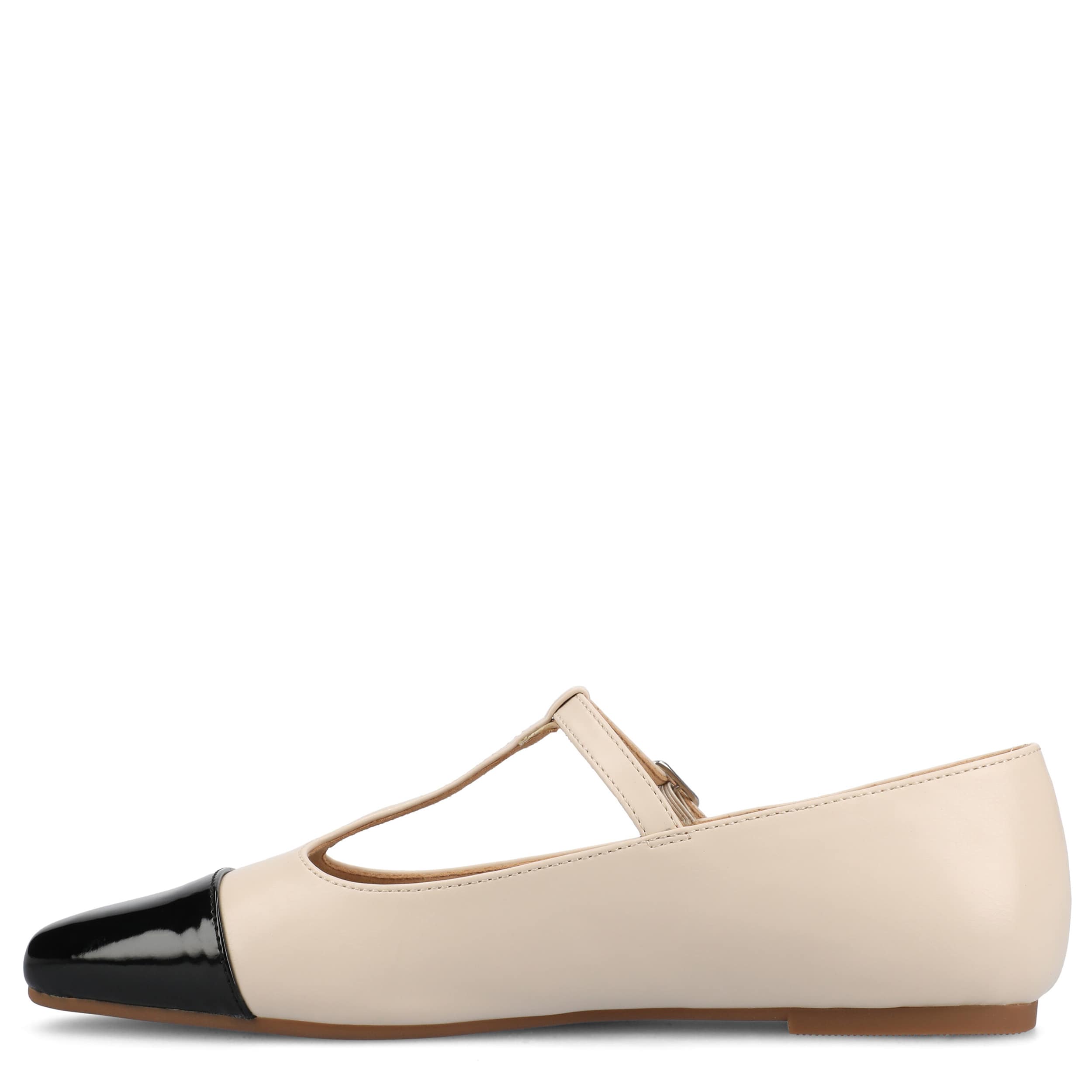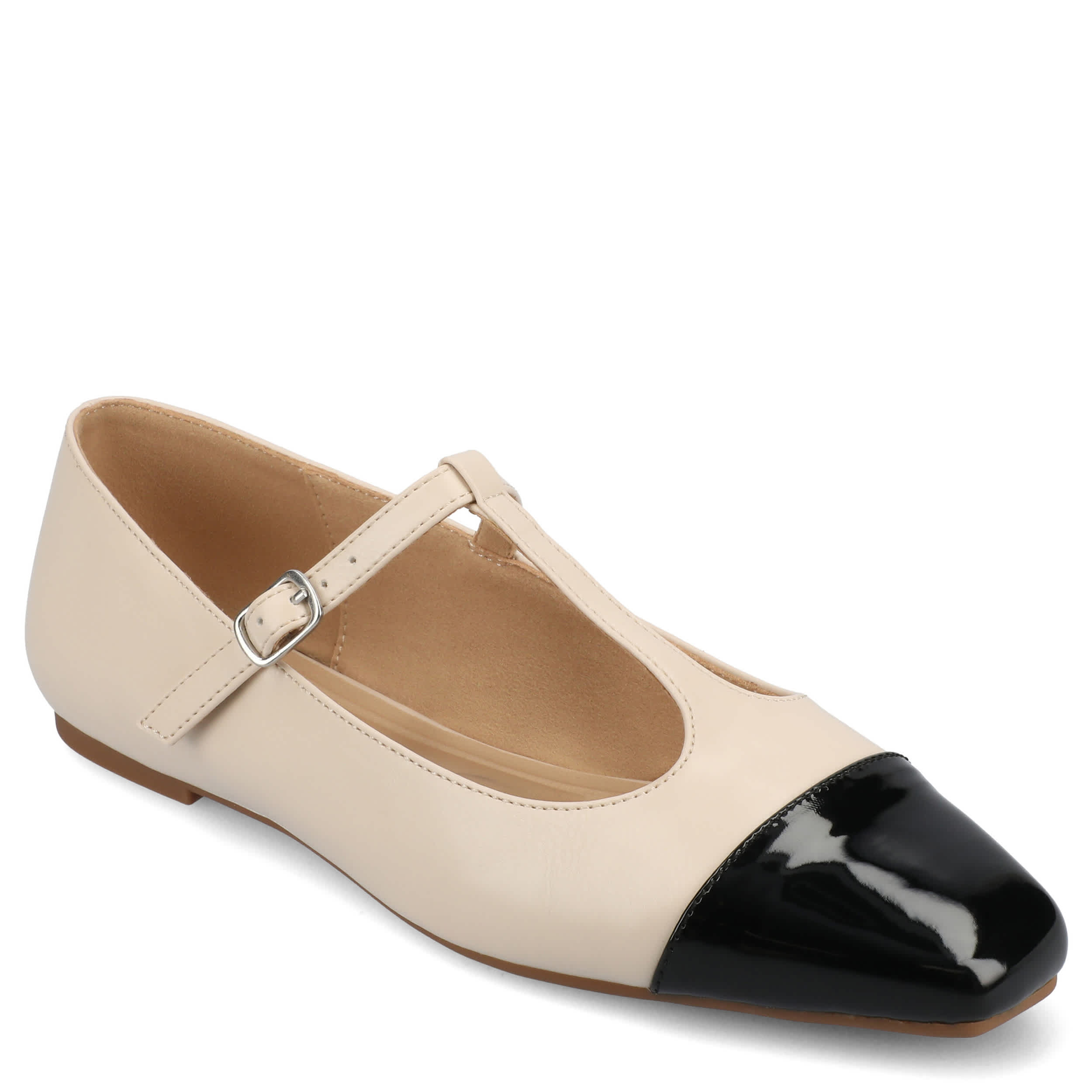 Add a sophisticated touch to your look with the Theah flat from Journee Collection. Featuring a faux leather upper in a T-strap design, this shoe has an adjustable buckle strap for a secure fit and a cap toe for extra style. The cushioned insole offers excellent comfort, while the flat sole supports with stability.