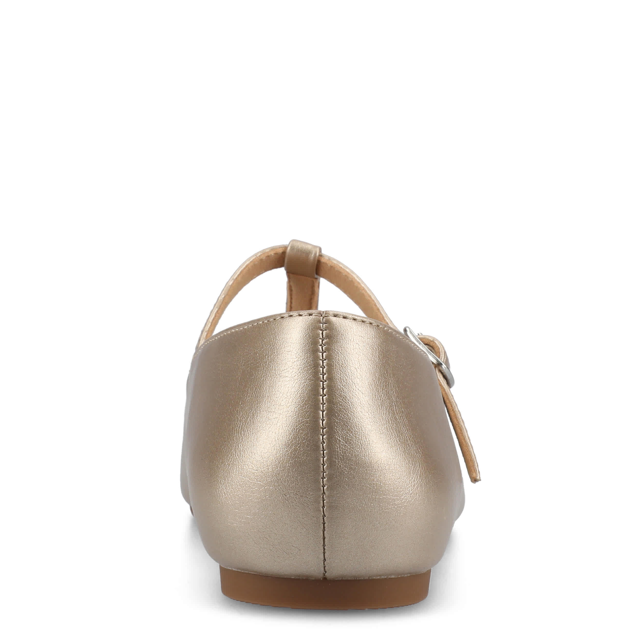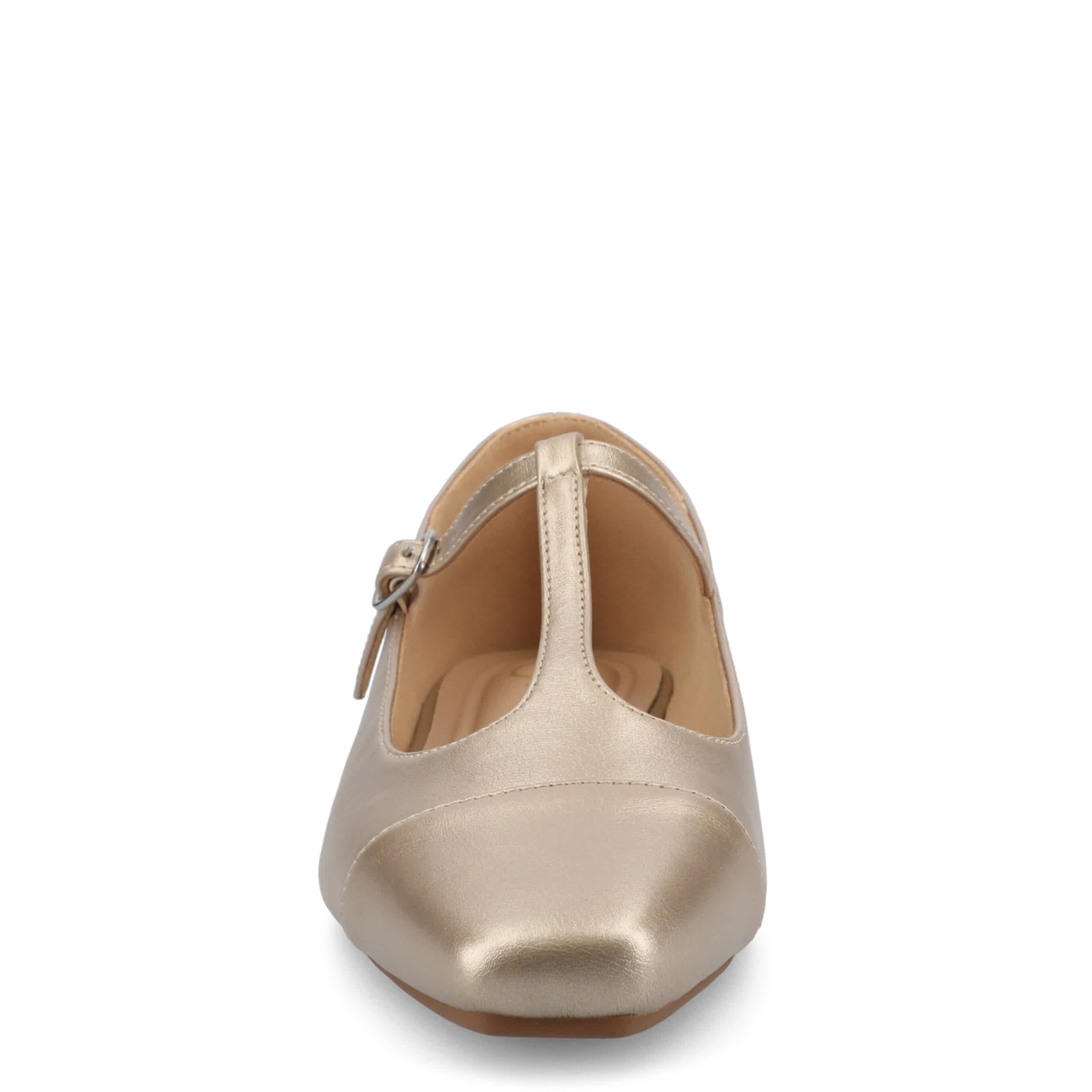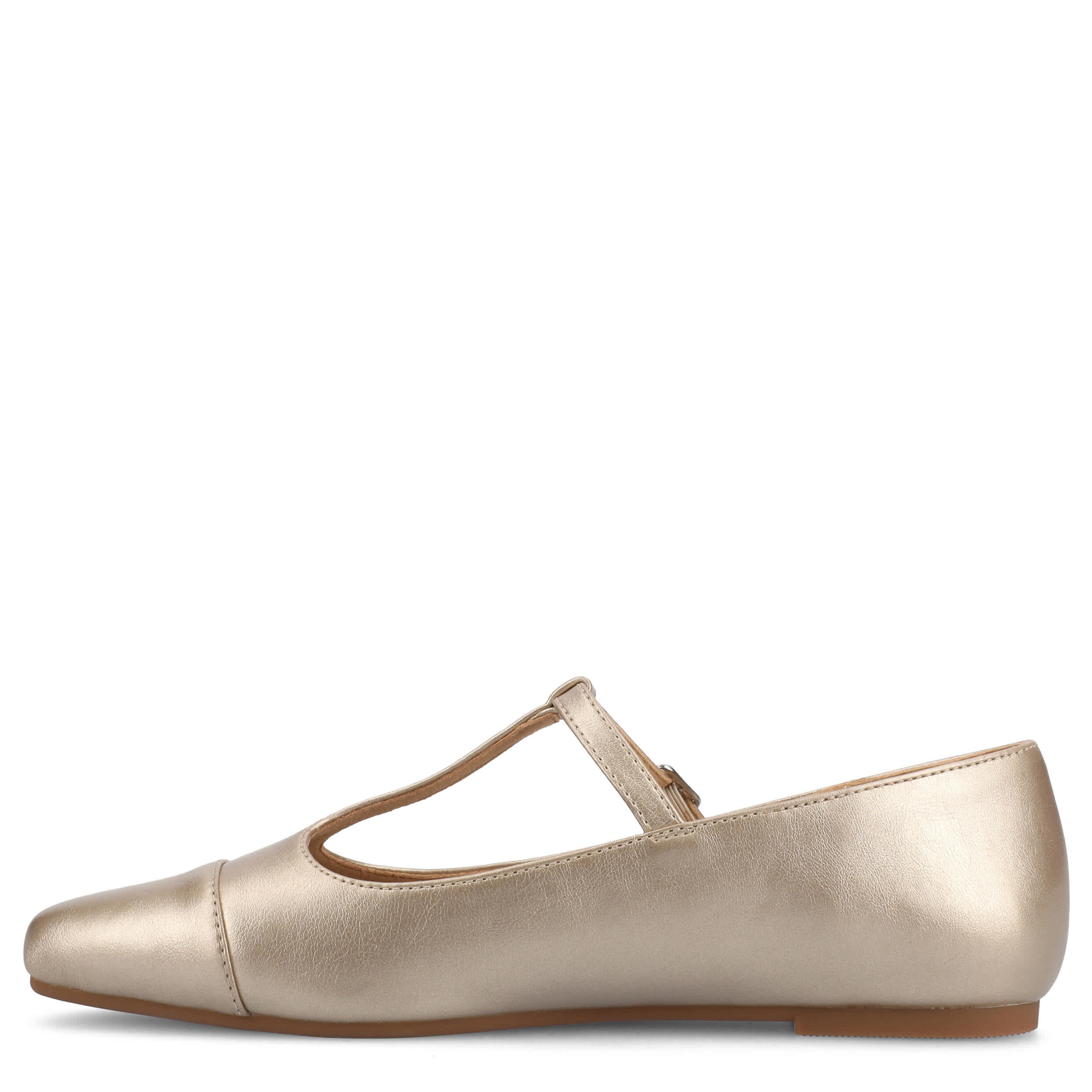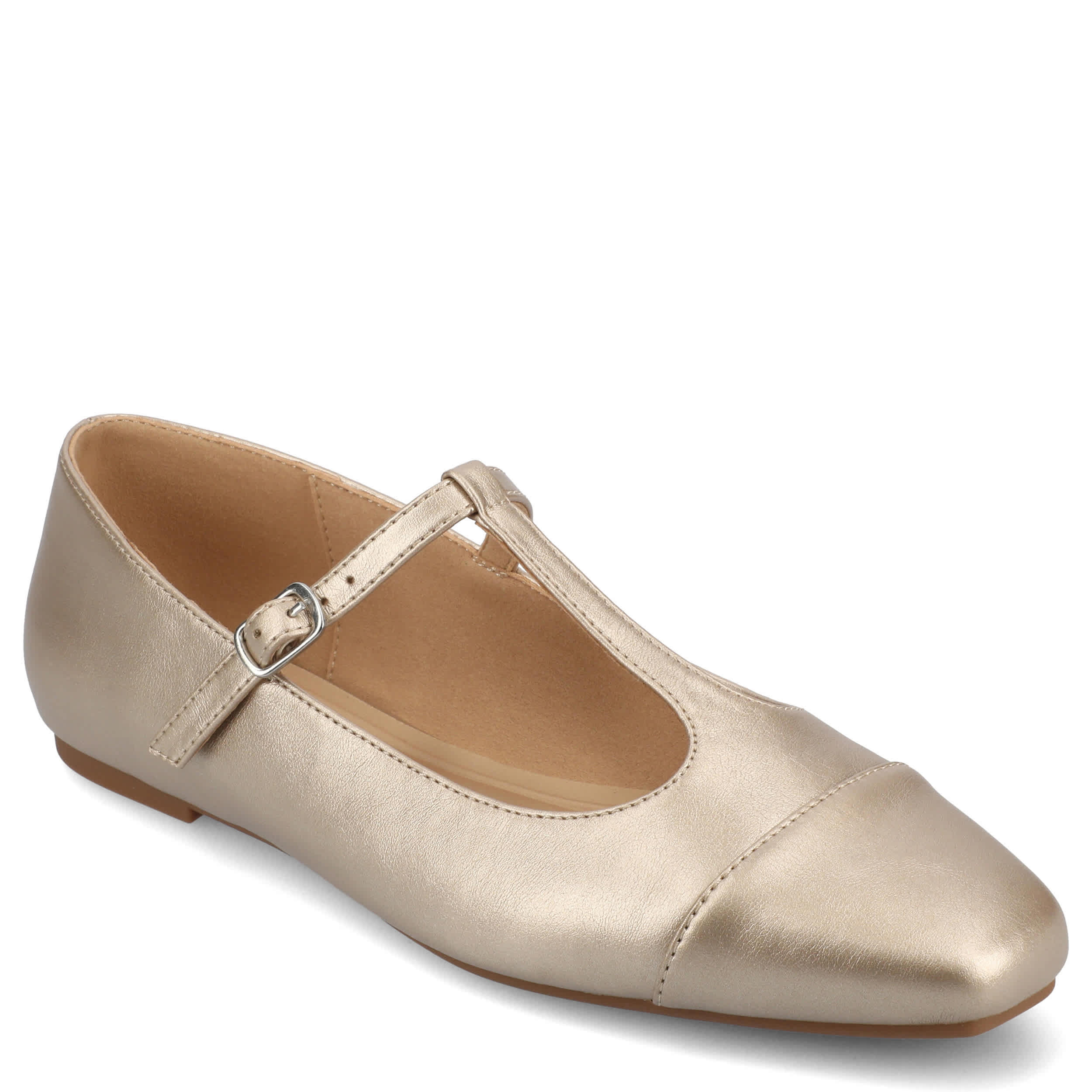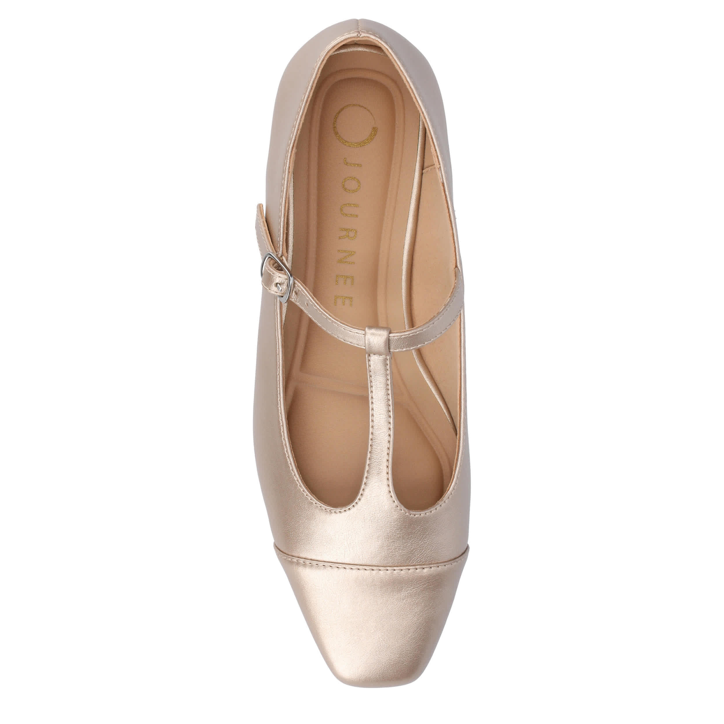 Add a sophisticated touch to your look with the Theah flat from Journee Collection. Featuring a faux leather upper in a T-strap design, this shoe has an adjustable buckle strap for a secure fit and a cap toe for extra style. The cushioned insole offers excellent comfort, while the flat sole supports with stability.