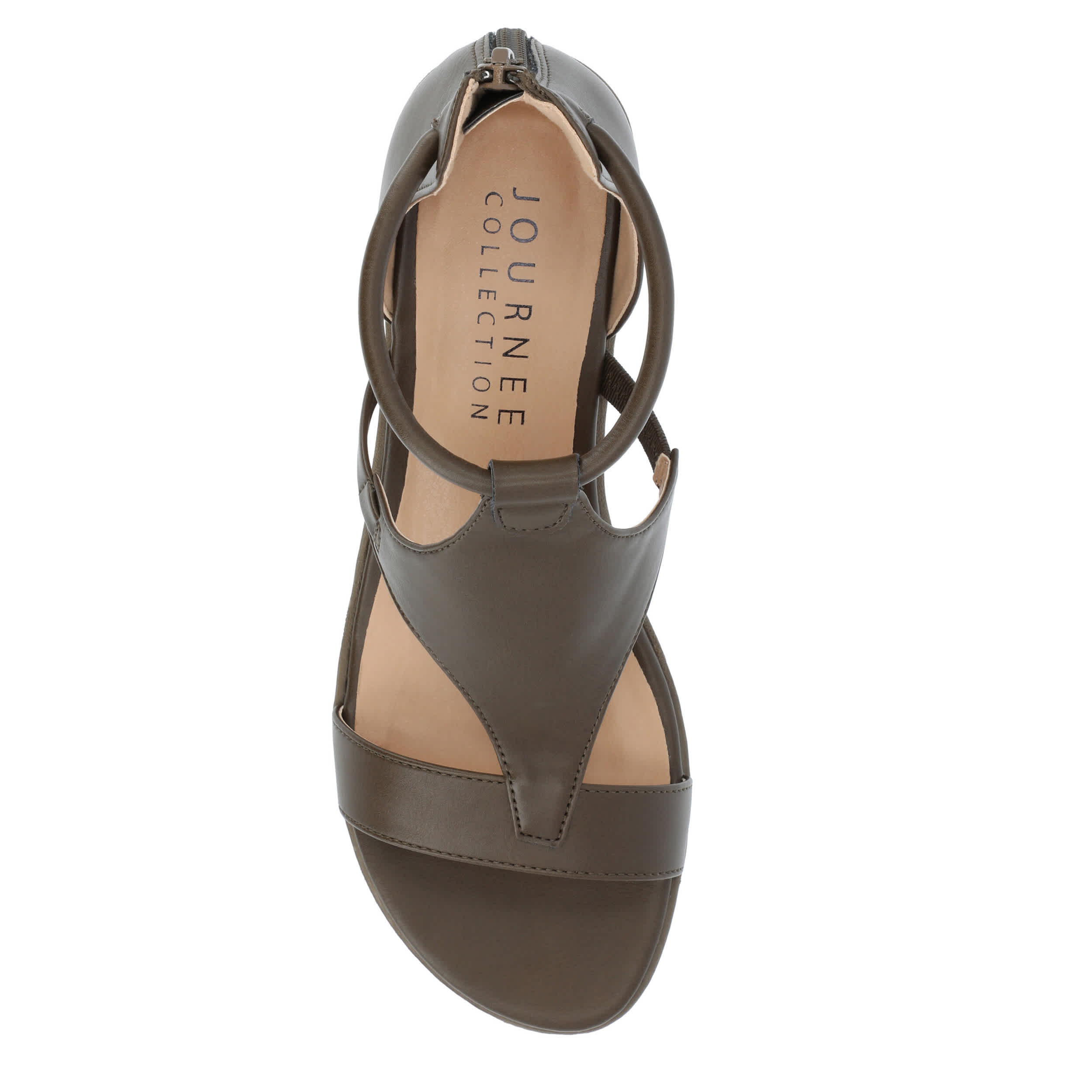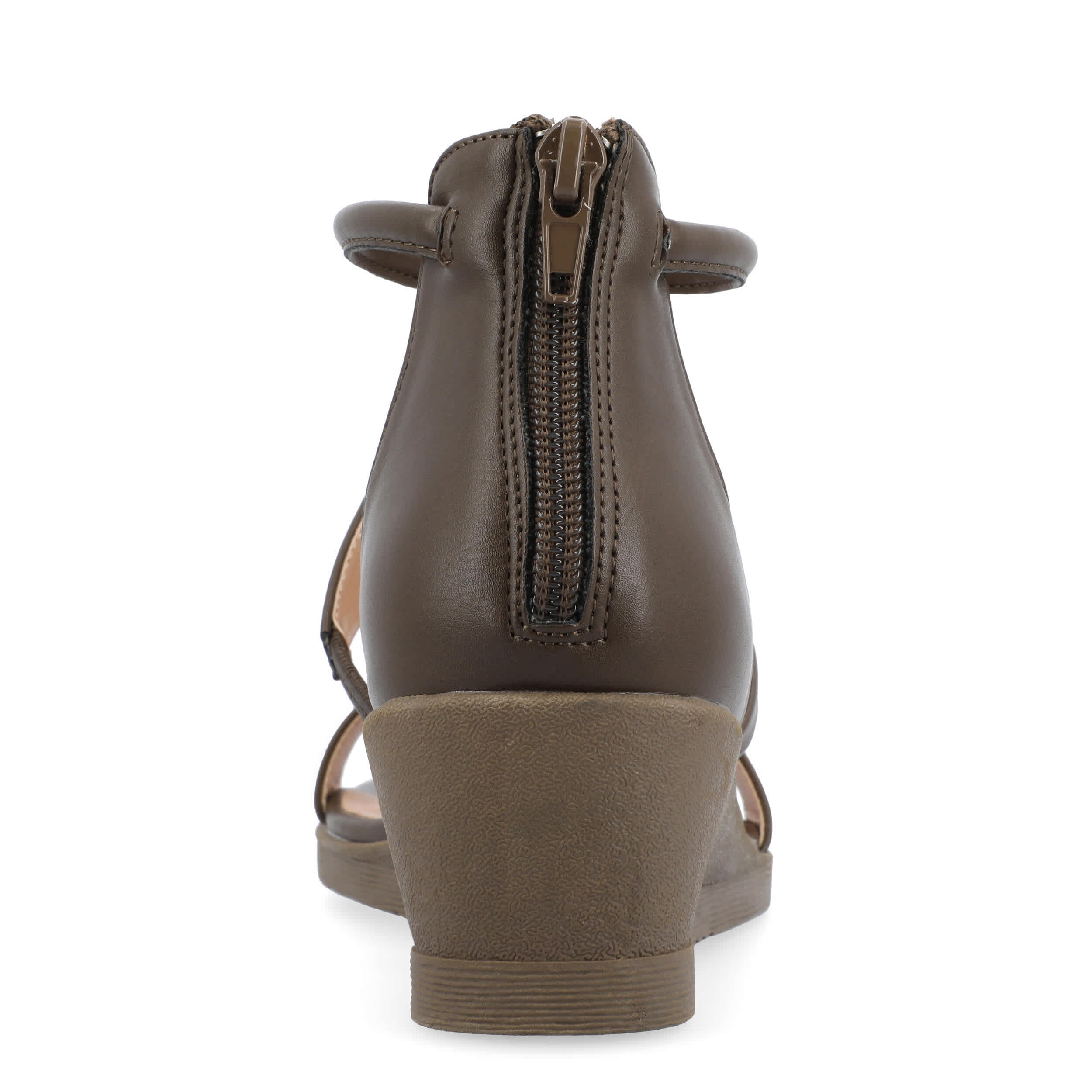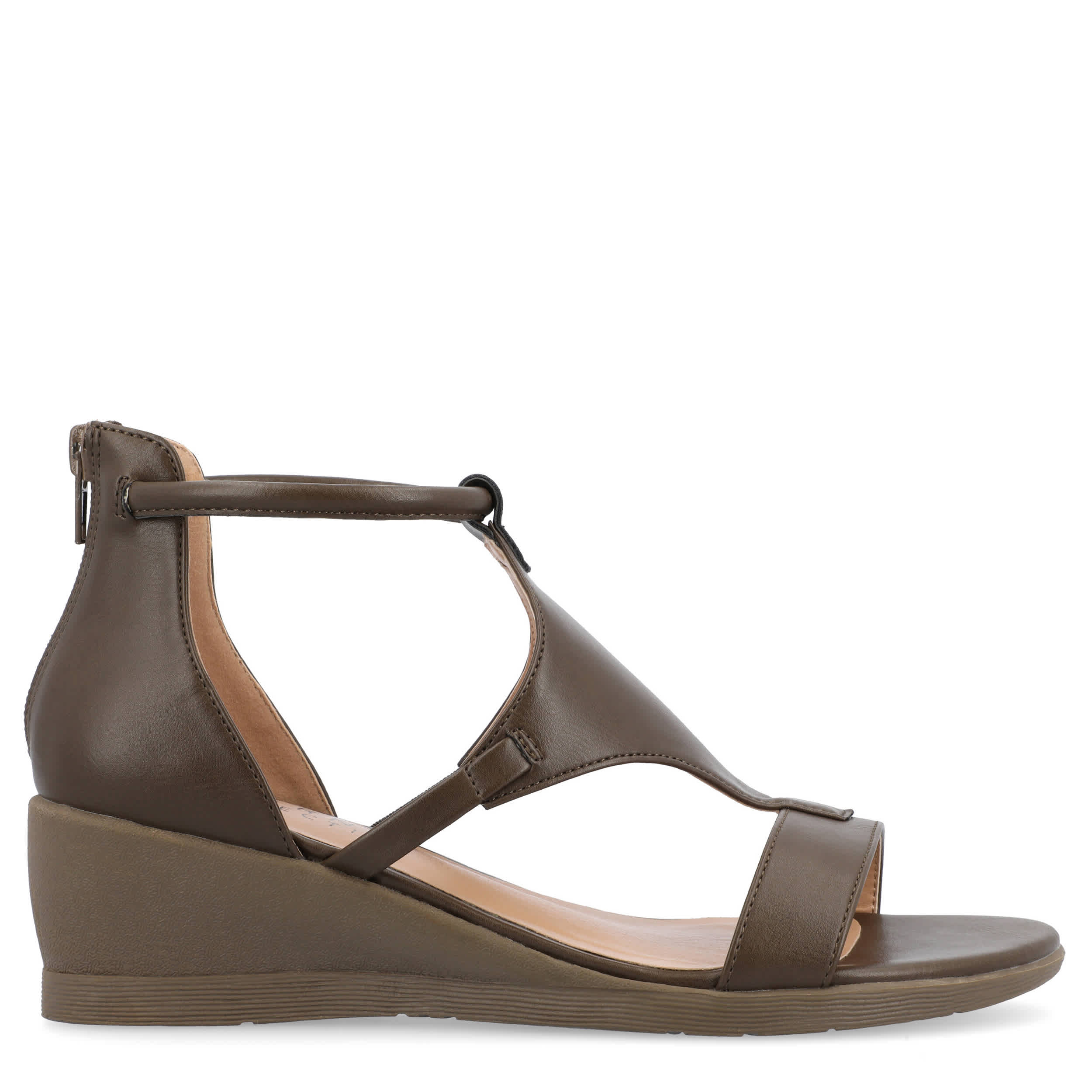 Gladiator style gets a contemporary upgrade in the Trayle Wide women's wedge from Journee Collection. Featuring a vegan leather upper with a caged design, this rear zip sandal has an attached halo ankle strap. The footbed cushions every step while the low wedge adds stability.