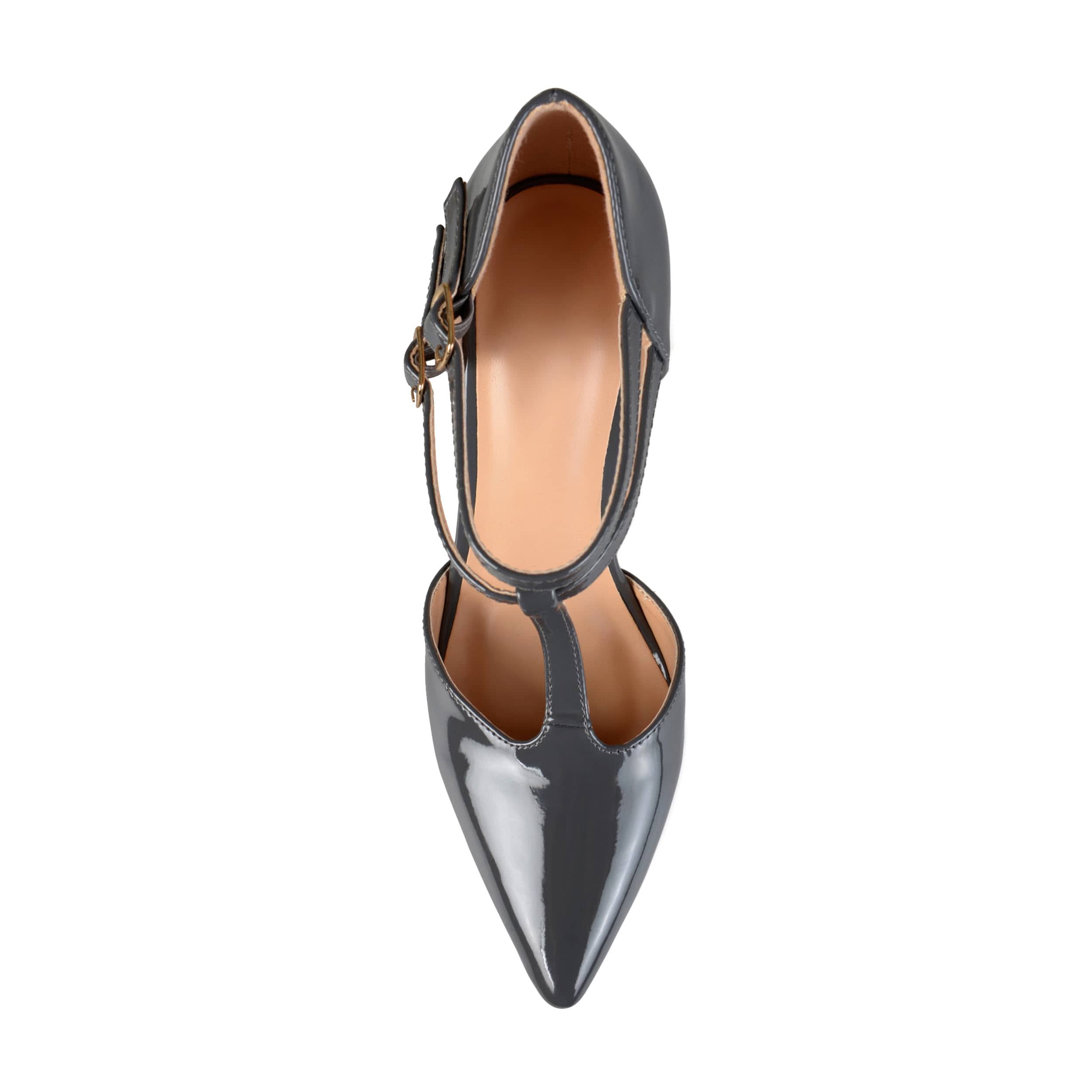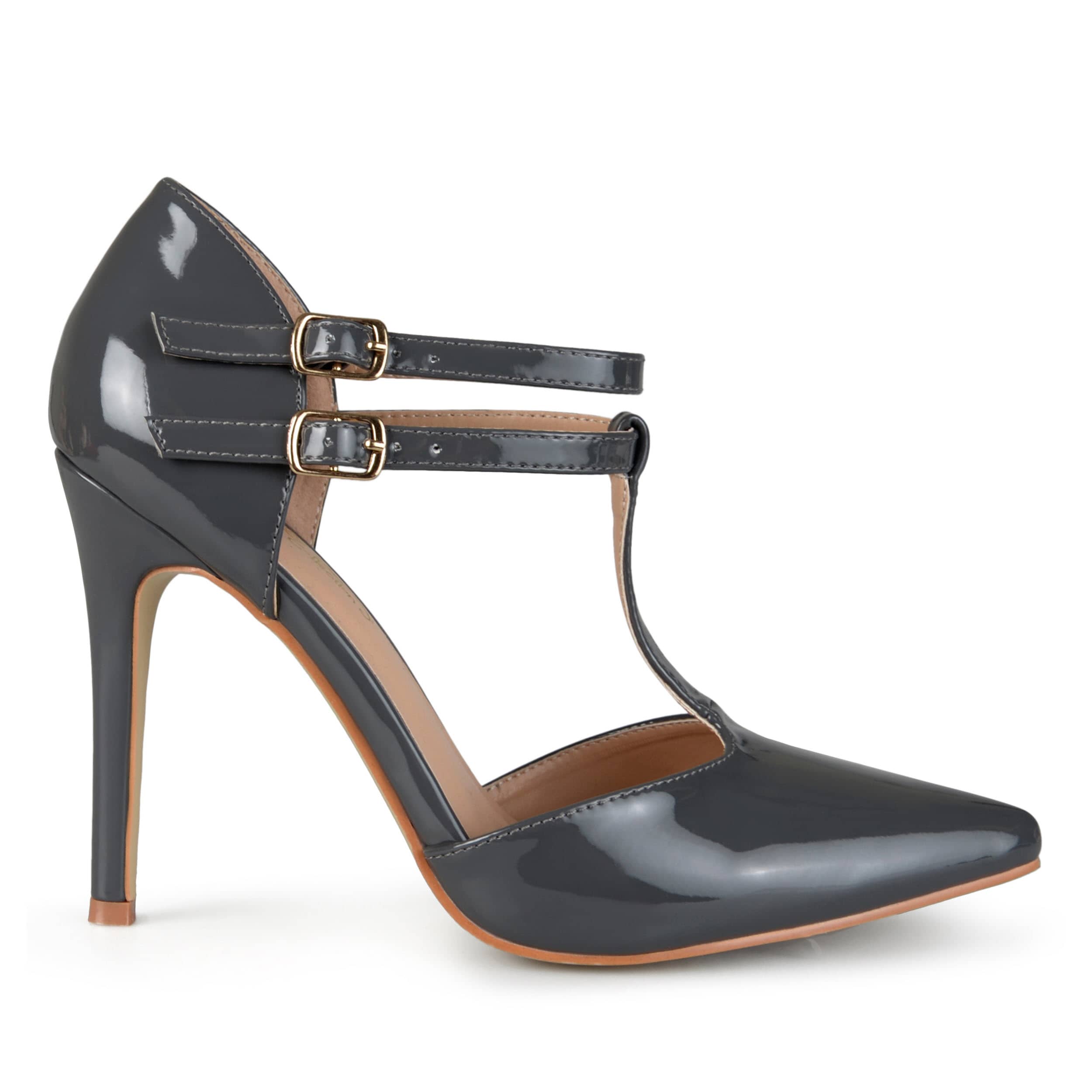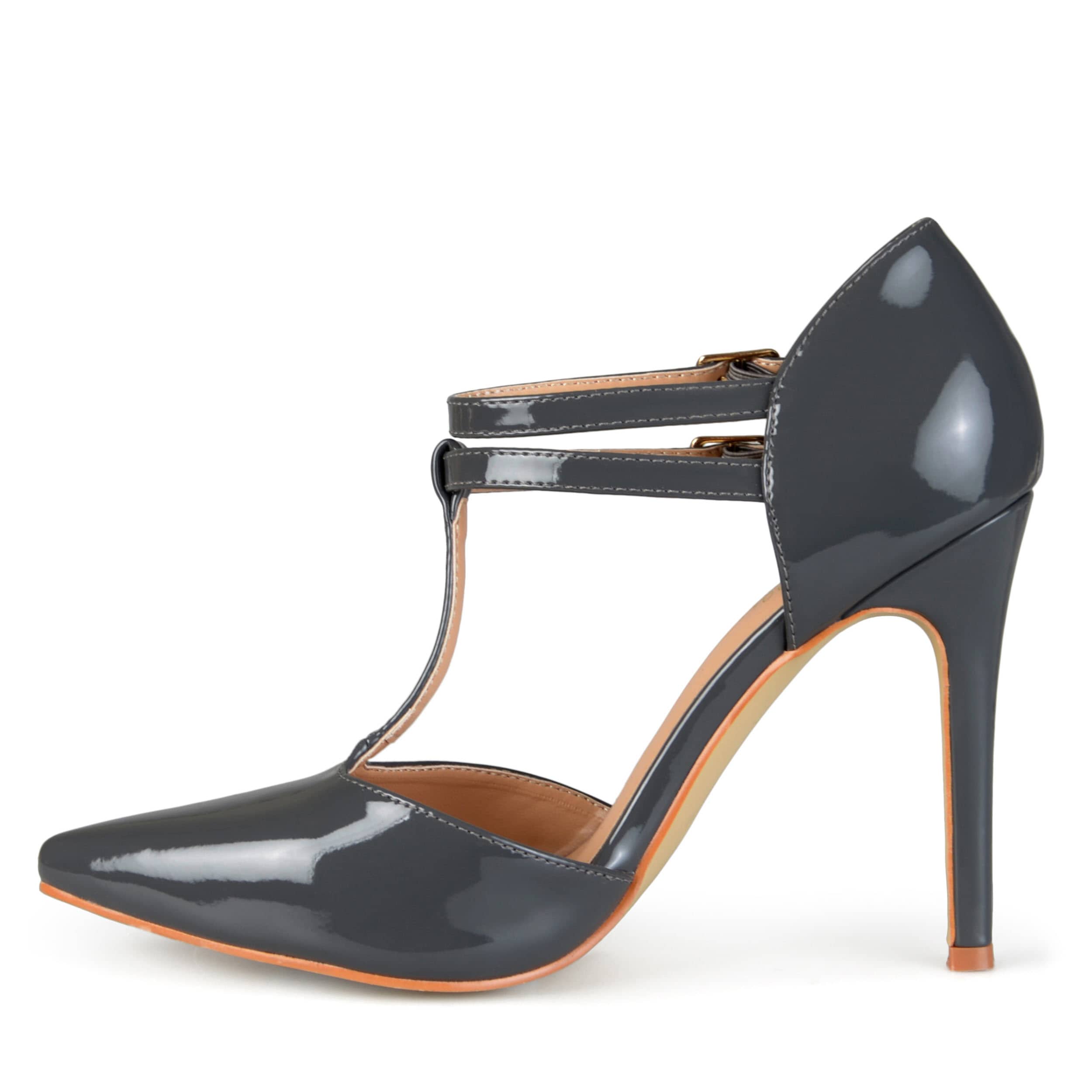 Polish up your style in the Tru women's pump from the Journee Collection. With a glossy vegan leather upper featuring a sleek pointed toe, these dual buckle T-strap stilettos are ready for a grand entrance at your next event. The padded footbed comforts your foot while you strut on that 4" stiletto heel and take all the names.