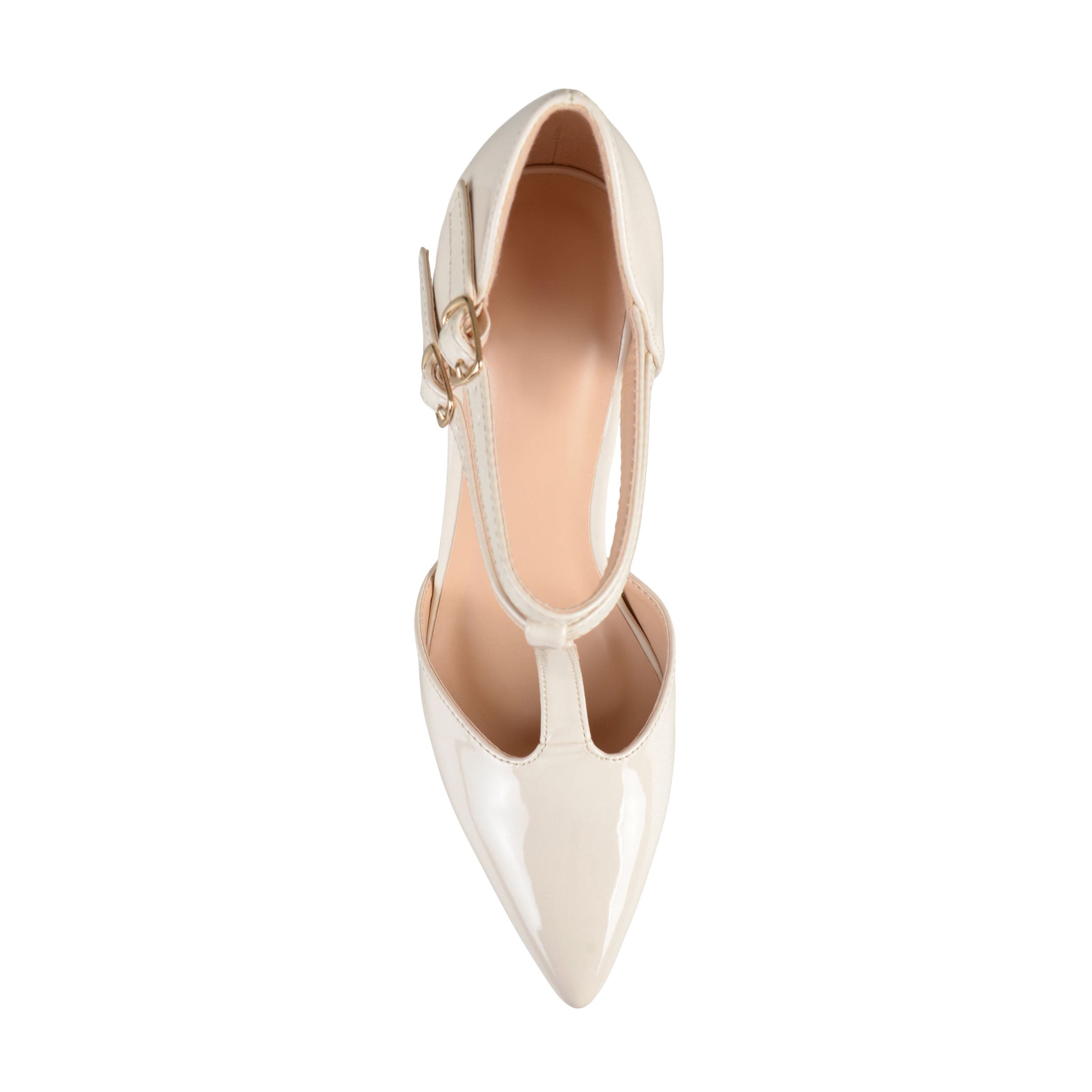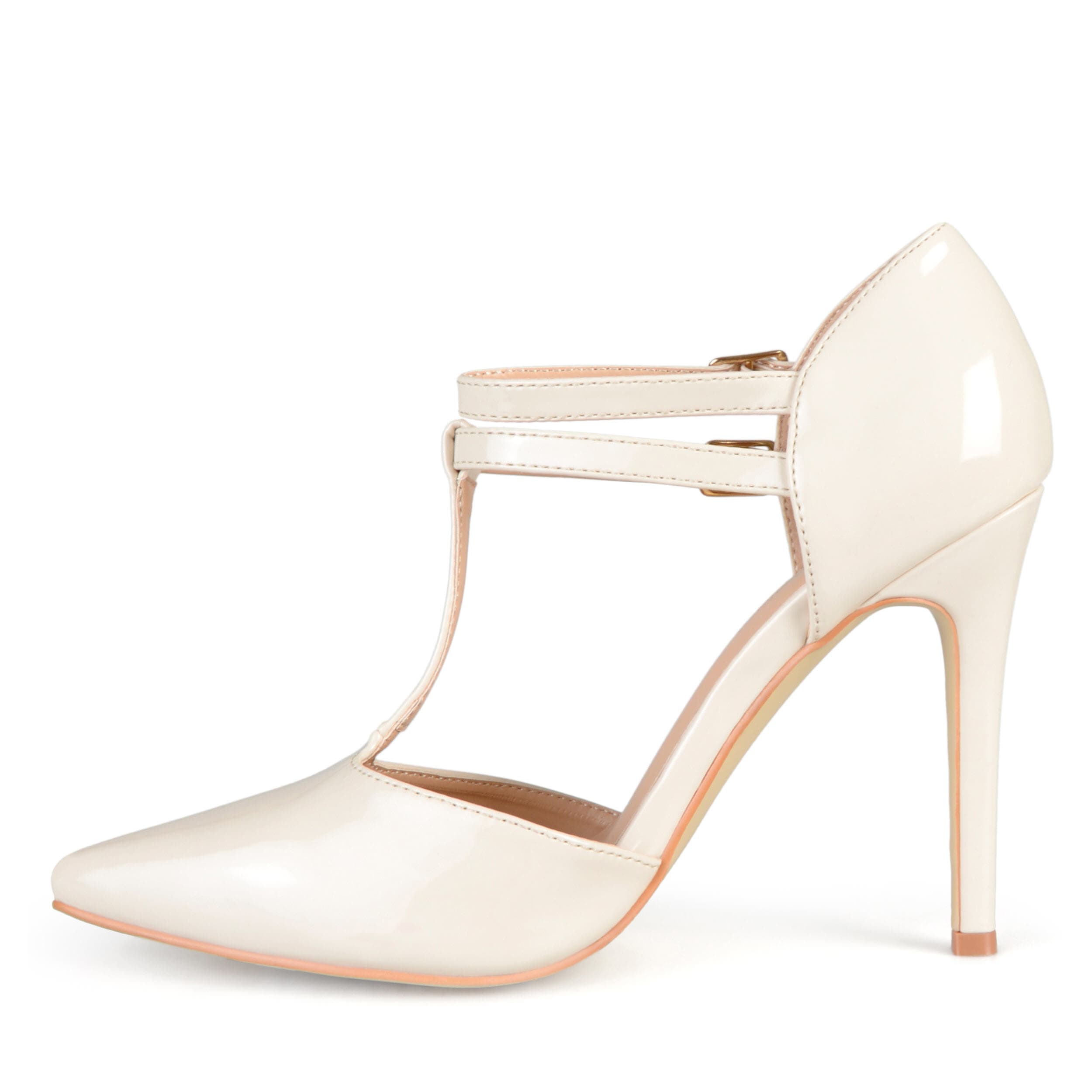 Polish up your style in the Tru women's pump from the Journee Collection. With a glossy vegan leather upper featuring a sleek pointed toe, these dual buckle T-strap stilettos are ready for a grand entrance at your next event. The padded footbed comforts your foot while you strut on that 4" stiletto heel and take all the names.