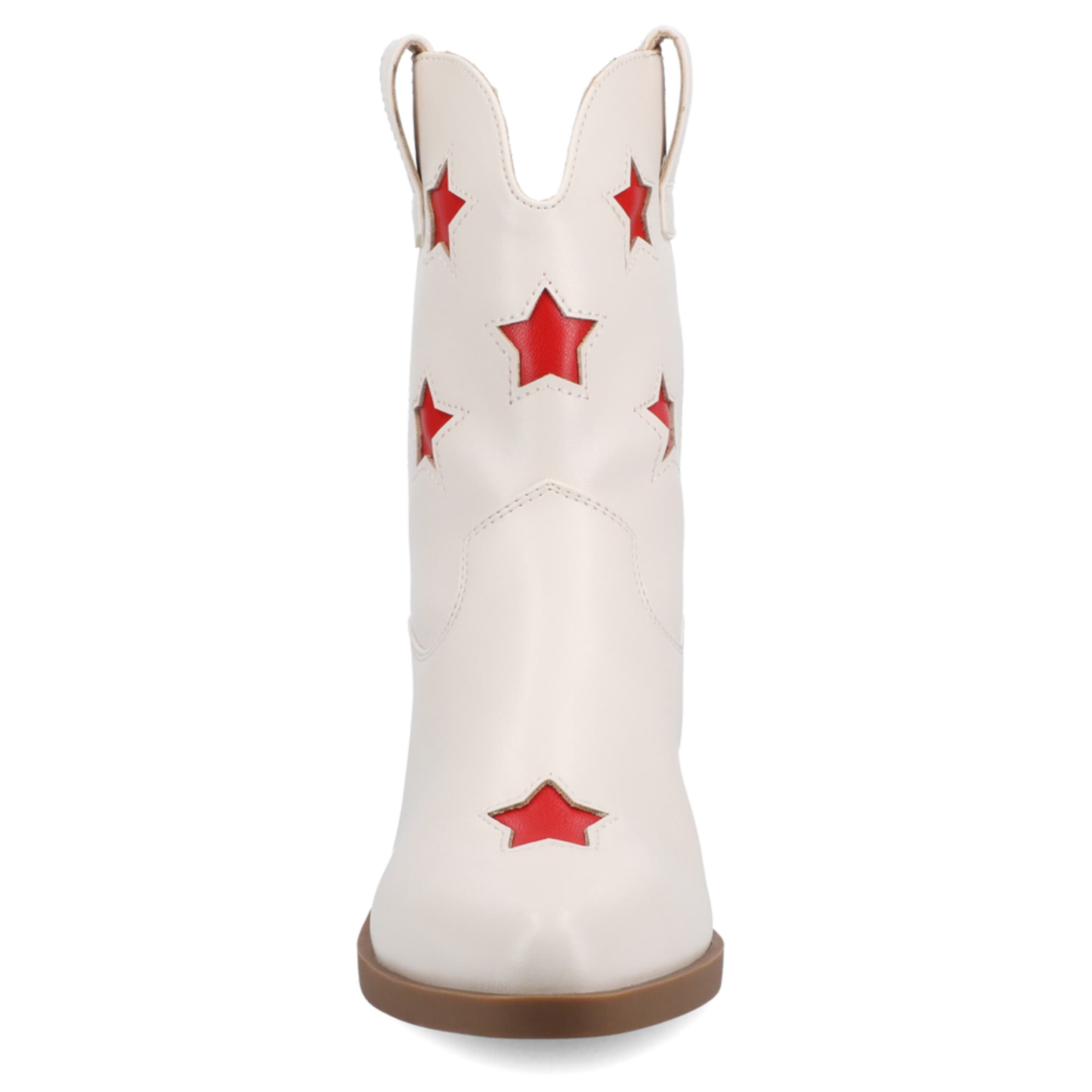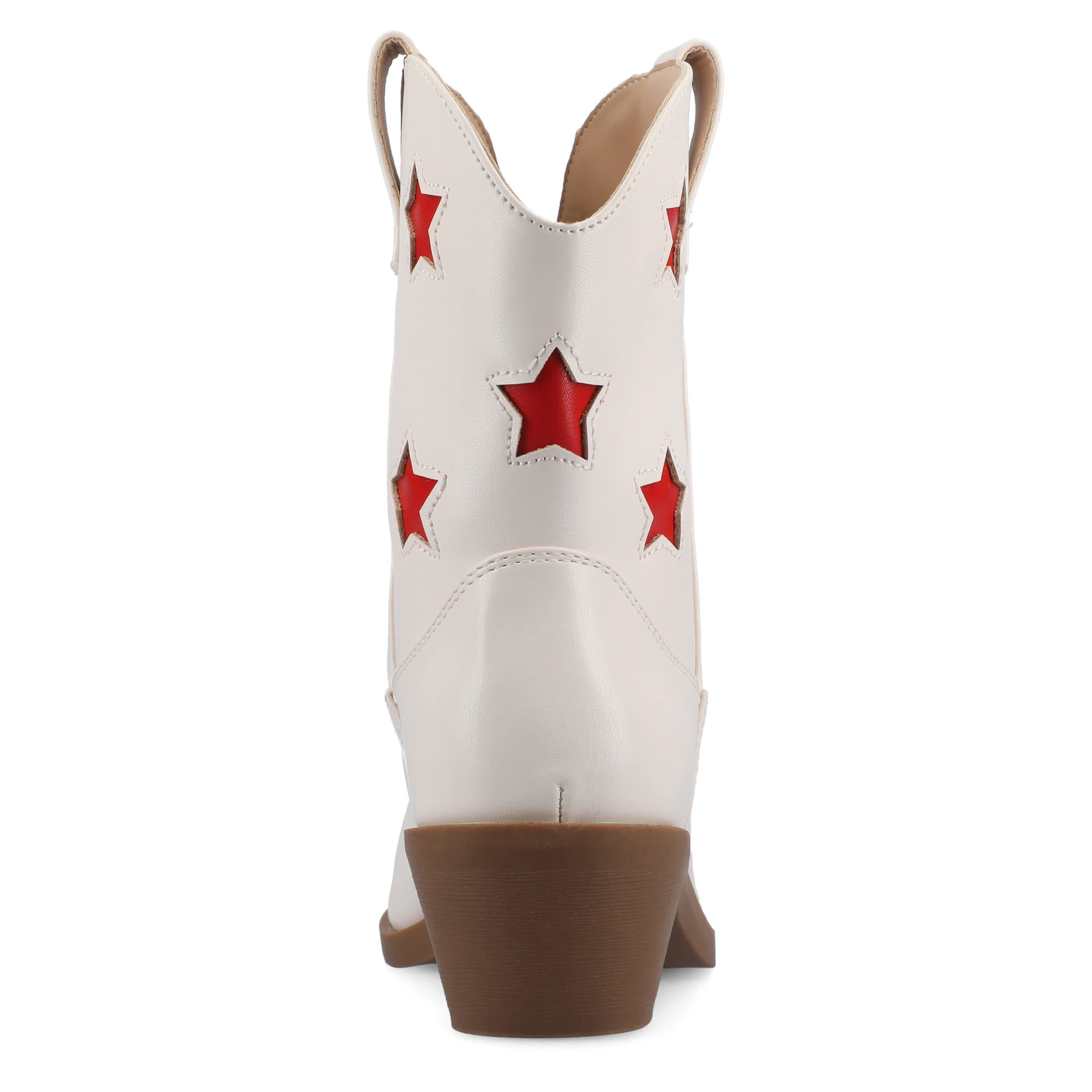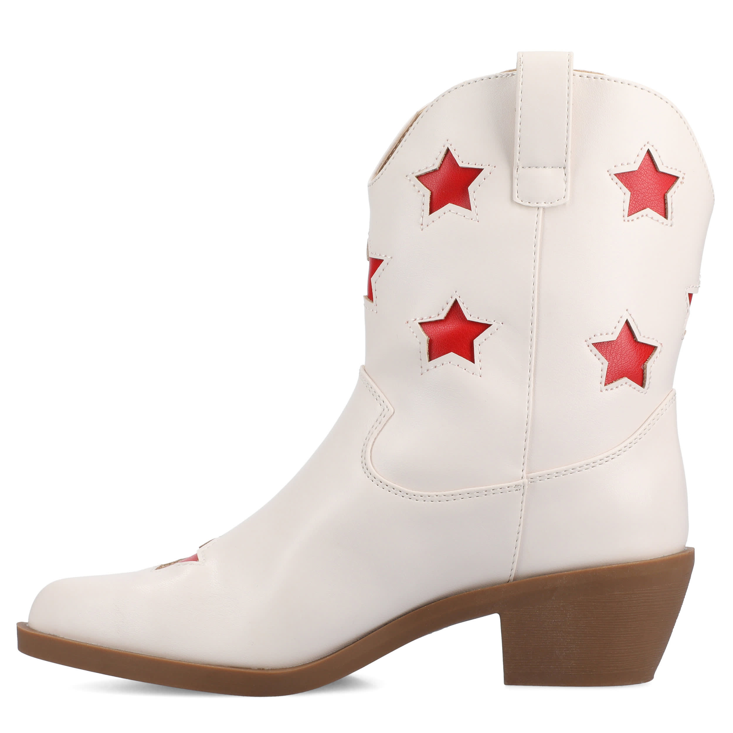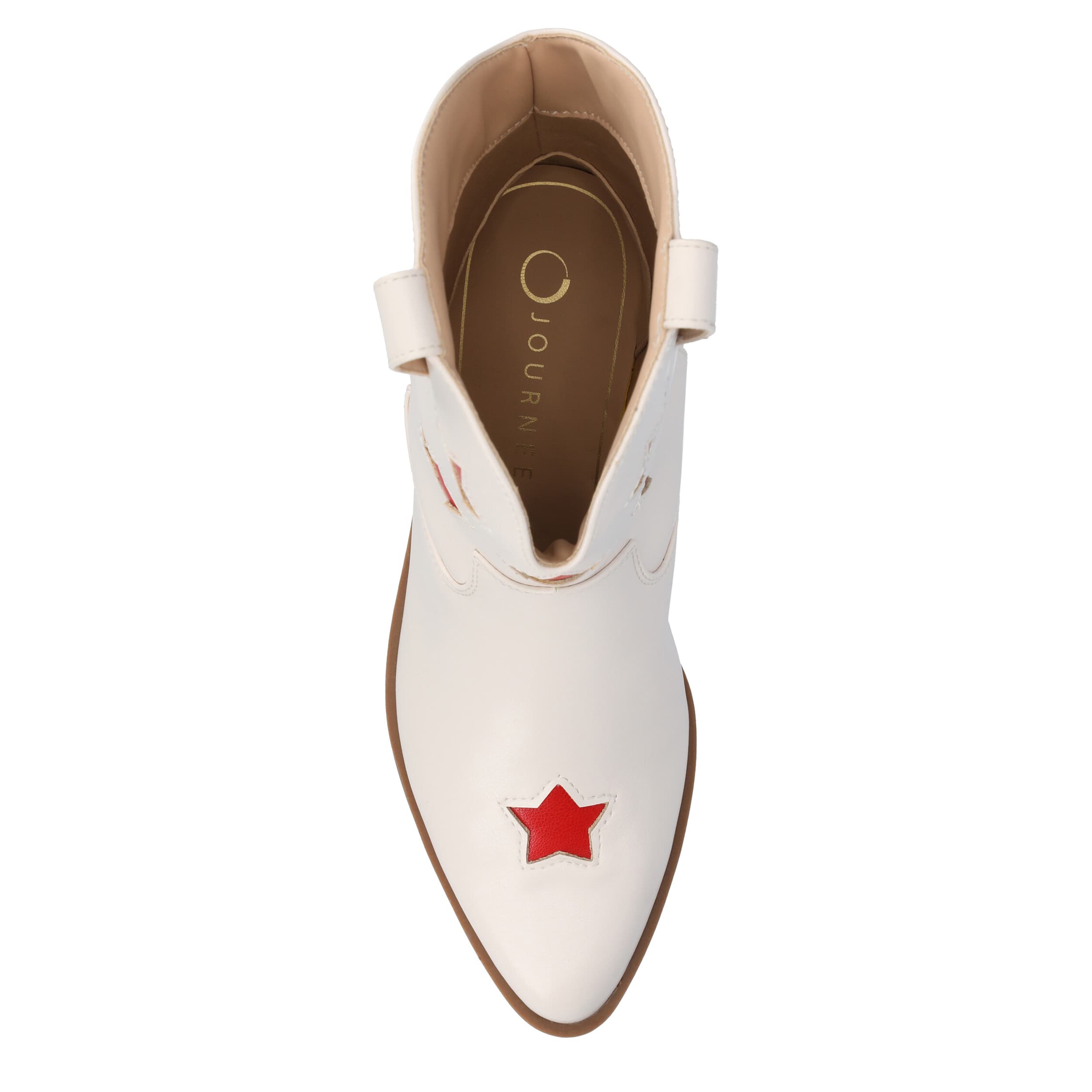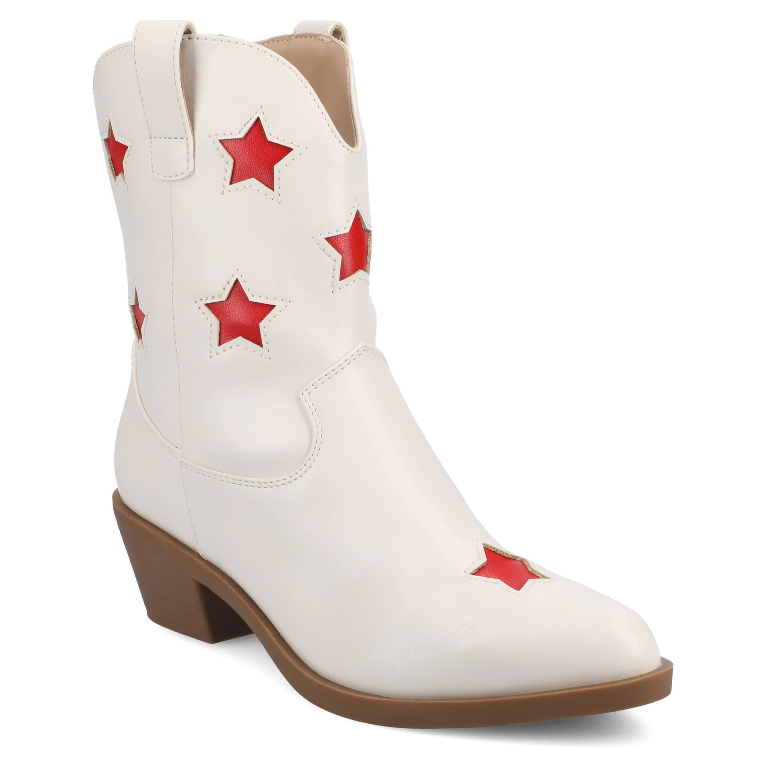 Make a statement with the Underwood Western boot from Journee Collection. Featuring a faux leather upper with star detailing, this ankle bootie has a 4mm Journee Comfort System insole that ensures comfort, while the Cuban-styled heel lifts your look with ease.