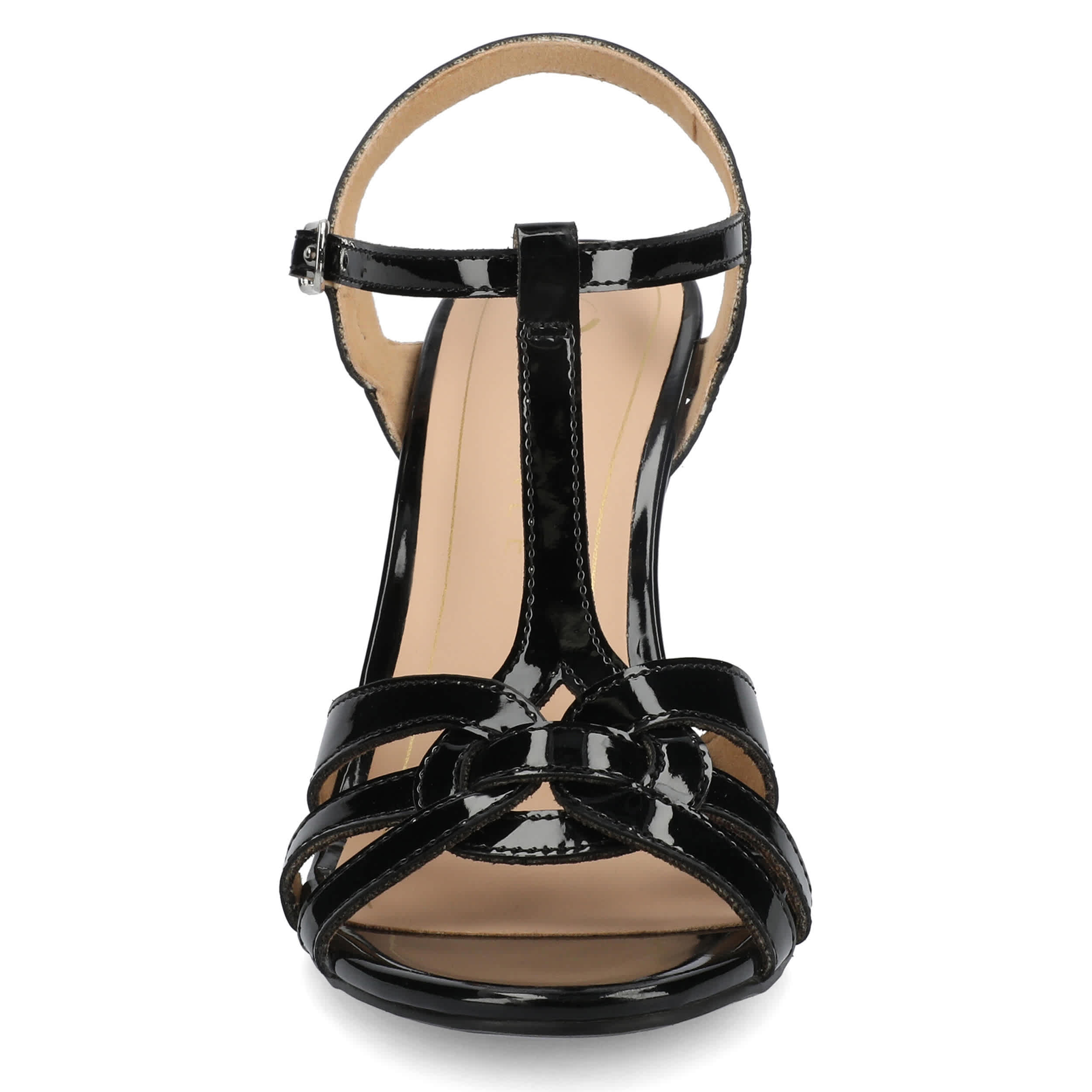 Flatter your sophisticated style with the Valry sandal from Journee Collection. Featuring a glossy patent leather upper with a woven T-strap detail, this sandal is sure to turn heads. The footbed offers comfort, while the high heel gives a very nice lift.