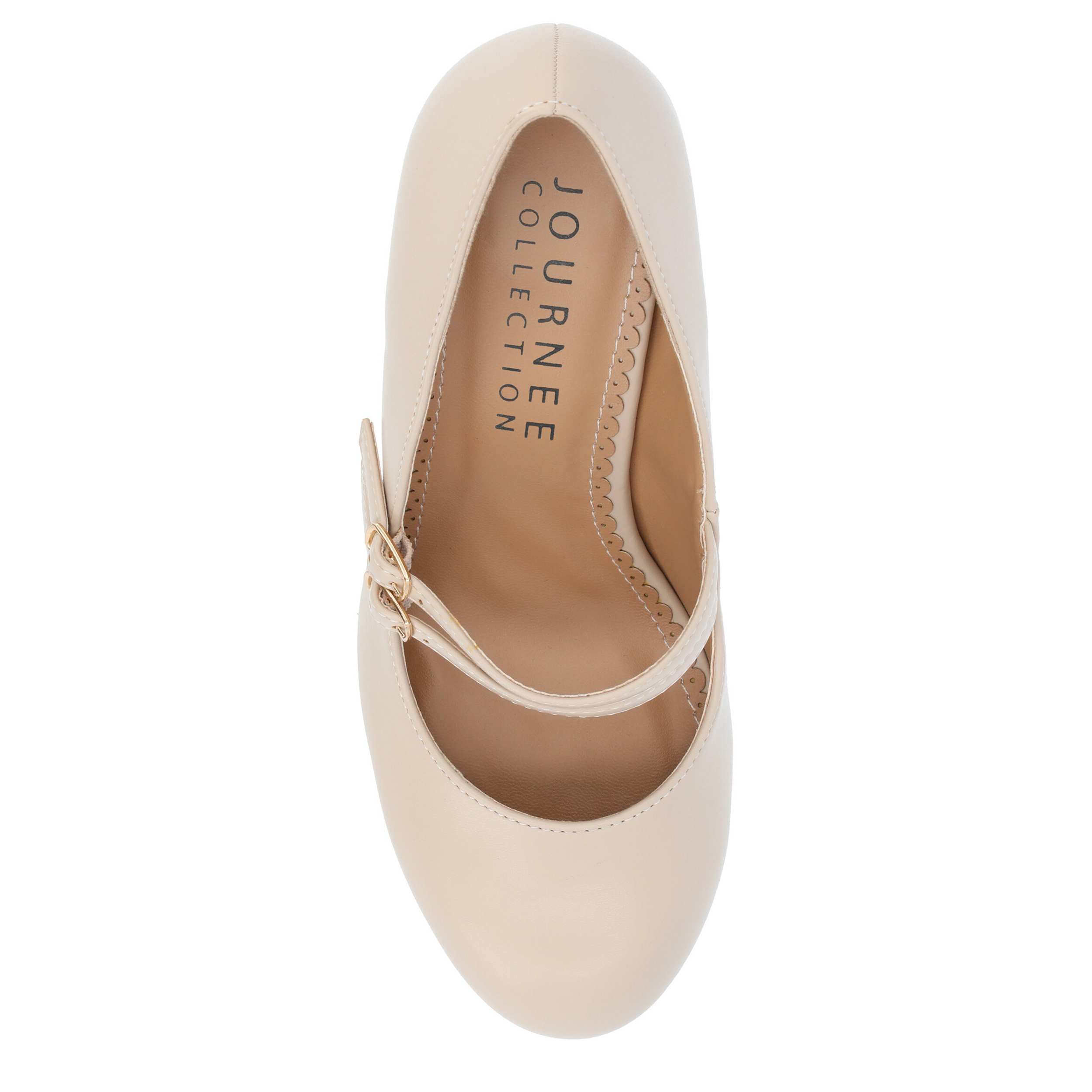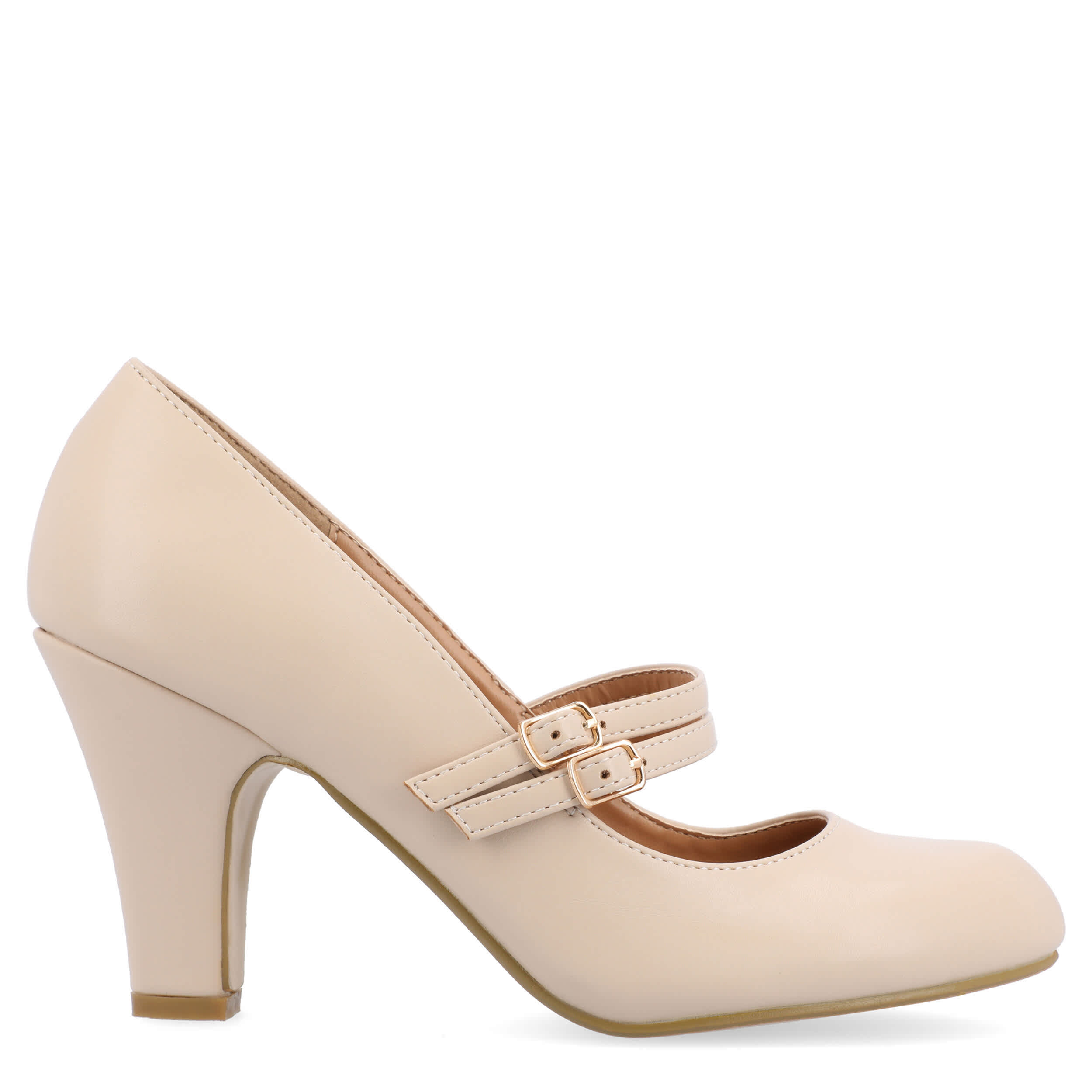 The Windy Classic women's pump from Journee Collection is the perfect accessory to complete your elegant look. This understated Mary Jane pump features a supple vegan leather upper, parallel straps with adjustable buckles for vintage appeal, and a padded footbed to cushion your feet. A 3¼" covered heel creates a stylish lift, while the synthetic outsole offers support and stability, ideal for spending long hours on your feet.