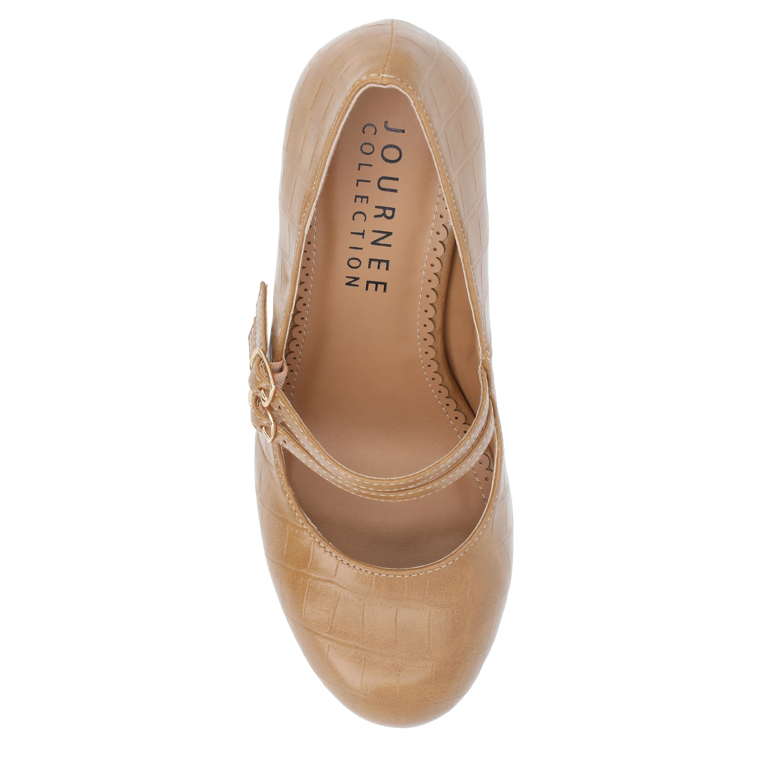 Vintage style works with the Windy women's pump from Journee Collection. Featuring a vegan leather upper with a subtle croc print, this dual buckle strapped Mary Jane has a dainty appeal. The footbed cushions your steps while that high heel is sturdy.