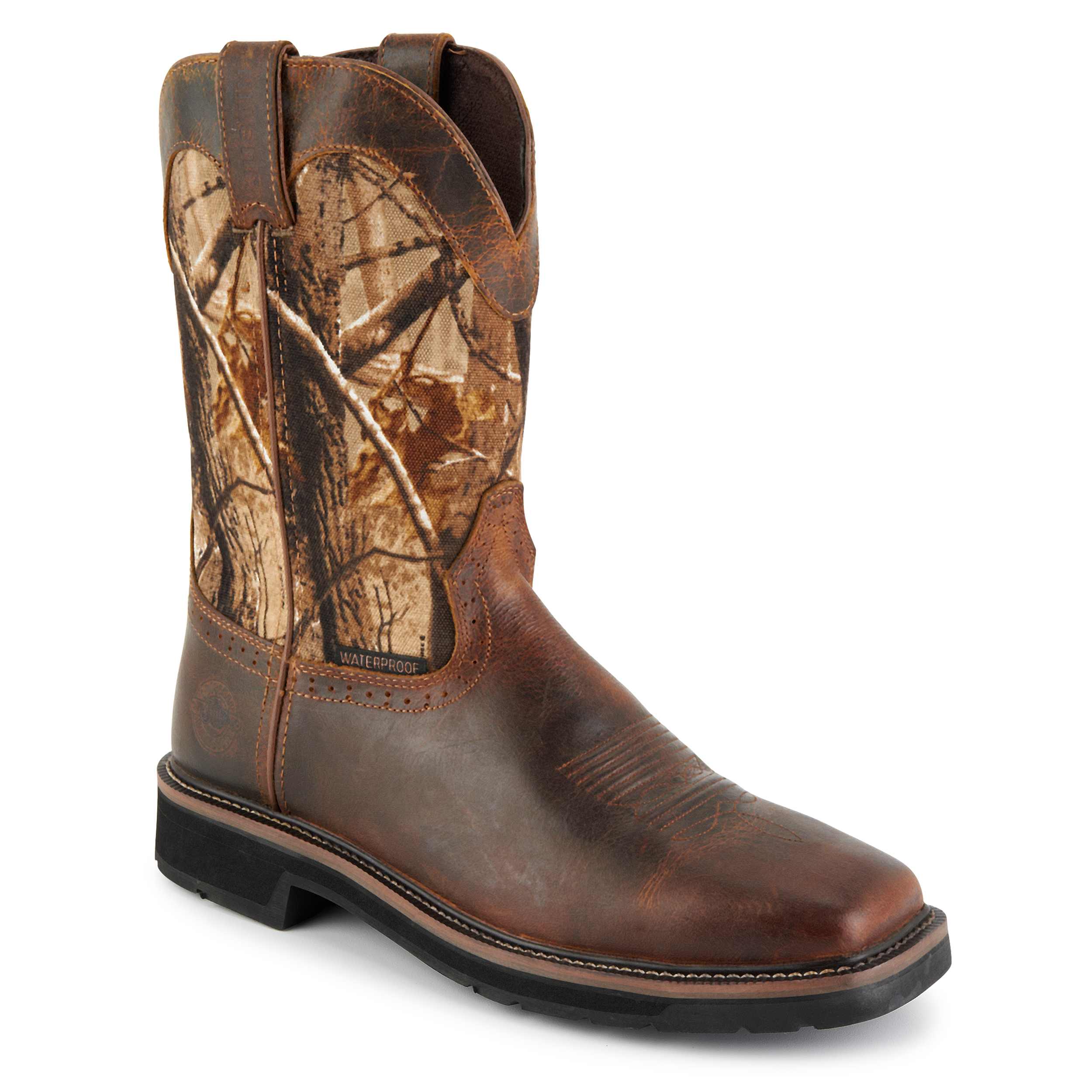 Tackle any task in the Stampede Camo men's western boot from Justin®. It blends a super-sturdy leather construction with an oil-resistant outsole for safety and comfort; Camo print adds an interesting touch.