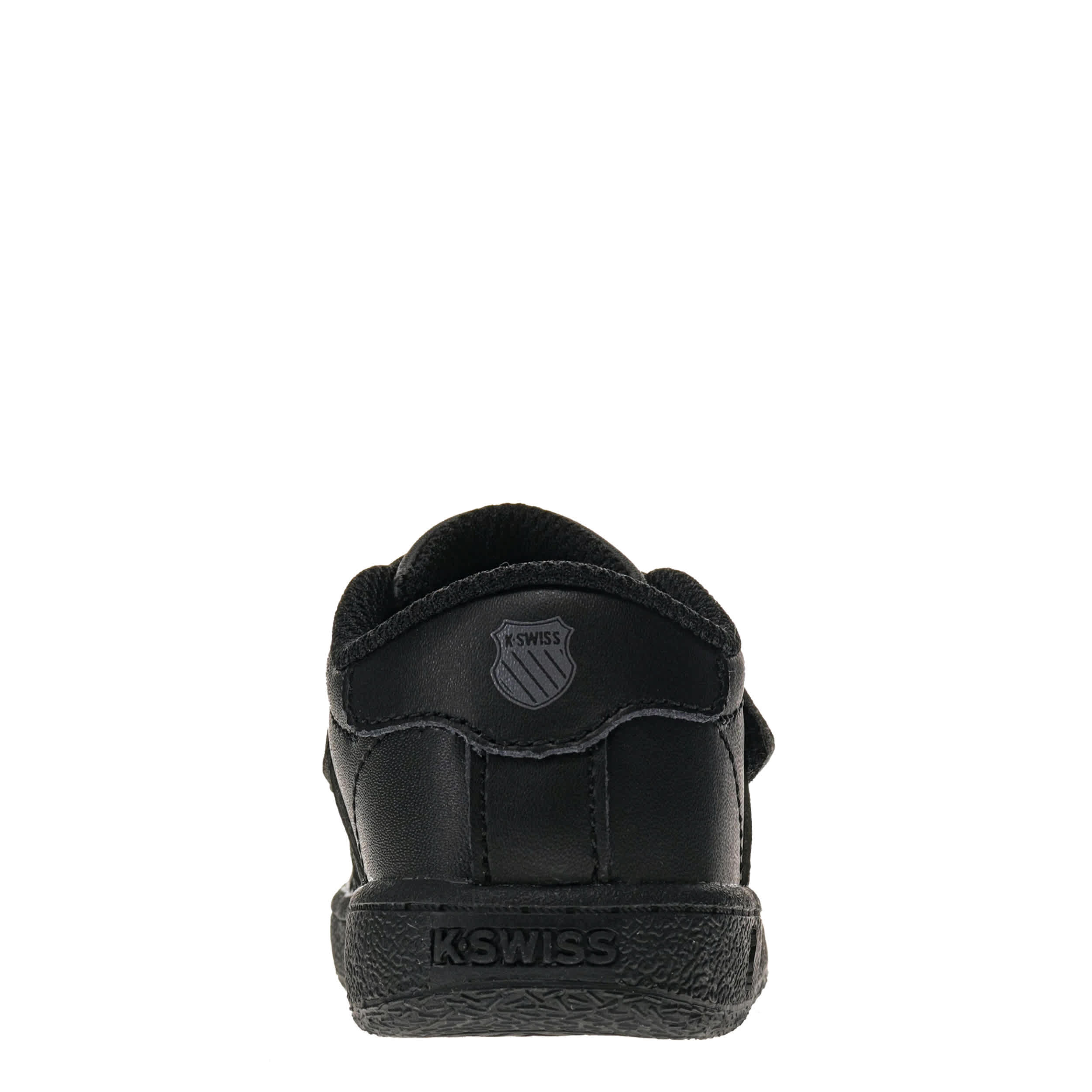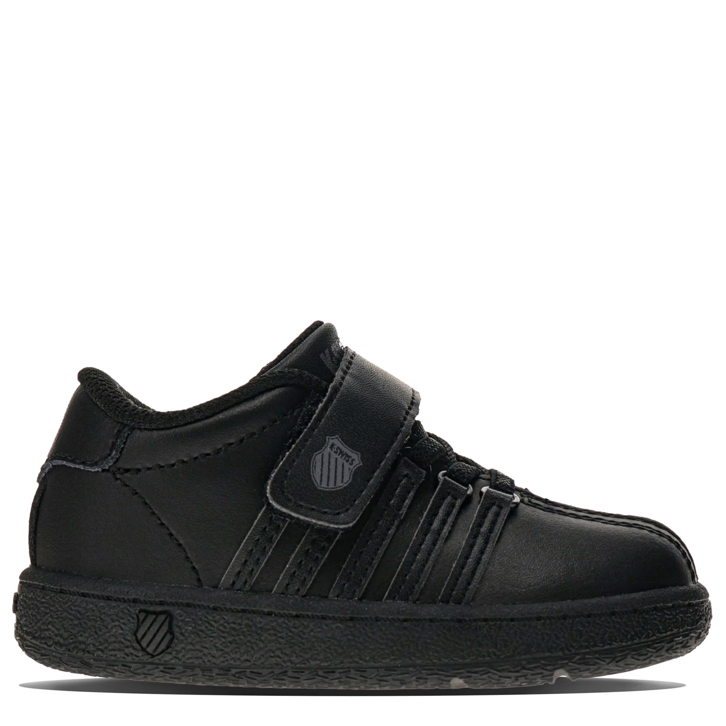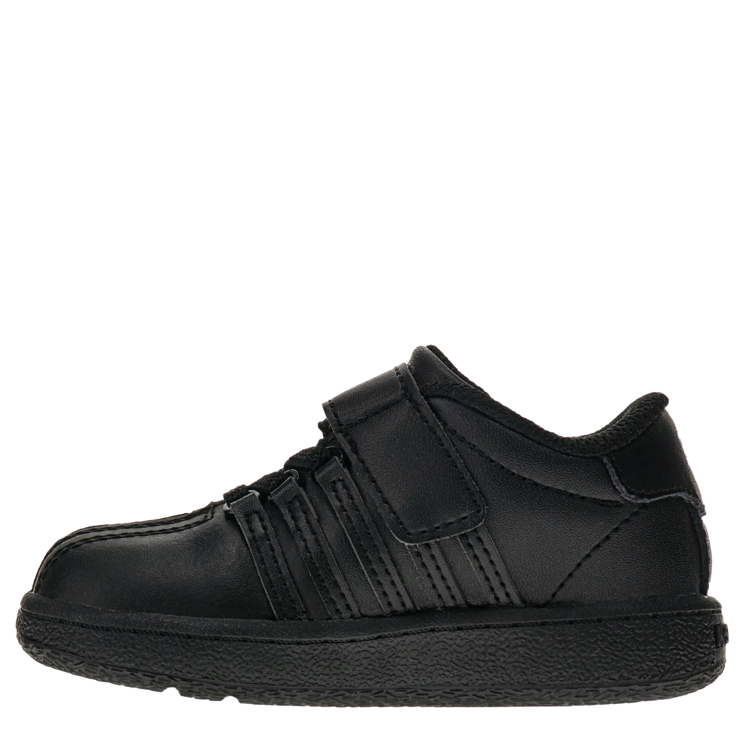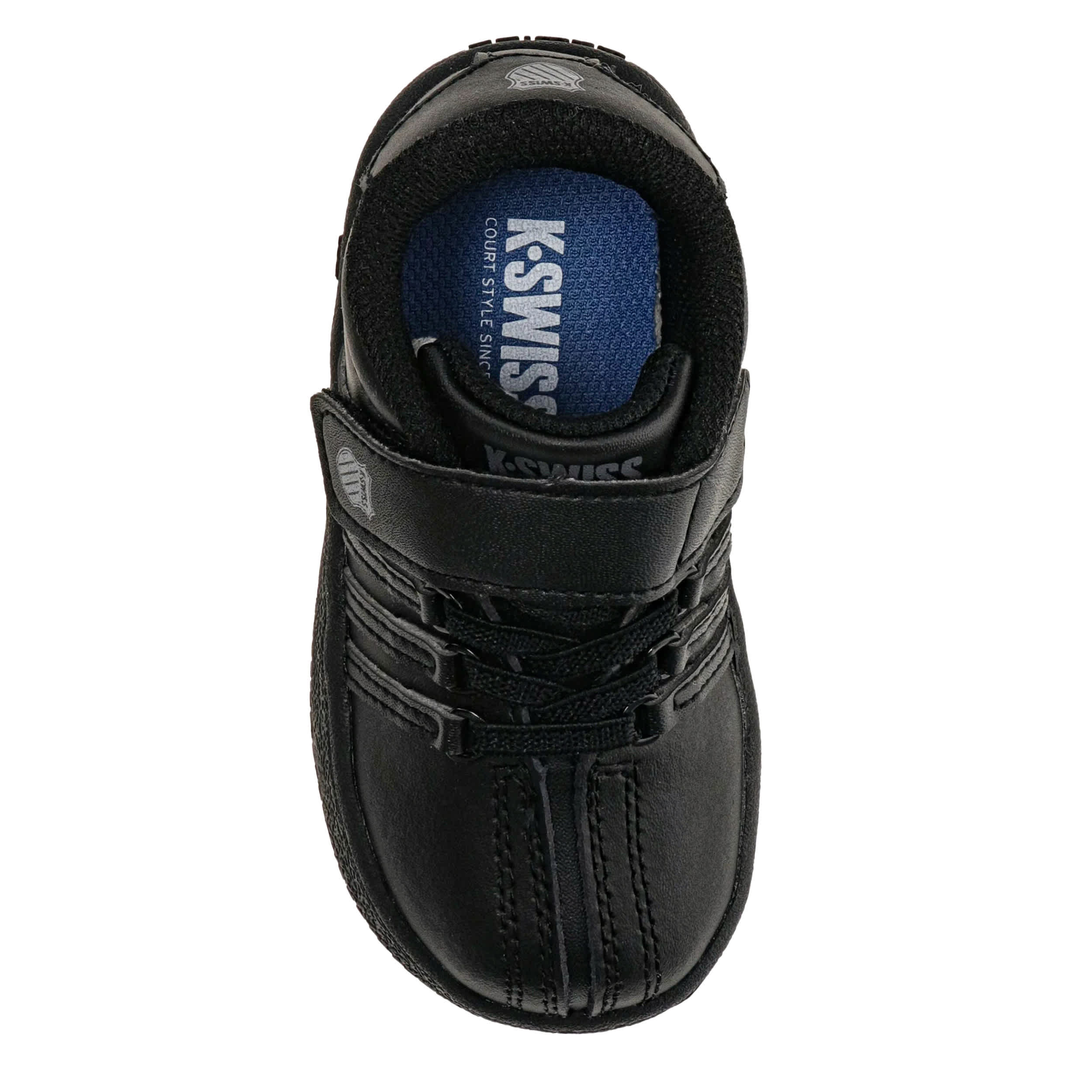 Still a beautiful part of tennis culture, the Classic VN infant boys' sneaker from K-Swiss. Featuring 5-stripe design with D-ring lacing, this all-black shoe also has a secure instep strap. Along with the textile collar & tongue, he gets full-length cushioning in every step.