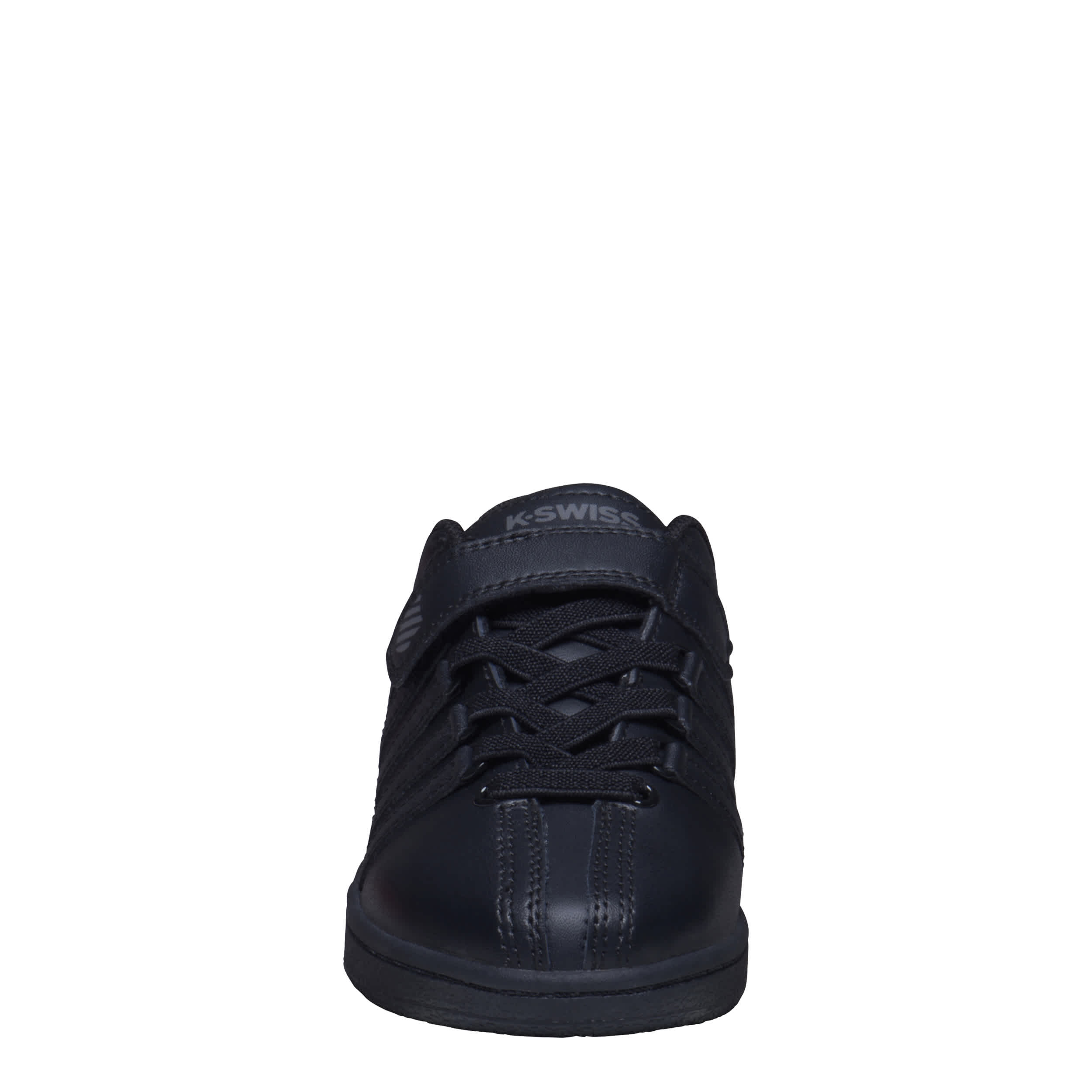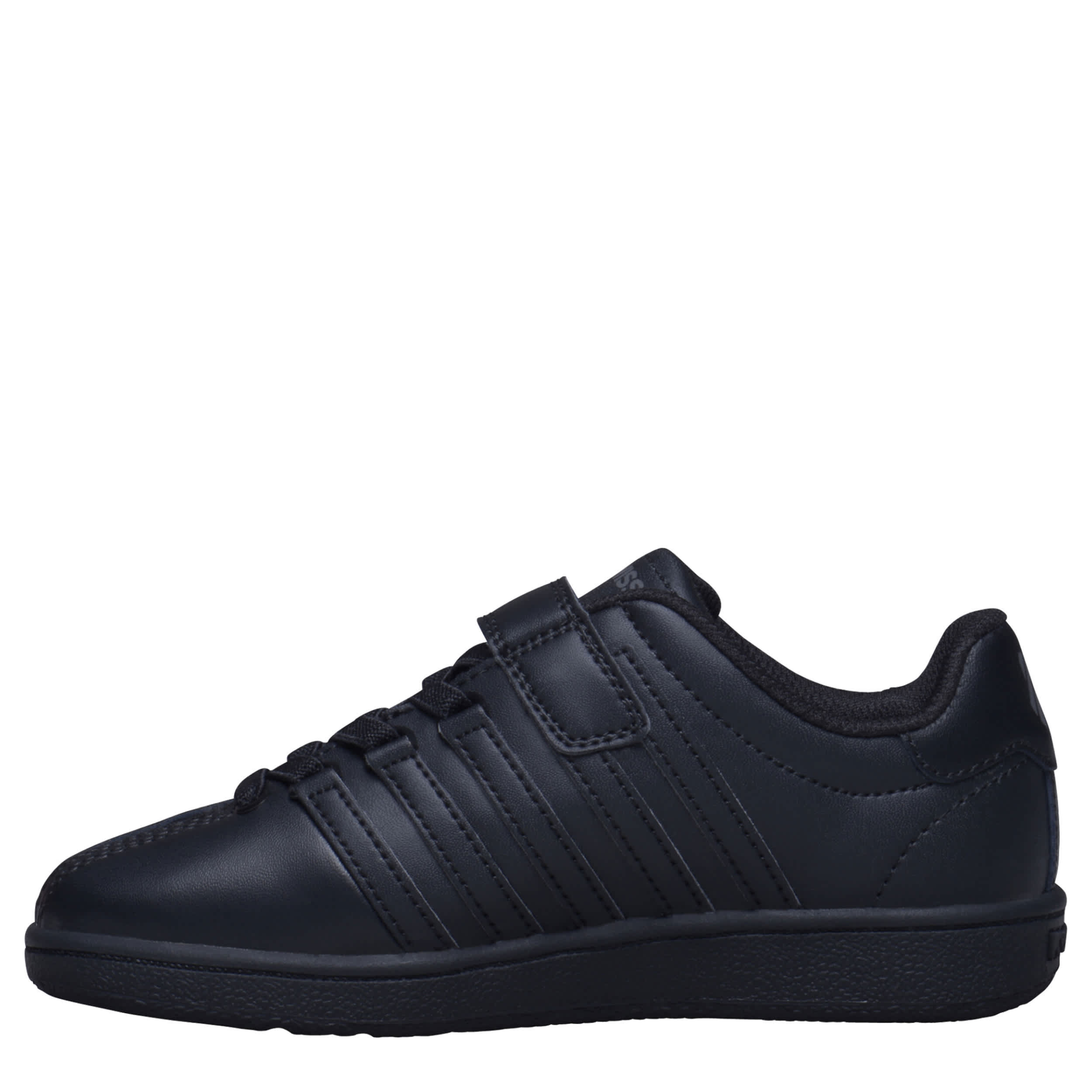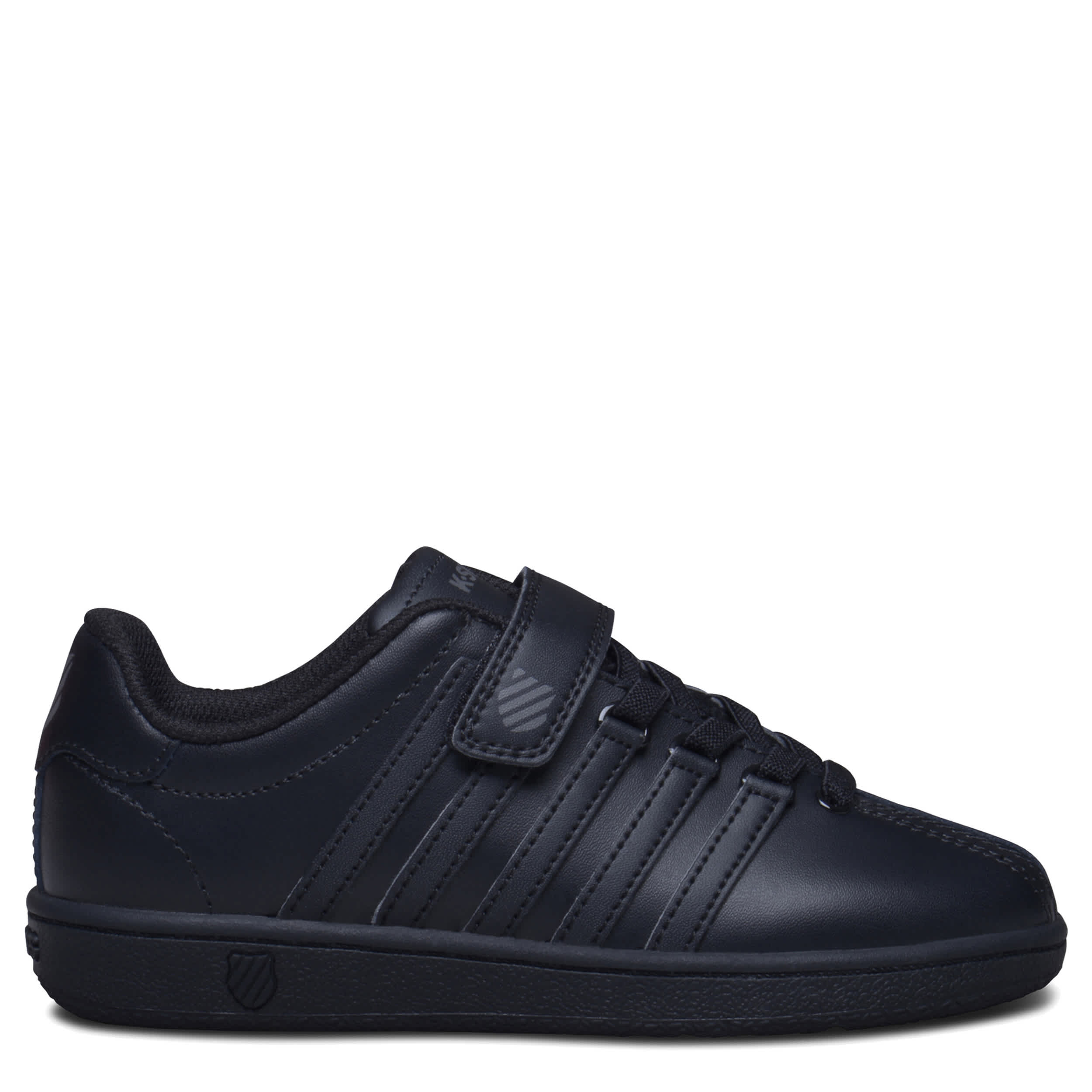 Still a beautiful part of tennis culture, the Classic VN boys' sneaker from K-Swiss. Featuring 5-stripe design with D-ring lacing, this all-black shoe also has a secure instep strap. Along with the textile collar & tongue, you get full-length cushioning in every step.