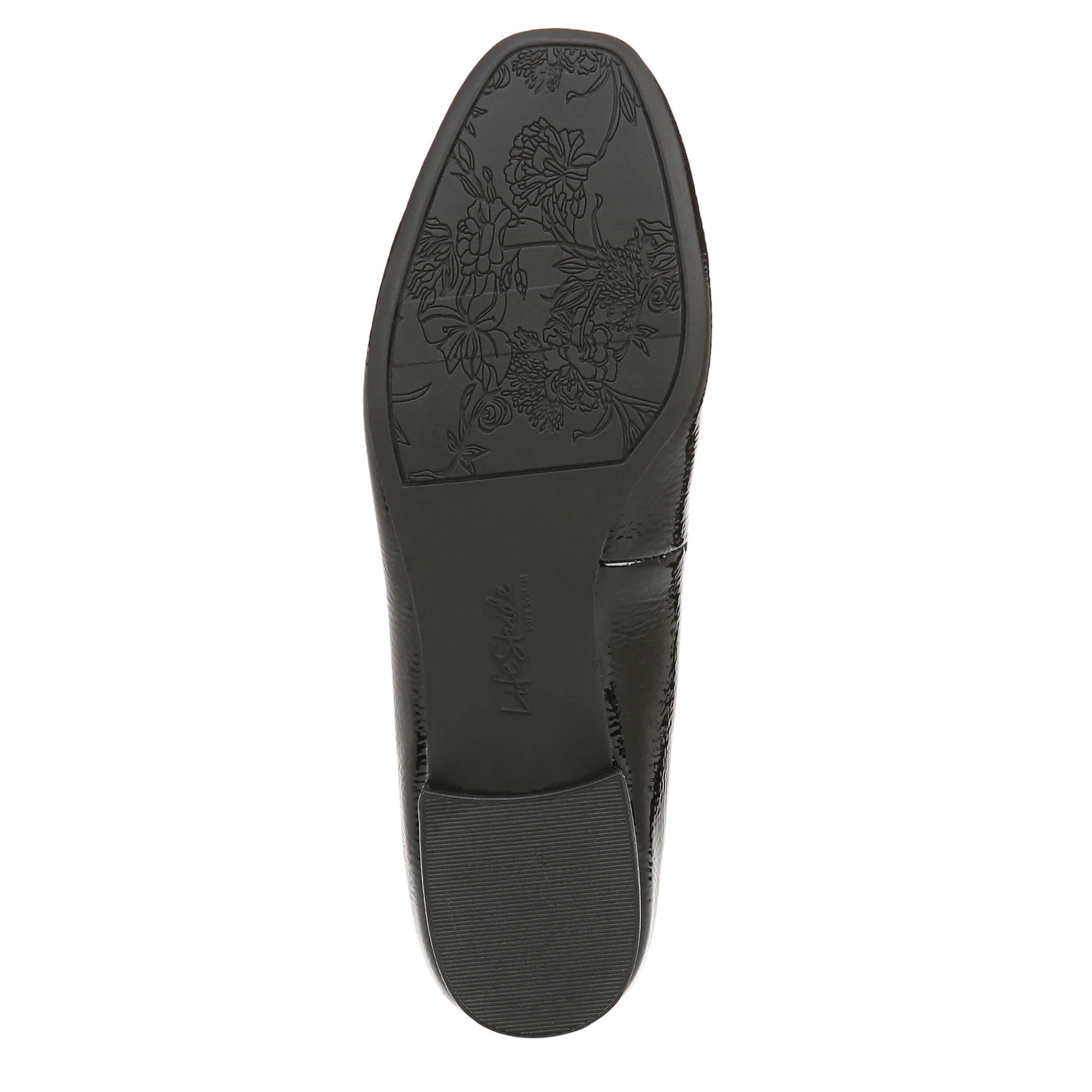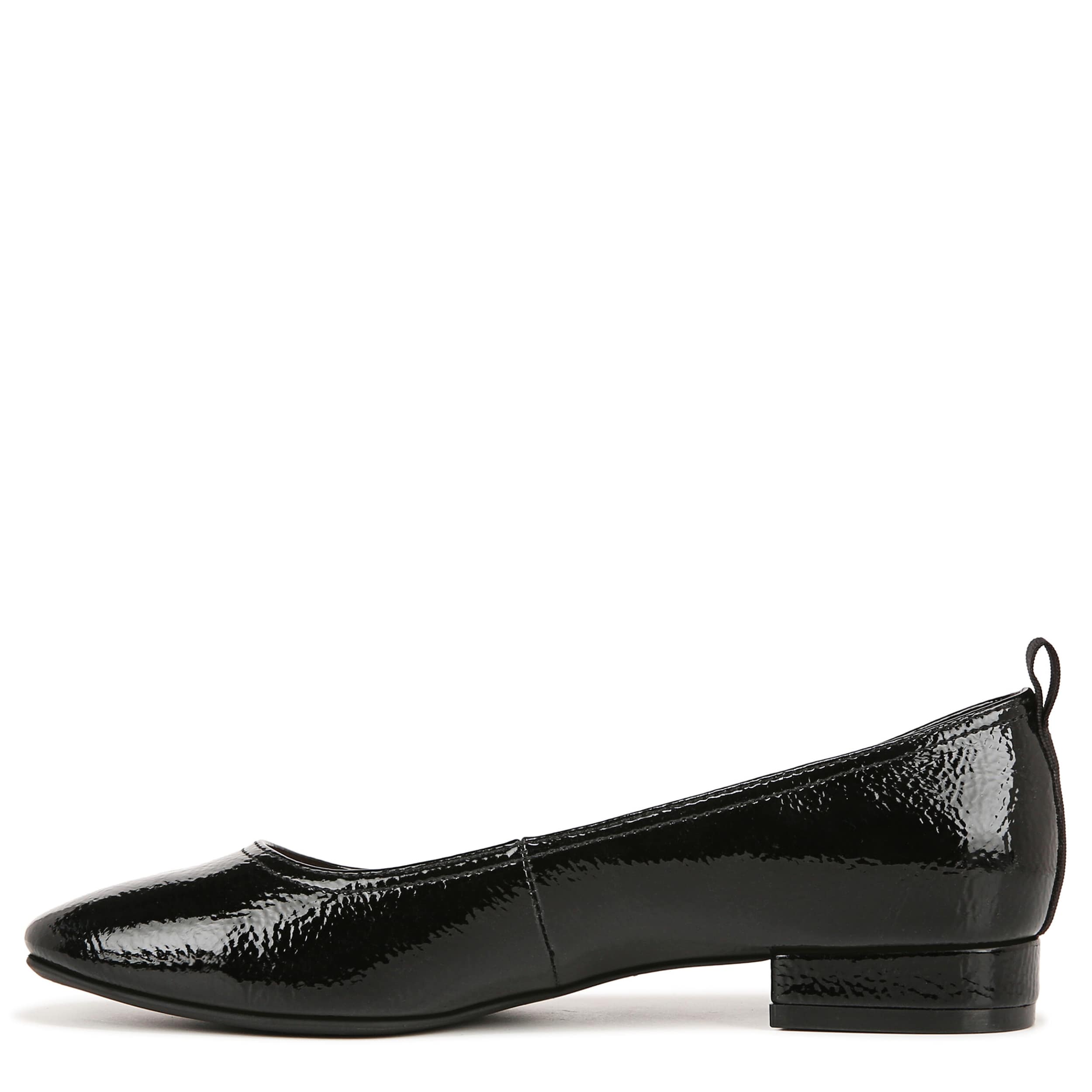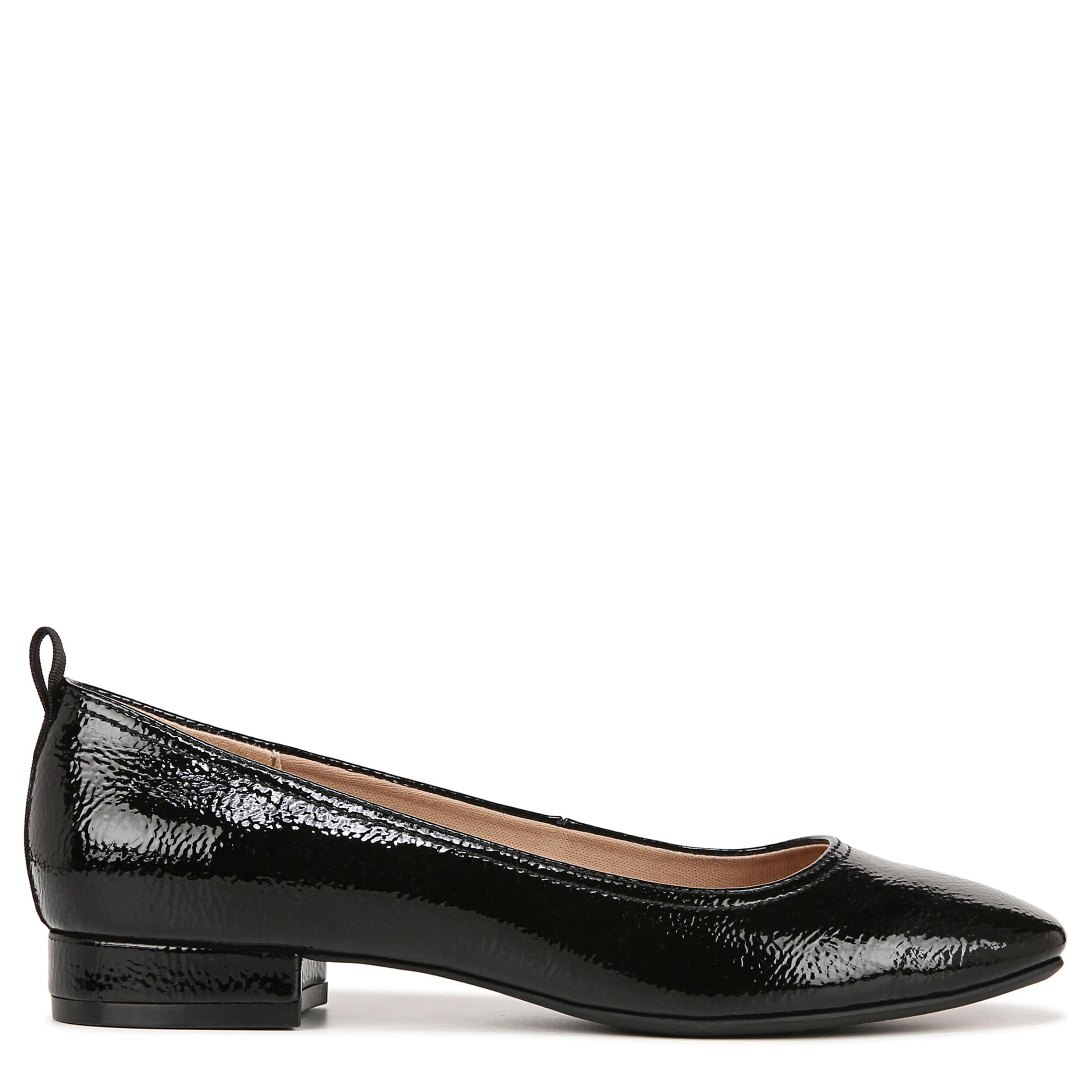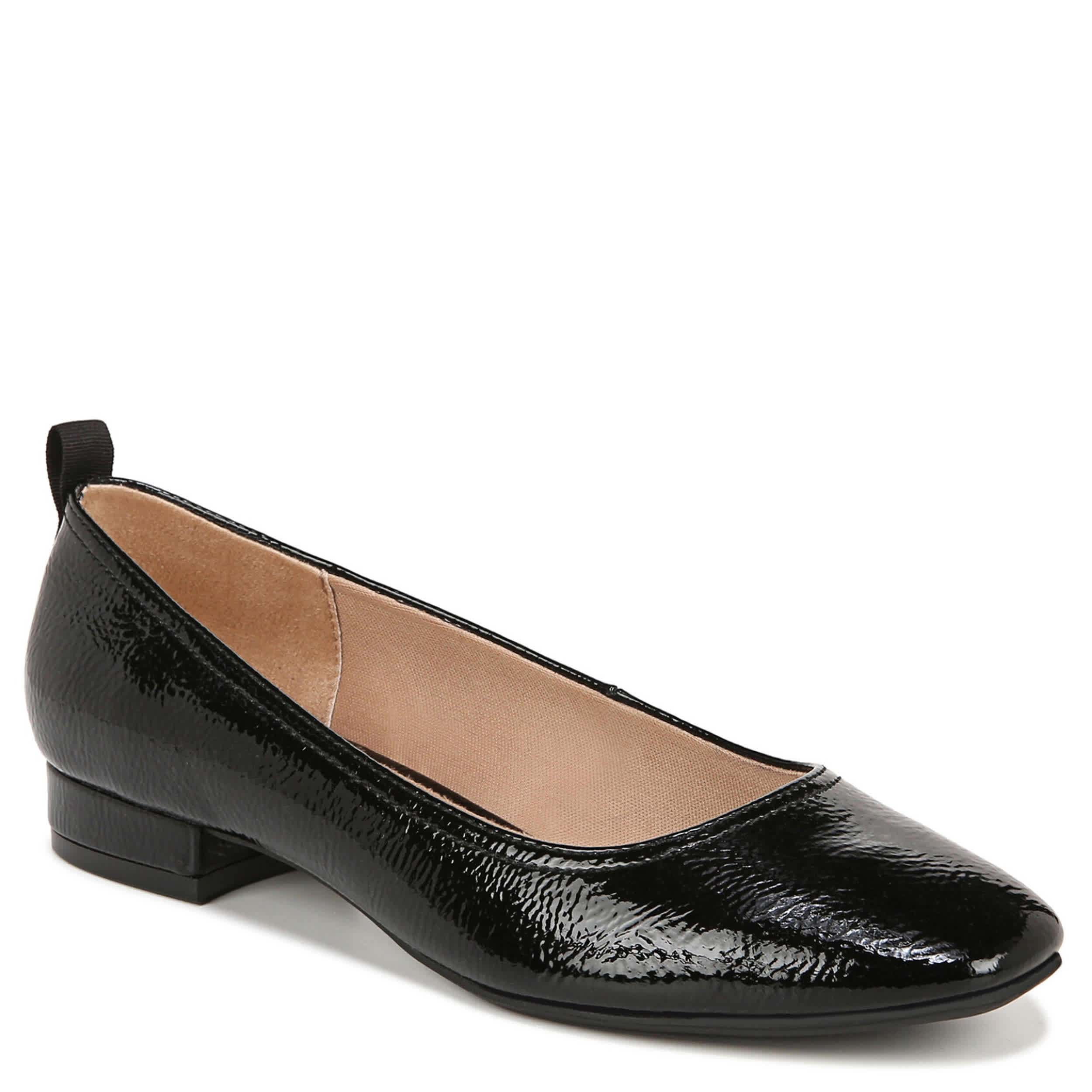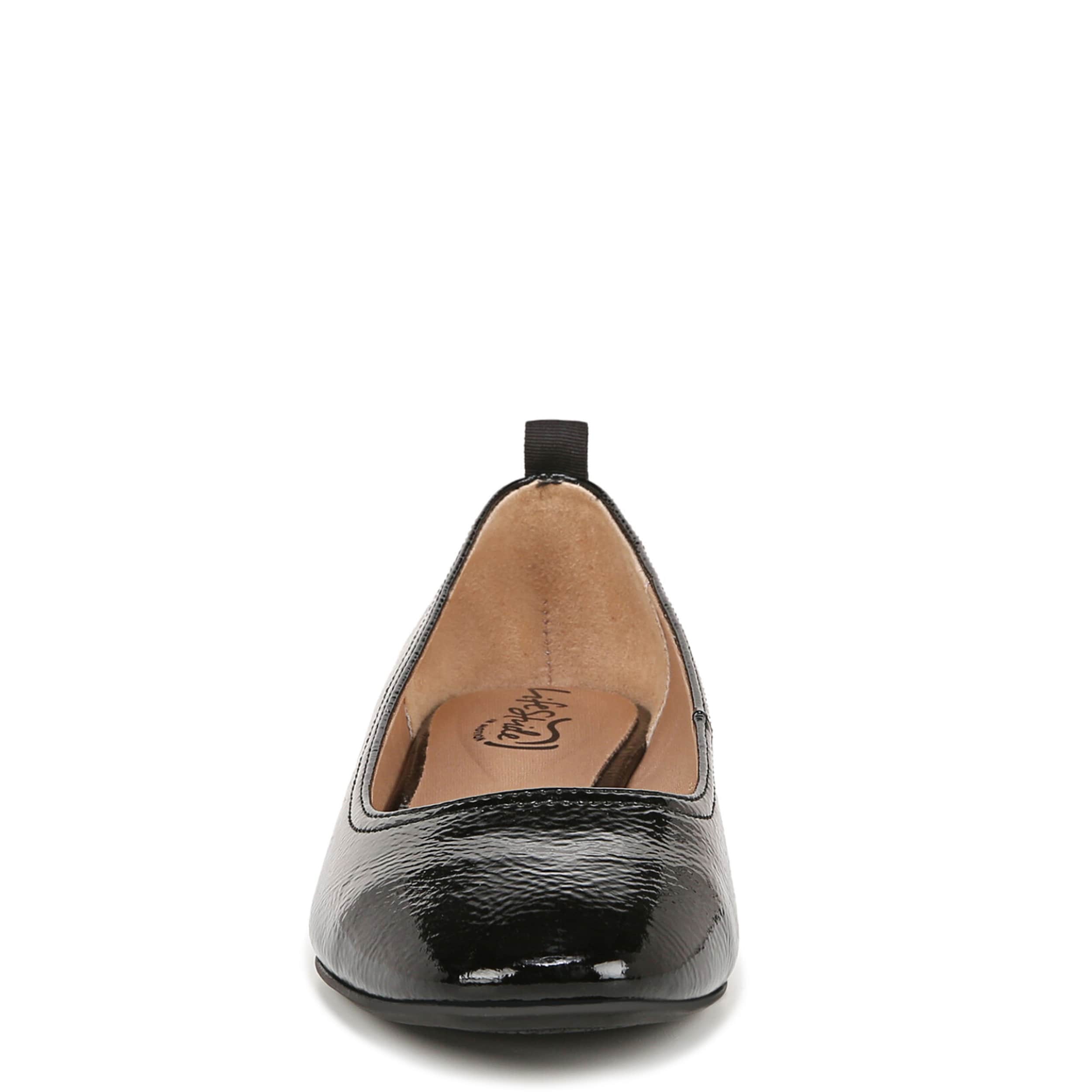 Go with the classic look in the Cameo women's flat from LifeStride. With a patent leather upper featuring a subtle square toe, this flat also has a rear pull tab for an easy fit. The Soft System® comfort package with LifeStride In Motion® technology comfortably supports your foot, while the traction outsole provides stability.