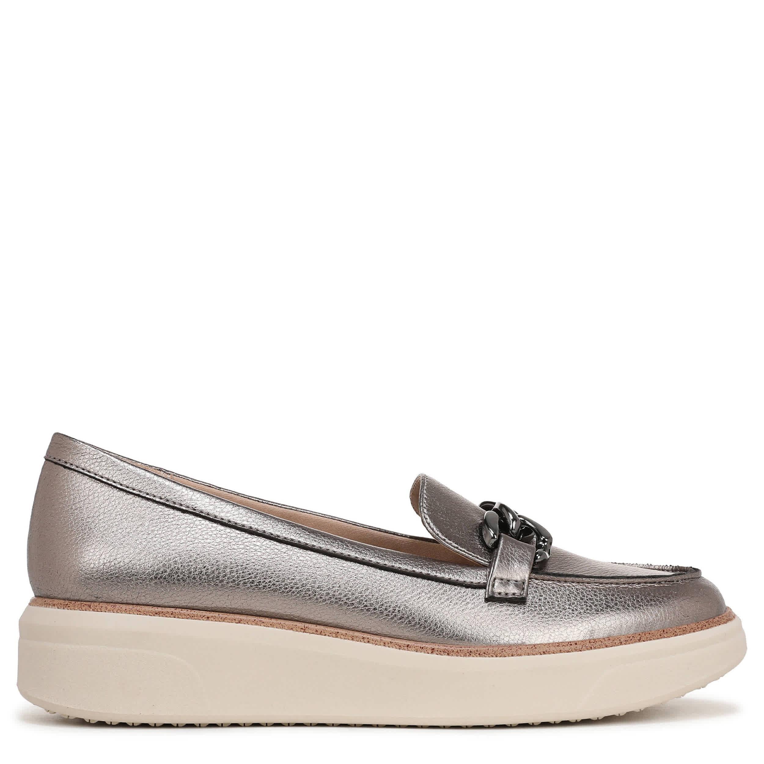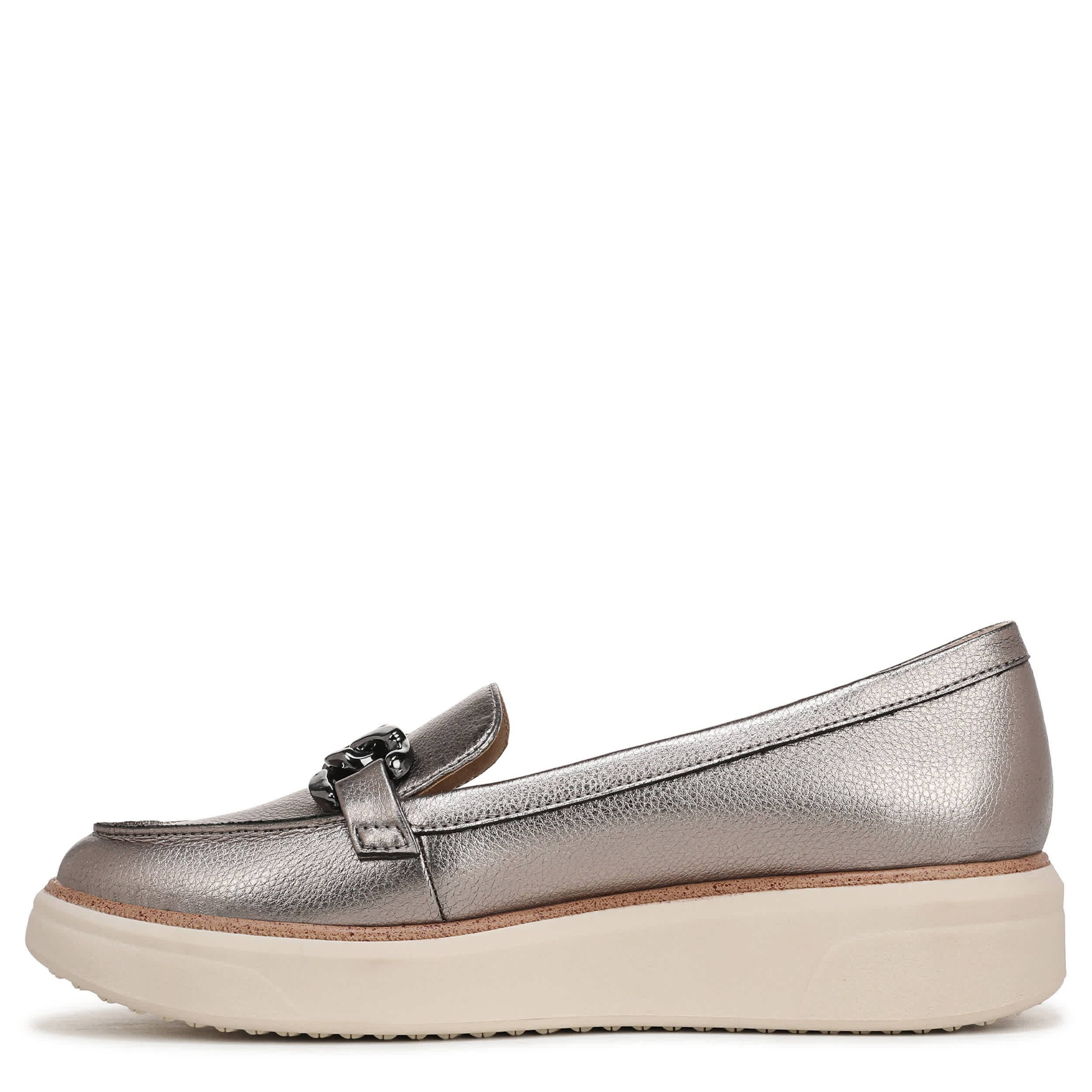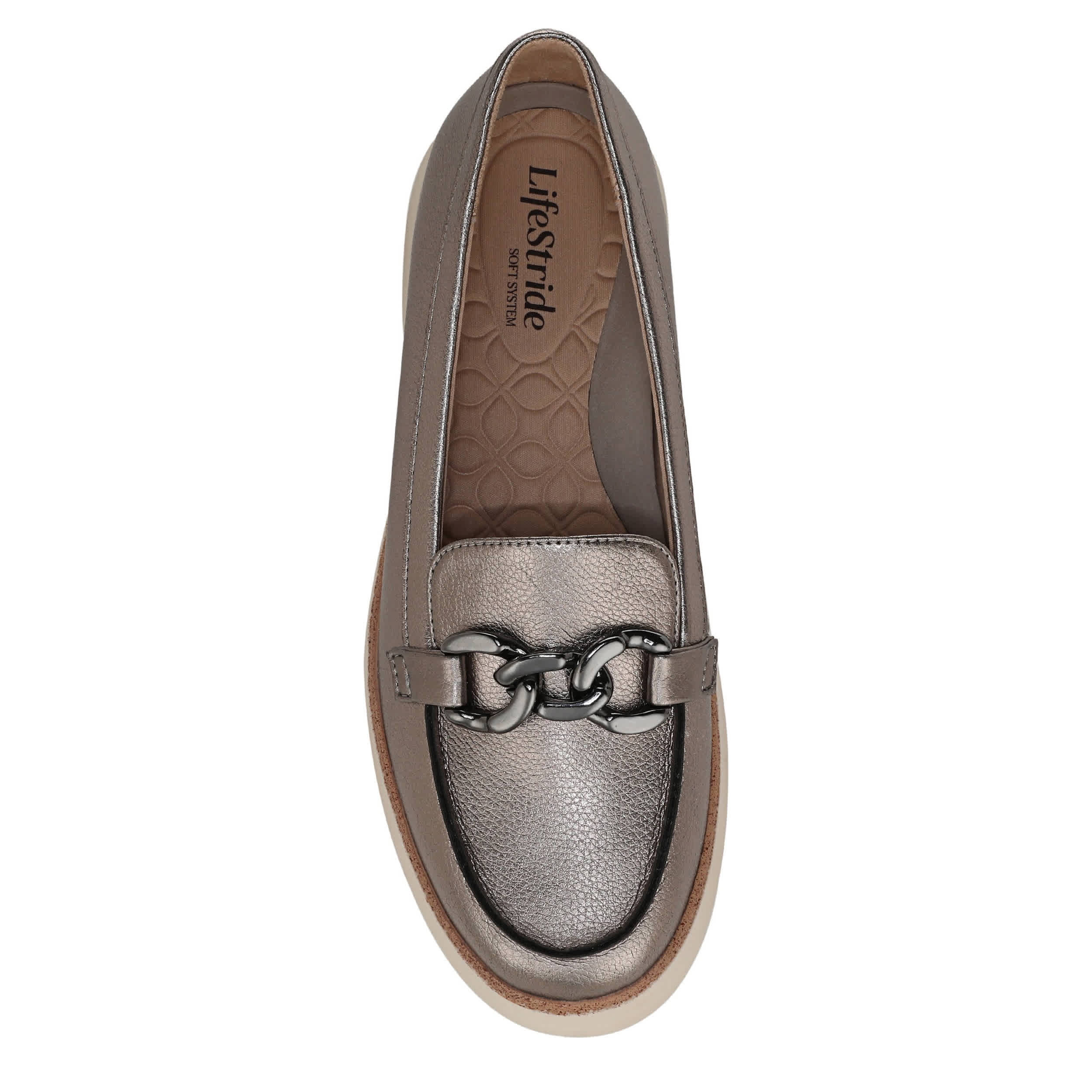Polished and sporty can coincide like in the Chelsea Bit women's loafer from LifeStride. With a metallic faux leather upper featuring a chainlink detail for extra style, this slip-on upgrades your work hours or weekends. The Soft System® comfort technology cradles your foot while the sporty outsole keeps you grounded with a bit of lift.