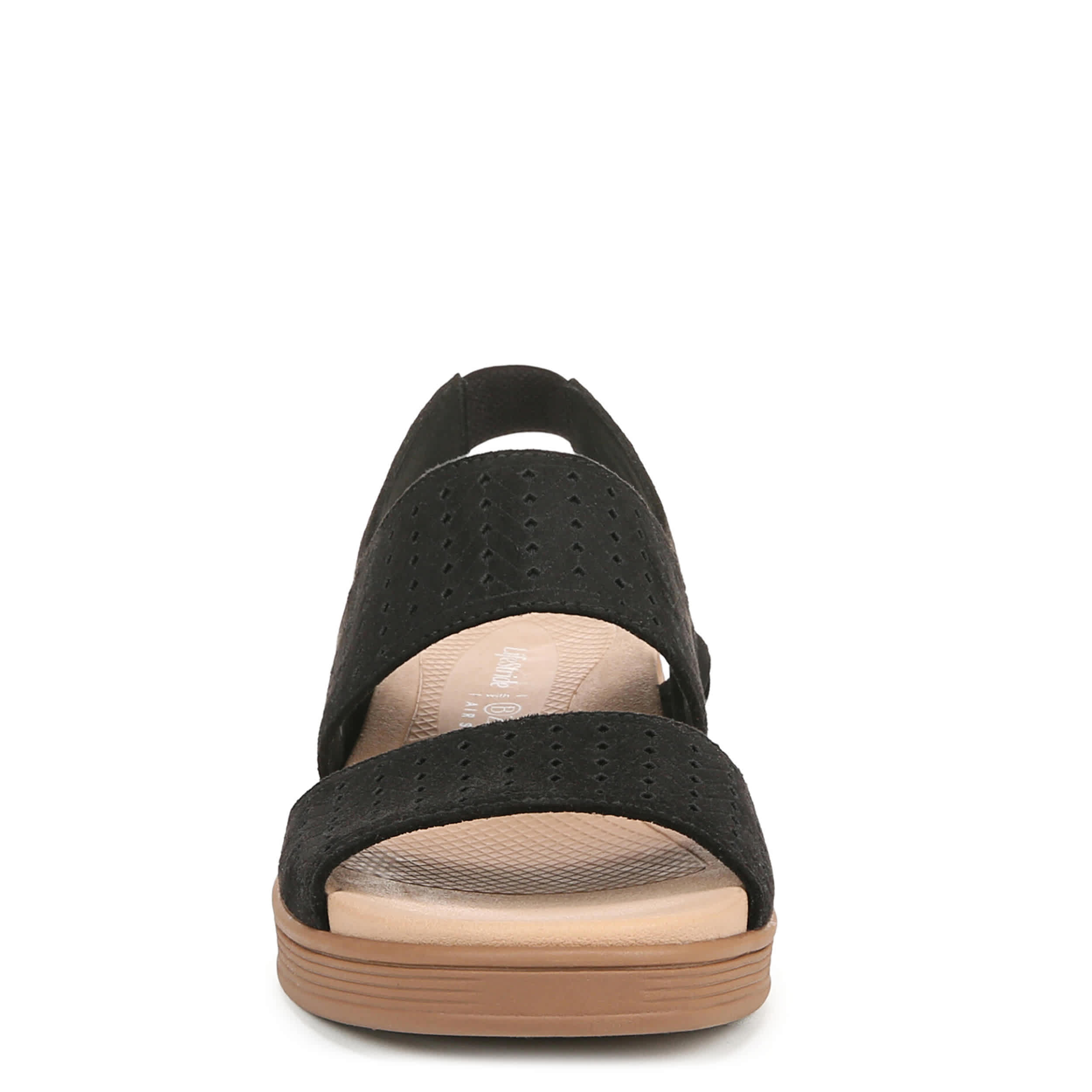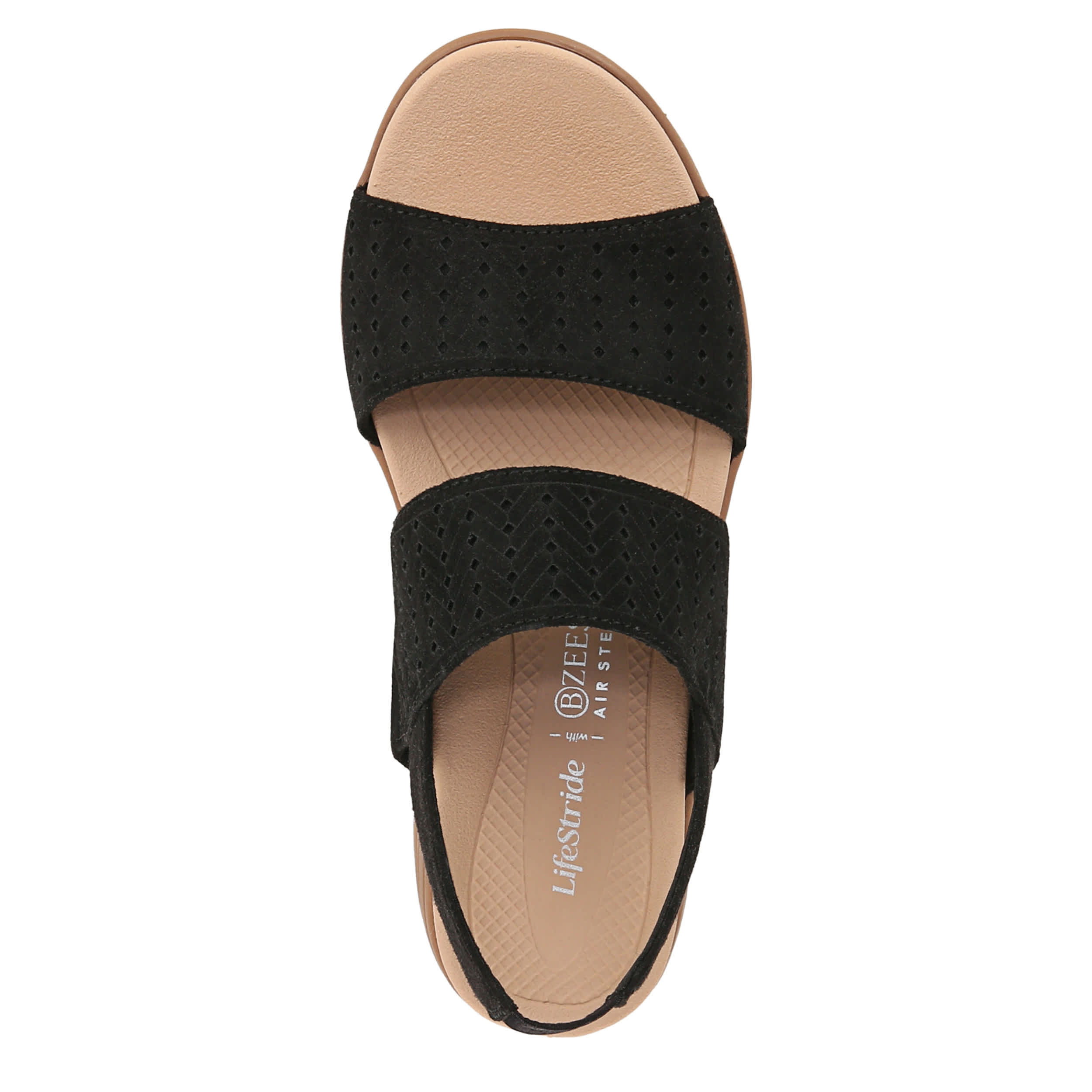 Spring into a cute style with the Festive wedge sandal from LifeStride. Made with a stretch fabric upper and slingback strap, you can slip this sandal on and off with ease. The BZEES Air Step technology gives a lightweight feeling to your steps, while the cushioned footbed and rubber outsole offer exceptional support to get you through the day.