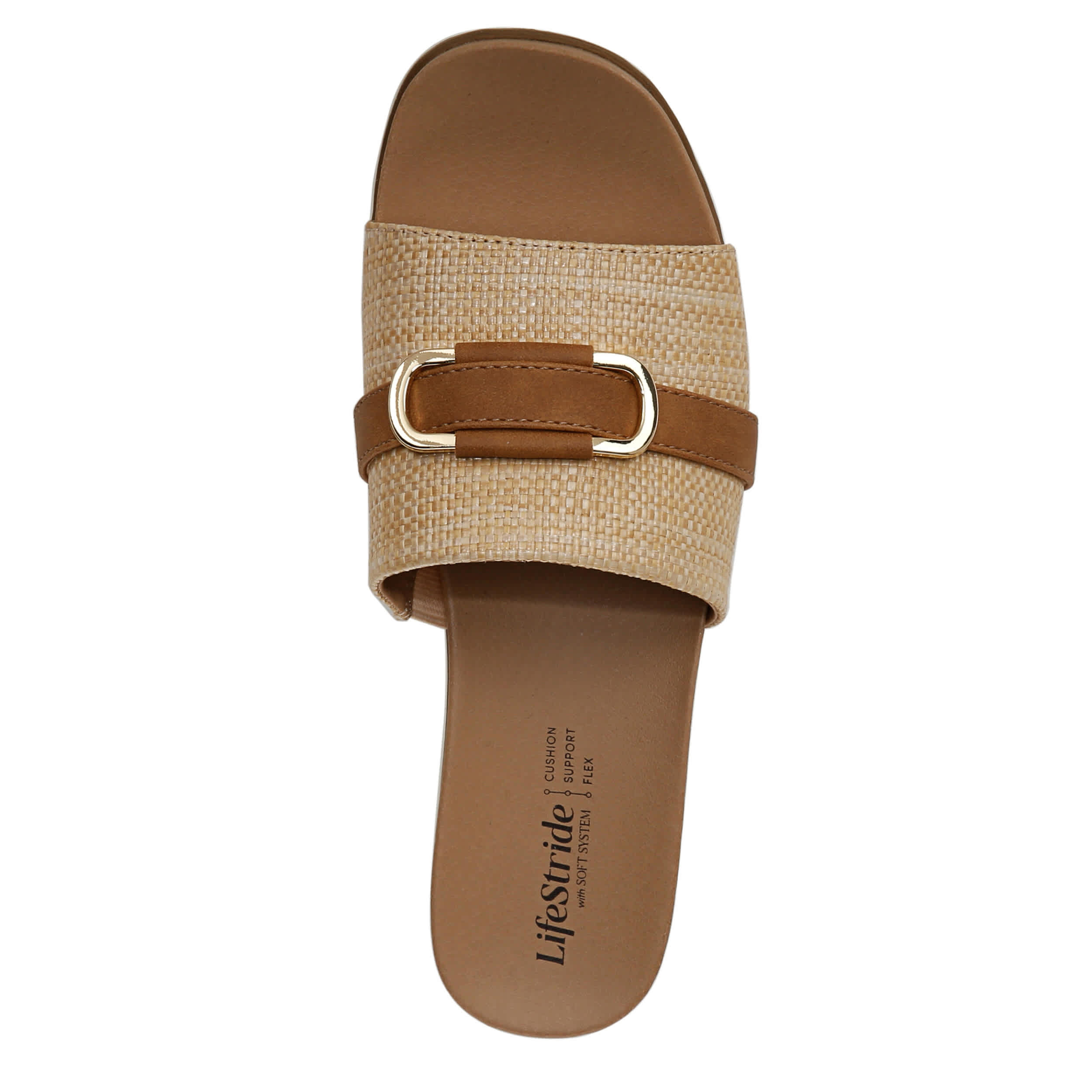 Never try too hard to look just right in the LifeStride Genevieve slide sandal. Featuring a woven fabric & faux leather upper with an open square toe and gold-tone hardware, this lightweight sandal is casually well put together. The Soft System® comfort technology offers trusted cushioning, while the platform heel adds just enough lift.