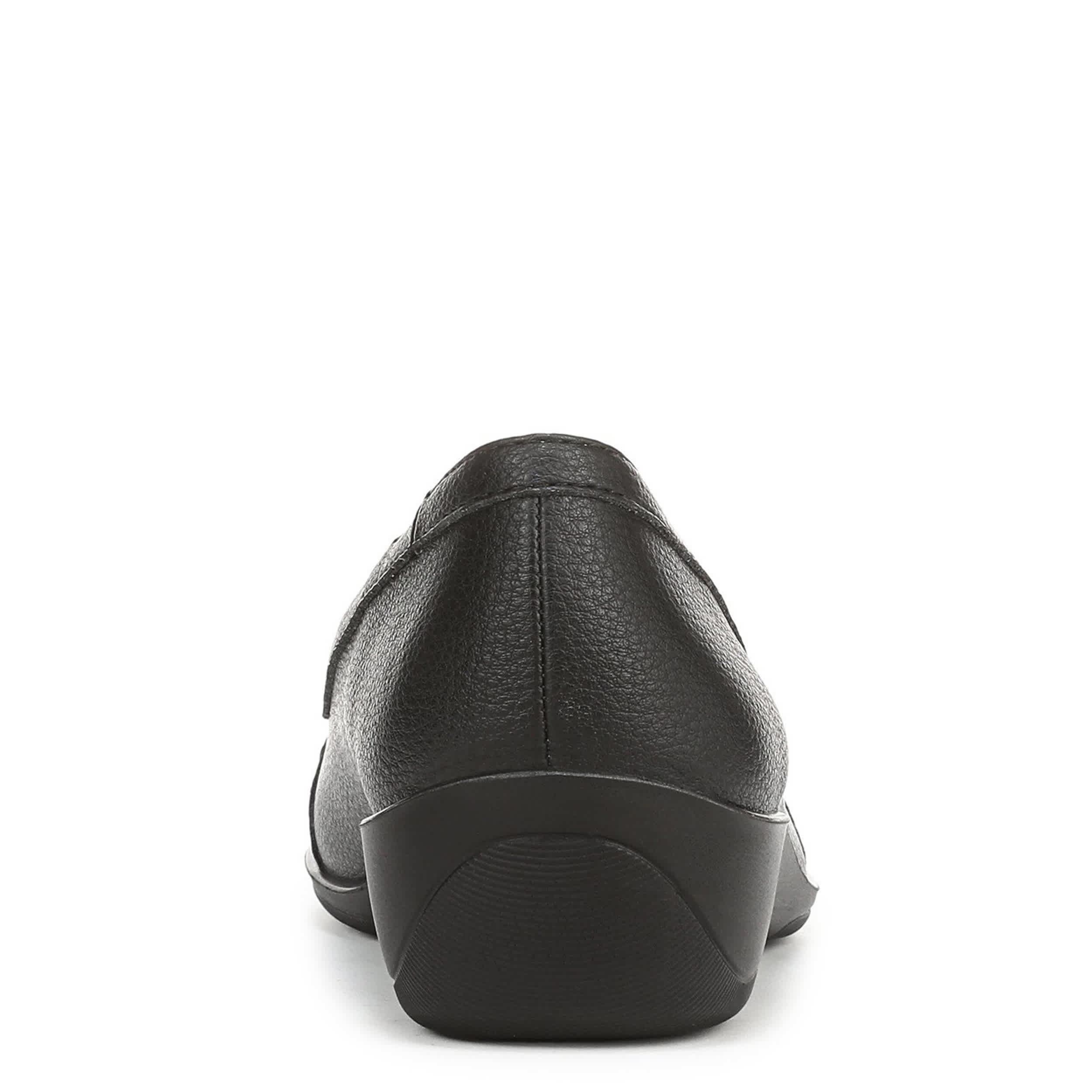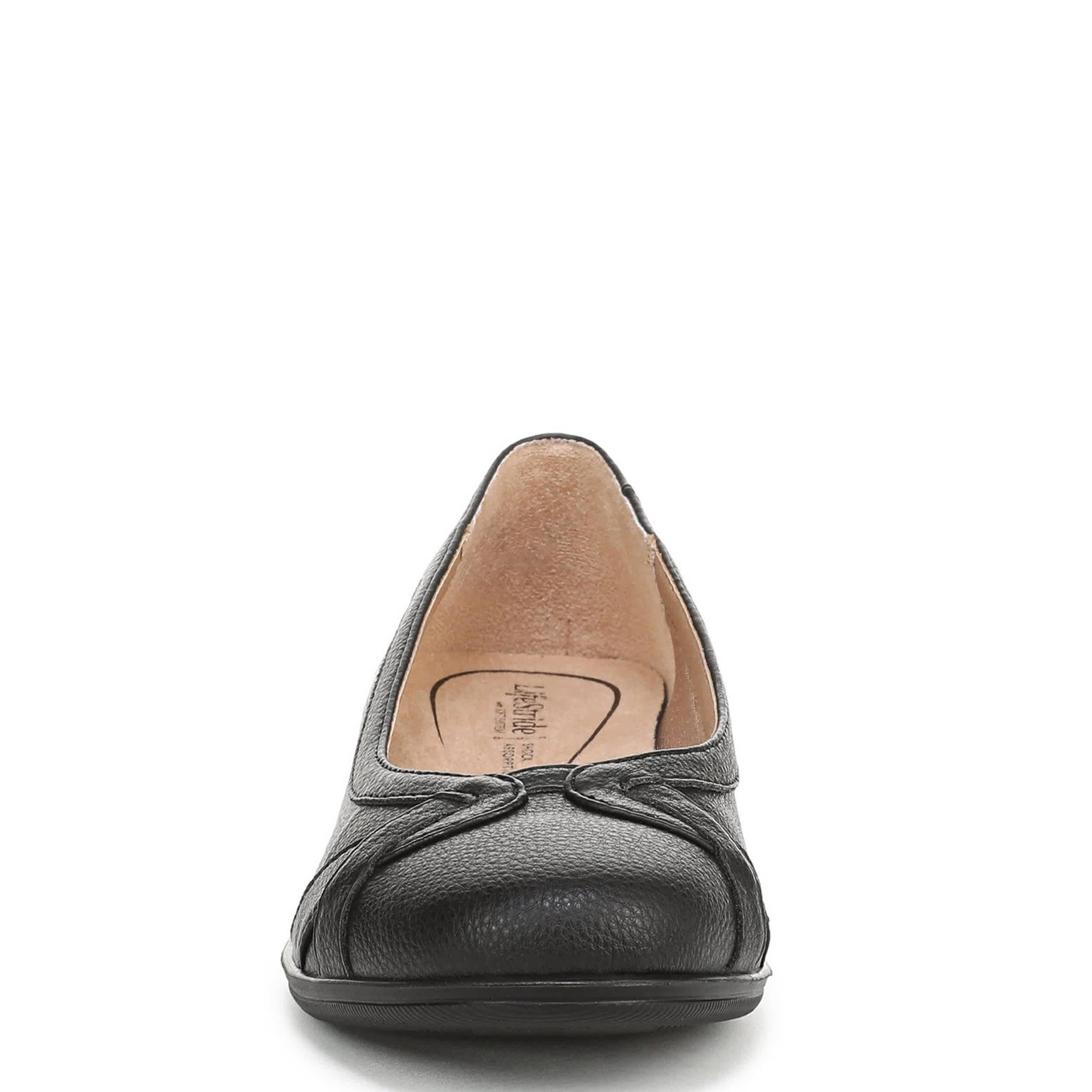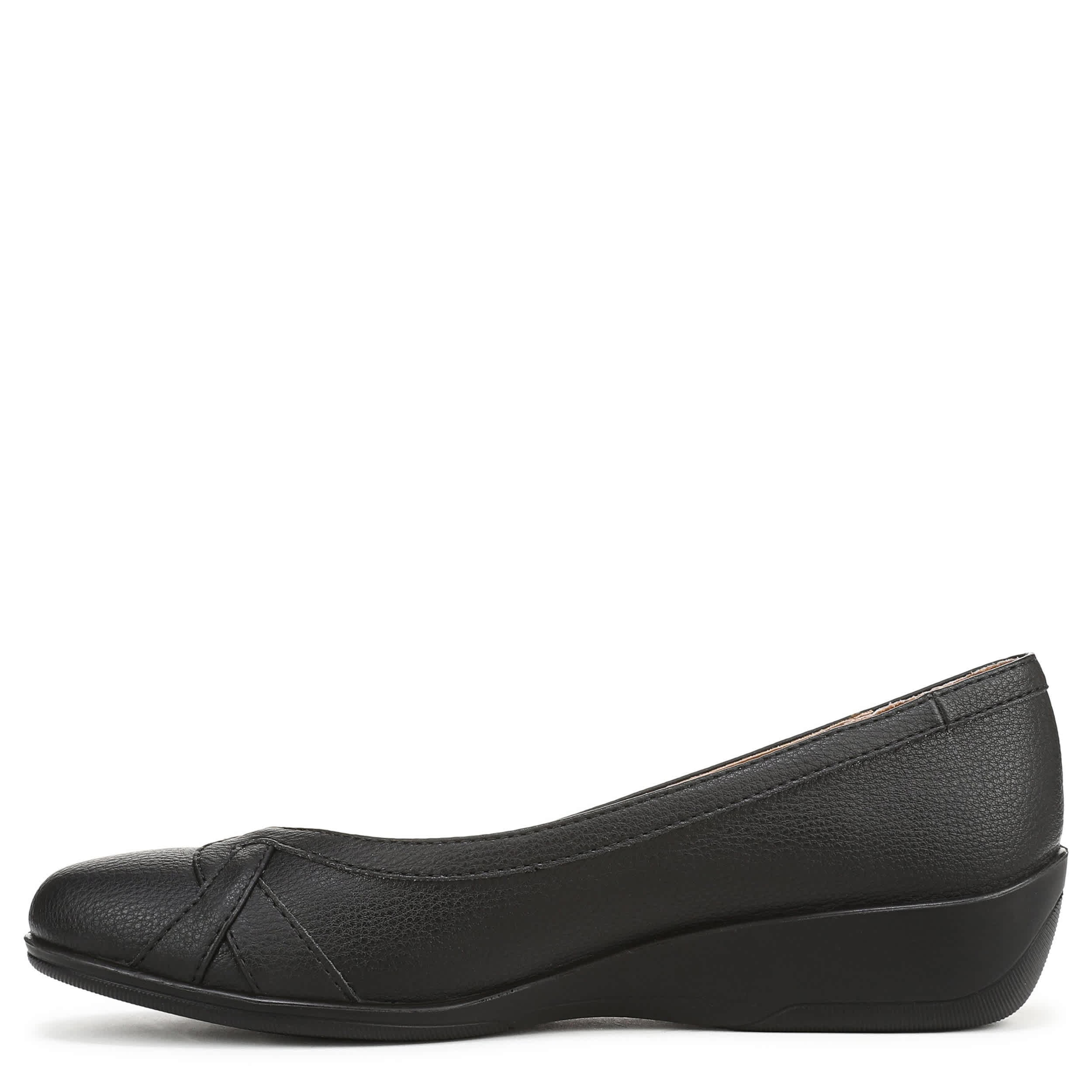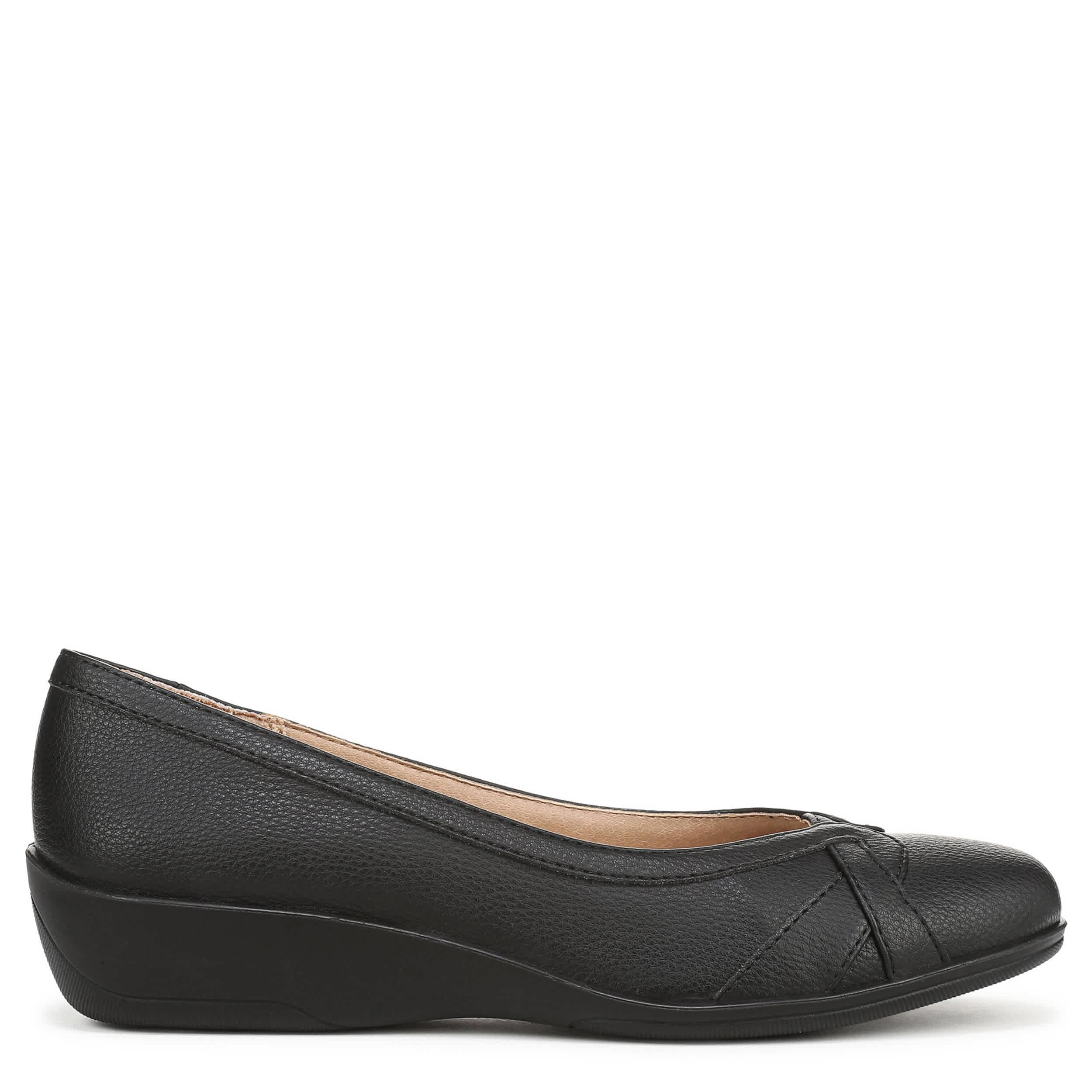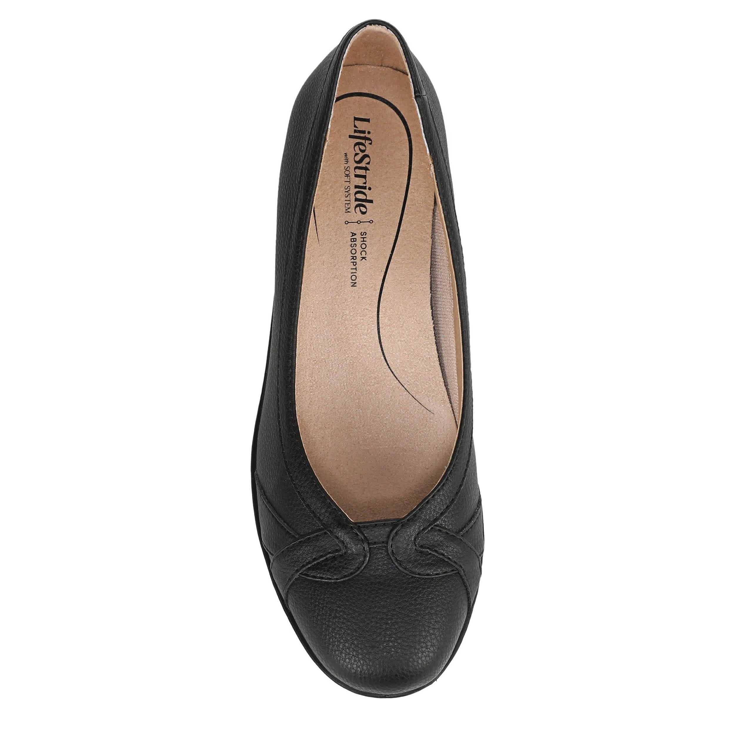 Daily casual is the look in the LifeStride Infinite women's flat. With a faux leather upper featuring added gore for a comfy fit, this everyday flat is versatile as well as sophisticated. The Soft System® cushioning offers flexible comfort and shock absorption, while the low wedge provides a slight lift.