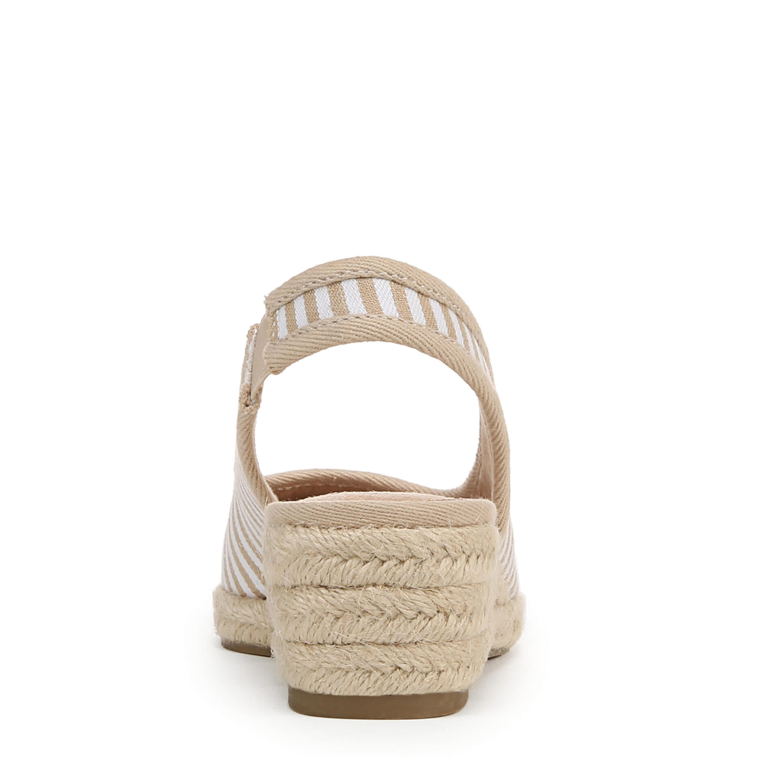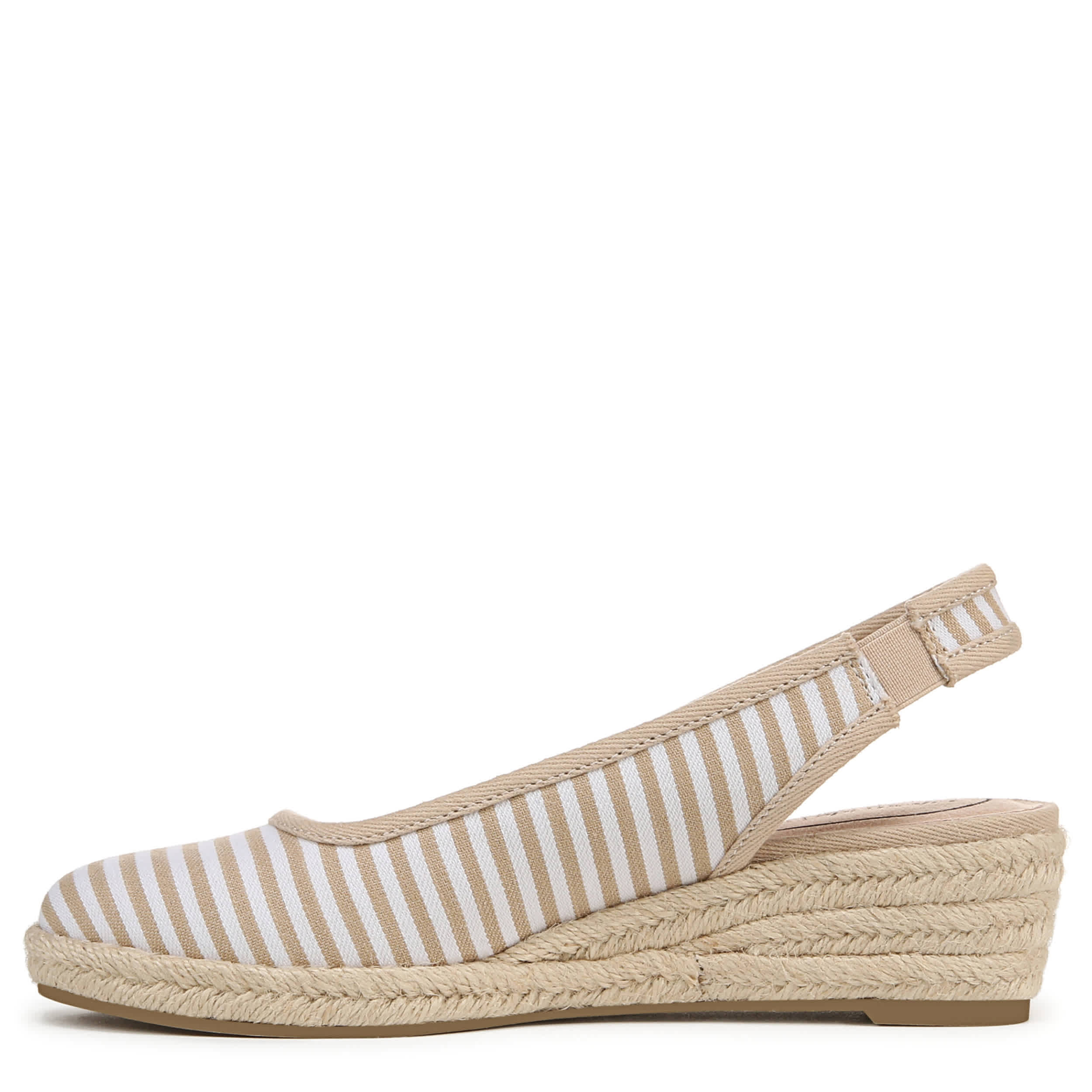 Wear a classic look with the LifeStride Kayden espadrille sandal. Made with a fabric upper, this shoe nails the trending casual look. Your steps are cushioned with a Soft System® padded insole, while the wedge heel gives a slight lift.