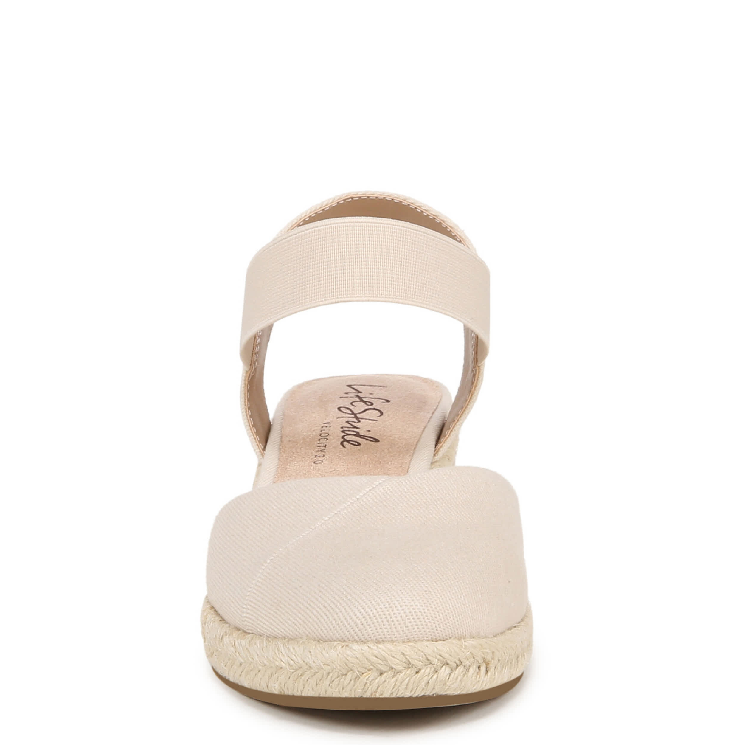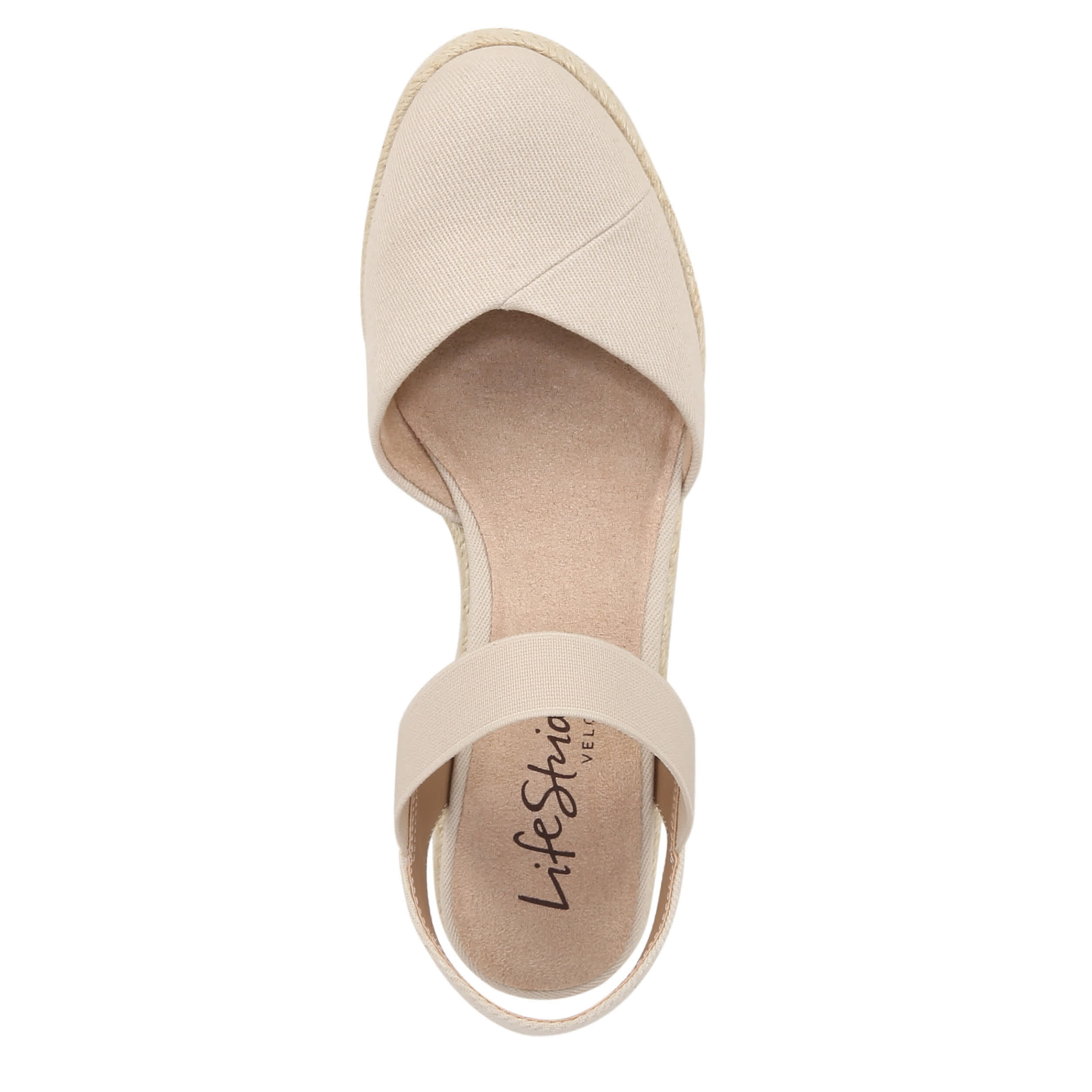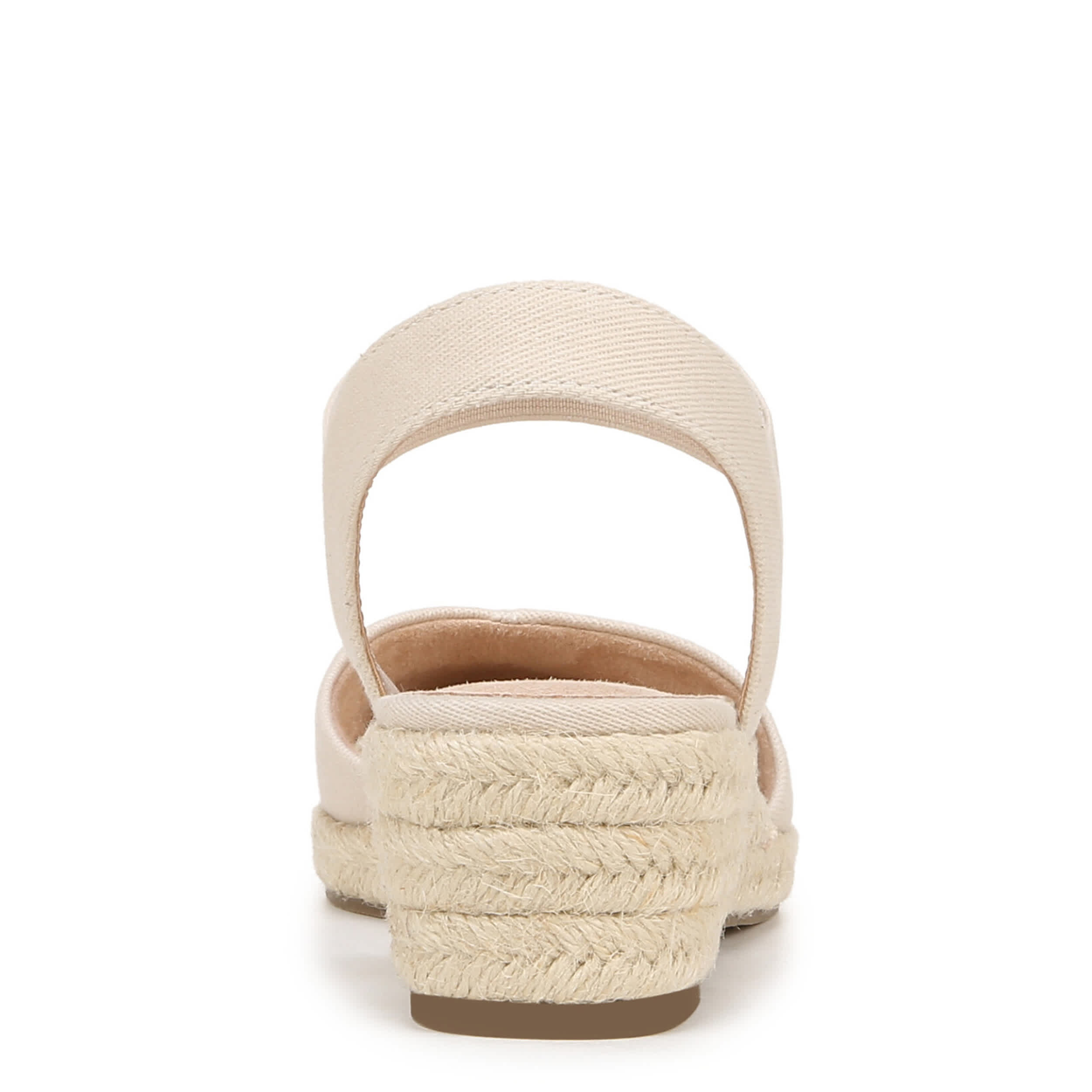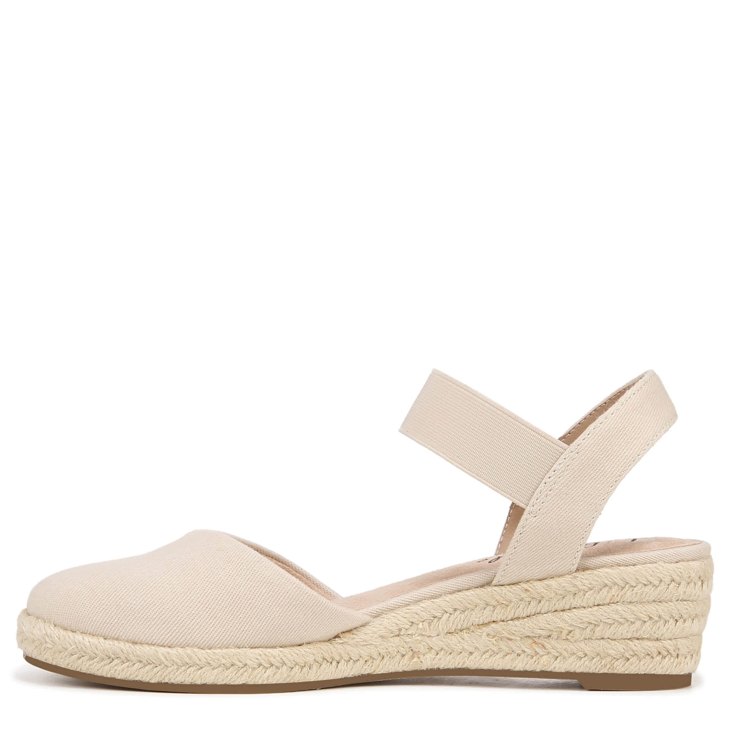 Sit cute in the Kimmie women's wedge sandal. Featuring a canvas upper with a stylish almond toe, this stretch gore sandal has everything going for it. The Soft System® comfort package & Velocity 2.0® cushioning offer premium support while the espadrille-wrapped wedge adds just enough height.