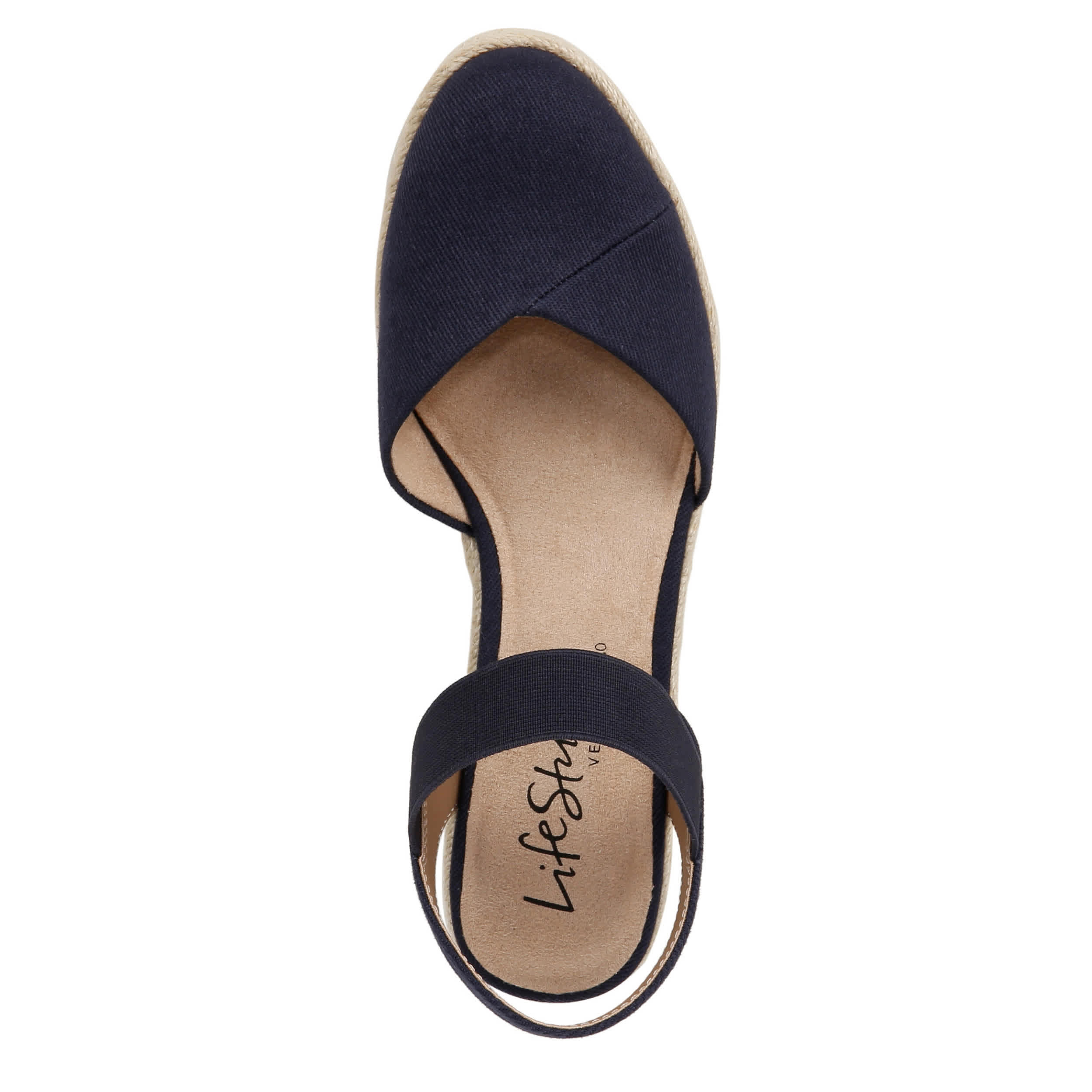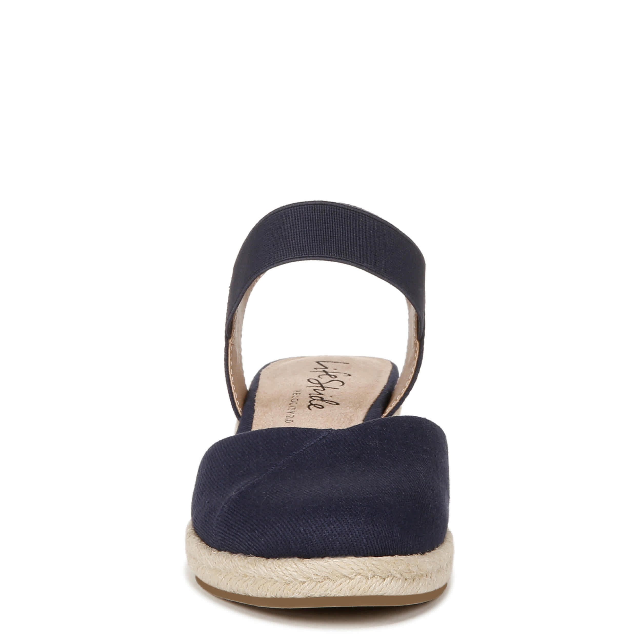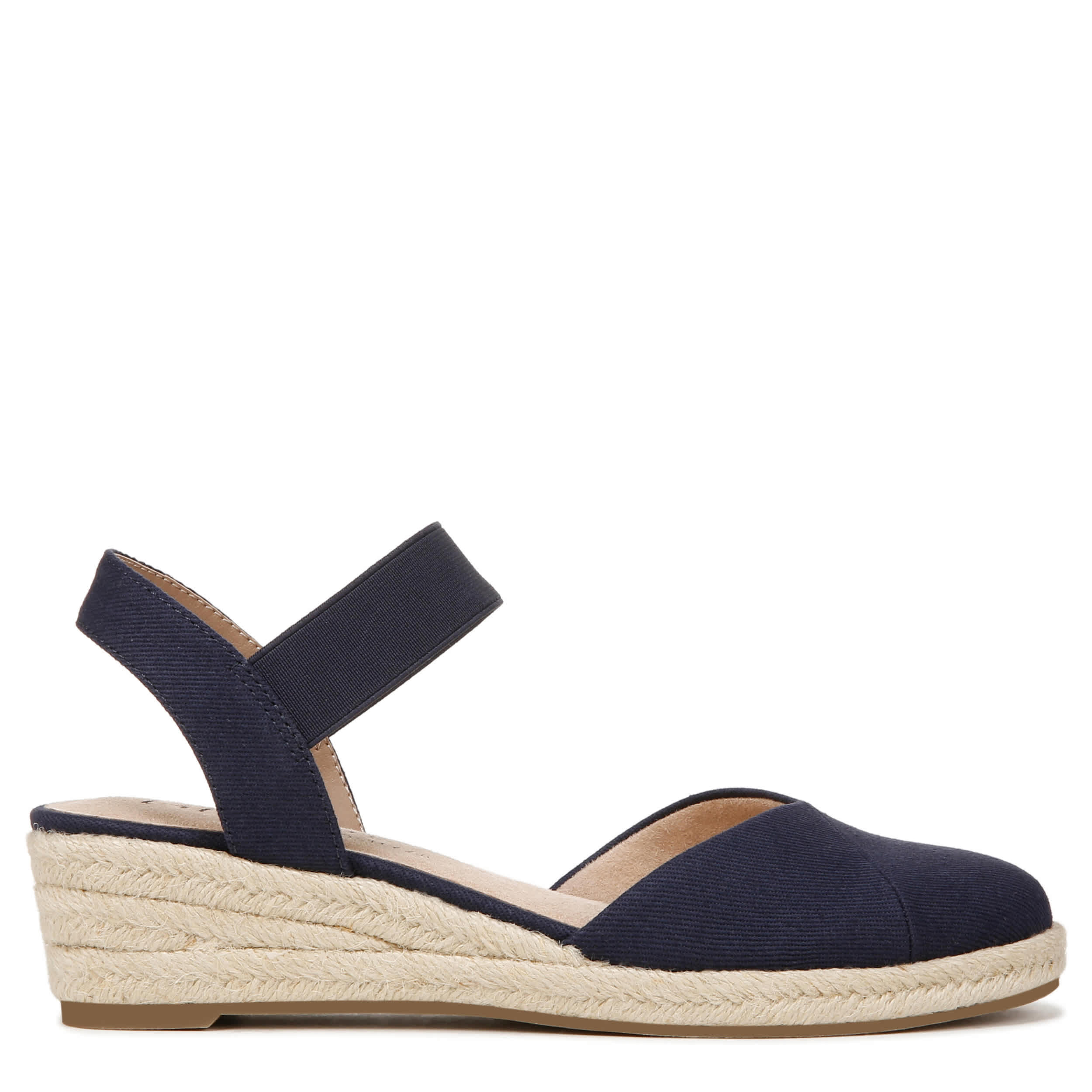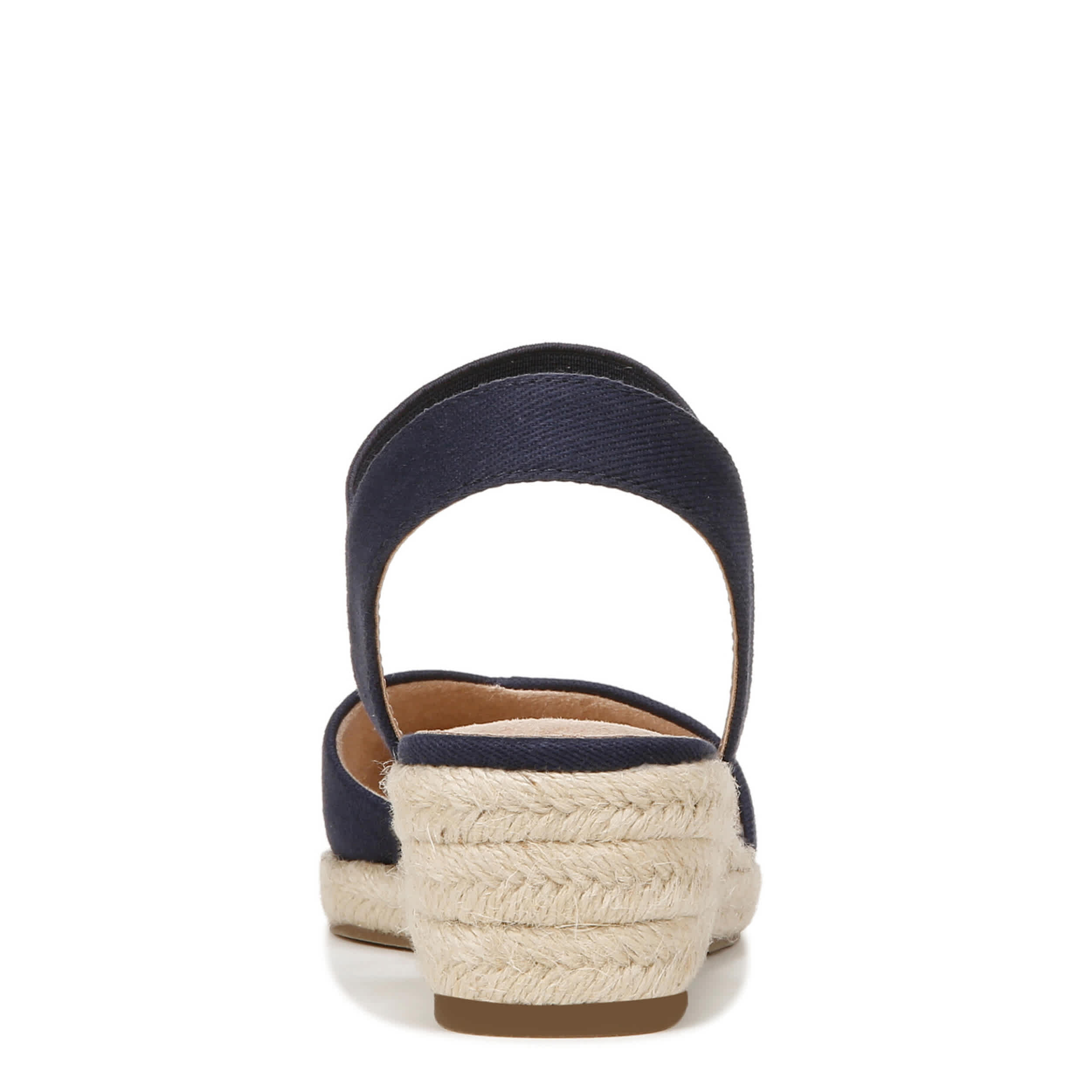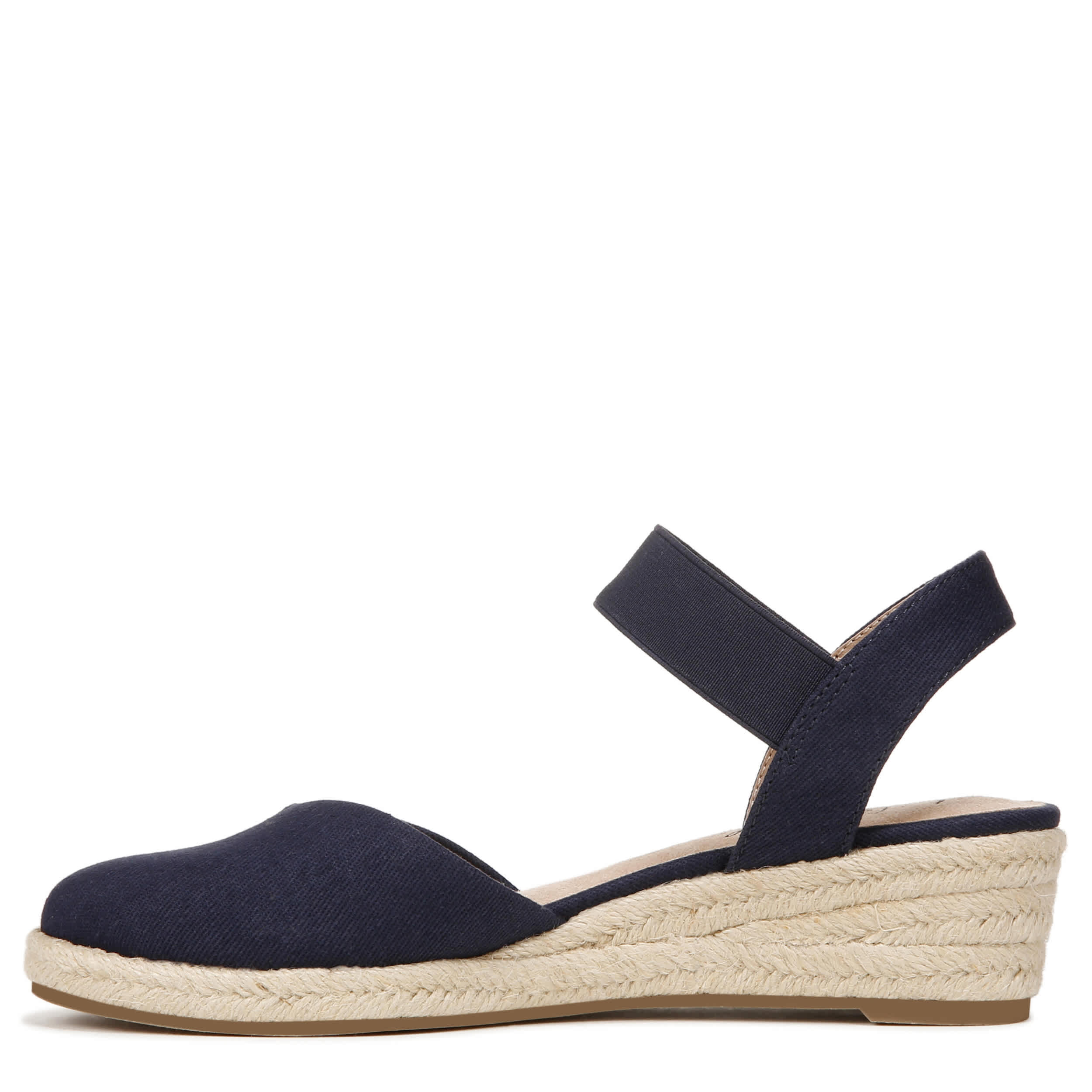 Sit cute in the Kimmie women's wedge sandal. Featuring a canvas upper with a stylish almond toe, this stretch gore sandal has everything going for it. The Soft System® comfort package & Velocity 2.0® cushioning offer premium support while the espadrille-wrapped wedge adds just enough height.