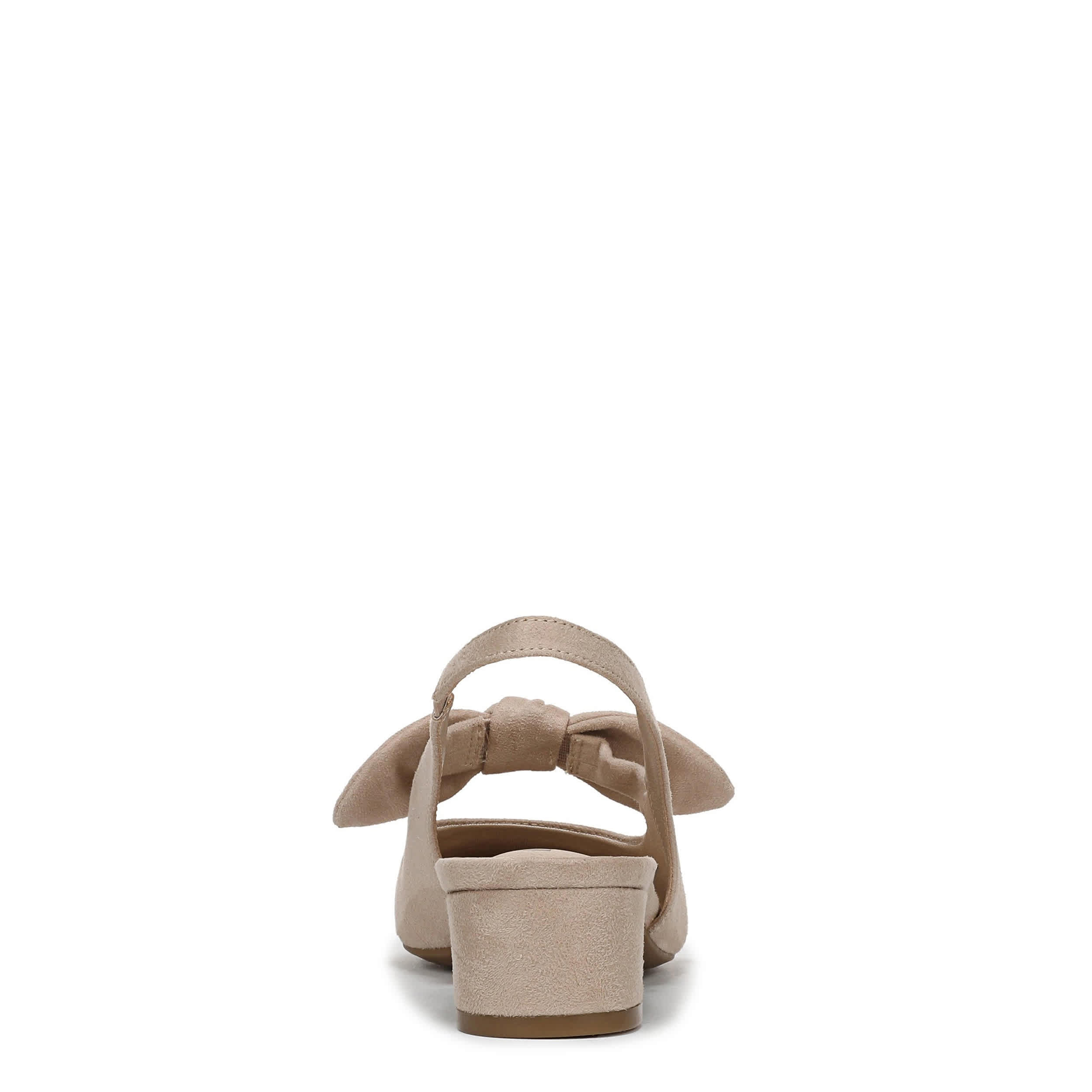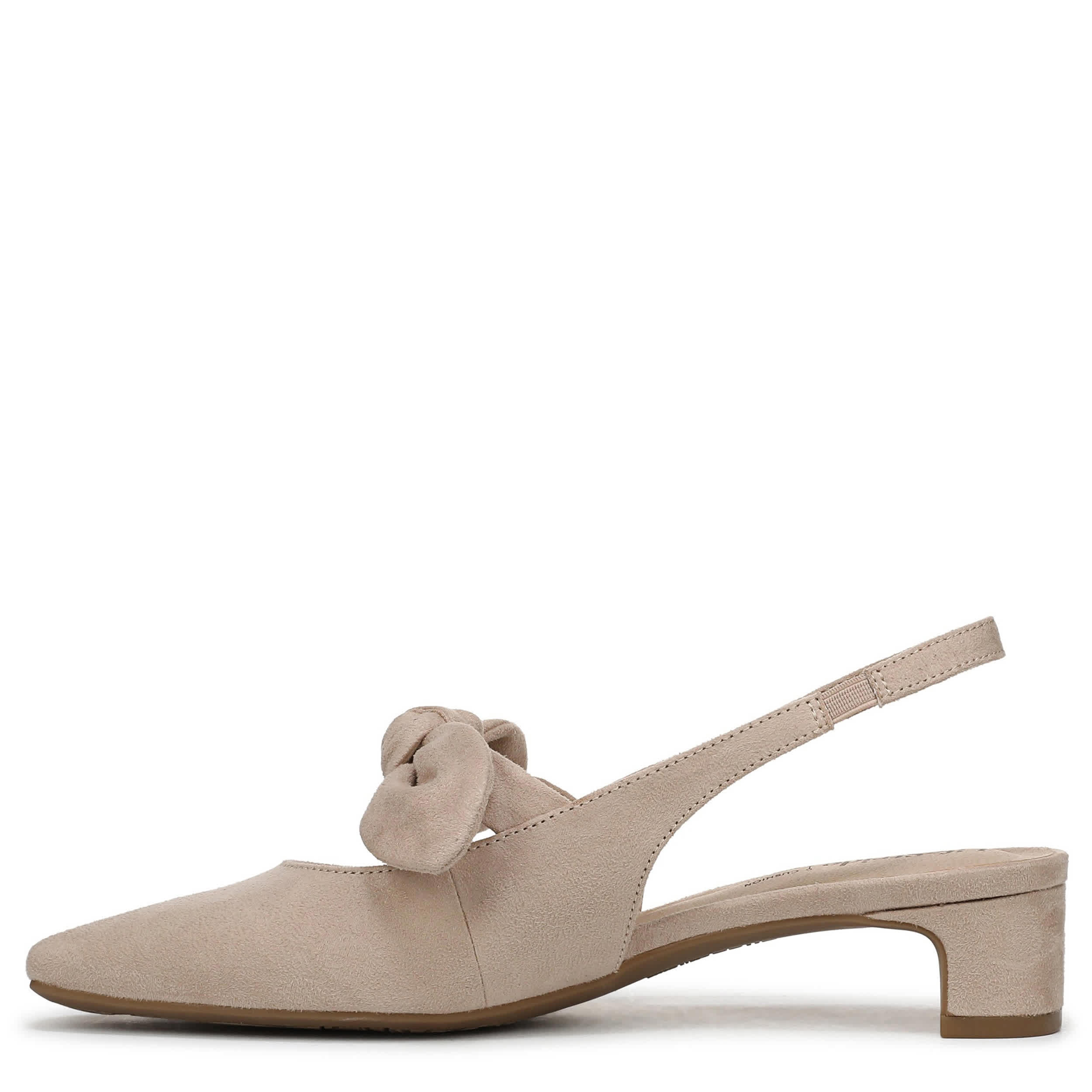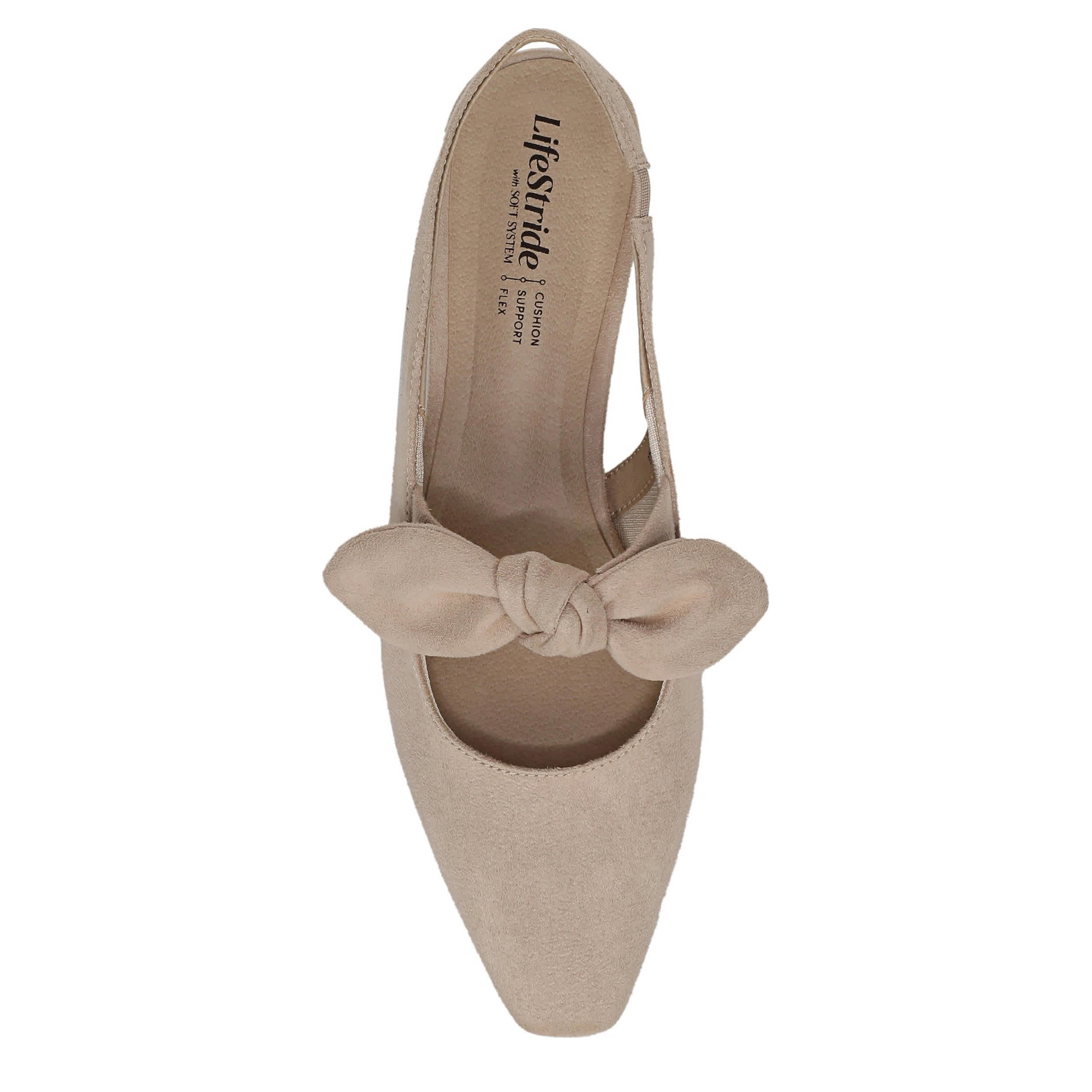 Comfort and style confidence in the LifeStride Lucia women's pump. Featuring a microsuede or faux leather upper with a knotted bow detail, this modern slingback is ready for the office or date night. The Soft System® comfort technology cushions every step, while the kitten heel adds chic lift.