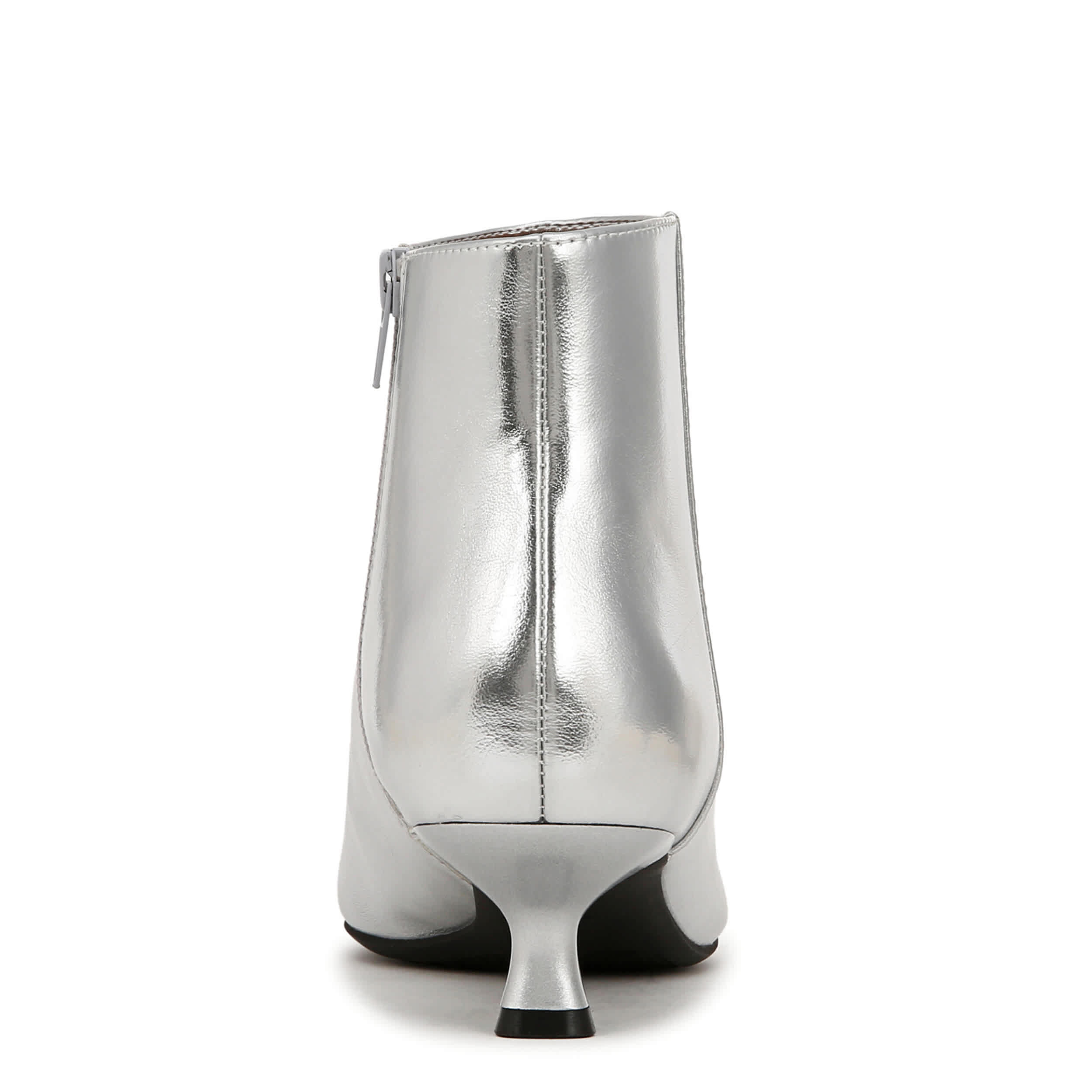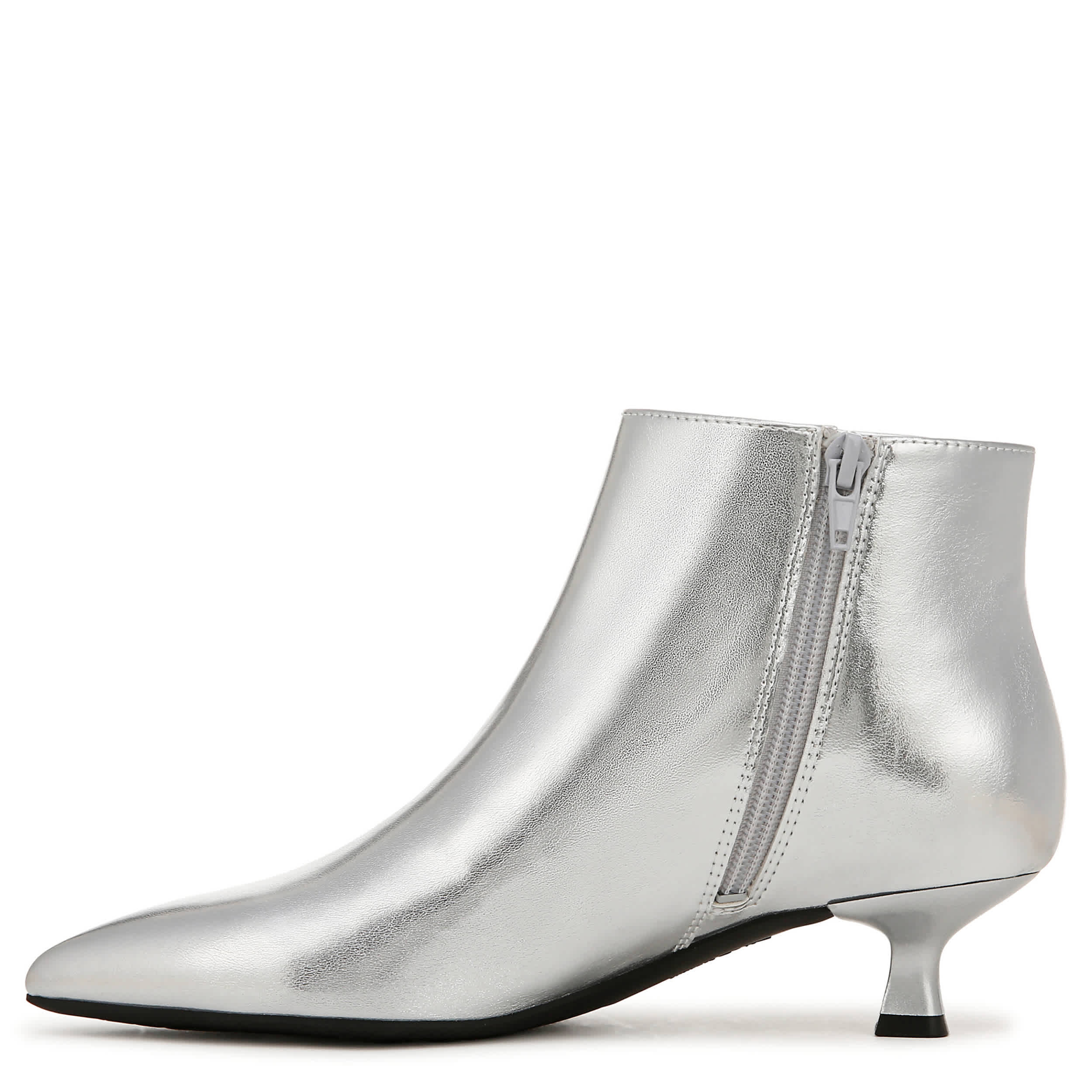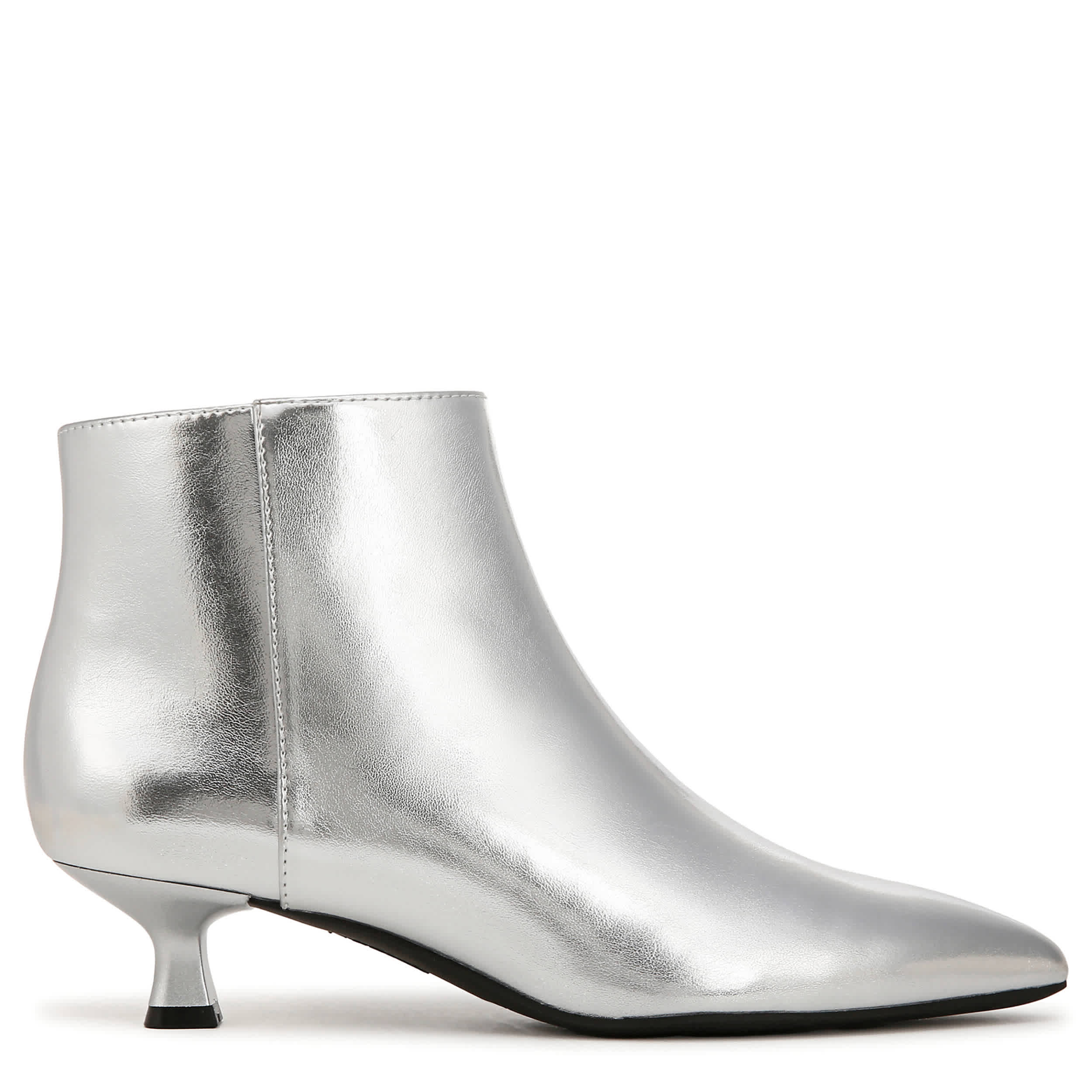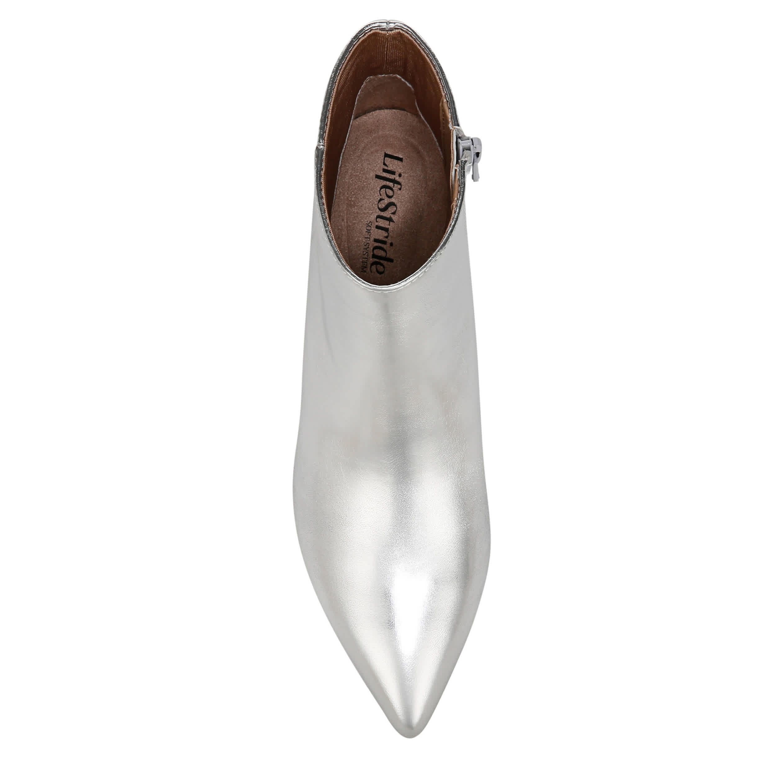 Keep it low and stylish in the Maya dress bootie from LifeStride. With a metallic faux leather upper featuring an asymmetrical topline for extra flair, this chic bootie perfectly complements your favorite fall fashions. The Soft System® comfort package provides all-day support, while the flared heel offers just enough lift.