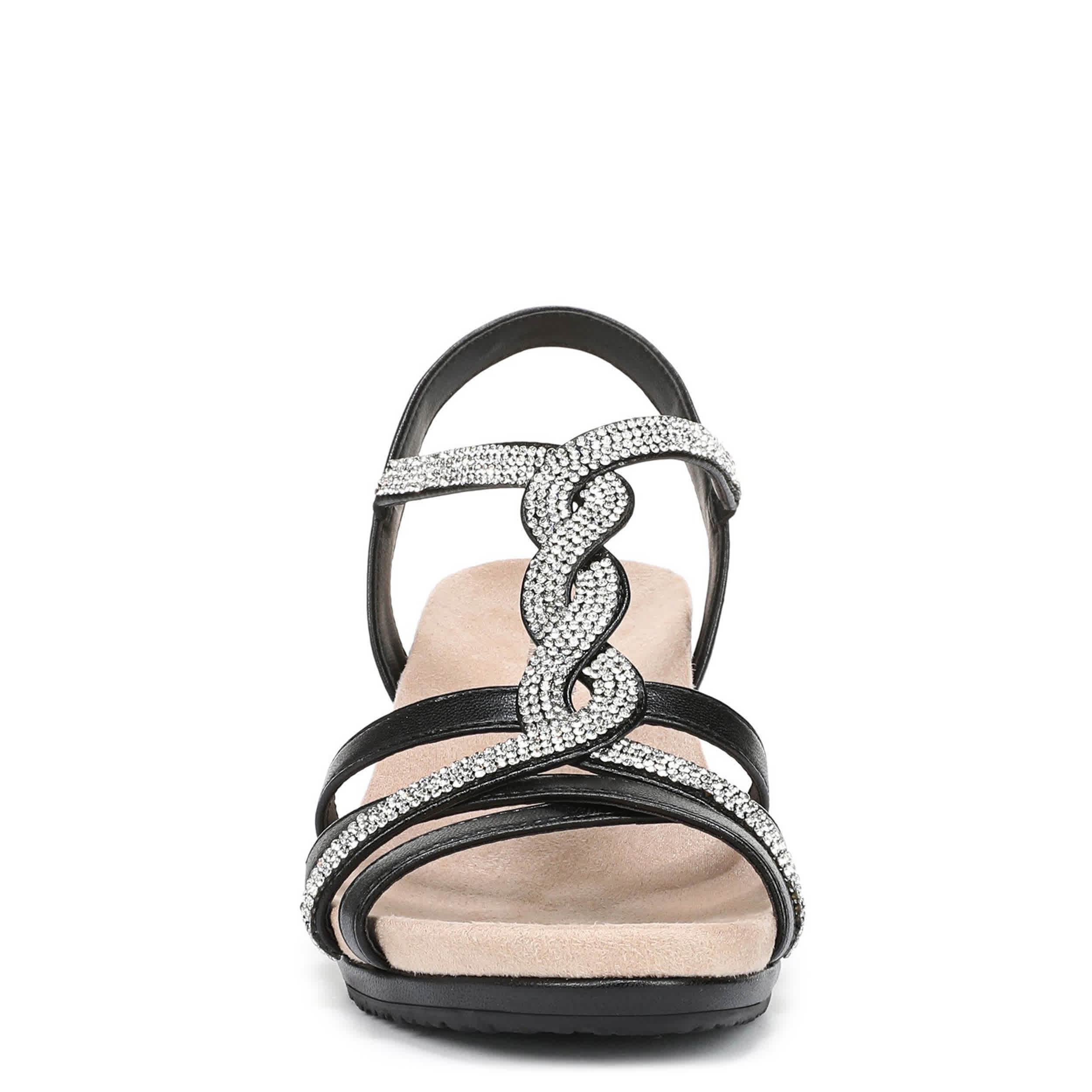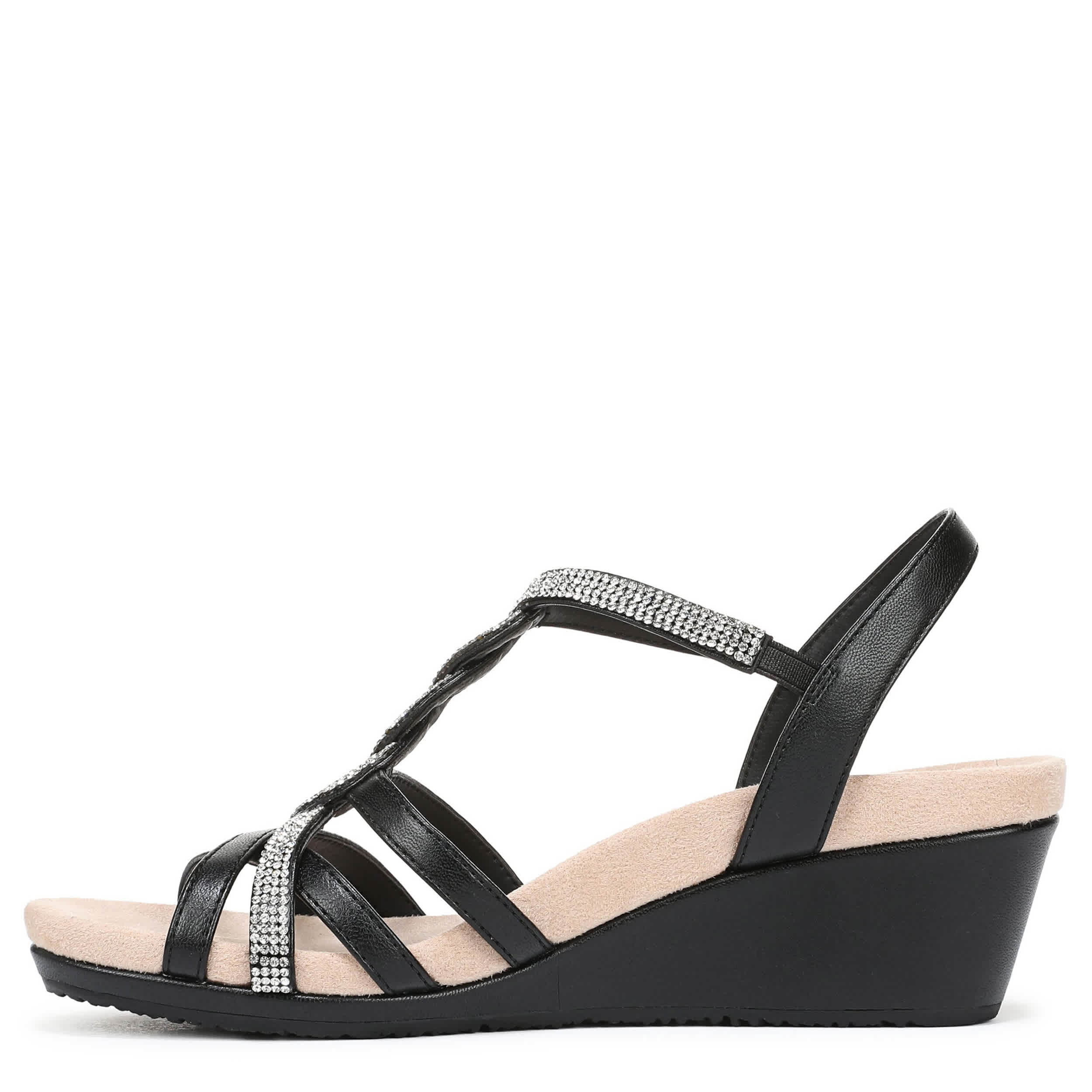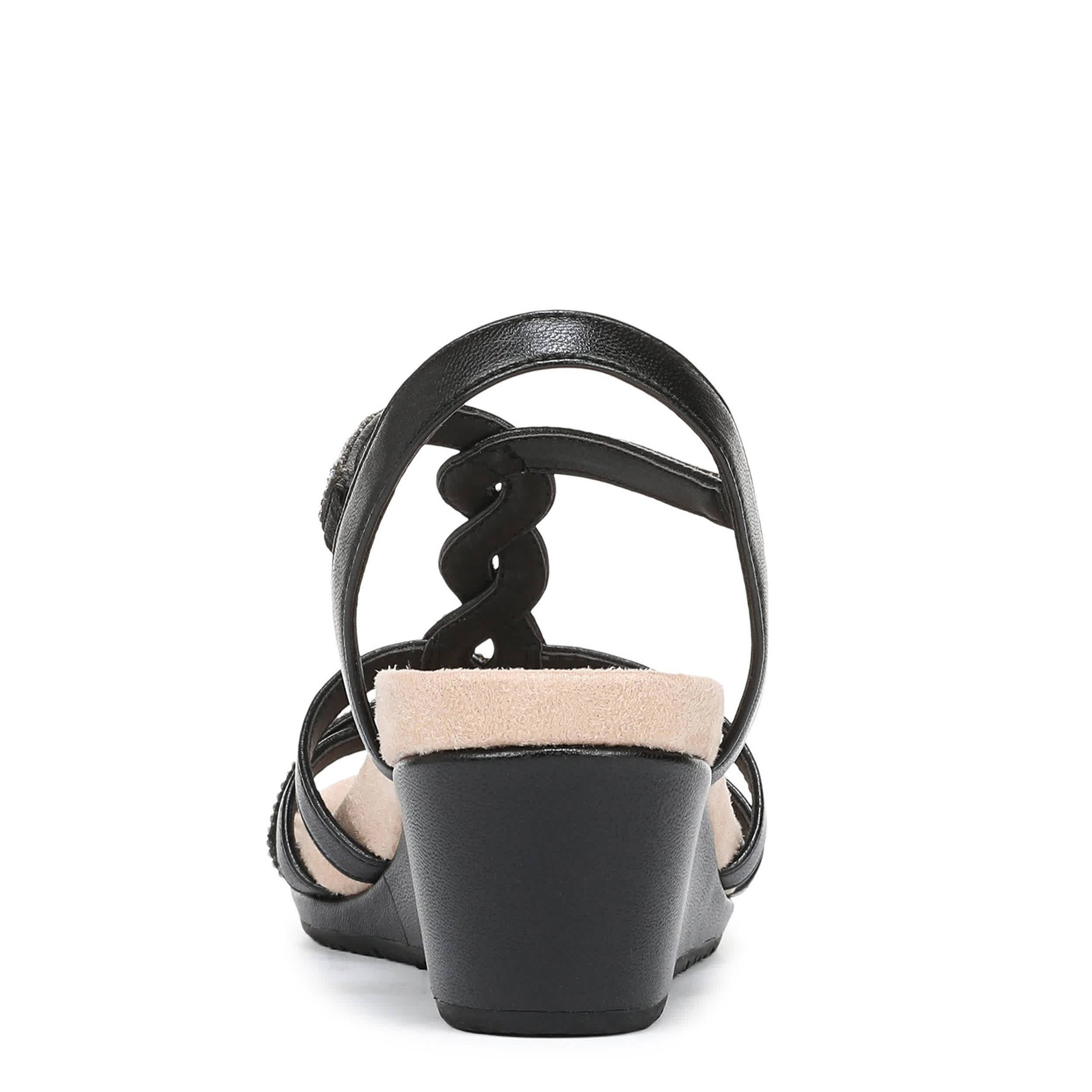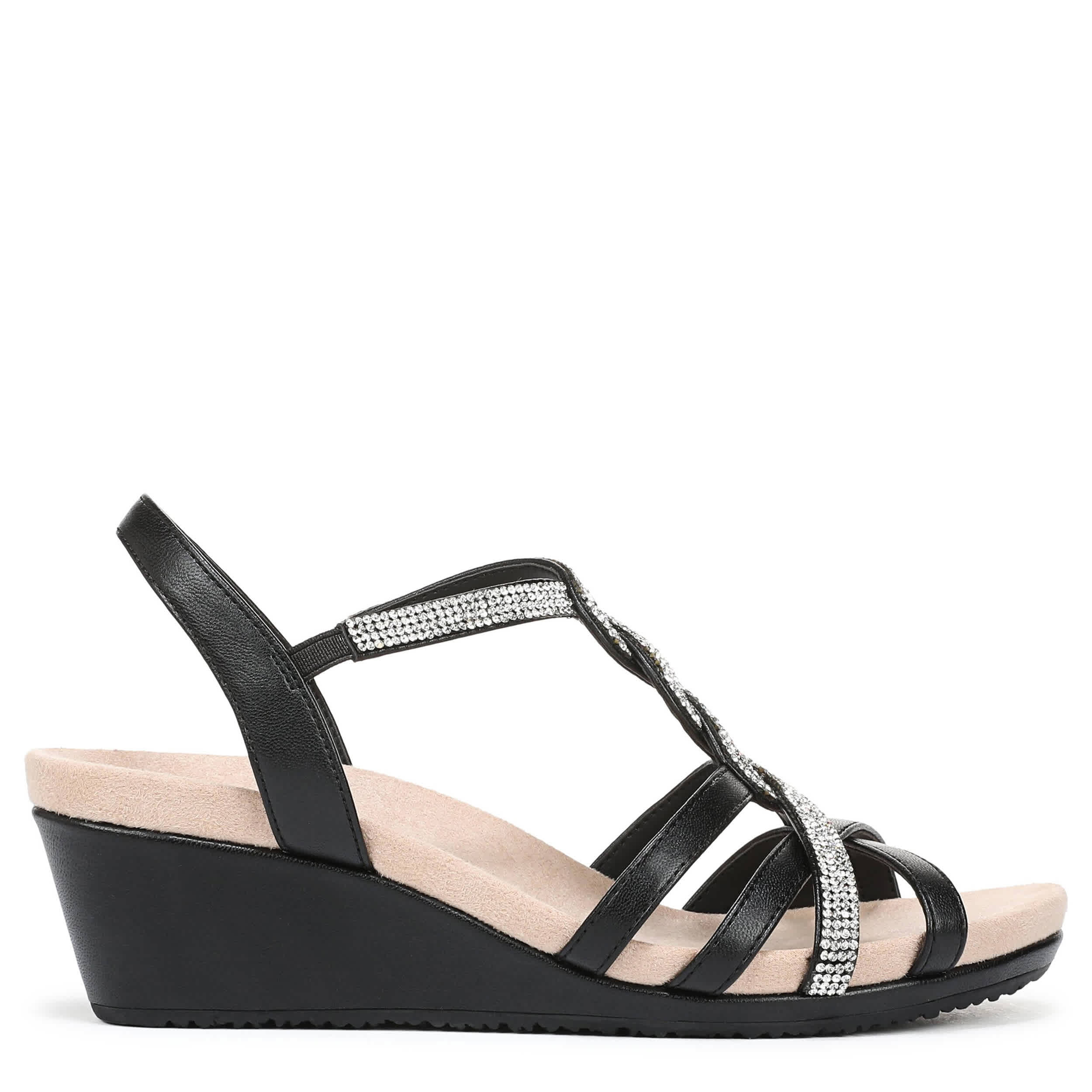 Dance the night away in the LifeStride Miami women's wedge sandal. Featuring a faux leather upper with a rhinestone overlays for glimmery style, this easy-on platform wedge is ready to step out. The Soft System® comfort stable heel adds just enough height.