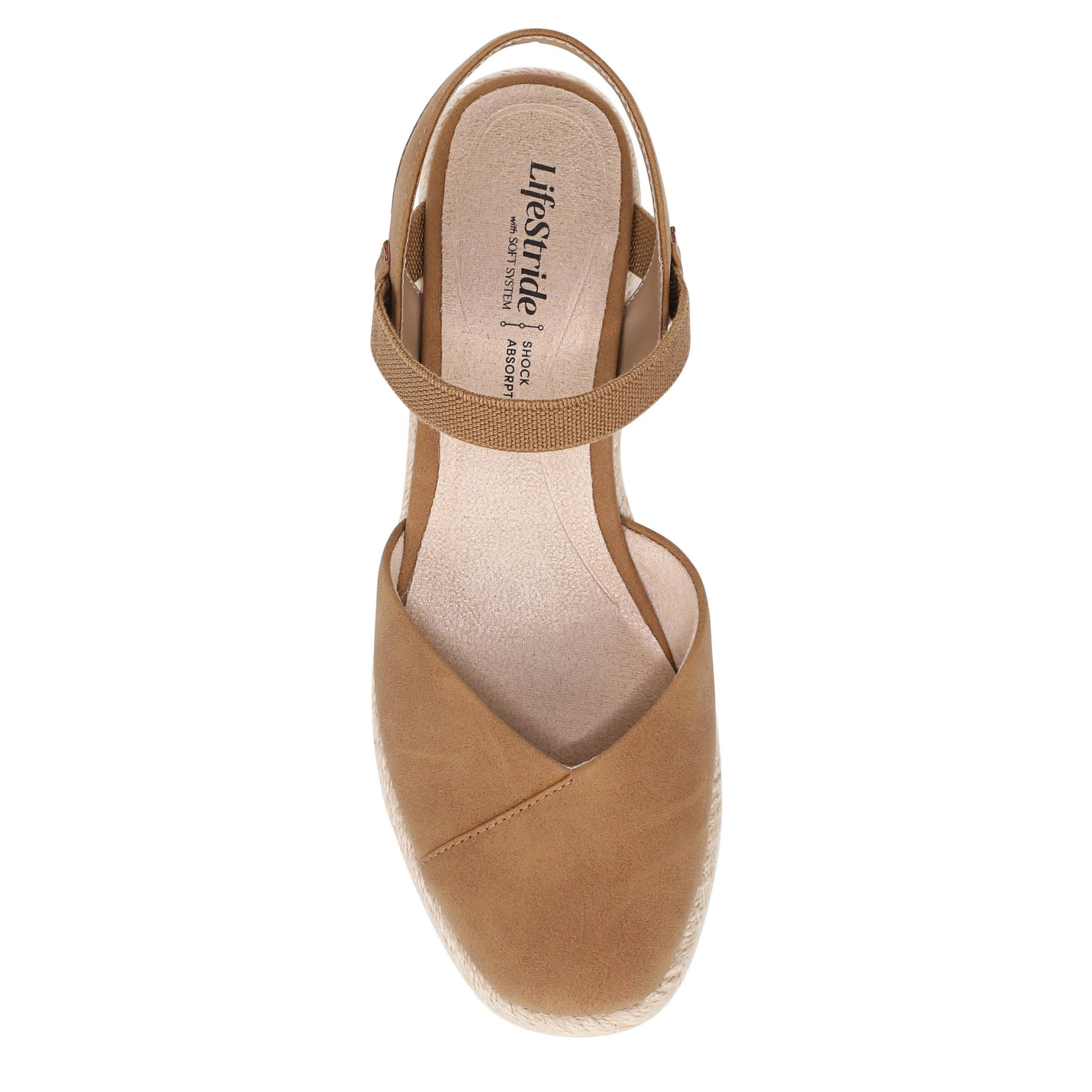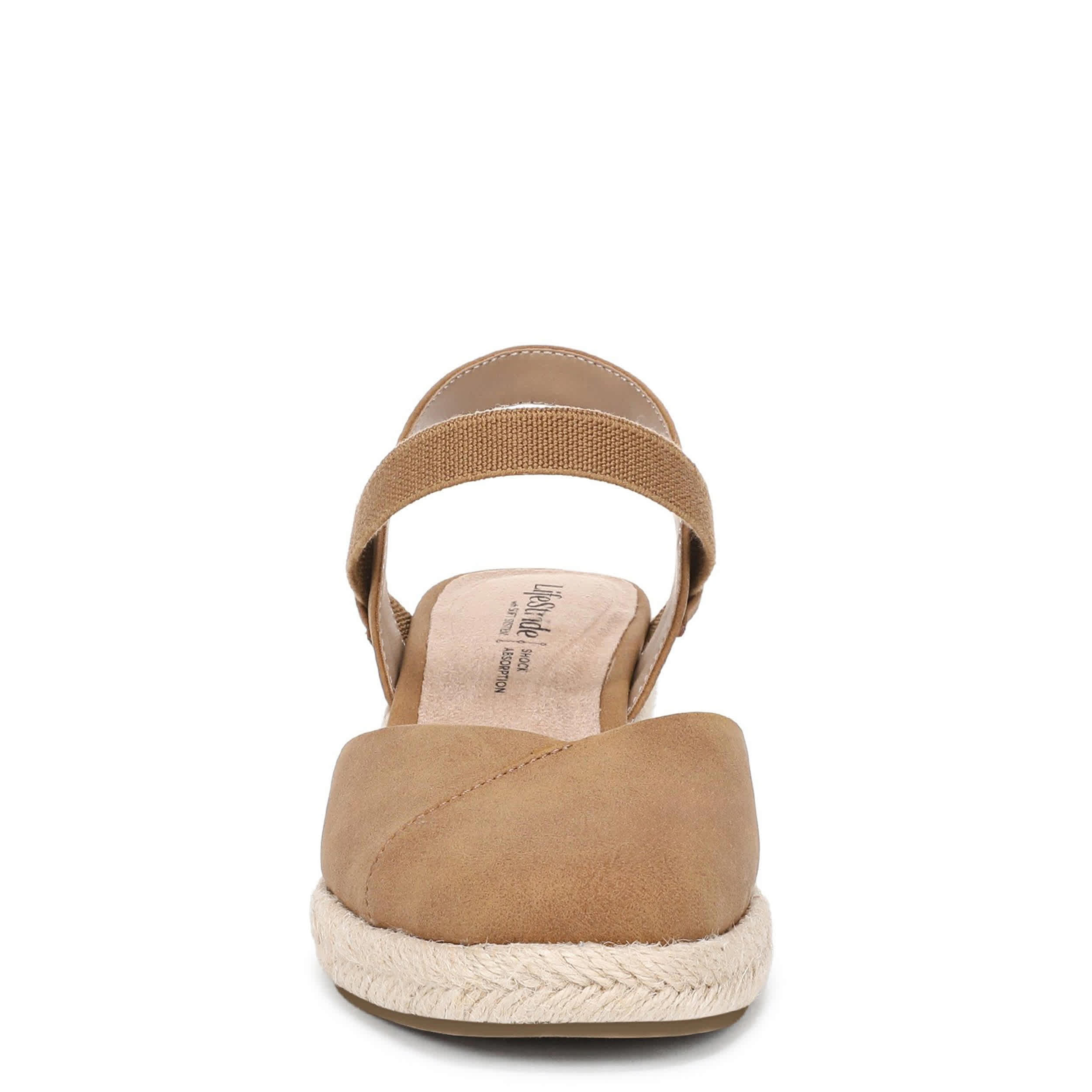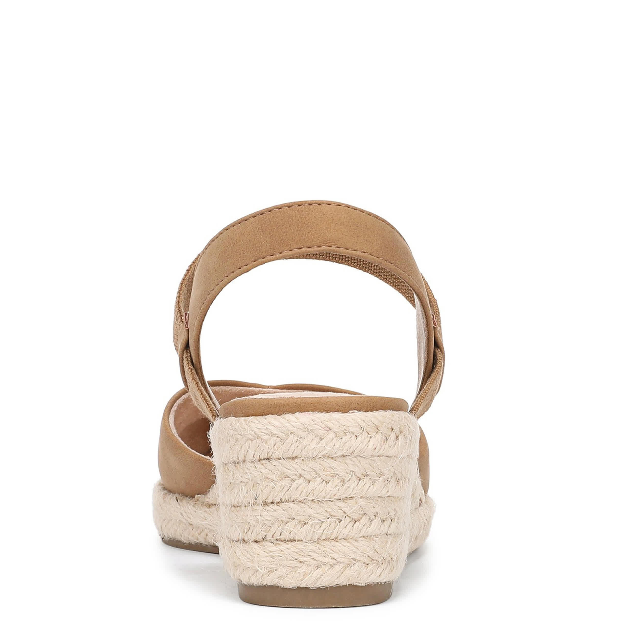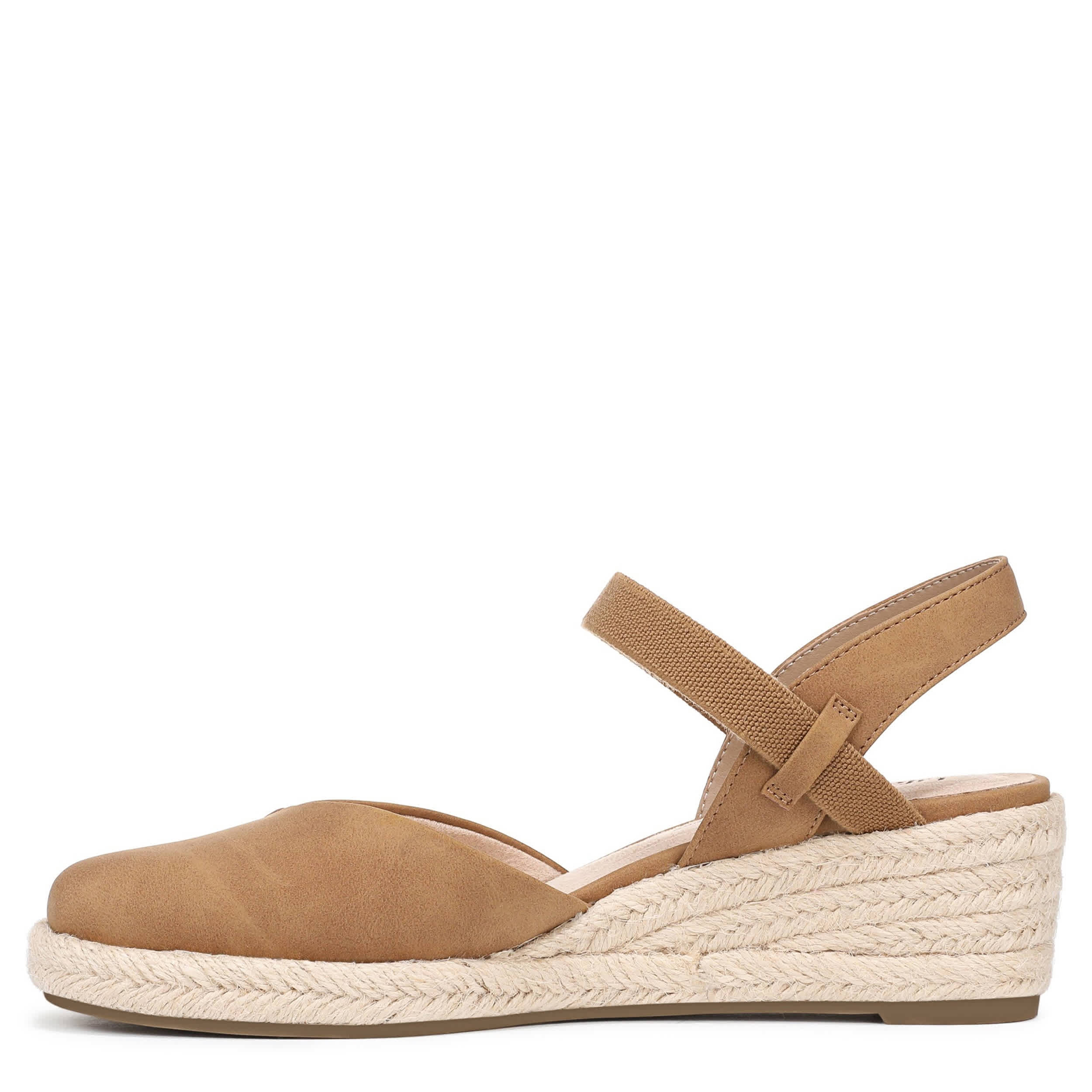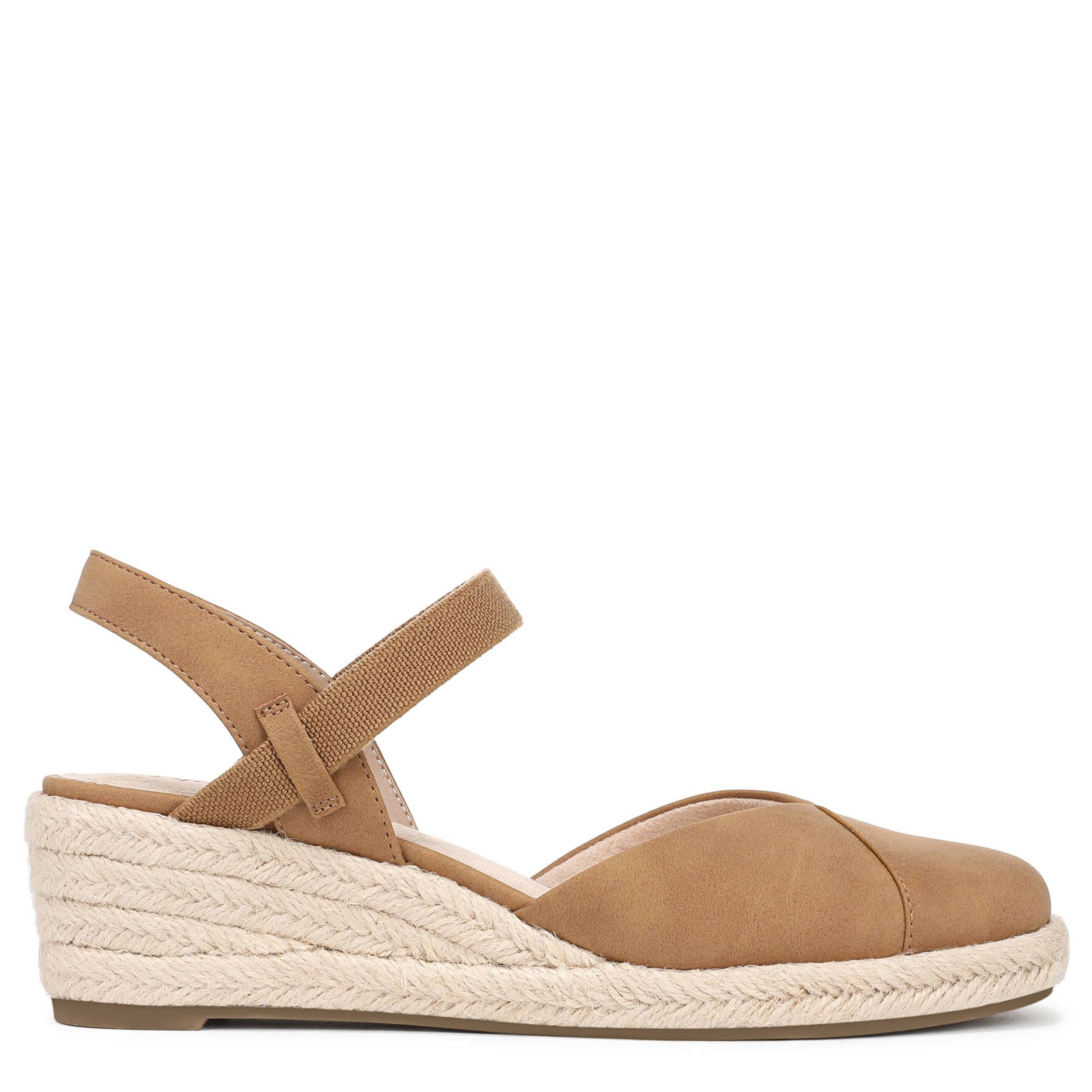 Chic style balances the Pilar Espadrille women's sandal superior support. Featuring a faux leather upper with a closed almond toe, this stretch gore sandal gives your look a modern finish. The Soft System® comfort technology offers flexible cushioning, while the jute-wrapped wedge adds just enough height.