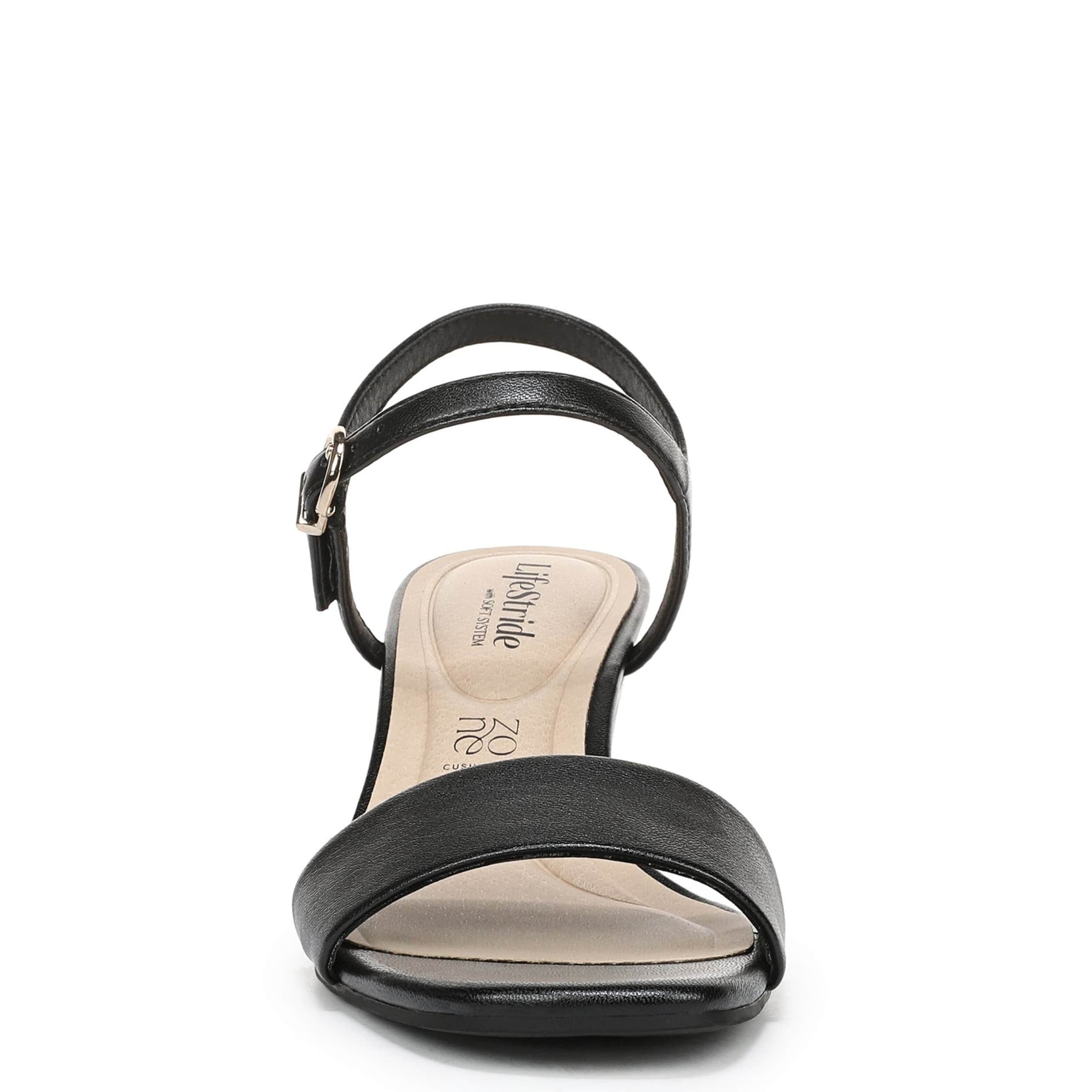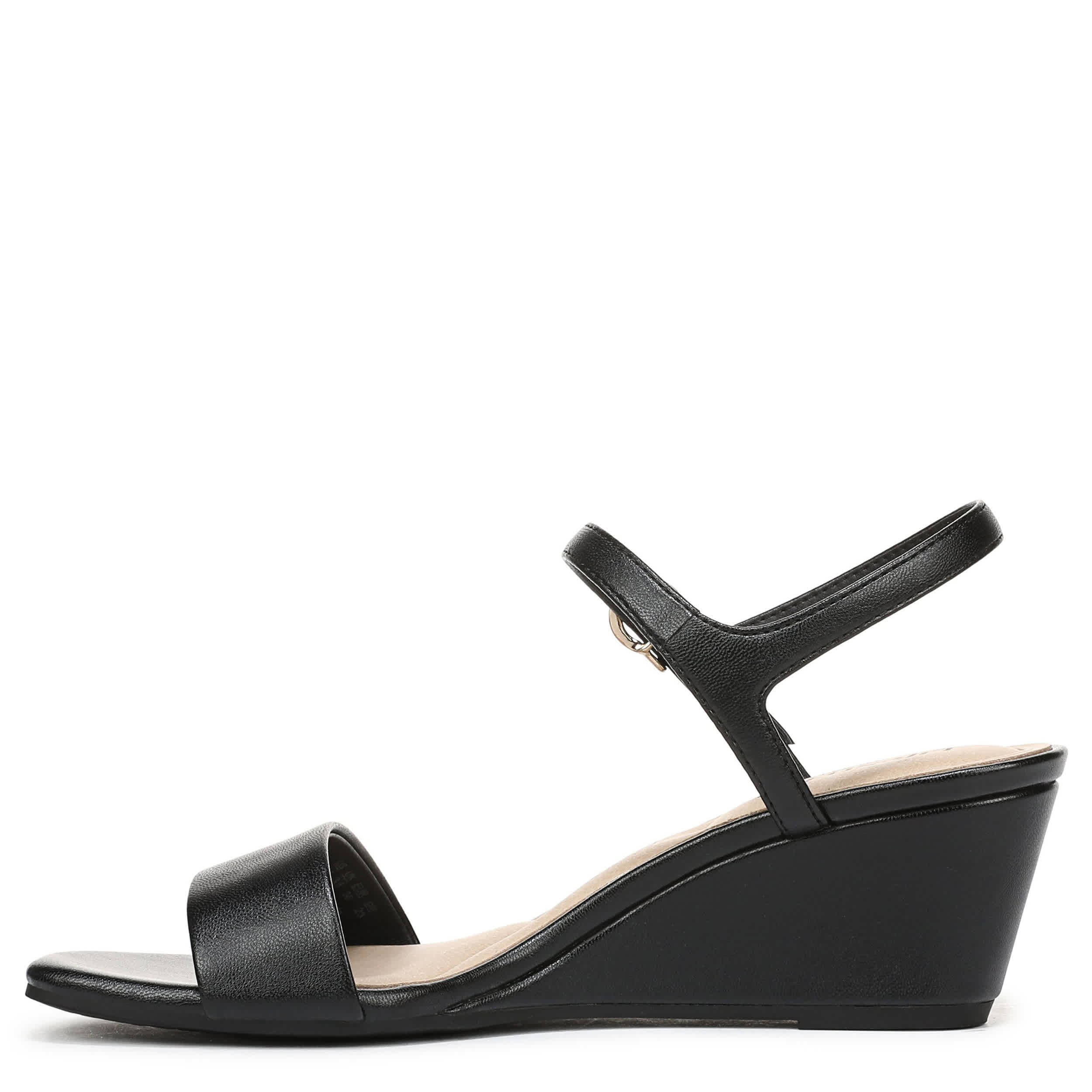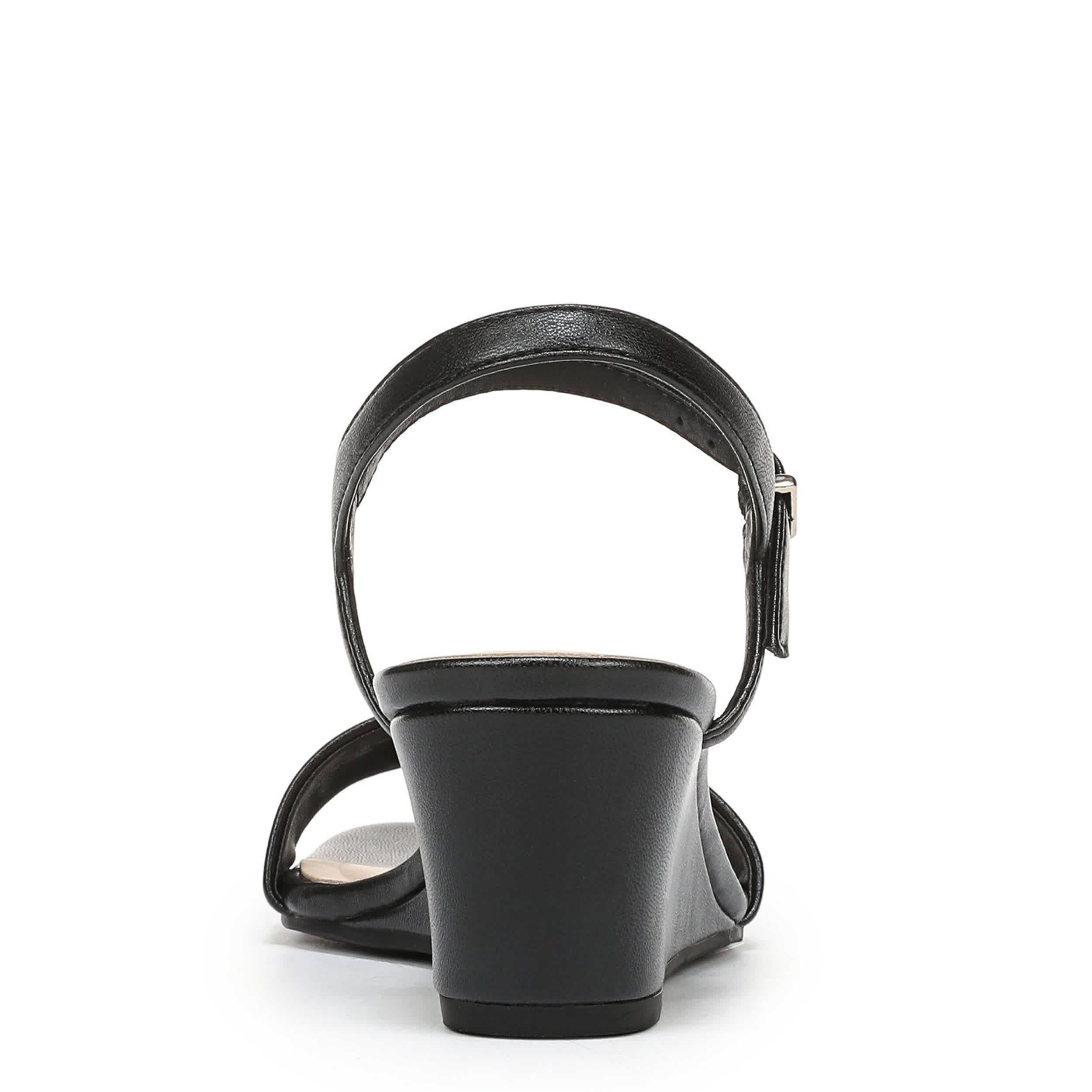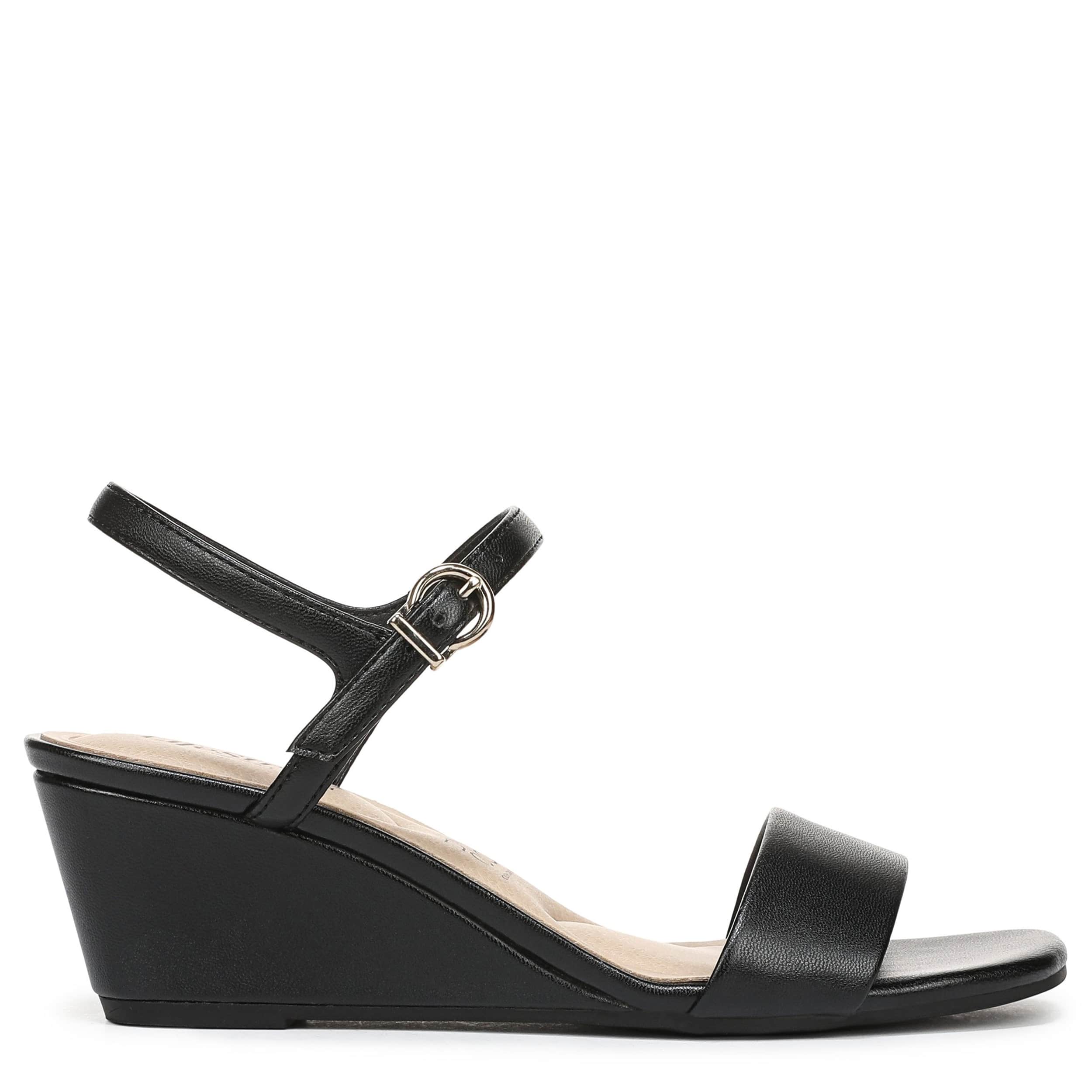 Instant refresh with the LifeStride Sawyer wedge sandal. Featuring a faux leather upper with a single wide strap for a minimalist design, this elegant wedge can be dressed up or accessorize your work outfit. Targeted cushioning with Soft System® flexibility supports where you need it most, while the traction sole stabilizes the low heel.