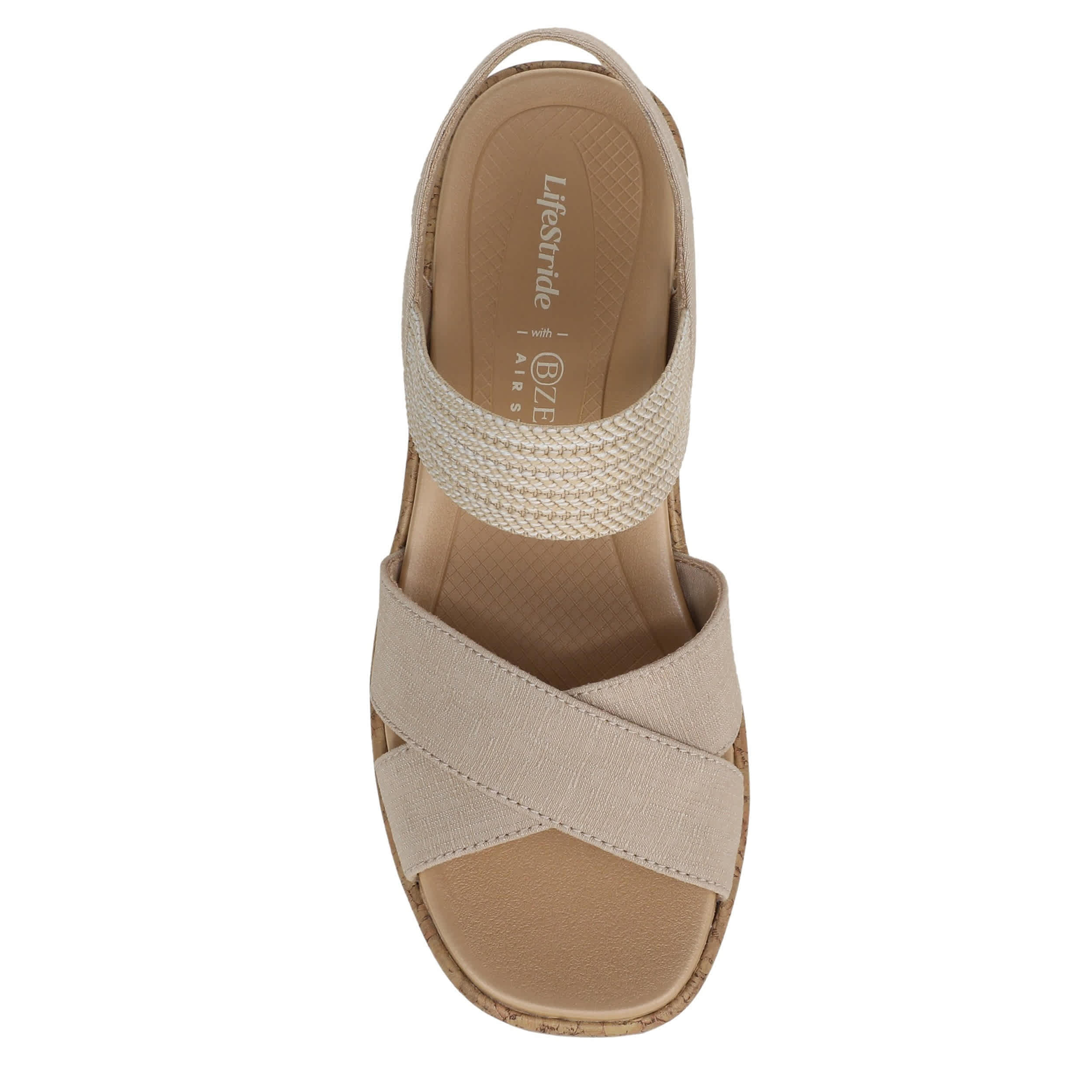 Slip into the Verify women's wedge sandal from LifeStride. Featuring a stretch fabric upper with crisscross straps and Anti-Odor Control technology for freshness, this cork-textured sandal is ultra lightweight and machine washable. The FreeFoamâ„¢ Comfort and cushy arch support cradle your foot, while the BZEES Air Step Technology ensures a weightless, energized feeling.