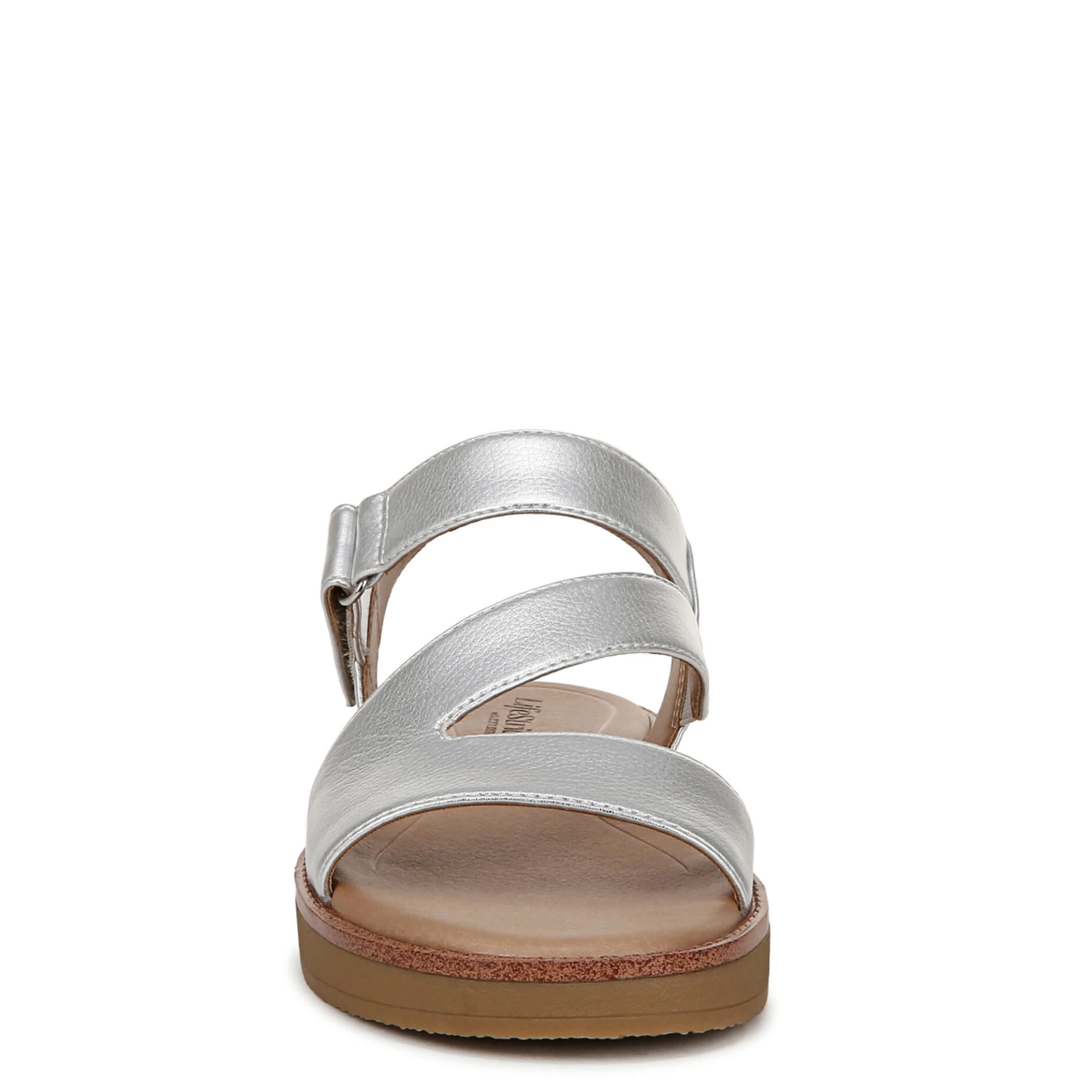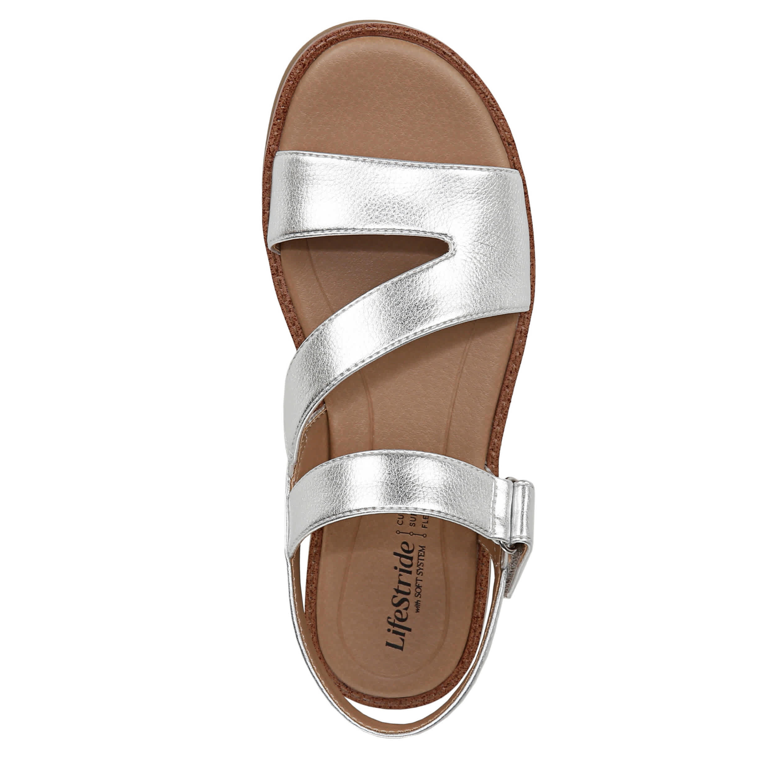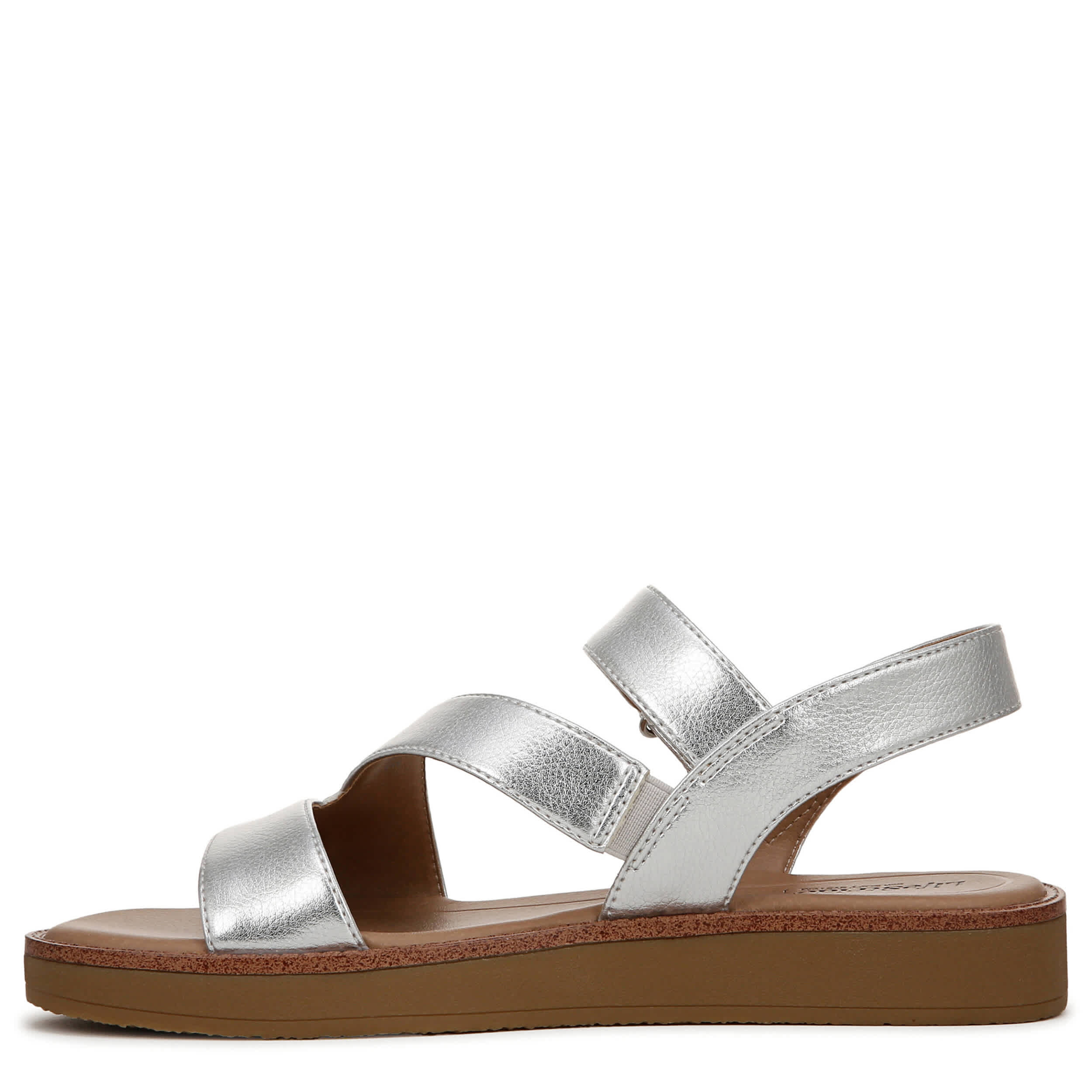 Step into fresh style with the Waverly sandal from LifeStride. Featuring a metallic faux leather upper with built-in stretch for a secure fit, this platform sandal has a stylish asymmetrical design. The Soft System® comfort technology cushions every step, while the chunky sole adds lift and stability.