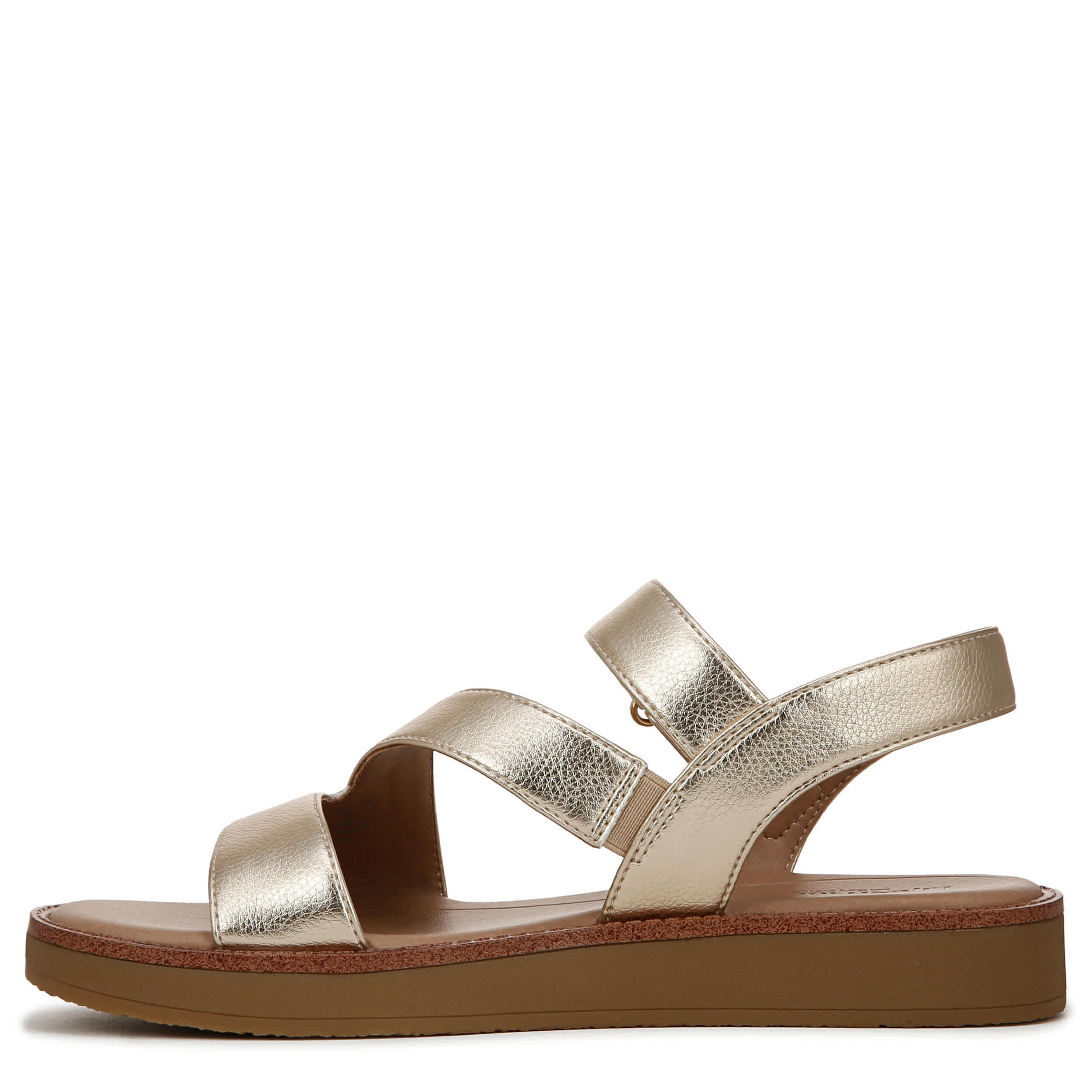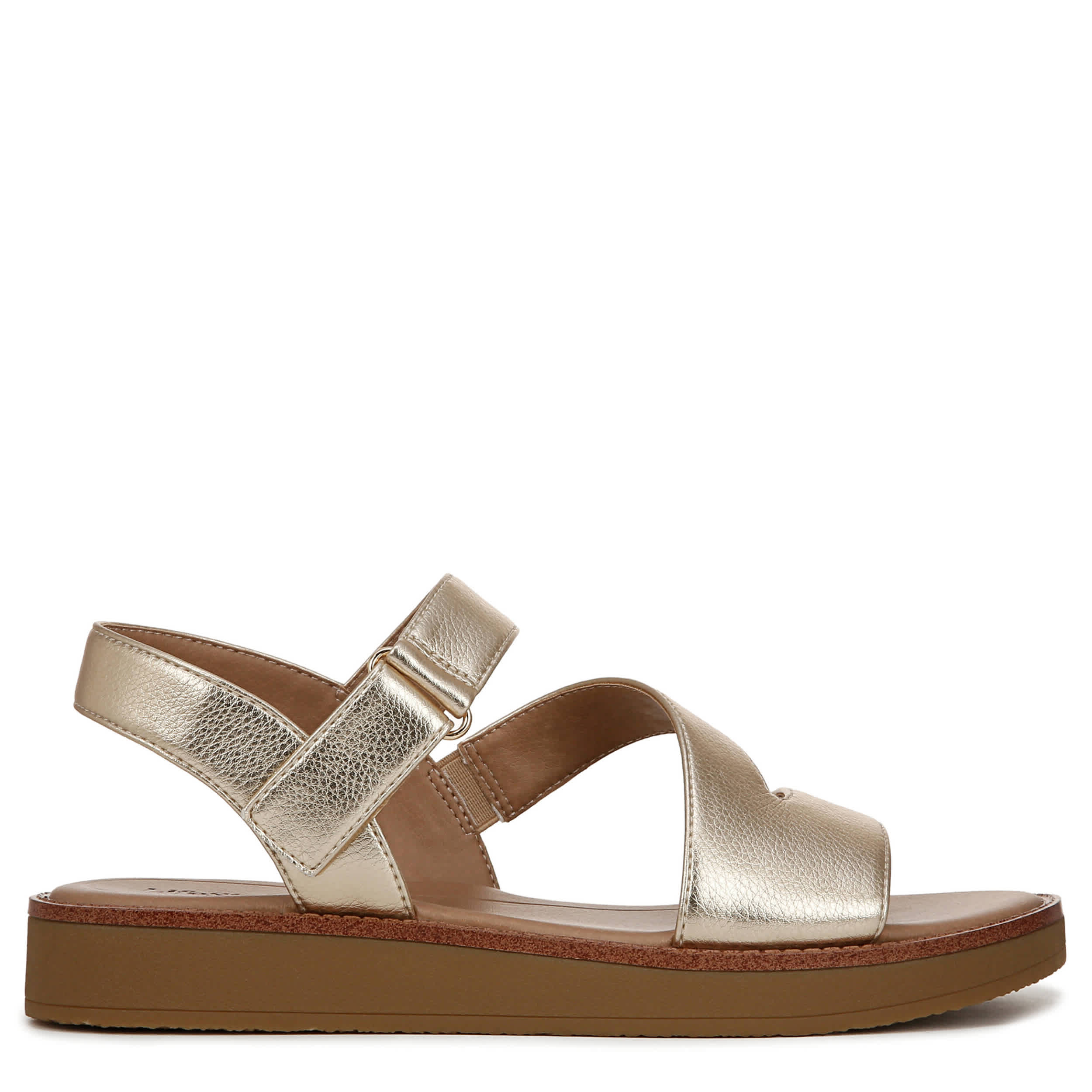 Step into fresh style with the Waverly sandal from LifeStride. Featuring a metallic faux leather upper with built-in stretch for a secure fit, this platform sandal has a stylish asymmetrical design. The Soft System® comfort technology cushions every step, while the chunky sole adds lift and stability.