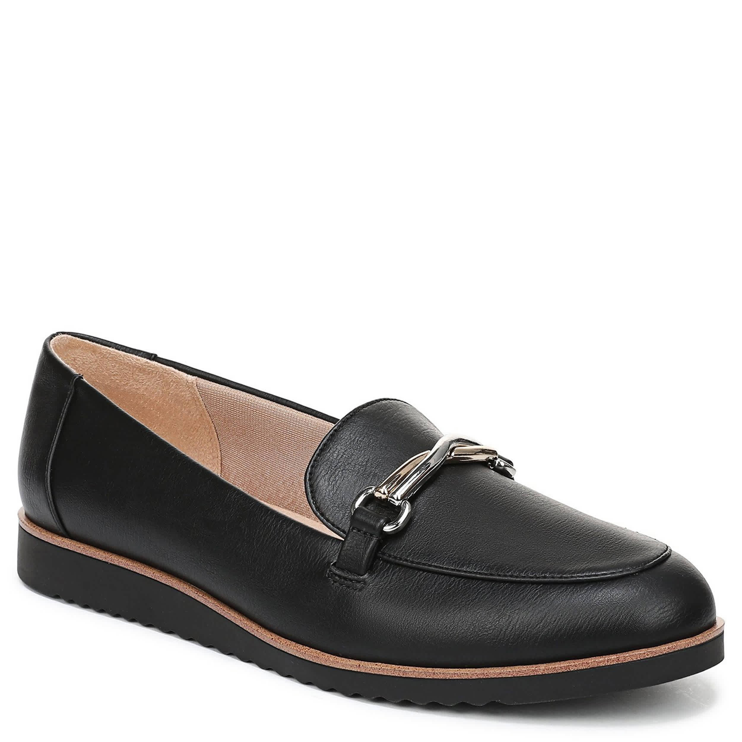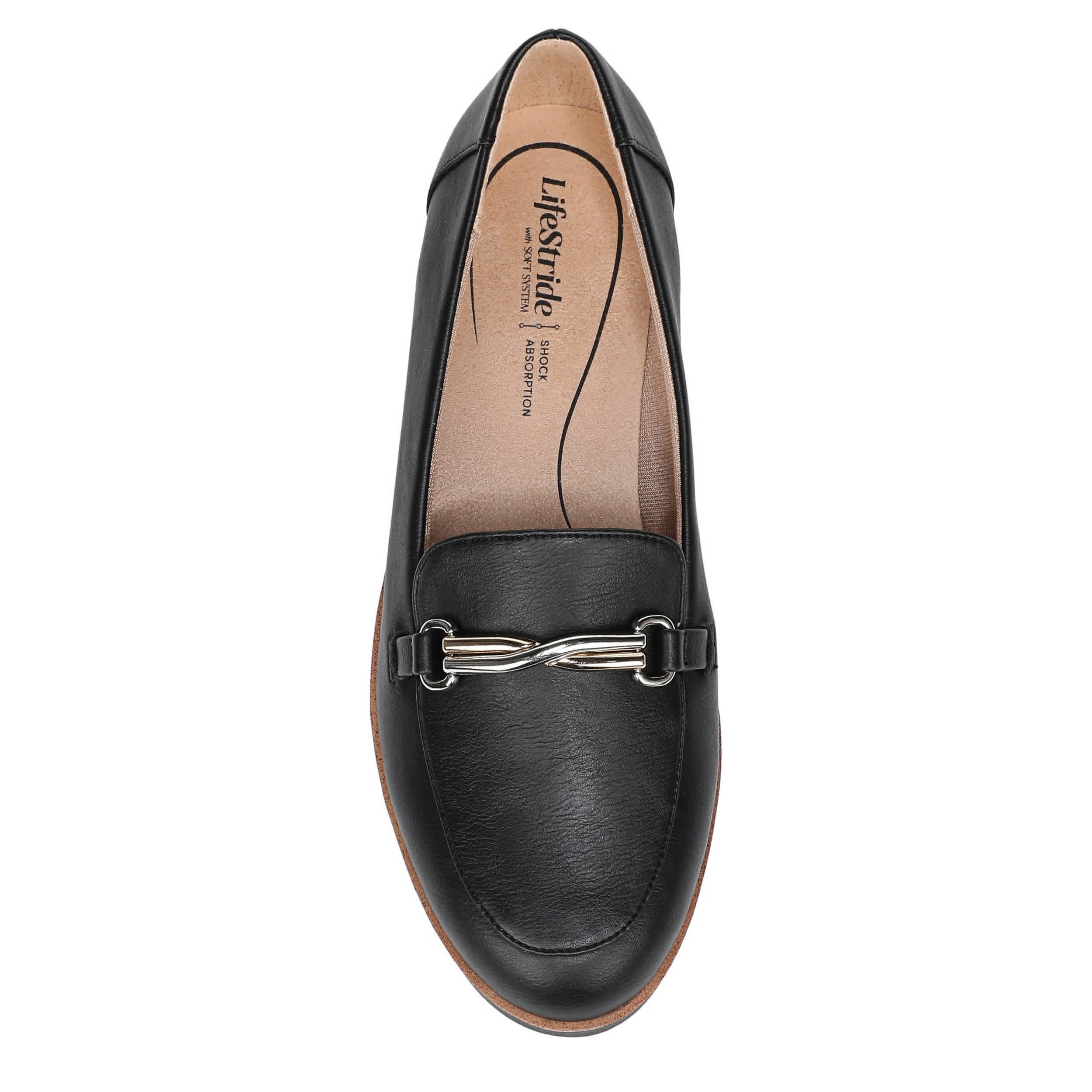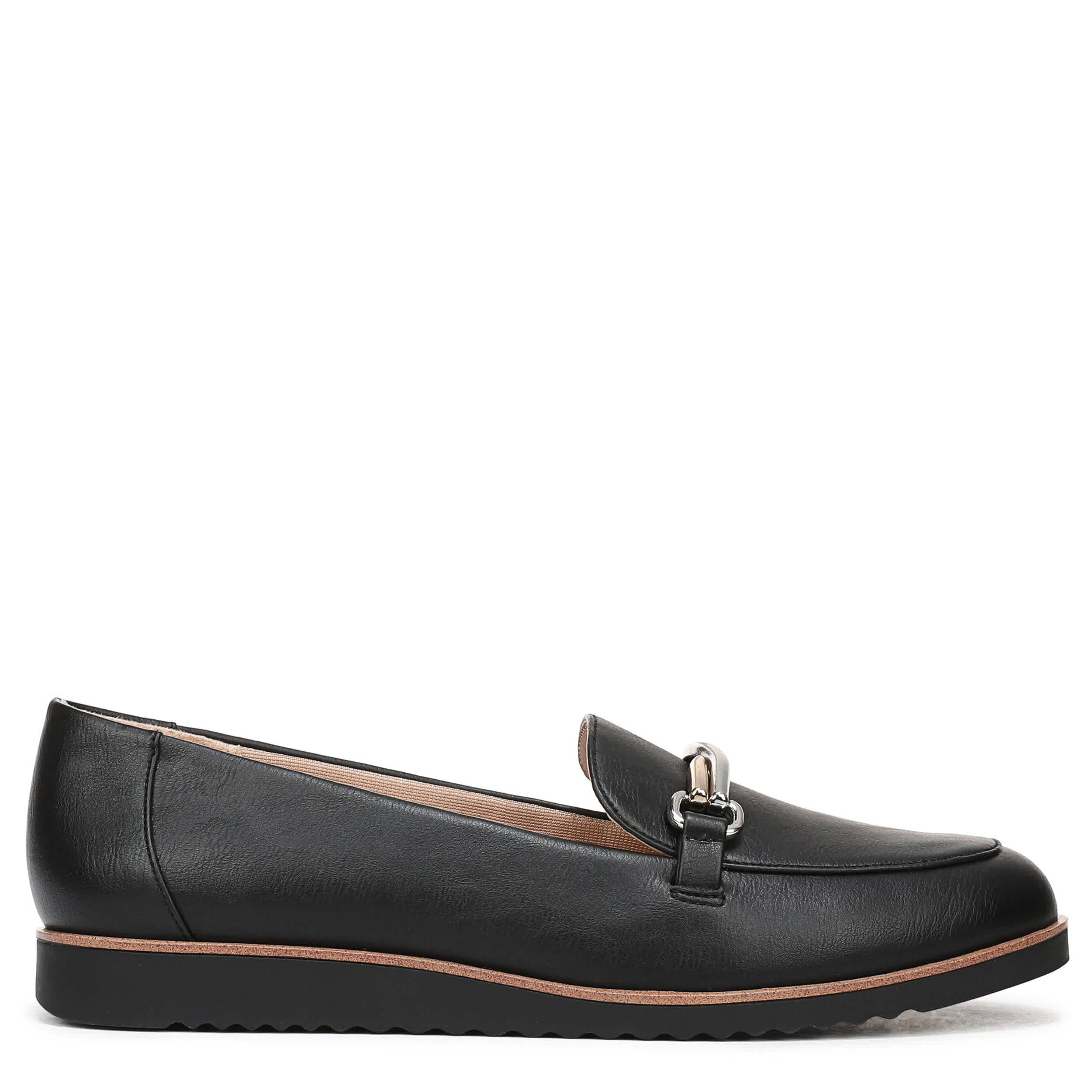 Make your style feel just as effortless as it looks in the Zeeland women's loafer from LifeStride. Featuring a faux leather upper with an edgy metal accent across the vamp, this almond-toed loafer also has a textured sole. The Soft System® comfort technology provides shock absorption with pressure distribution on the subtle heel.