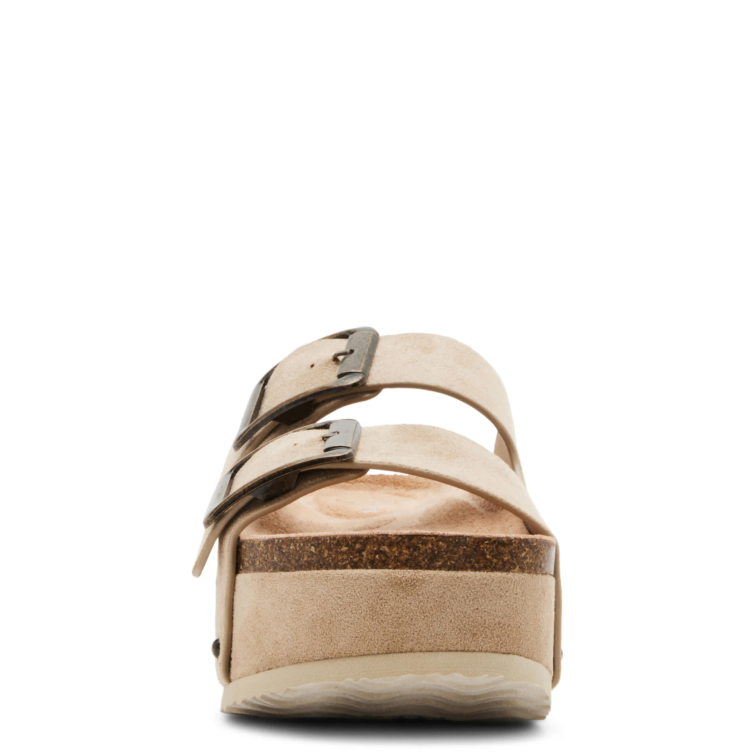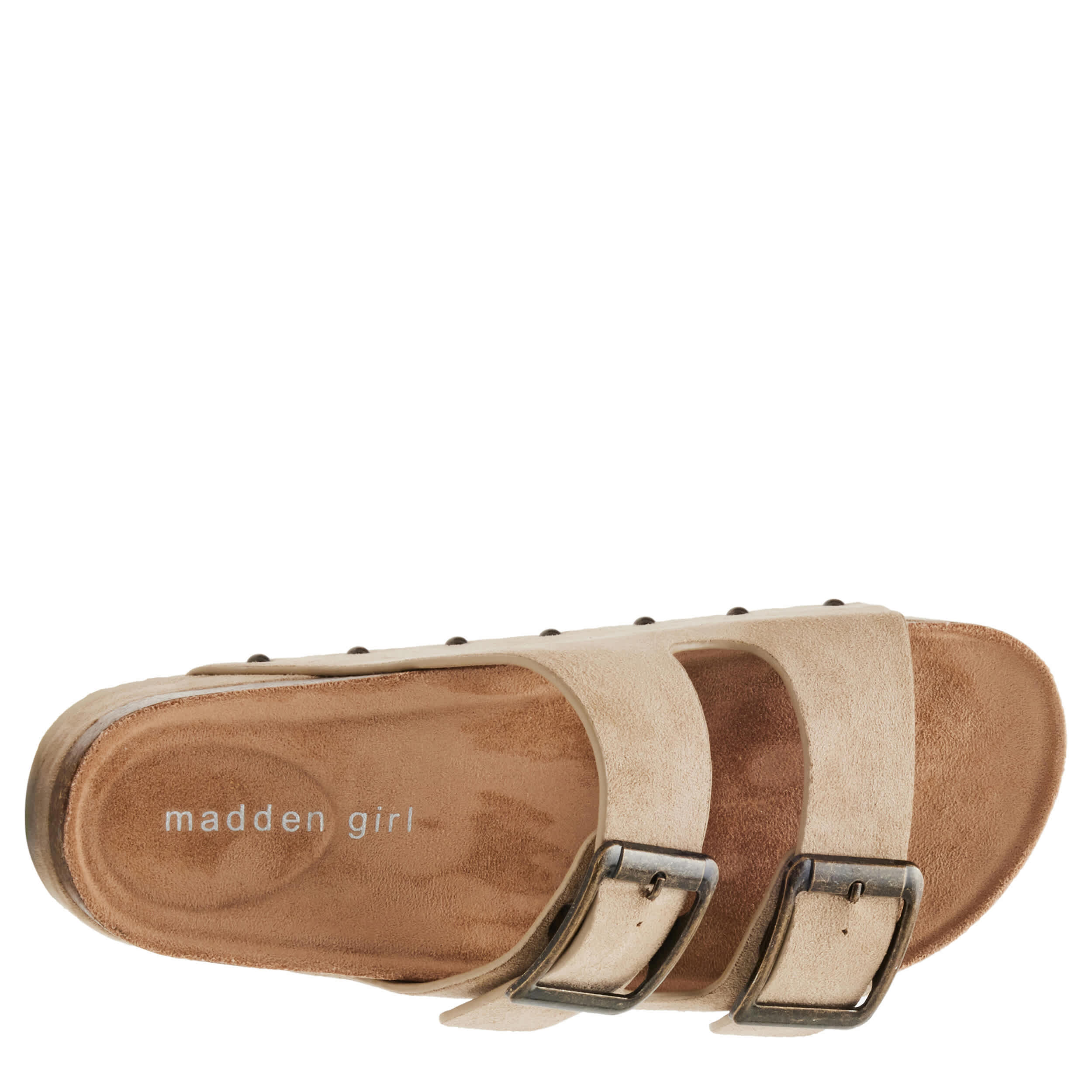 Cover all your style bases in the Babes women's sandal from madden girl. Featuring a faux suede upper with large buckled straps for extra flair, this studded platform sandal is anything, but subtle. The lined footbed cradles your foot, while the covered platform adds style and just enough lift.