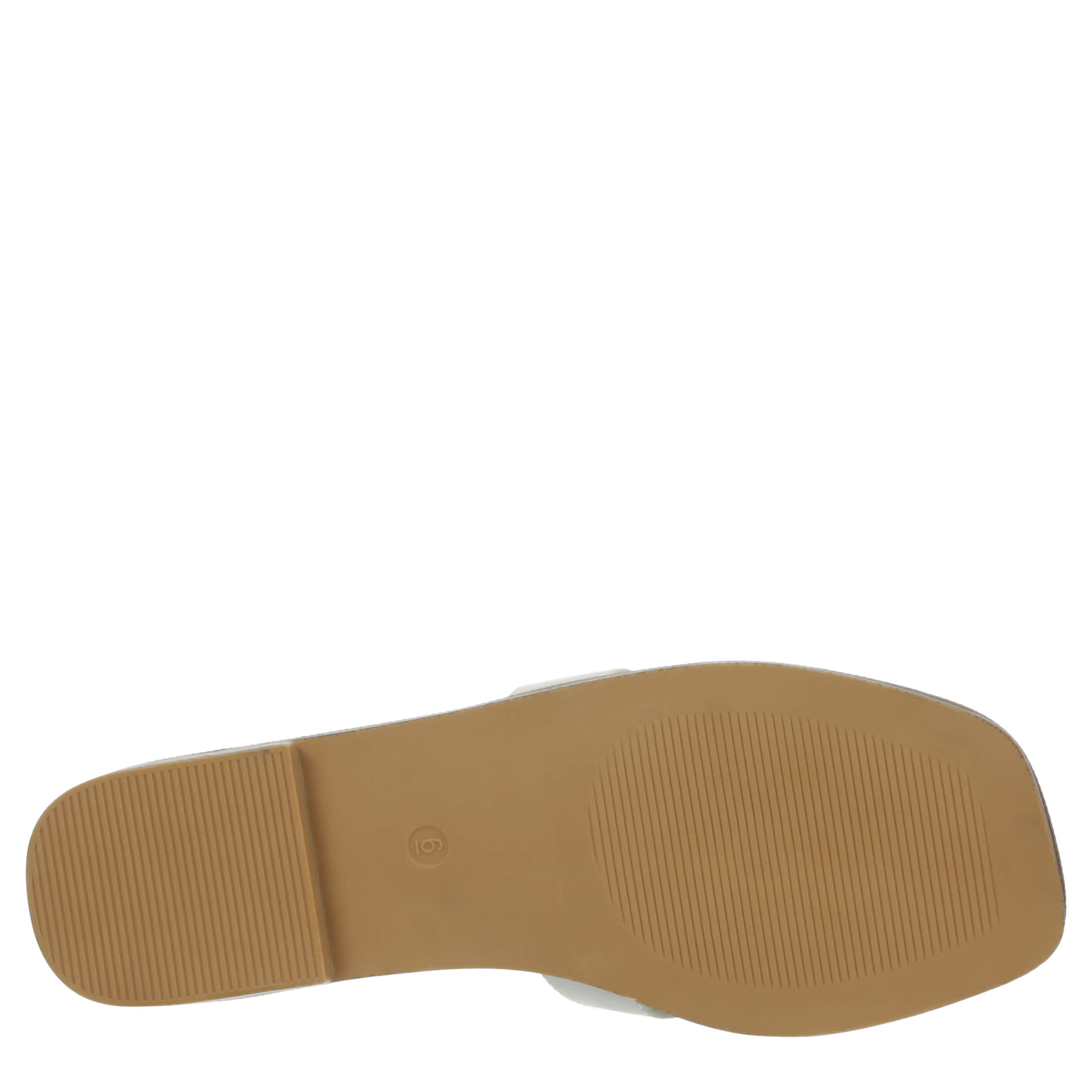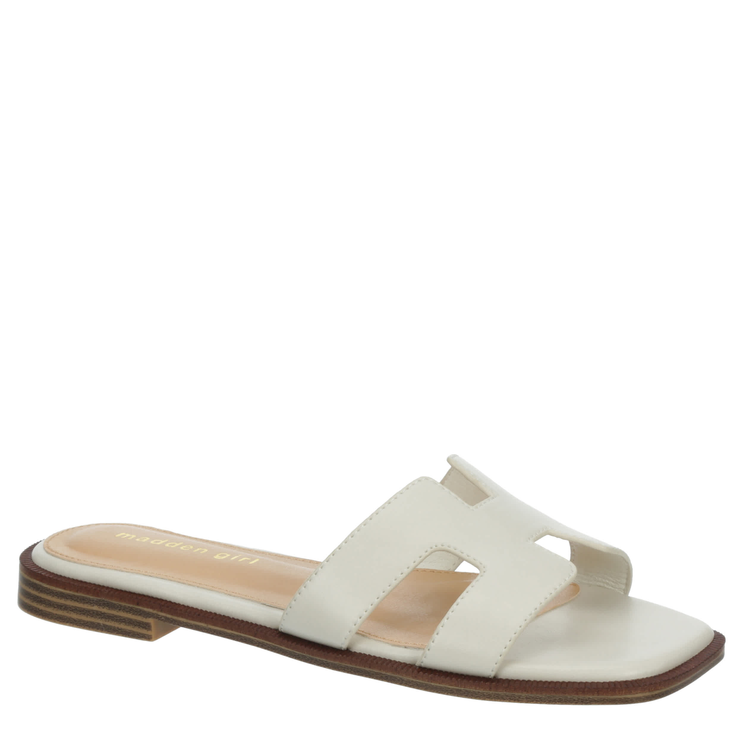 Glitz up your spring style in the Hailey women's slide sandal from madden girl. Featuring a faux leather upper with cutouts and a square toe for extra style, this slip-on shoe works with cropped jeans or midi skirts. The insole comforts your foot while the flat outsole offers durability.