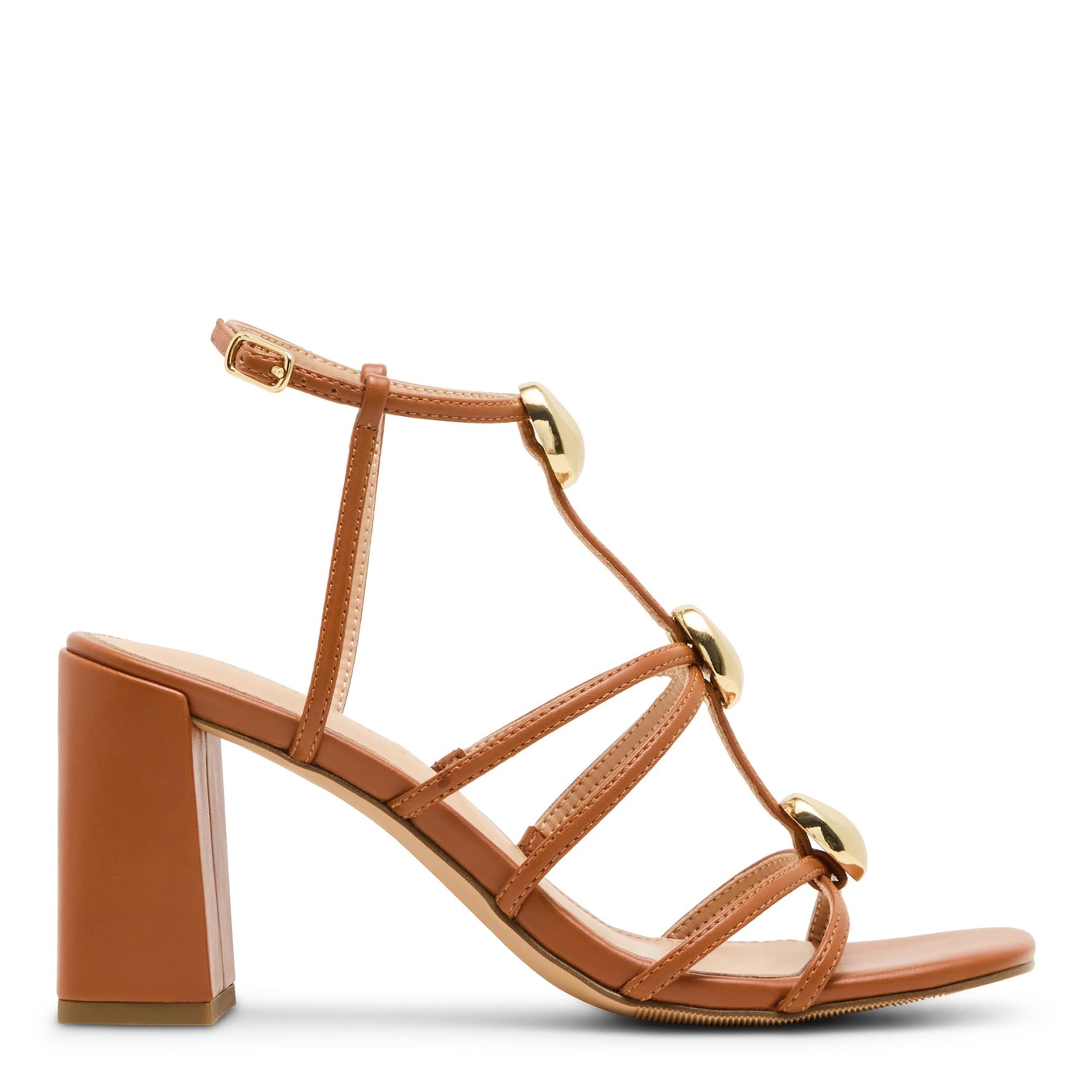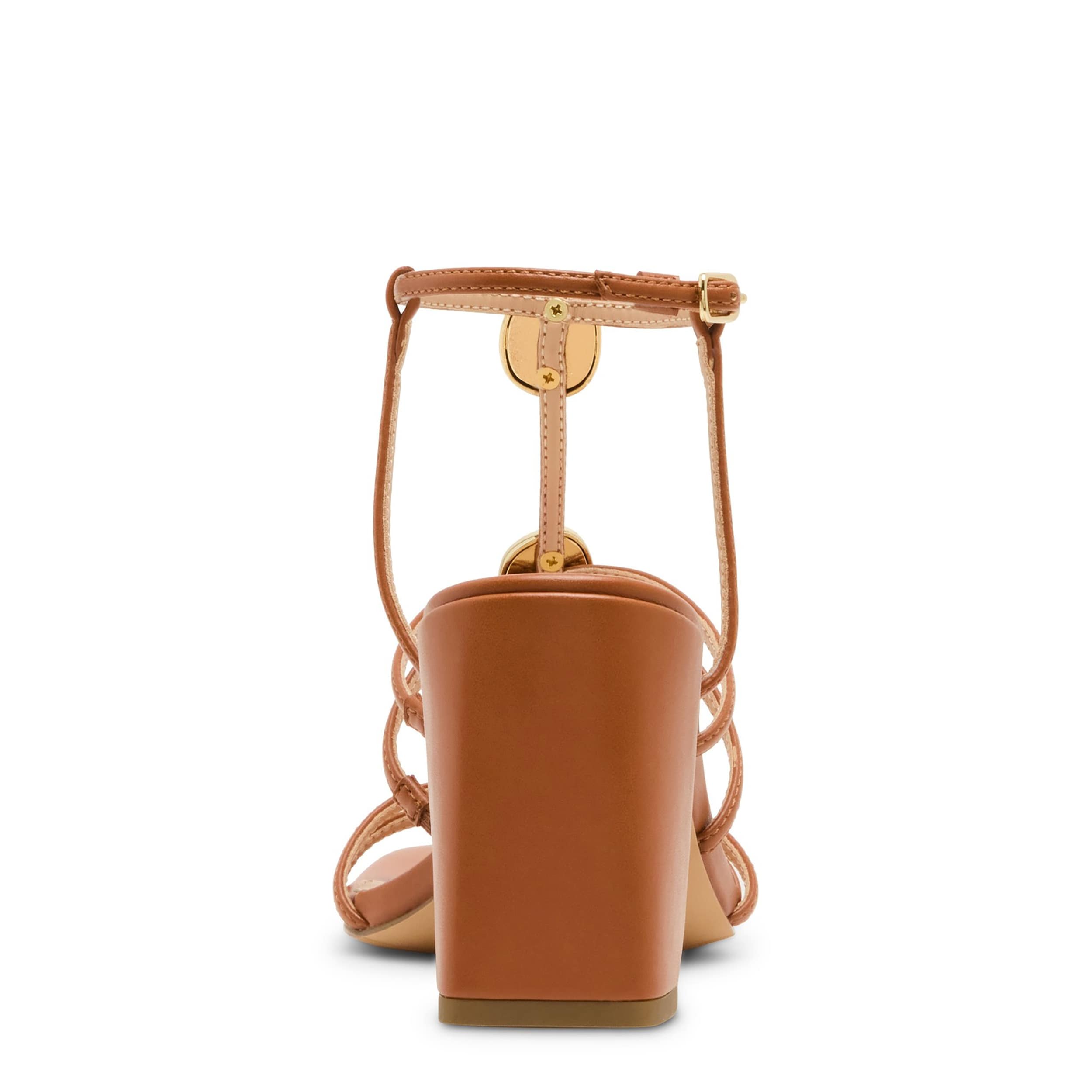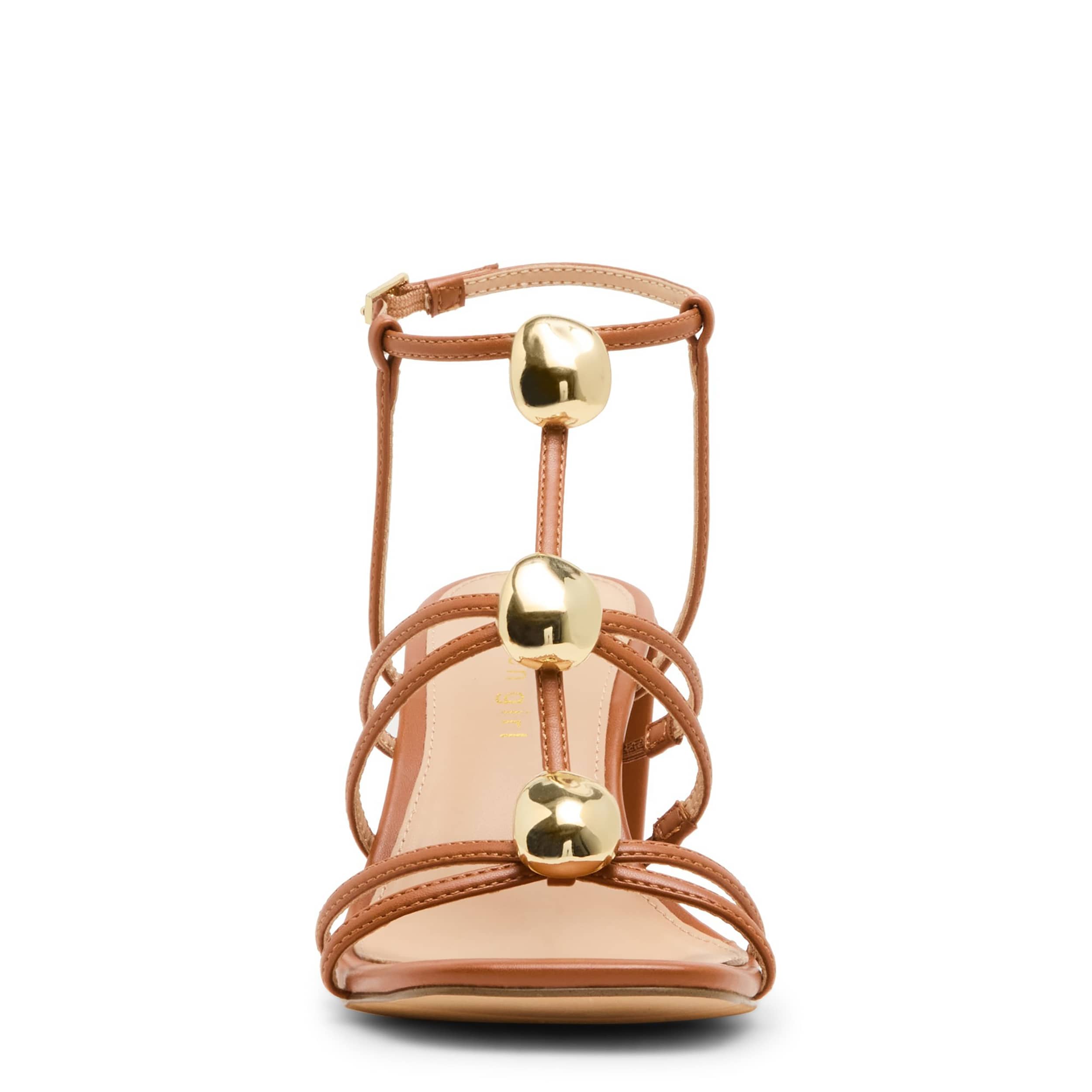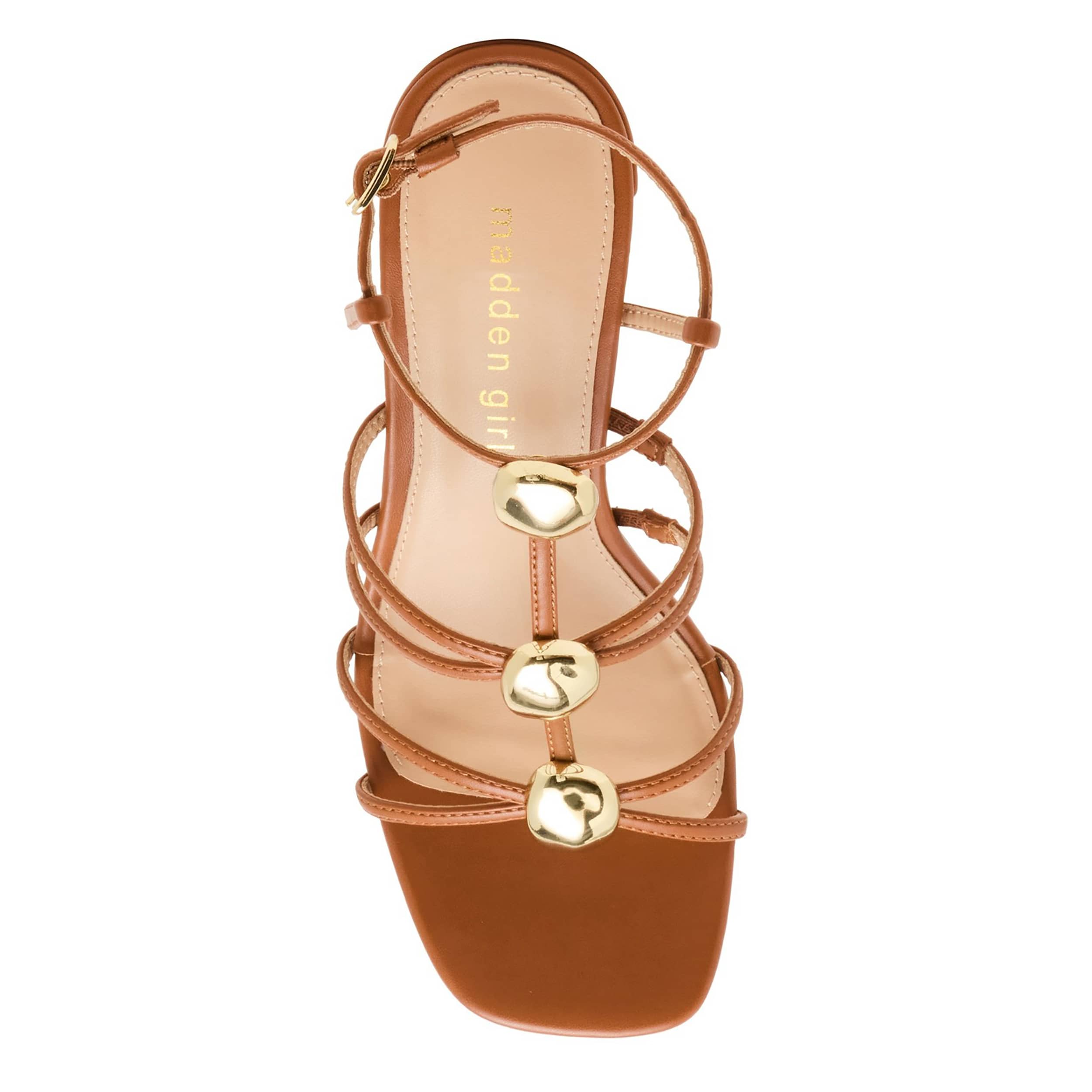 Sunny locales and fun in the madden girl Layla sandal. Featuring faux leather straps adorned with gold-tone ornaments for extra style, this strappy sandal is made for sundresses or long skirts. Your foot is soothed while you navigate that high heel in this stunner.