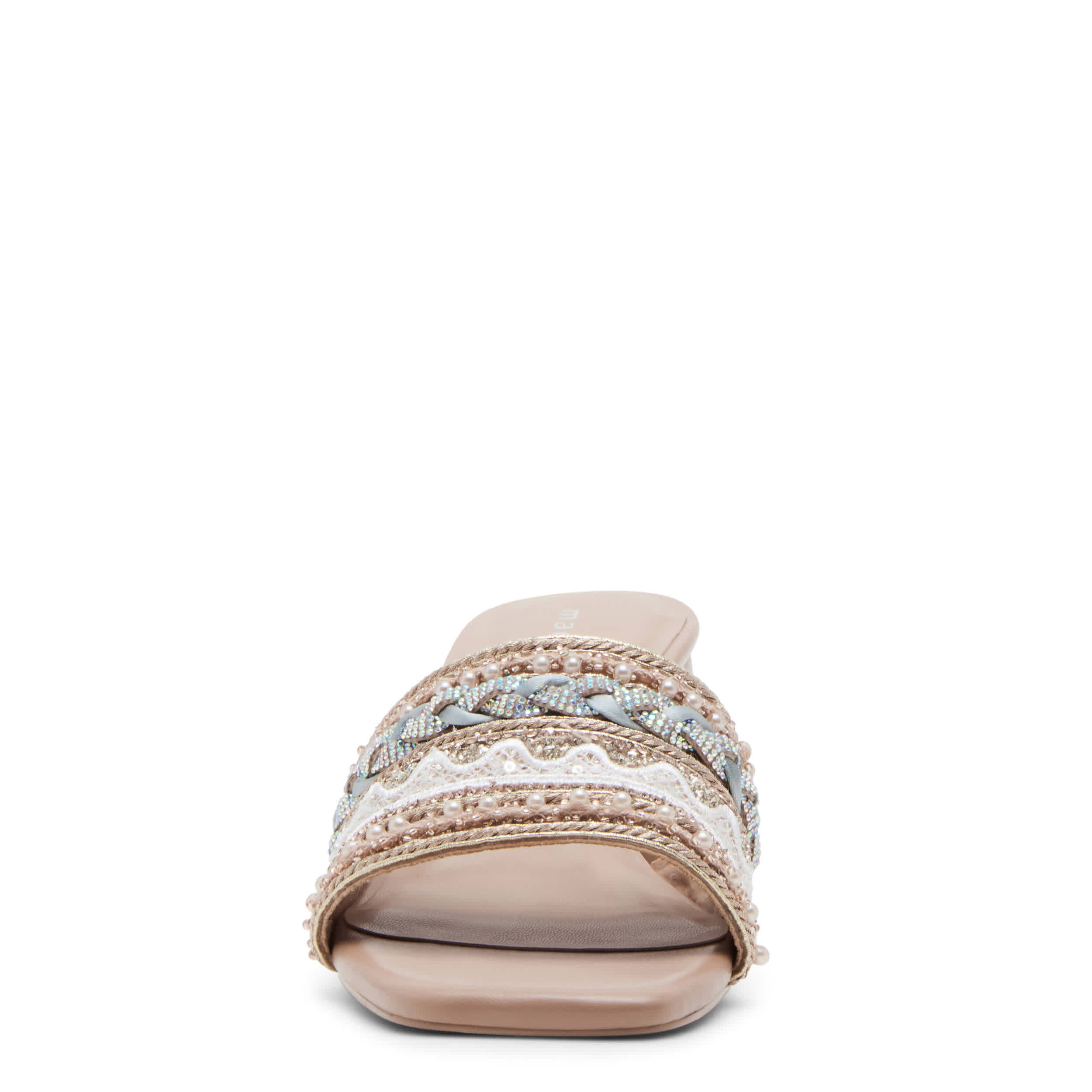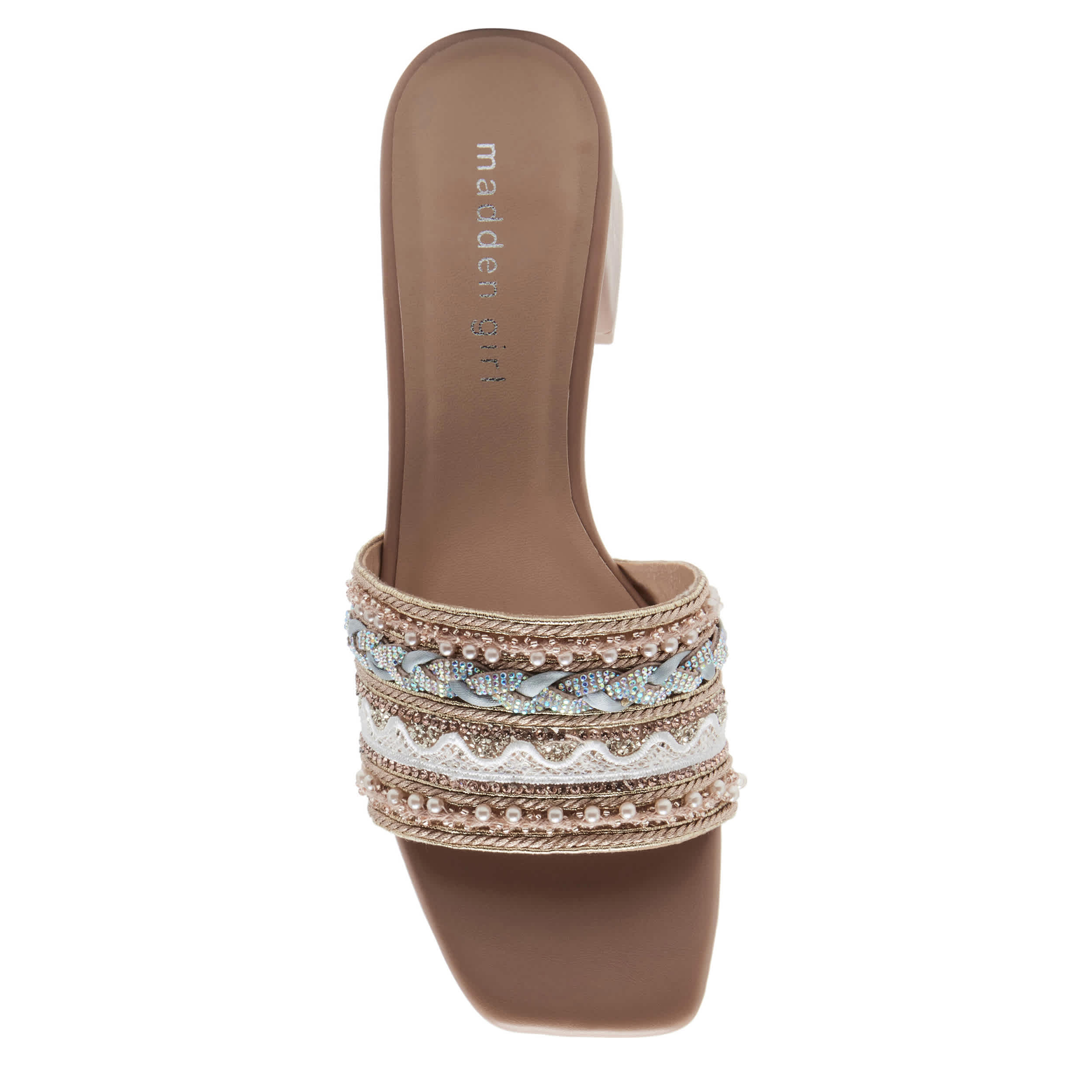 Step up your style with the madden girl Penelope slide sandal. Featuring a synthetic upper adorned with sequins and beaded details, this square-toe shoe adds some boho chic to your look. The padded insole soothes your foot, while the block heel offers a nice elevation.