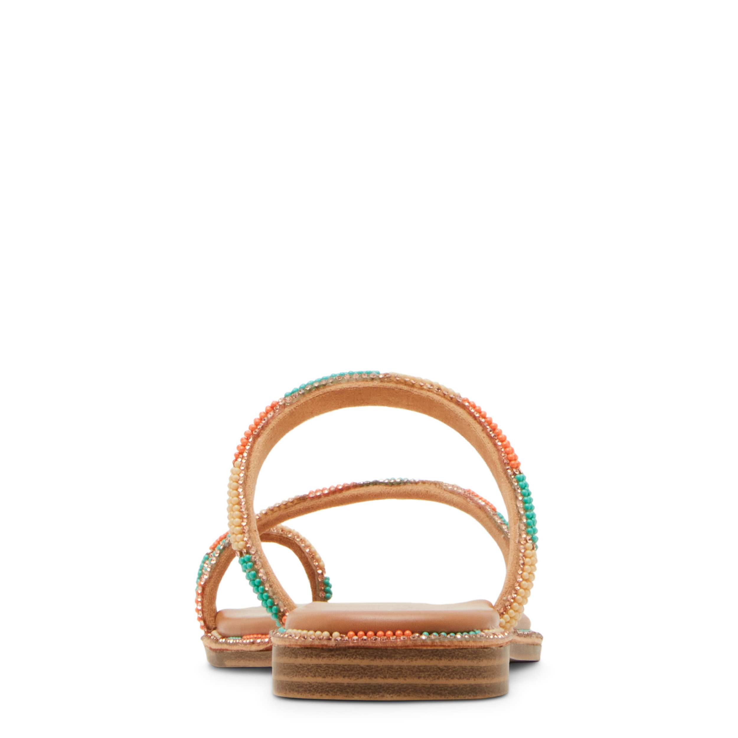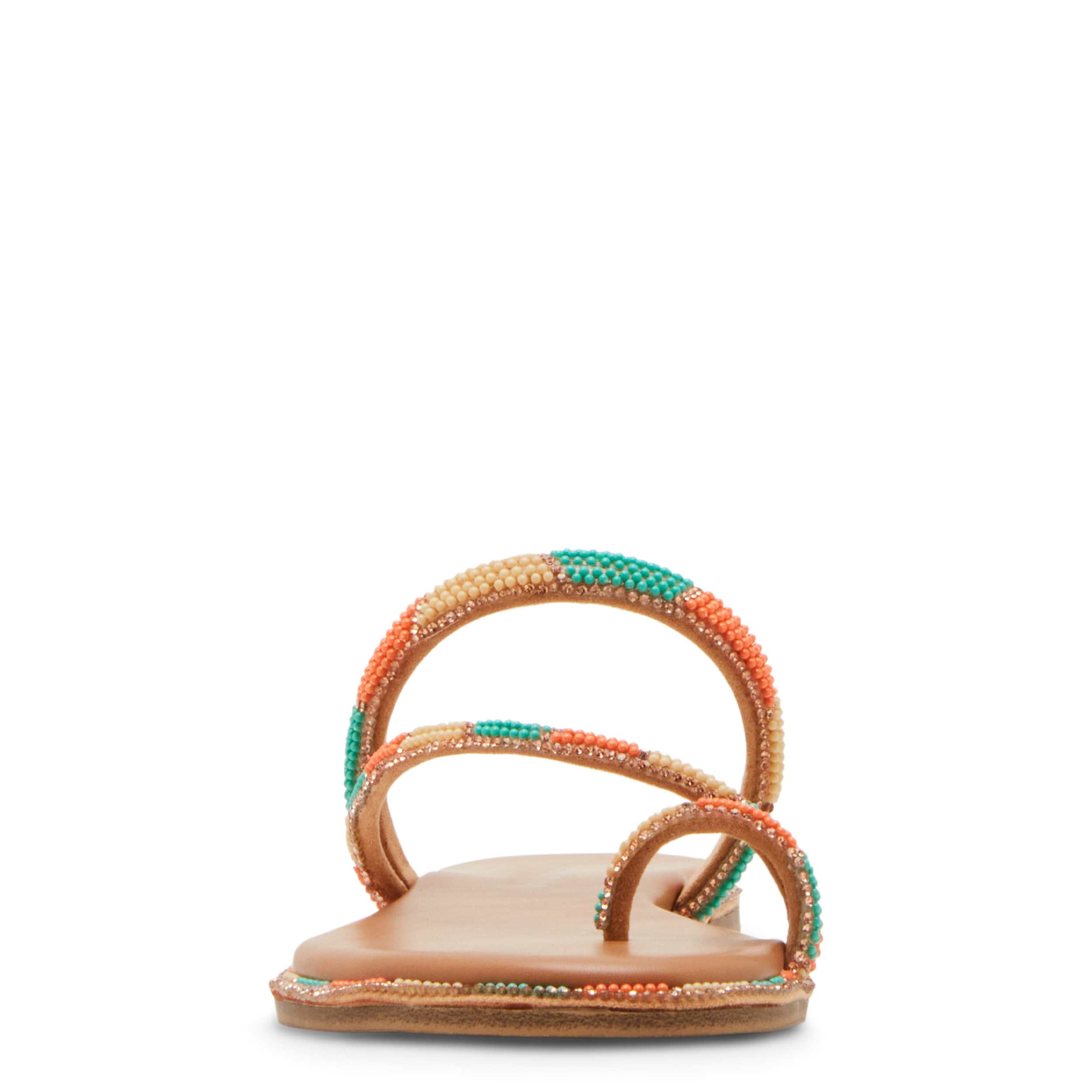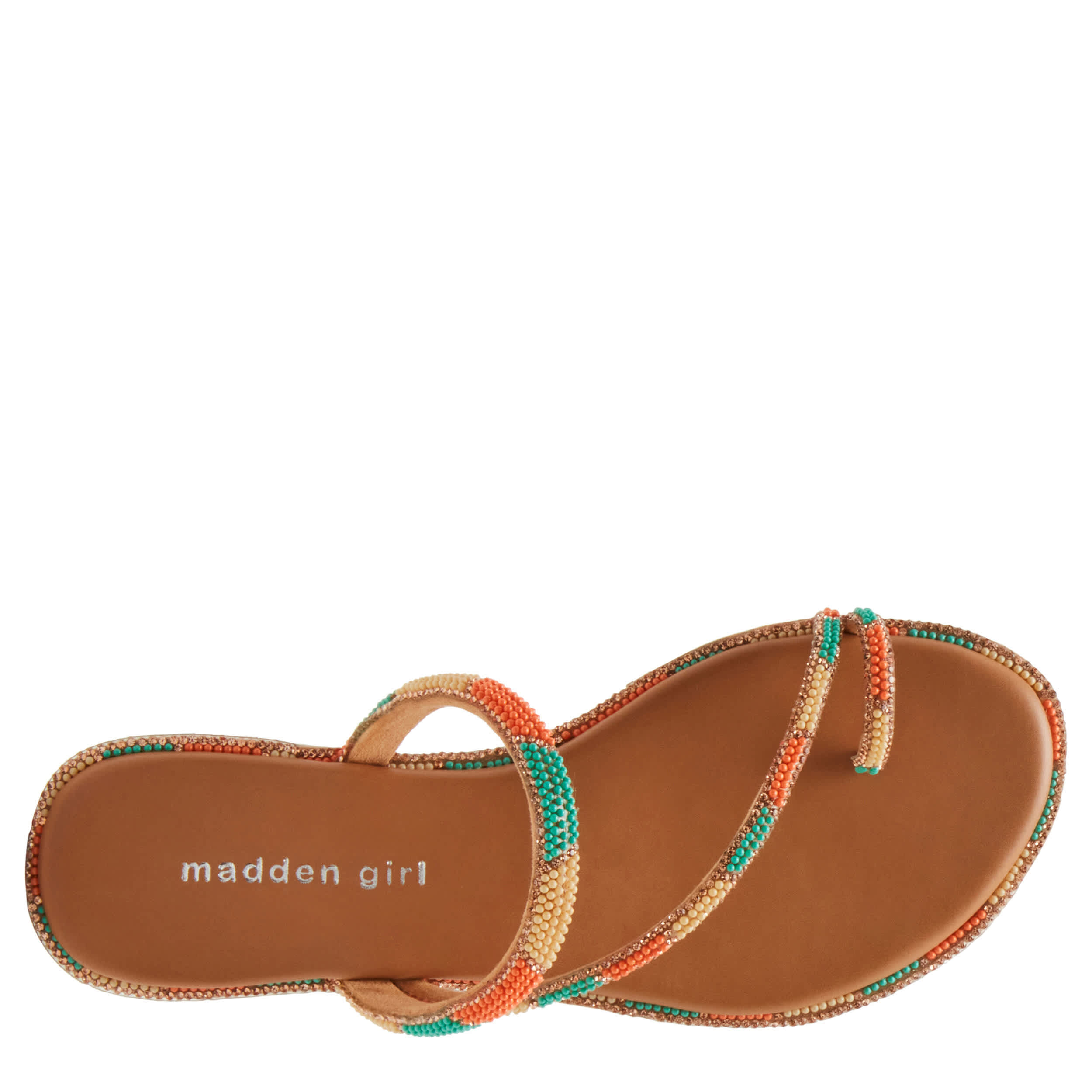Put a fun spin on your summer look with the madden girl Spotlight thong sandal. Featuring a multi-colored sequined upper, this sandal adds an extra stylish touch to your casual outfits. Enjoy easy steps with the cushy footbed and durable outsole.